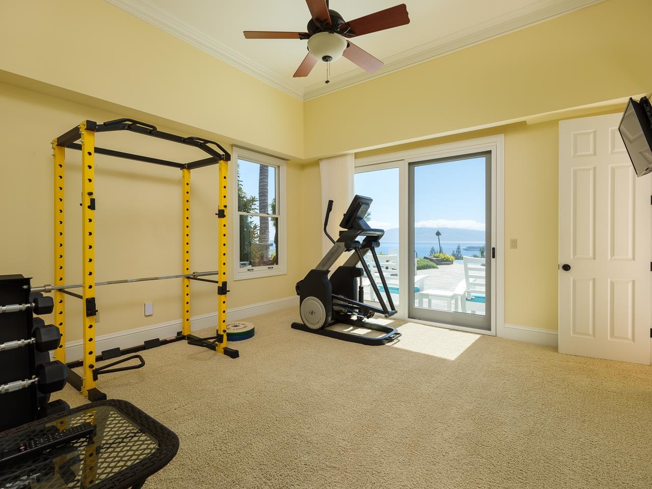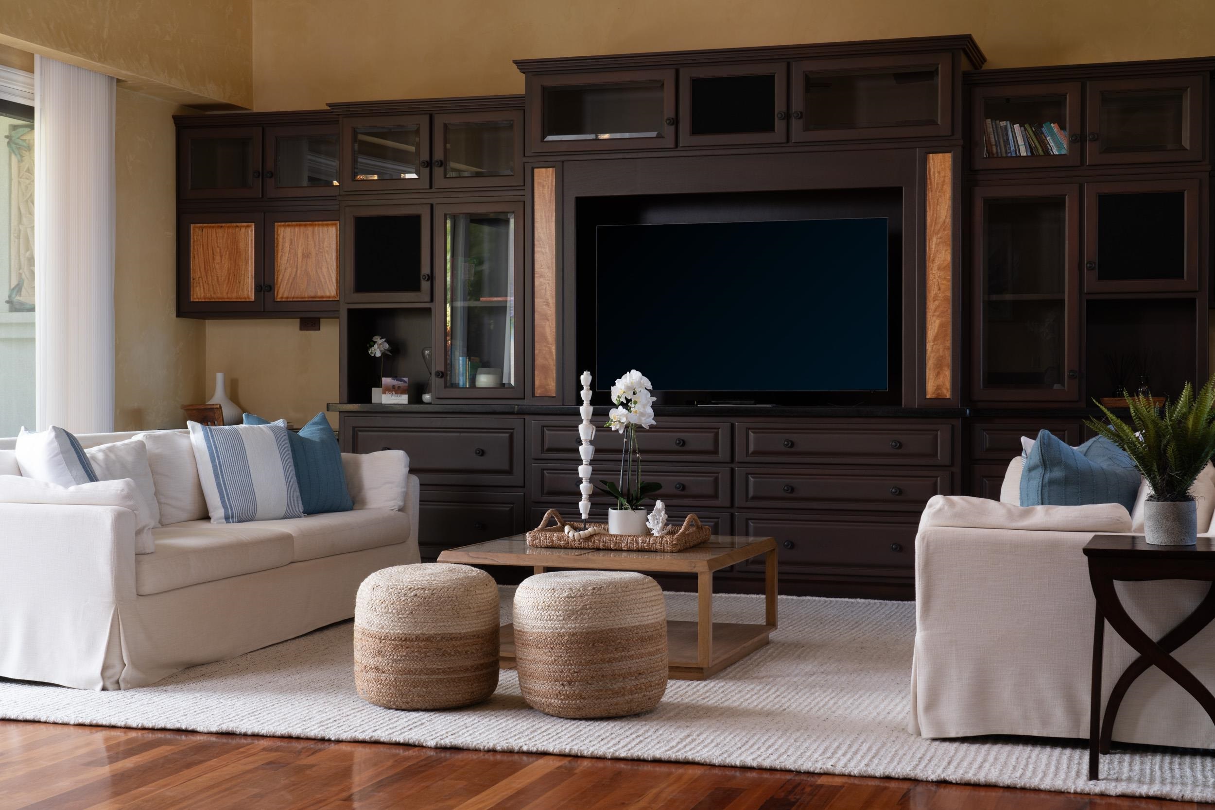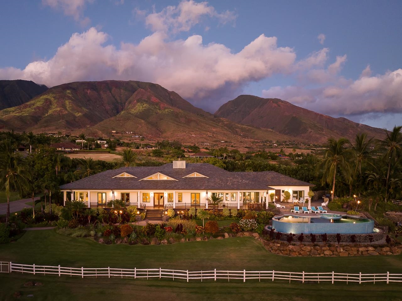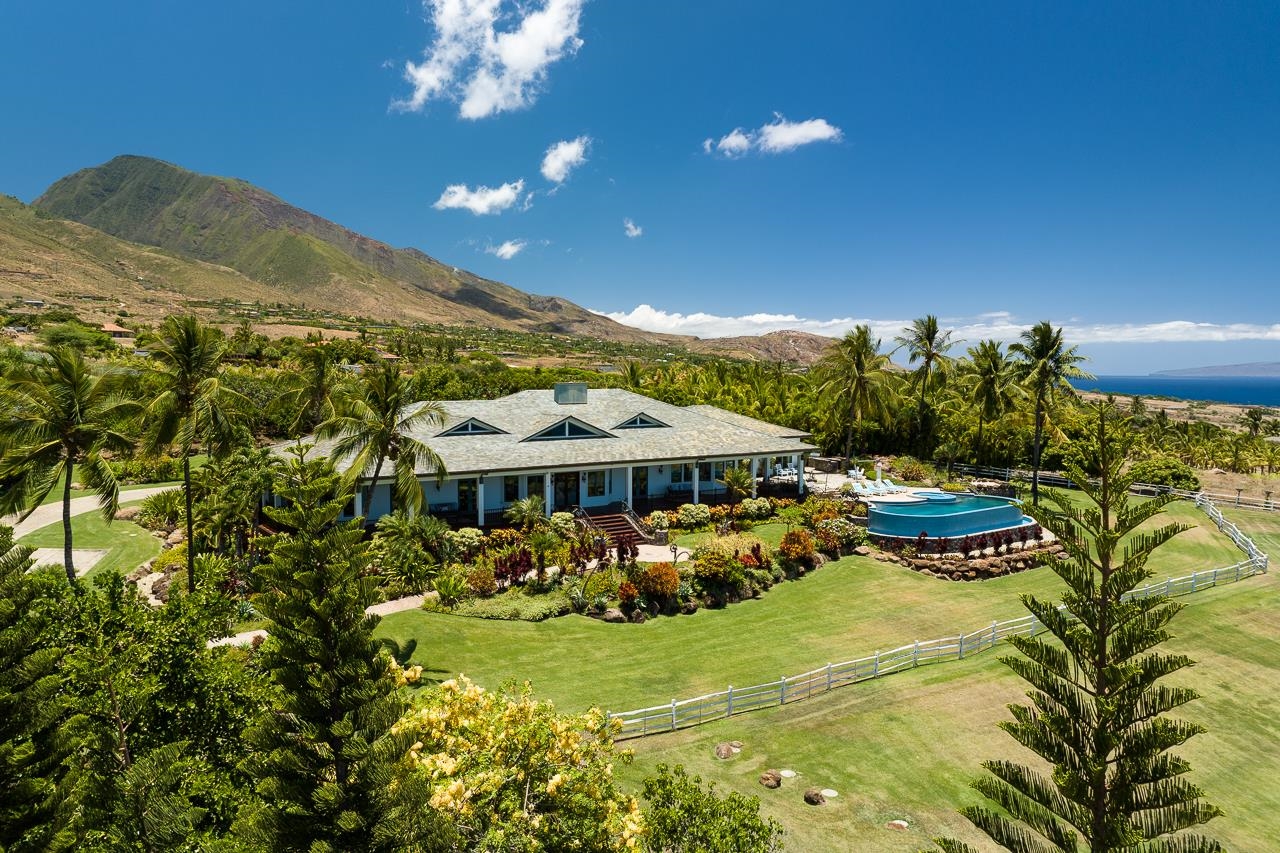 Located in prestigious neighborhood of Pu’unoa, this is one of Hawaii’s most desirable gated luxury estates, offering tranquil tropical living with the ultimate in privacy and security. Gracing the gentle slopes of the West Maui Mountains, this 5-acre fully manicured estate, lush with a variety of fruit trees and tropical landscaping, boasts of breath-taking panoramic tri-island ocean views, stunning sunsets and majestic mountain backdrops with bountiful picturesque rainbows. 65 Wili Okai Way features the best of style and modern amenities in a spacious and elegant custom-built, 5 bedroom, 5.5 bath main residence. The separate 2 bedroom, 2 bath guest home is privately situated with its own gated access. Both homes also showcase abundant, covered, wraparound patio space. As your day begins, take in spectacular sunrises over the West Maui Mountains, embracing the sweeping views and fragrant trade winds while taking advantage of the easy access to private trails for walking, jogging and biking to popular beach parks. The one-of-a-kind outdoor shower, custom outdoor kitchen, and expansive, air-conditioned, multi-purpose modern barn make indoor/outdoor recreation easy and comfortable. If you desire world-class shopping, restaurants and entertainment, all are conveniently located in nearby Kaanapali and Kapalua. When you’re ready to wind down, relax in the dramatic infinity-edge saline pool, while you listen to the gentle sounds of the nearby cascading water feature, or soak, in your custom in-ground hot tub while enjoying the dazzling sunsets and clear, star-filled night skies. Nestled among beautiful flowering hedges, this property also reveals a highly sought after, comprehensive, energy- efficient, net metering photovoltaic system that minimizes electricity expense through renewable energy. The level of craftsmanship and detail in this grand estate is of the highest quality and finishes, including incredible custom metal work from famed artist, Larry Padilla, on display throughout the property from the custom metal entry gates to the fire torches, accent rails and various other architectural elements.