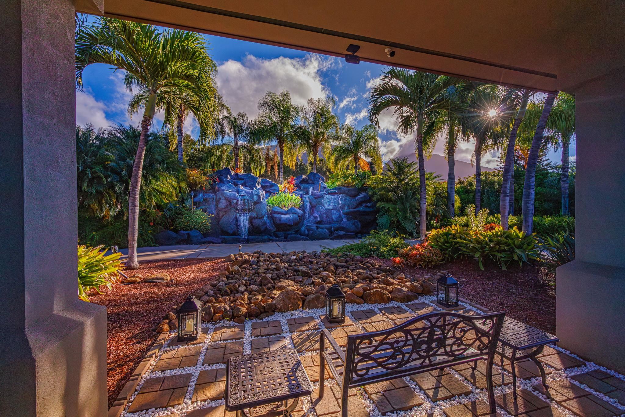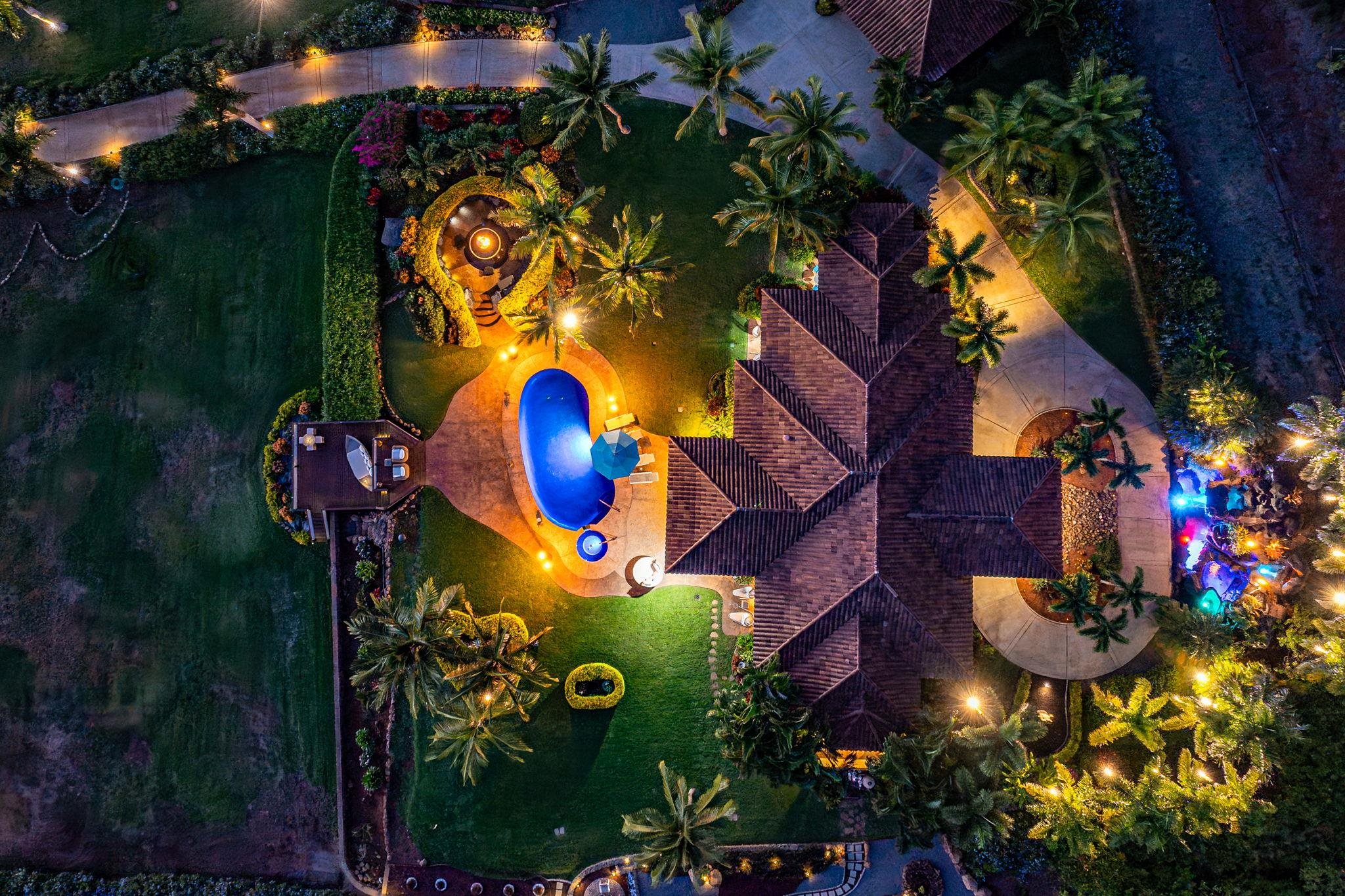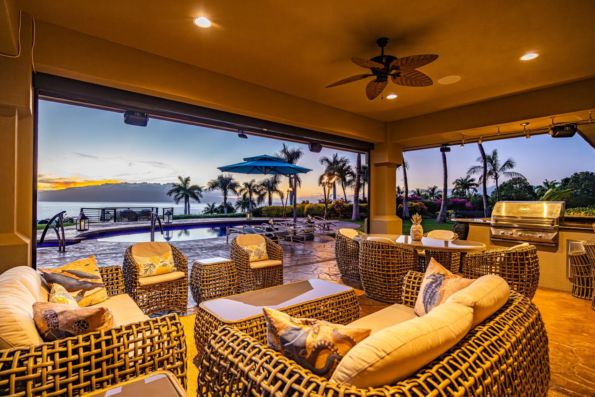 Nestled on what may be the finest parcel in all of West Maui, this expansive five-acre-plus sanctuary claims the premier position within Puunoa Estates. Thoughtfully designed landscaping combines with the property's naturally secluded setting to deliver complete seclusion. Within the exclusive, gated enclave of Puunoa only 24 estate properties exist, each spanning a minimum of five acres. The discerning owners who call Puunoa home have the means to reside anywhere globally, yet they've deliberately chosen this remarkable community. What draws them? An enviable lifestyle where perpetual summer weather meets effortless beach access, all framed by breathtaking vistas of the Pacific, neighboring islands, the West Maui Mountains, spectacular sunsets, and seasonal whale migrations. 67 Wili Okai Way stands apart with distinctive features rarely found among West Maui's current luxury offerings. The private entry drive makes a stunning first impression–majestic royal palms line the approach, framing spectacular mountain and ocean panoramas. An elegant water feature accented by tiki torches creates a welcoming threshold to this sophisticated single-story residence. The entire five-acre grounds showcase meticulous care, with indigenous flora, tropical plantings, and pristine emerald lawns throughout. The property's infrastructure allows for future expansion, including an ideal site for an Ohana cottage and a detached barn structure–both positioned to preserve the main residence's sweeping, uninterrupted views.