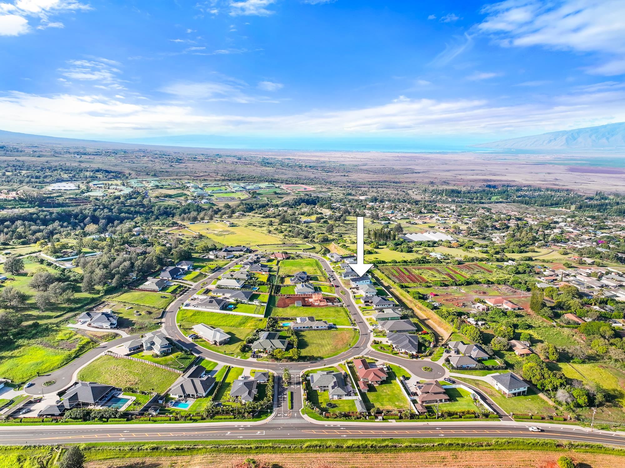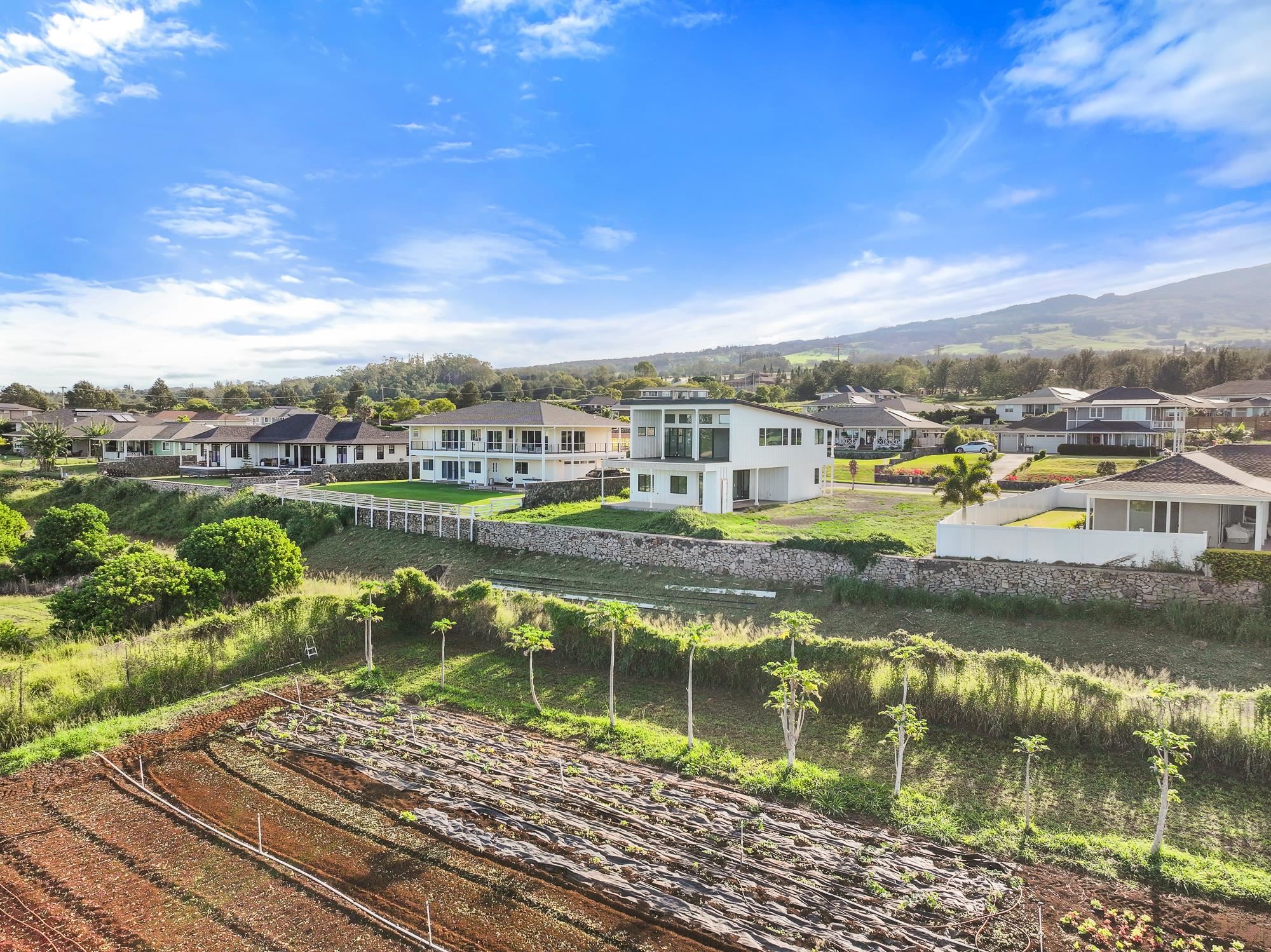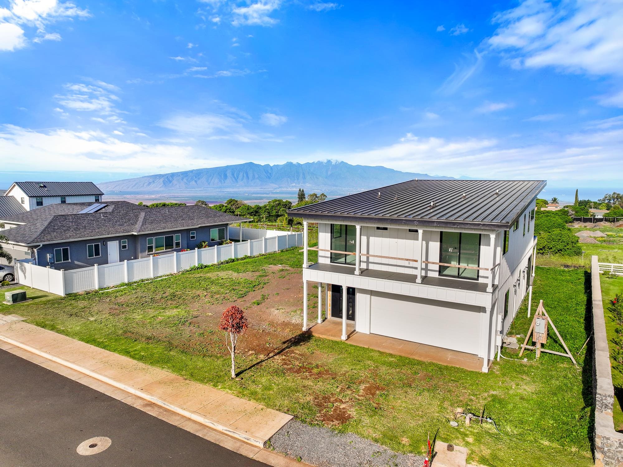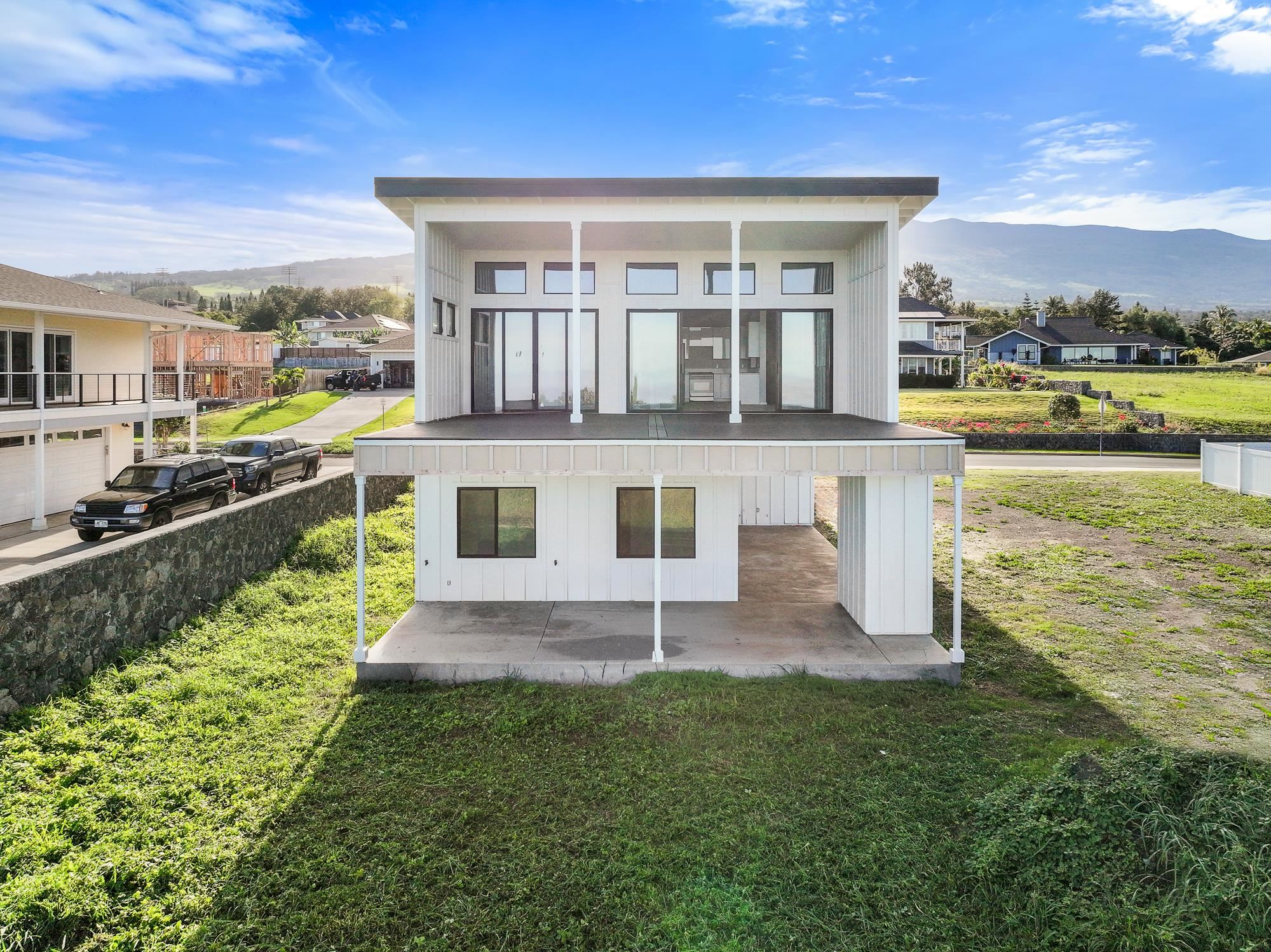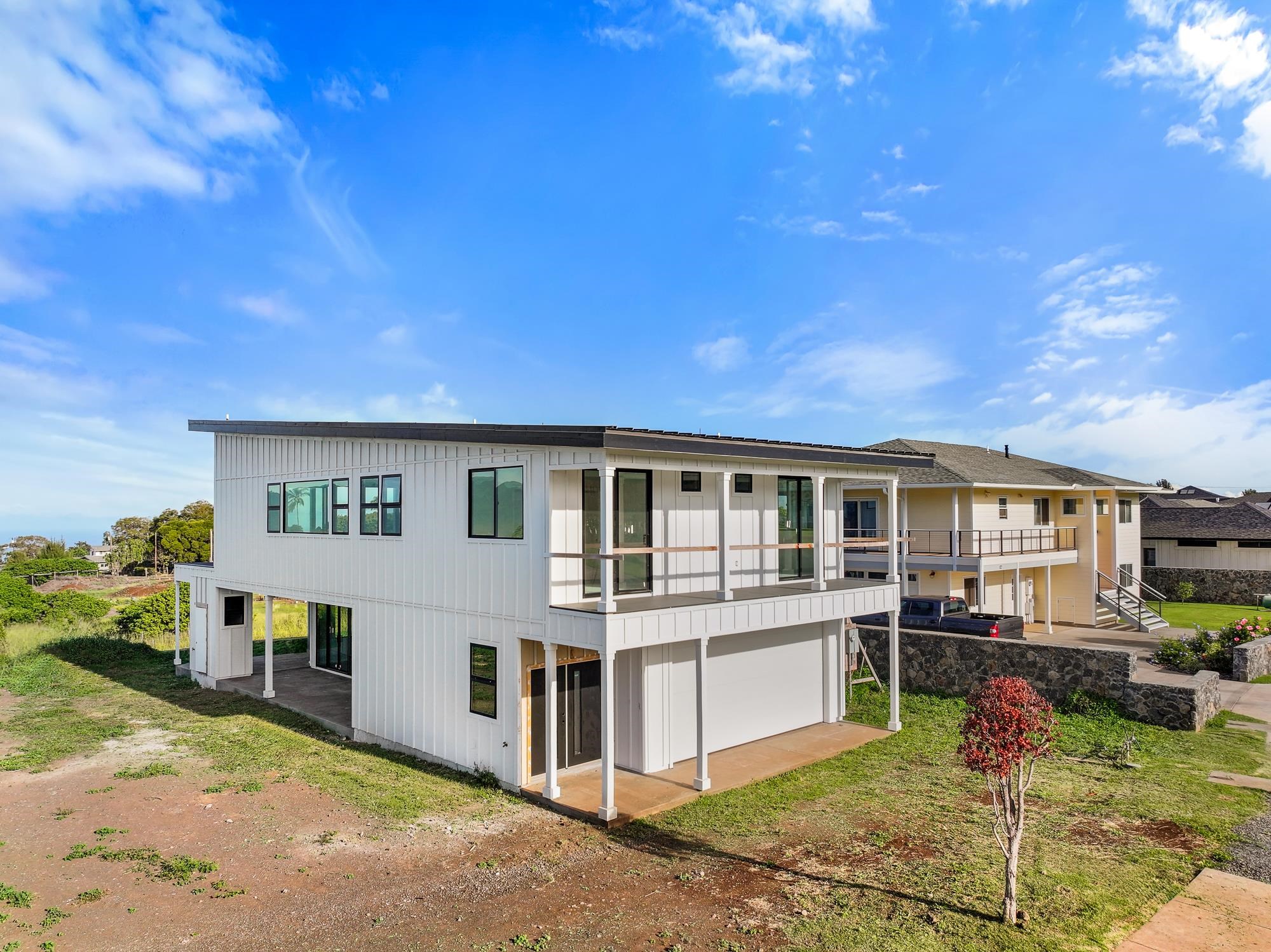 Introducing a contemporary two-story residence located within the desirable Kualono Subdivision in Pukalani, set on an expansive 18,208 sq. ft. lot in the heart of Upcountry Maui. Built in 2025, this thoughtfully designed home offers approximately 1,995 sq. ft. of living space with 3 bedrooms and 3.5 bathrooms, featuring a modern layout with abundant natural light and seamless indoor-outdoor living. Multiple covered and open lanais extend the living areas, creating ideal spaces to enjoy cool Upcountry breezes and scenic surroundings. The home showcases quality construction, double-wall framing, and a contemporary aesthetic throughout. Located in a quiet residential enclave just minutes from Makawao town, schools, and shopping, this property offers a rare opportunity to personalize a nearly completed home in one of Maui’s most sought-after climates.