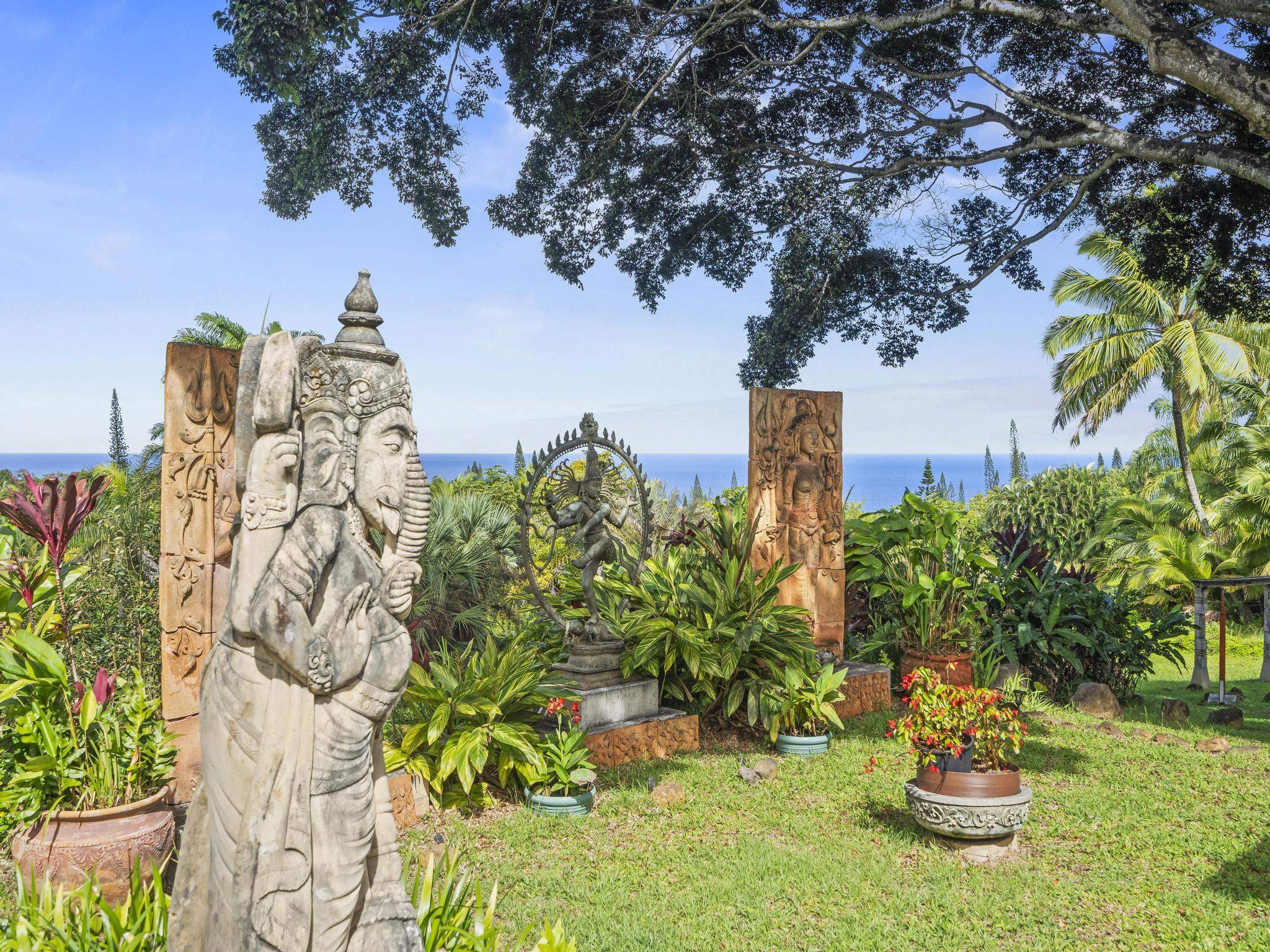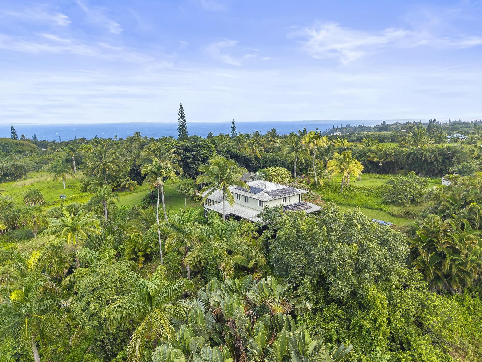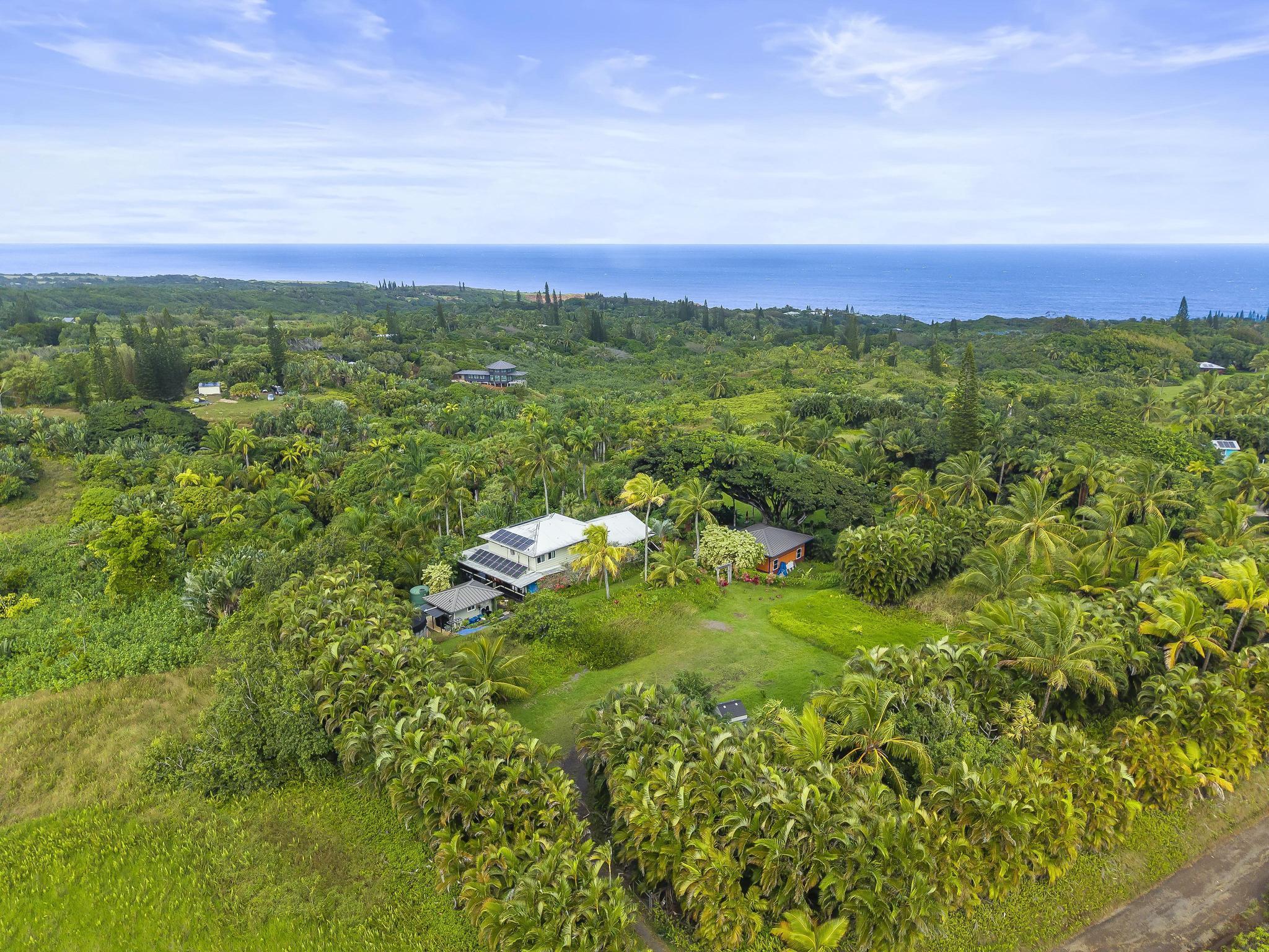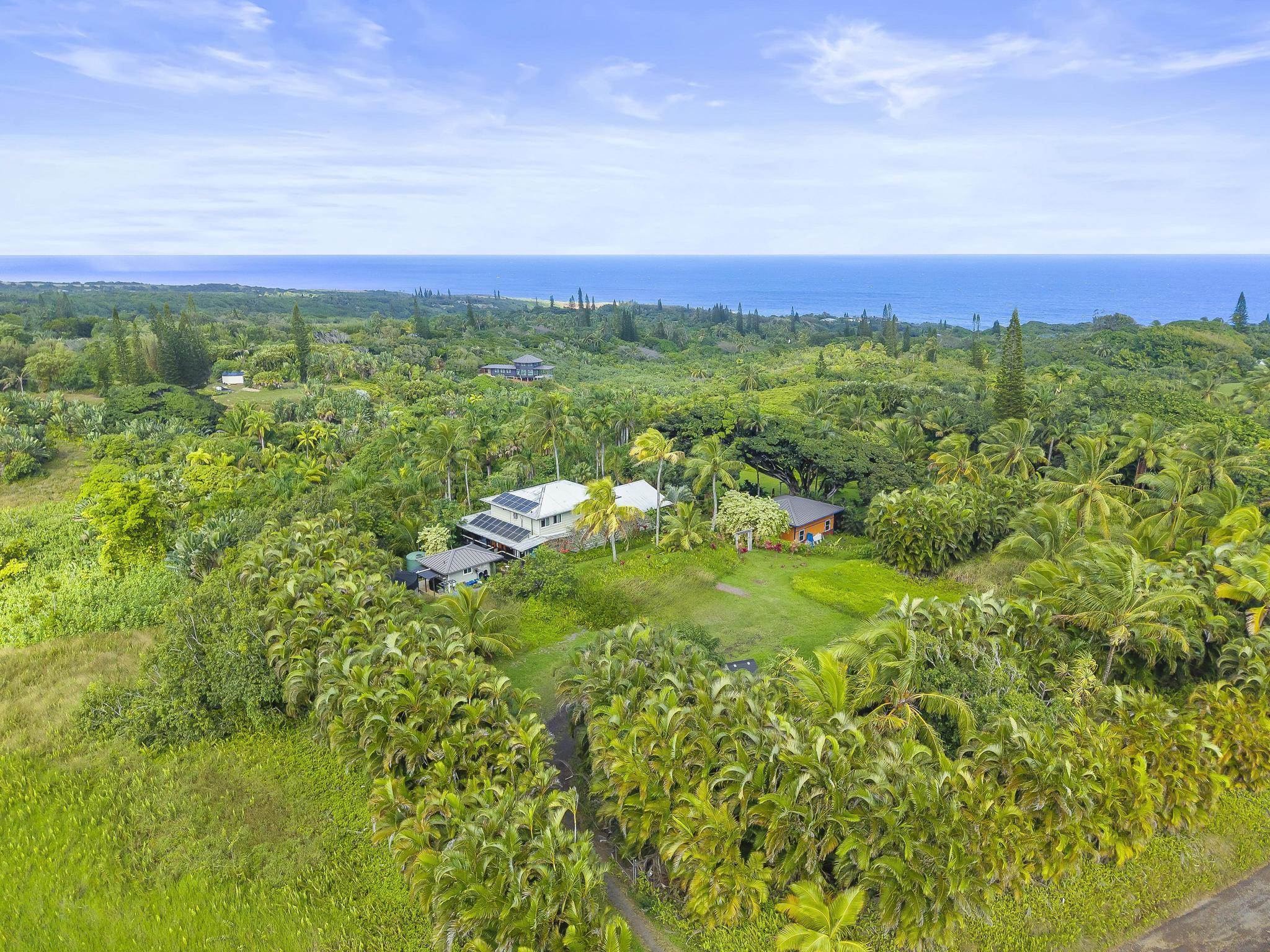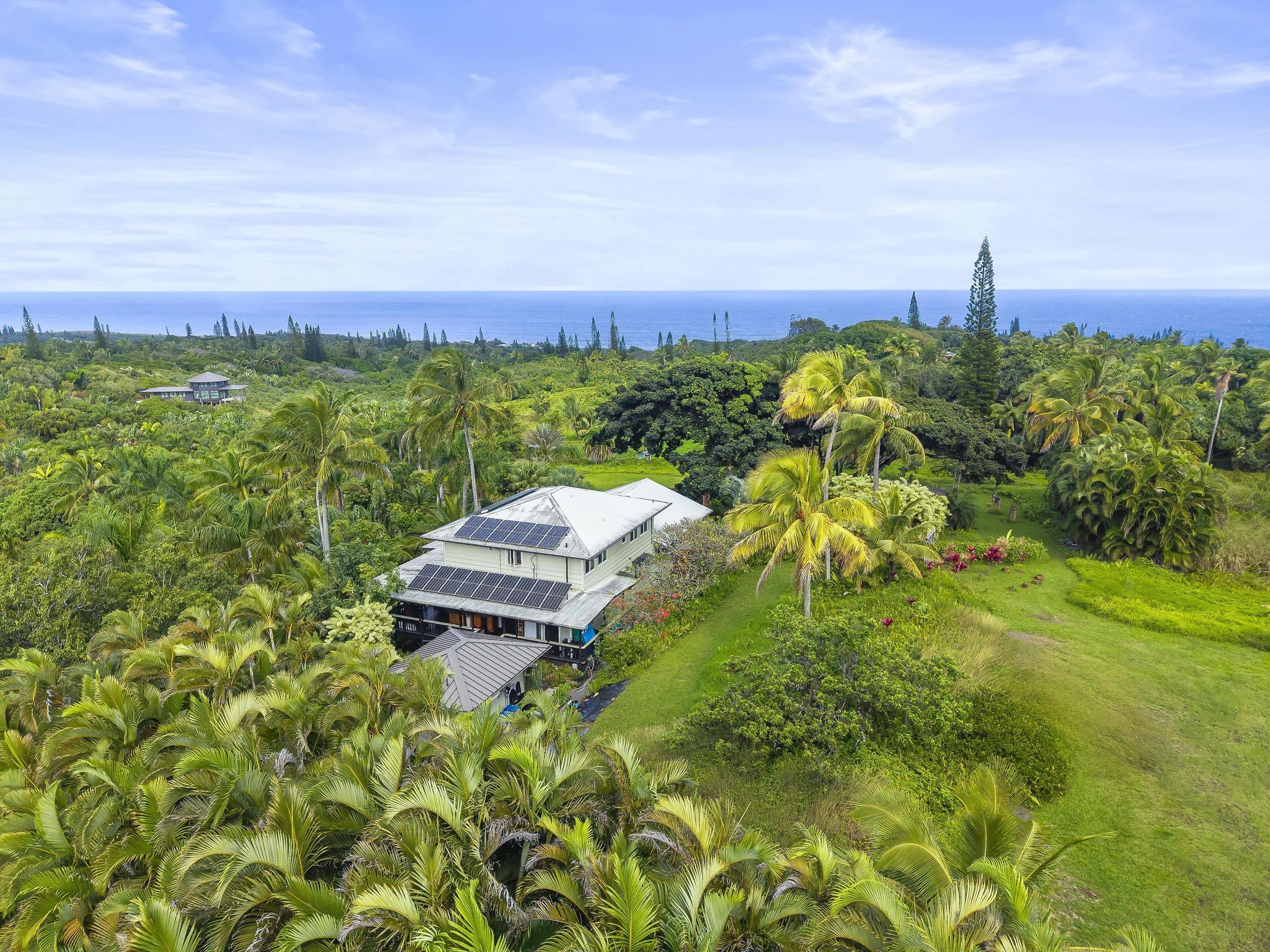 Serene estate set on 3.7 lush, tropical acres with sweeping ocean views, located just past Twin Falls in one of Maui’s most established off-grid communities. This peaceful and private property offers a retreat-like atmosphere, featuring an extensive collection of mature palms, a perennial stream, and gentle ponds that invite reflection and creative expression. Meandering paths encourage slow walks and quiet moments of connection with the land, with endless potential for expanded tropical gardens. The property invites you to grow your own food and live a self-sustaining lifestyle. At night, it feels as though you could reach out and touch the stars. Nestled within the grounds is a tranquil meditation temple designed to calm the heart and center the mind, along with a thoughtfully curated meditation garden adorned with beautiful sculptures that add an artistic, soulful presence to the landscape. The land feels intentional, grounded, and naturally inspiring–ideal for those drawn to mindful, creative living. The two-story residence features 5 bedrooms and 6.5 baths, complemented by a dedicated library and an additional computer room–well-suited for study, remote work, or creative pursuits. An expansive covered deck capturing panoramic ocean and garden views. An opportunity for those seeking privacy, tranquility. Seller financing is offered. This is unit A of CPR