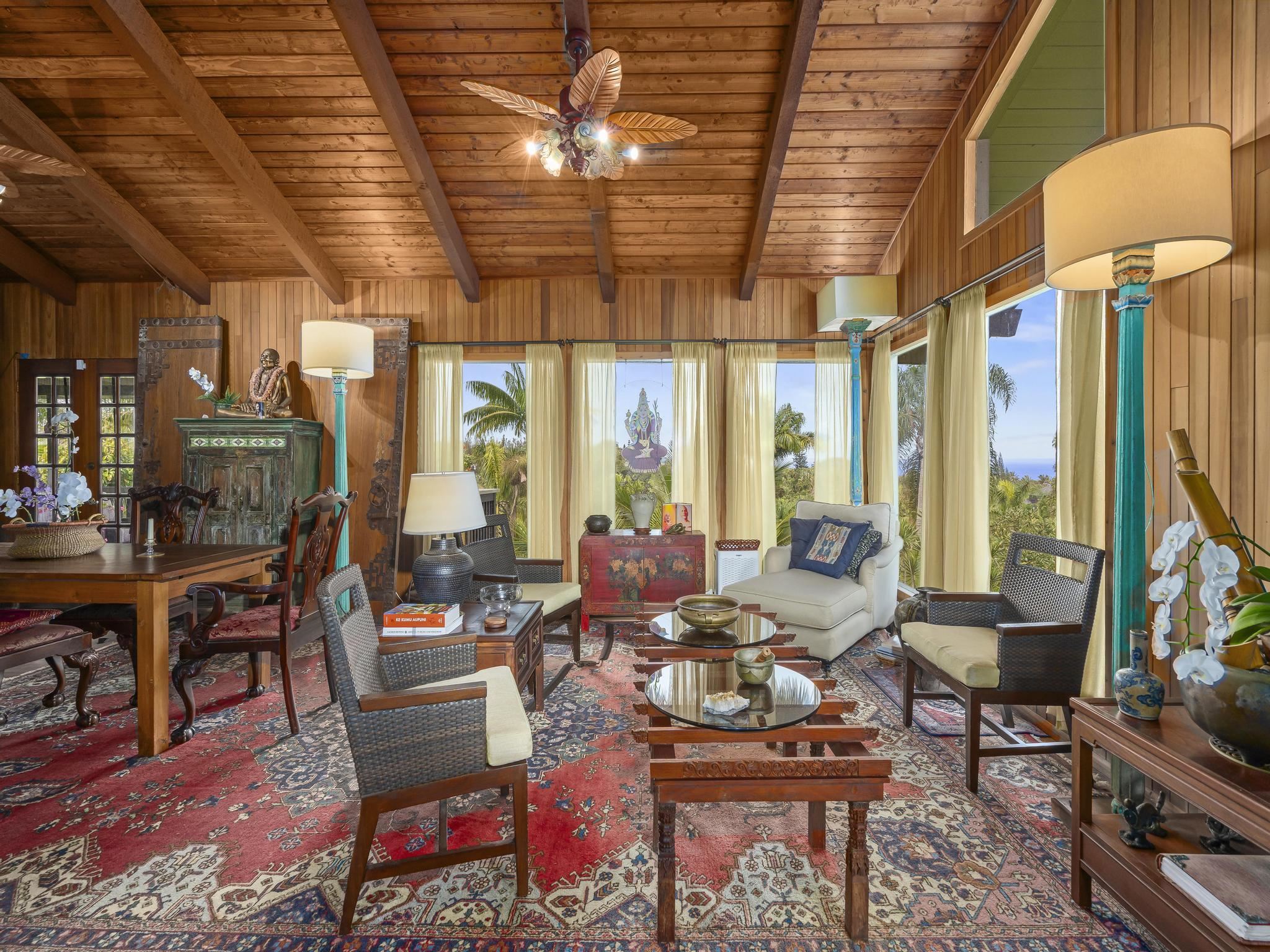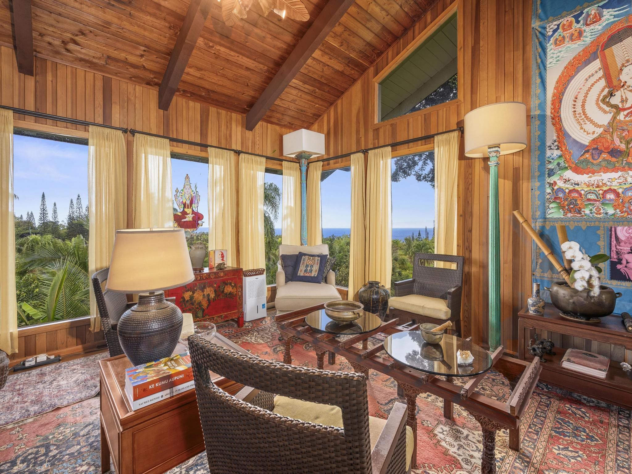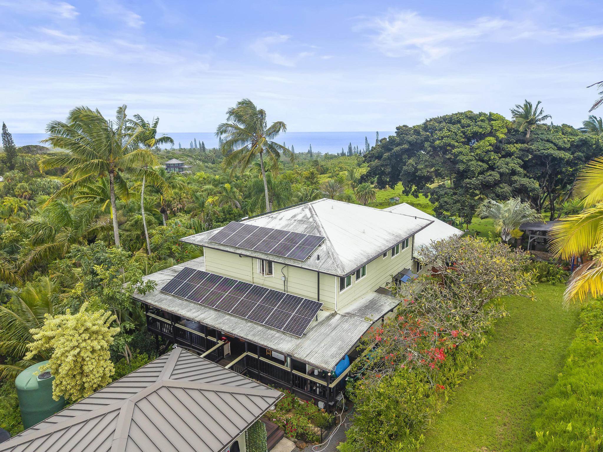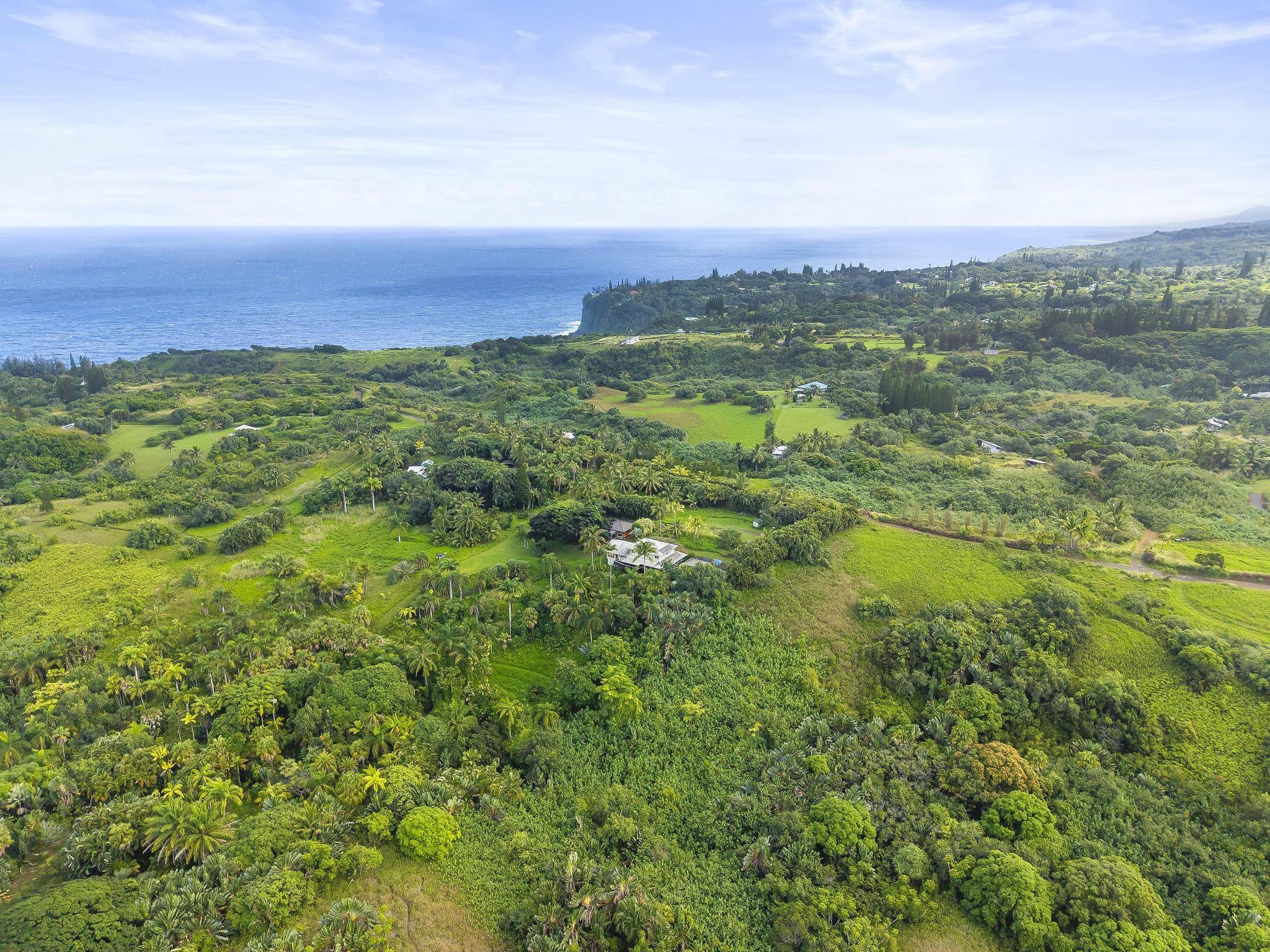 Serene estate set on 3.7 lush, tropical acres with sweeping ocean views, located just past Twin Falls in one of Maui’s most established off-grid communities. This peaceful and private property offers a retreat-like atmosphere, featuring an extensive collection of mature palms, a perennial stream, and gentle ponds that invite reflection and creative expression. Meandering paths encourage slow walks and quiet moments of connection with the land, with endless potential for expanded tropical gardens. The property invites you to grow your own food and live a self-sustaining lifestyle. At night, it feels as though you could reach out and touch the stars. Nestled within the grounds is a tranquil meditation temple designed to calm the heart and center the mind, along with a thoughtfully curated meditation garden adorned with beautiful sculptures that add an artistic, soulful presence to the landscape. The land feels intentional, grounded, and naturally inspiring–ideal for those drawn to mindful, creative living. The two-story residence features 5 bedrooms and 6.5 baths, complemented by a dedicated library and an additional computer room–well-suited for study, remote work, or creative pursuits. An expansive covered deck capturing panoramic ocean and garden views. An opportunity for those seeking privacy, tranquility. Seller financing is offered. This is unit A of CPR