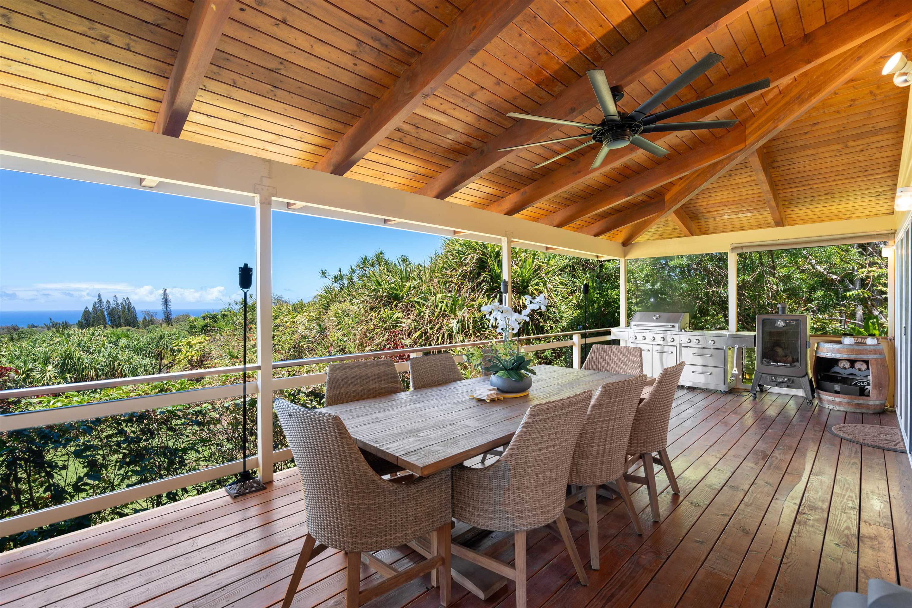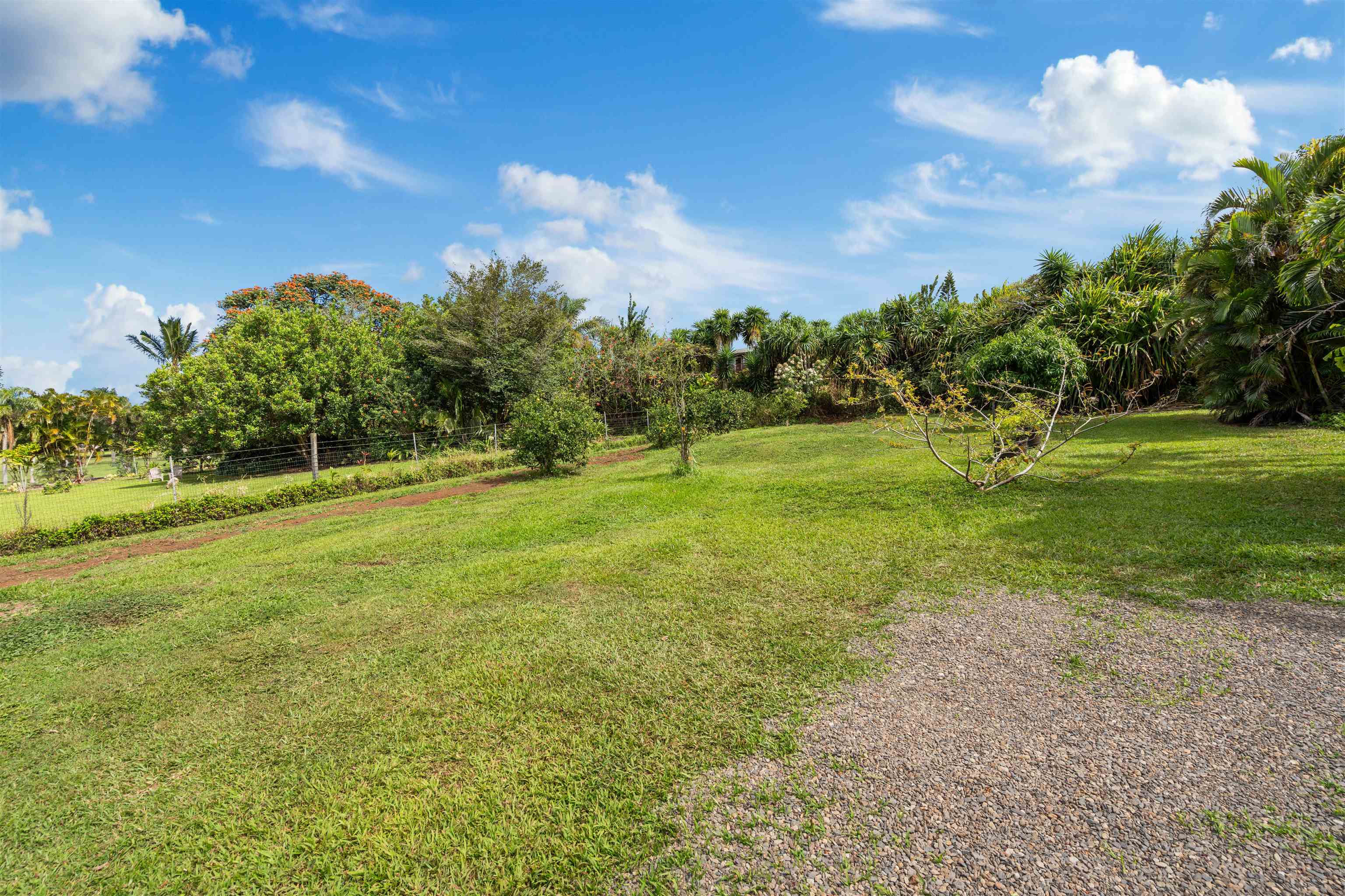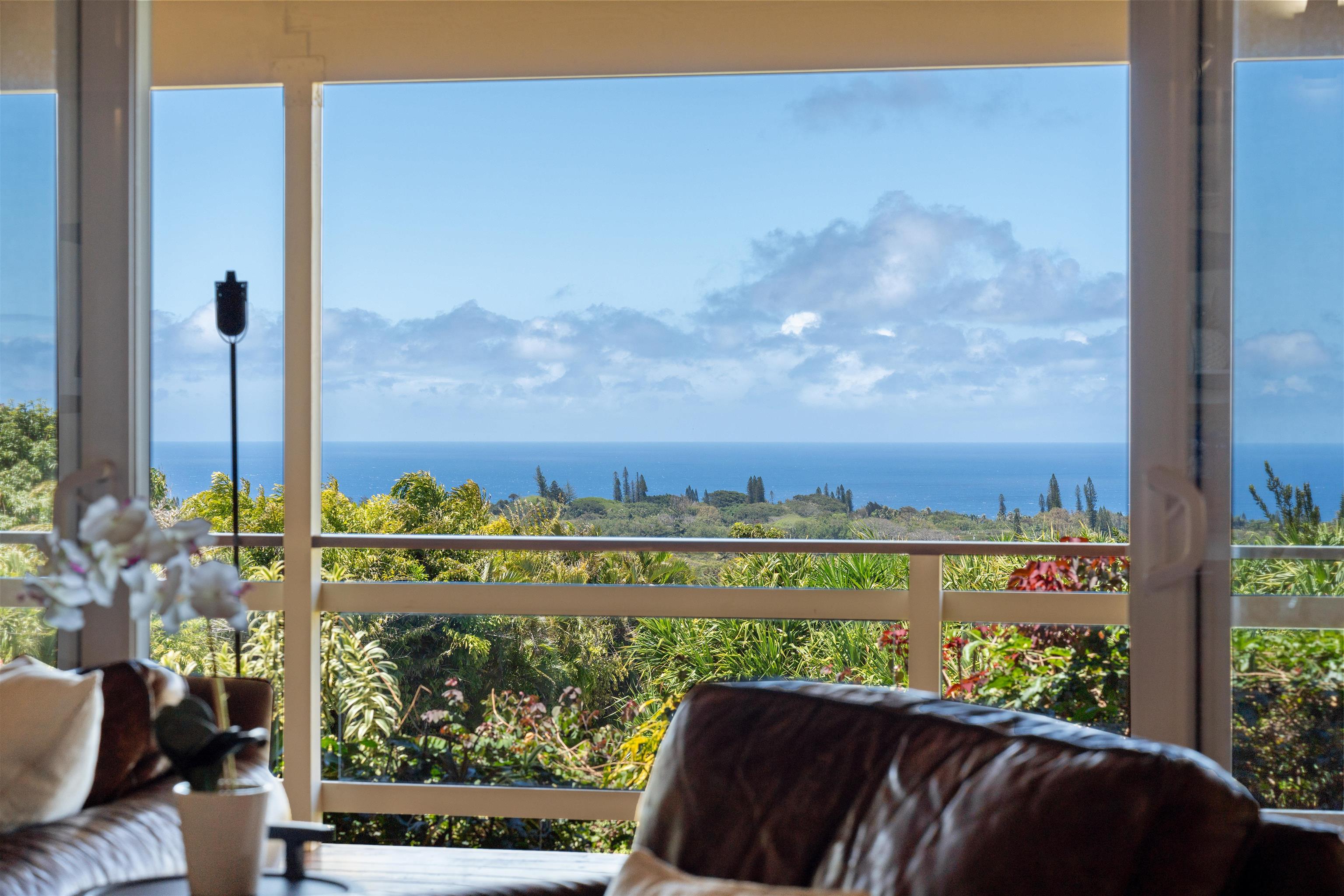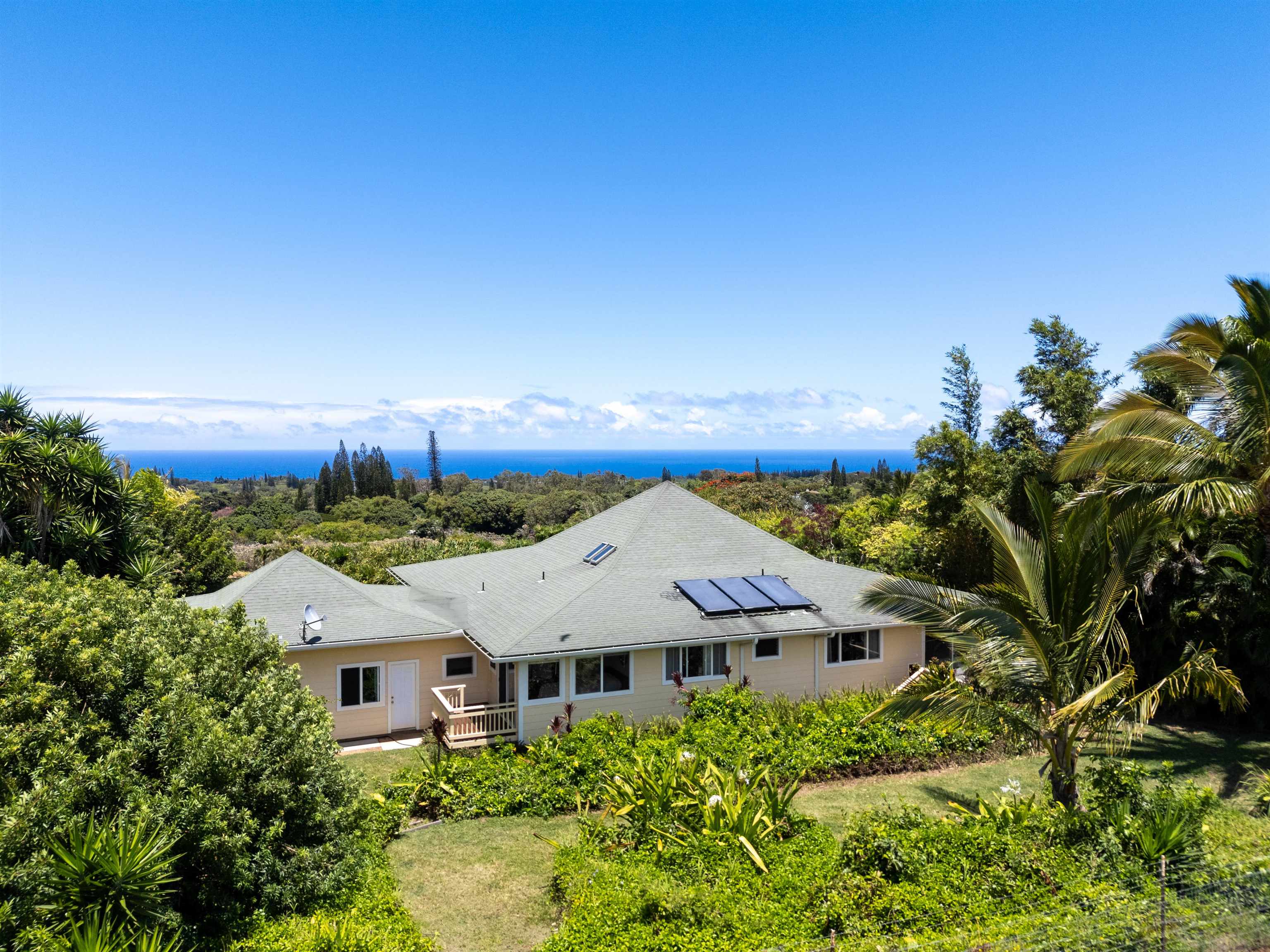 This Haiku estate delivers both ocean and Haleakala views from a spacious 4-bedroom, 3-bath home set on a fully fenced acre with an automatic private gated entrance. This is the ideal setup for accommodating a large family, or multiple guests with ample space for privacy and separation. The home features an open floor plan framed by large windows that flood the space with natural light and showcase the incredible views. The seamless flow between the kitchen, living, and dining areas creates a bright and comfortable atmosphere. Off the main living area is a massive 888 sq ft lanai with multiple seating areas and outdoor cooking space. The primary master suite includes an en-suite bathroom, a large walk-in closet with custom-built-ins, and a private lanai looking over large pasture lands towards Giggle Hill, perfect for quiet mornings or relaxing evenings. An added bonus is a guest suite that features its own entrance, kitchenette, en-suite bath and private lanai. The existing office has a custom-built in murphy bed that provides versatile sleeping accommodations and delivers a functional flow to the space. The zoning for this property is "Rural Half Acre," which offers more flexibility for development. Other notable features of the home is the oversized garage, laundry room, solar hot water and split ac. The property is surrounded by mature fruit trees– Tahitian & Key Limes, Mango, Guava, Valencia Oranges, Mandarins, and a variety of Chili peppers. Pick your own Lilikoi or Star Fruit from the property on any given day. The tropical landscaping is abundant, with plenty of space to garden, entertain, or simply enjoy the peaceful setting. Located just minutes from Haiku town and close to local farms, restaurants, and North Shore beaches, this property offers privacy, views, and a true Maui lifestyle. This property is designated as Unit A of a CPR, with a corresponding CPR-designated land area of 1.0430 acres.