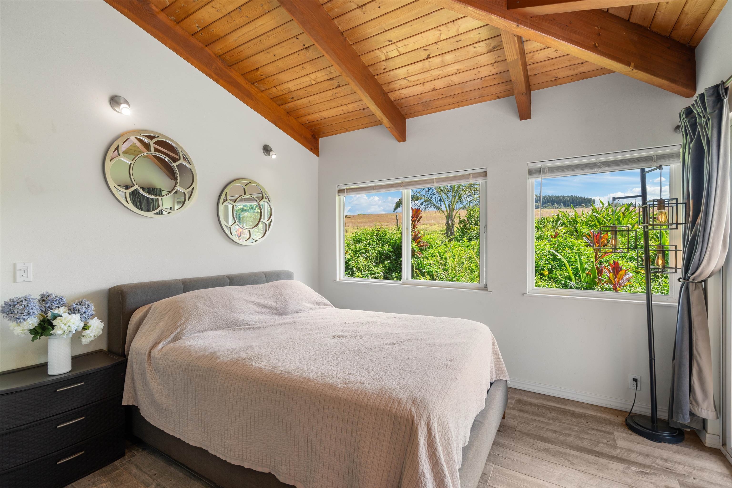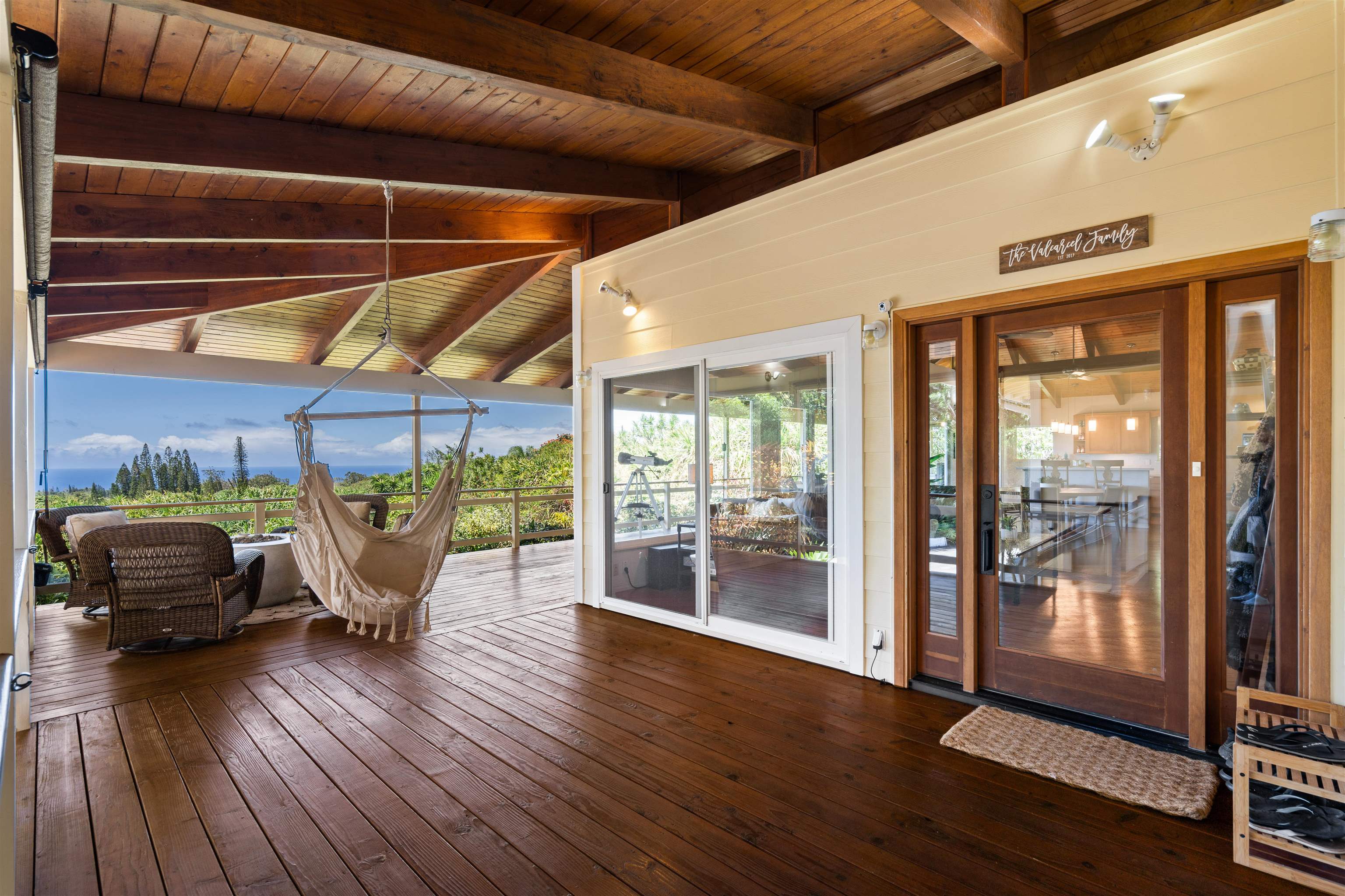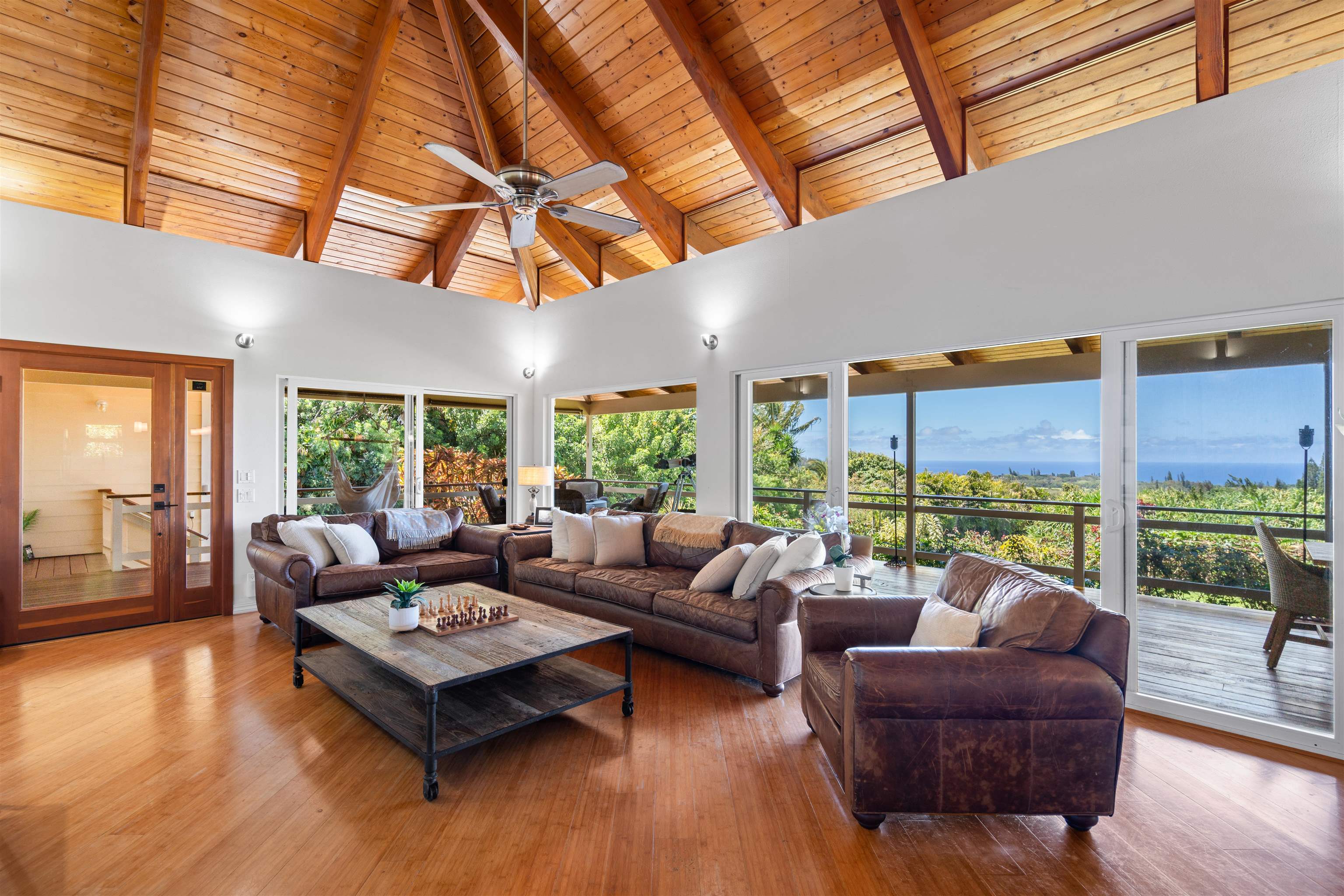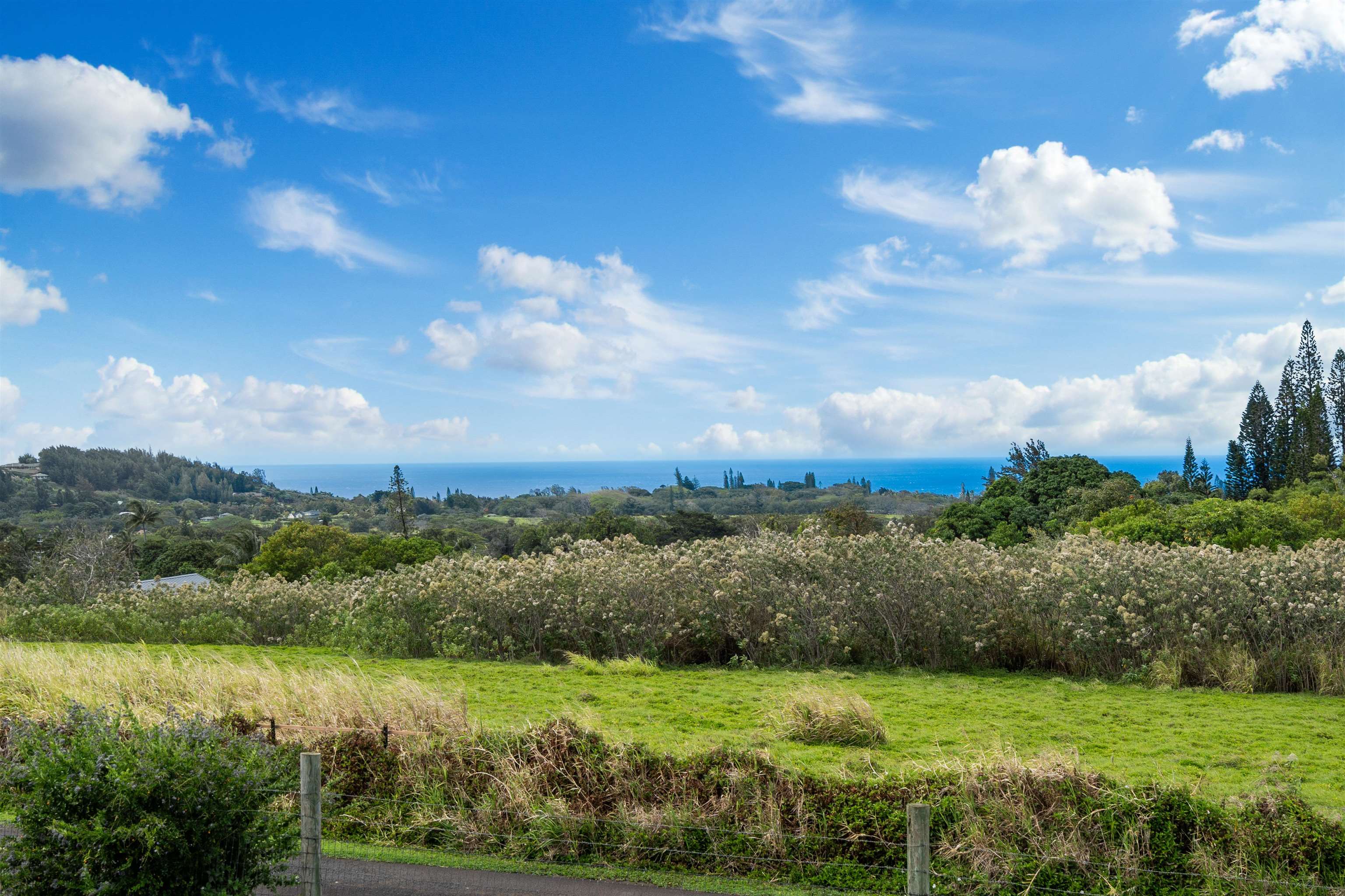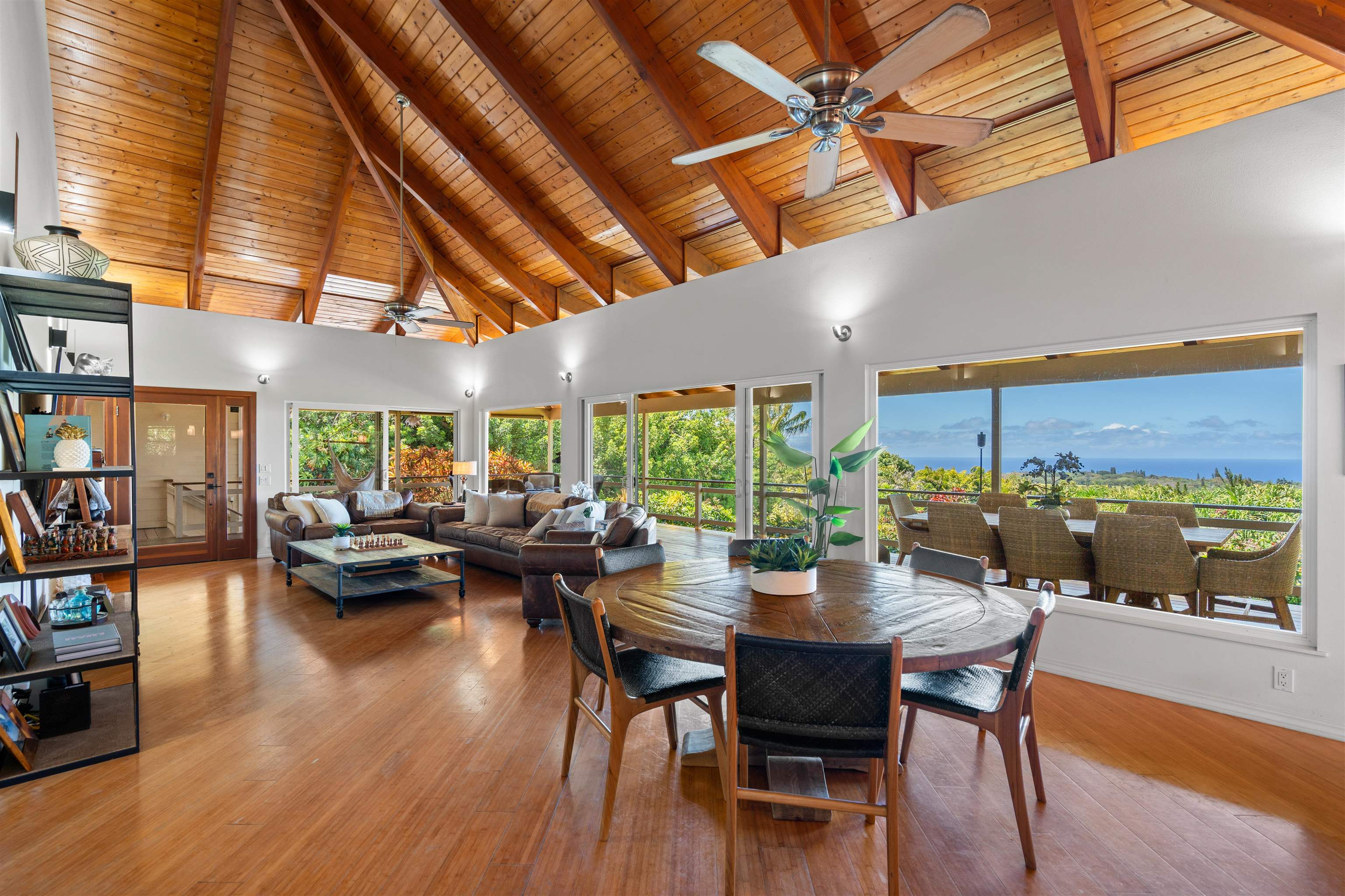 This Haiku estate delivers both ocean and Haleakala views from a spacious 4-bedroom, 3-bath home set on a fully fenced acre with an automatic private gated entrance. This is the ideal setup for accommodating a large family, or multiple guests with ample space for privacy and separation. The home features an open floor plan framed by large windows that flood the space with natural light and showcase the incredible views. The seamless flow between the kitchen, living, and dining areas creates a bright and comfortable atmosphere. Off the main living area is a massive 888 sq ft lanai with multiple seating areas and outdoor cooking space. The primary master suite includes an en-suite bathroom, a large walk-in closet with custom-built-ins, and a private lanai looking over large pasture lands towards Giggle Hill, perfect for quiet mornings or relaxing evenings. An added bonus is a guest suite that features its own entrance, kitchenette, en-suite bath and private lanai. The existing office has a custom-built in murphy bed that provides versatile sleeping accommodations and delivers a functional flow to the space. The zoning for this property is "Rural Half Acre," which offers more flexibility for development. Other notable features of the home is the oversized garage, laundry room, solar hot water and split ac. The property is surrounded by mature fruit trees– Tahitian & Key Limes, Mango, Guava, Valencia Oranges, Mandarins, and a variety of Chili peppers. Pick your own Lilikoi or Star Fruit from the property on any given day. The tropical landscaping is abundant, with plenty of space to garden, entertain, or simply enjoy the peaceful setting. Located just minutes from Haiku town and close to local farms, restaurants, and North Shore beaches, this property offers privacy, views, and a true Maui lifestyle. This property is designated as Unit A of a CPR, with a corresponding CPR-designated land area of 1.0430 acres.