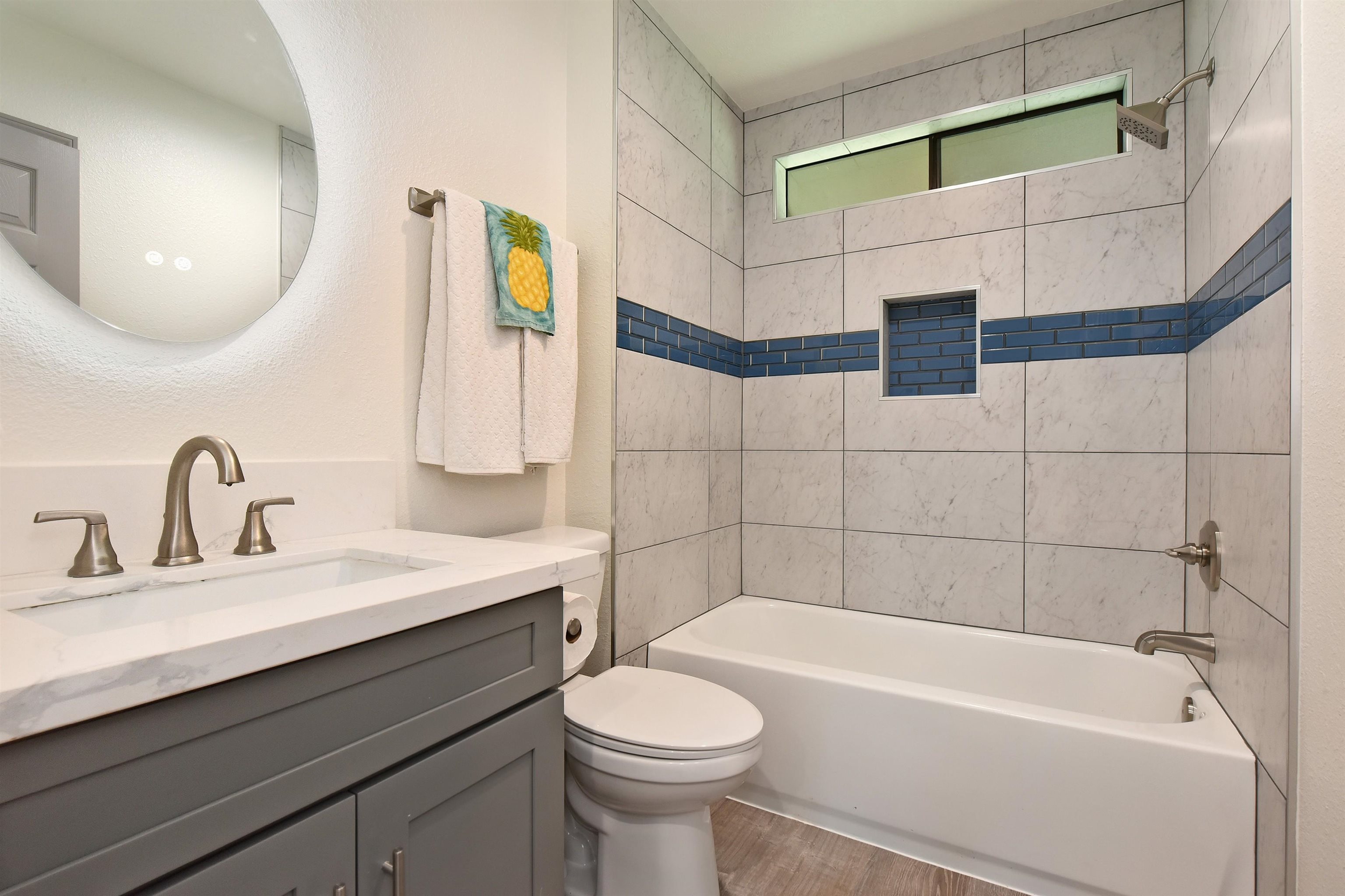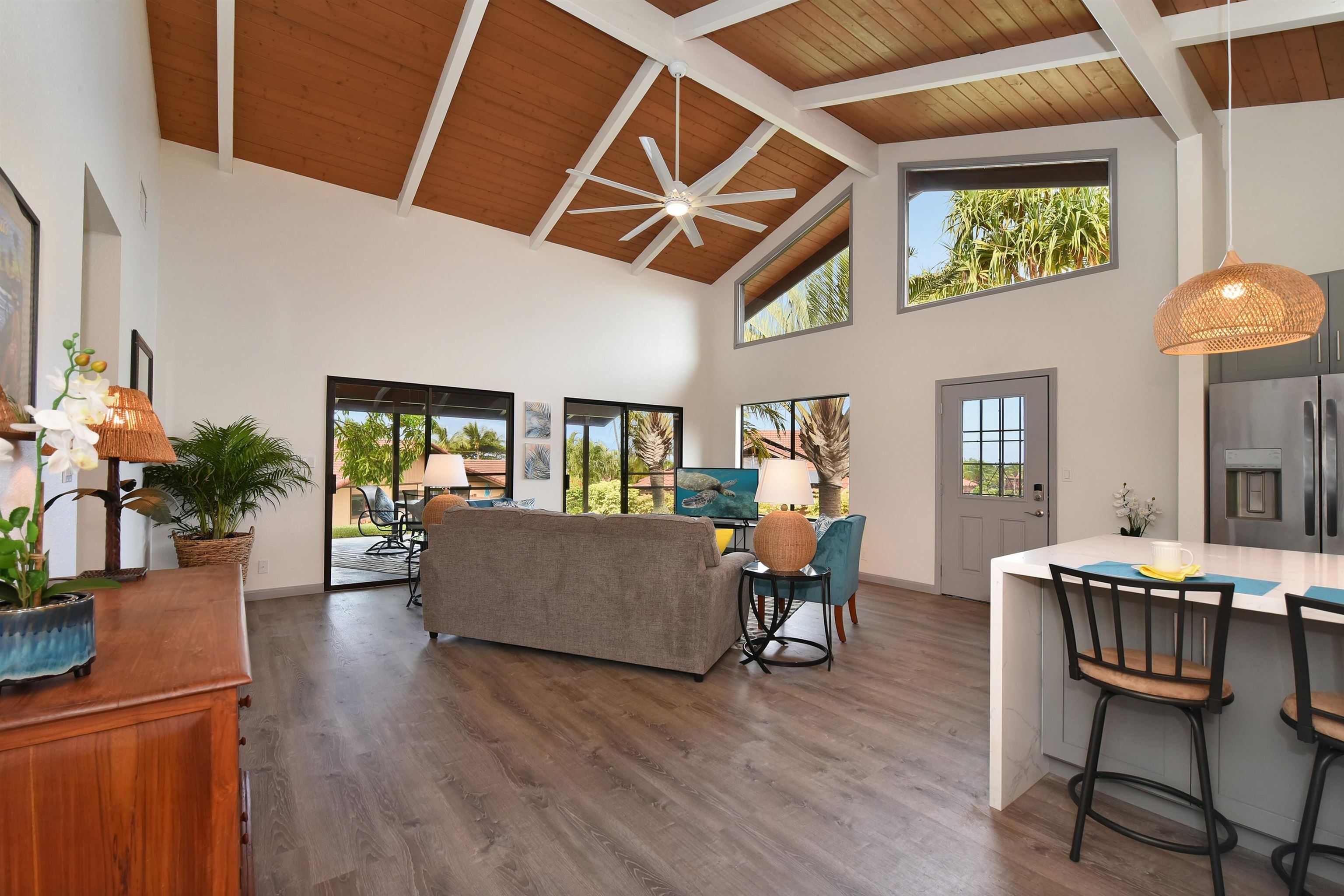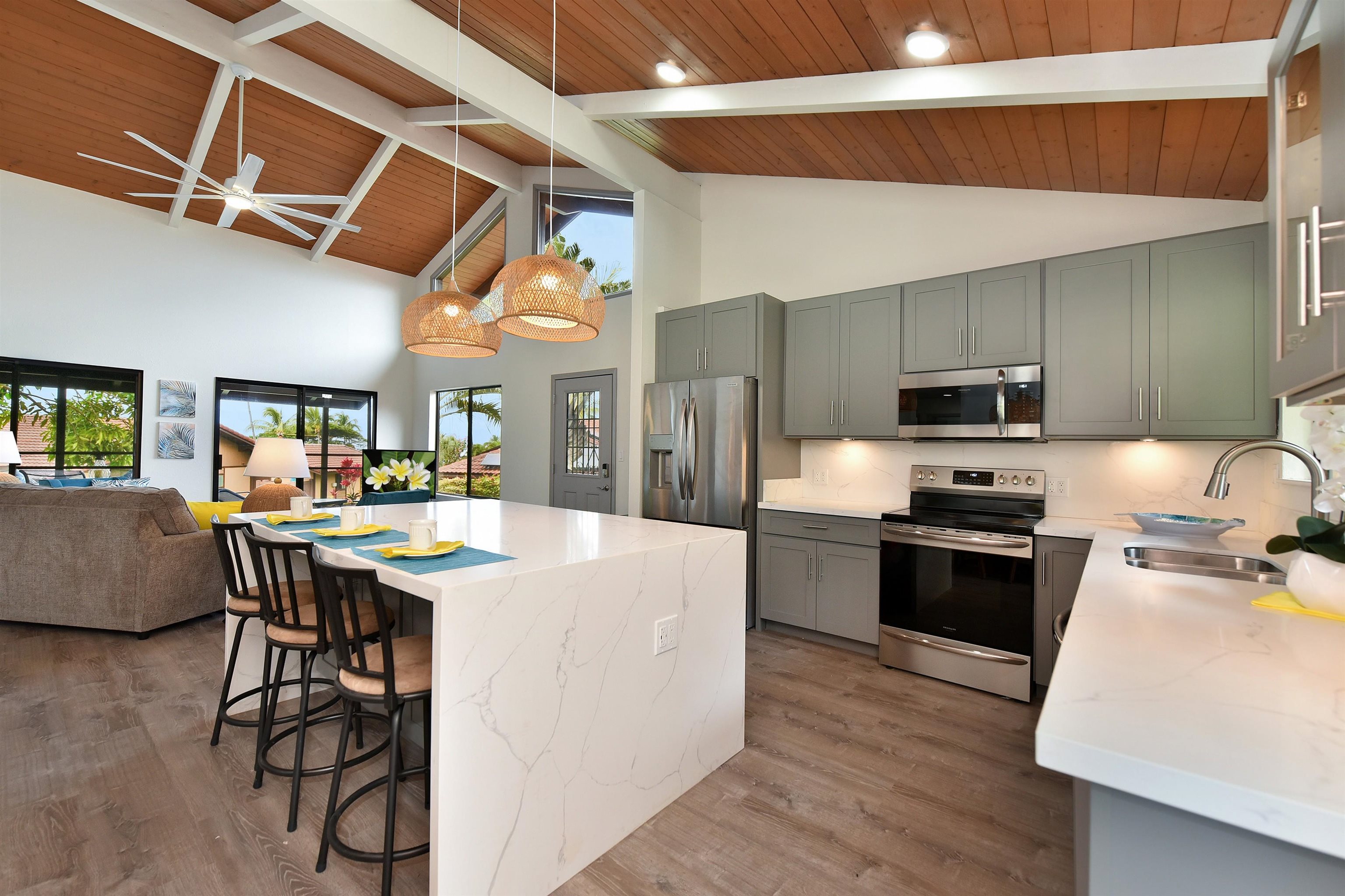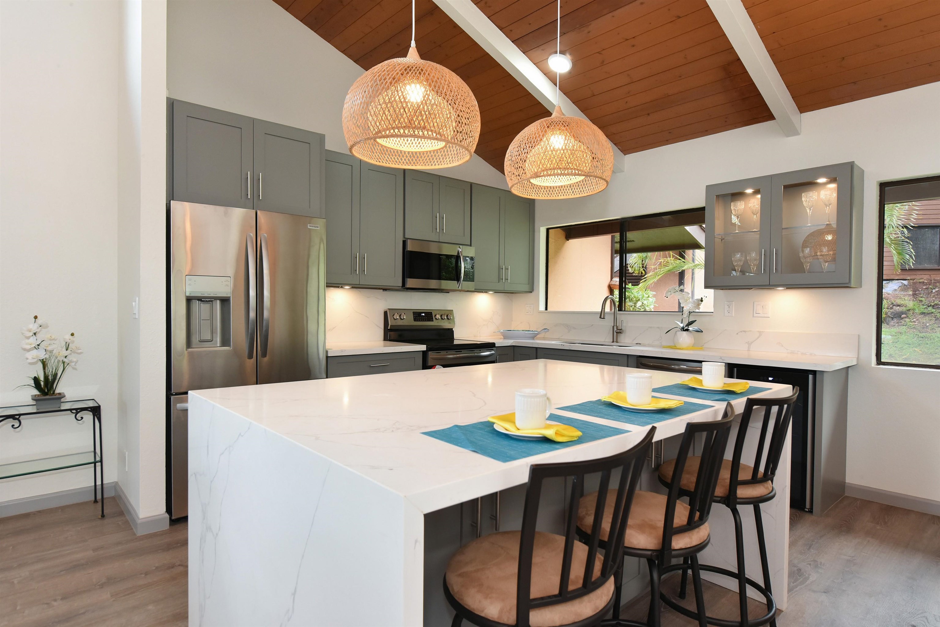 Why settle for a condo when you can enjoy the comfort and privacy of a single-level home with a finished 2-car garage, in a gated community–and still never mow a lawn? Welcome to Kapalani Estates, a boutique community in West Maui offering resort-style amenities including a clubhouse, large pool, and tennis/pickleball court, just a 5 minute walk from the popular S-Turns surf break and Pohaku Beach Park. Tucked into a peaceful cul-de-sac, this light-filled, fully remodeled 3-bedroom, 2-bath residence features vaulted ceilings, an open-concept layout, and seamless indoor-outdoor living. Dual sliding glass doors lead to a spacious covered lanai with partial ocean views, (my favorite room) perfect for entertaining or relaxing at sunset. Inside, enjoy a like-new feel with updated flooring, fresh paint, modern lighting, and stylish finishes throughout. The gourmet kitchen is a standout with waterfall quartz countertops, soft-close cabinetry, new appliances, and a large island ideal for gathering. The primary suite offers a spa-like retreat with a double vanity, backlit LED mirrors, and an oversized walk-in shower. Additional bedrooms, a beautifully updated guest bath, new laundry center, and excellent storage make this home truly move-in ready.