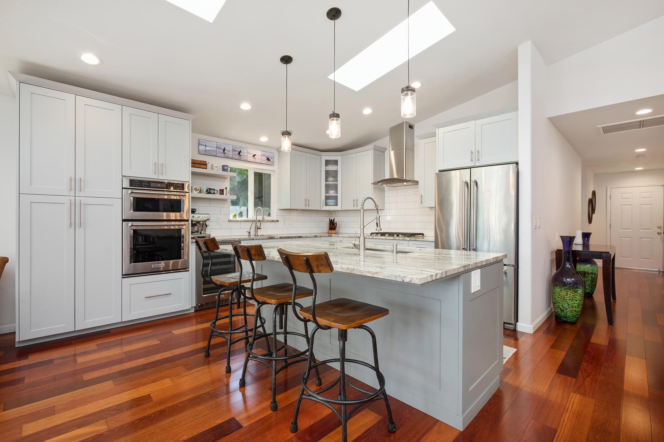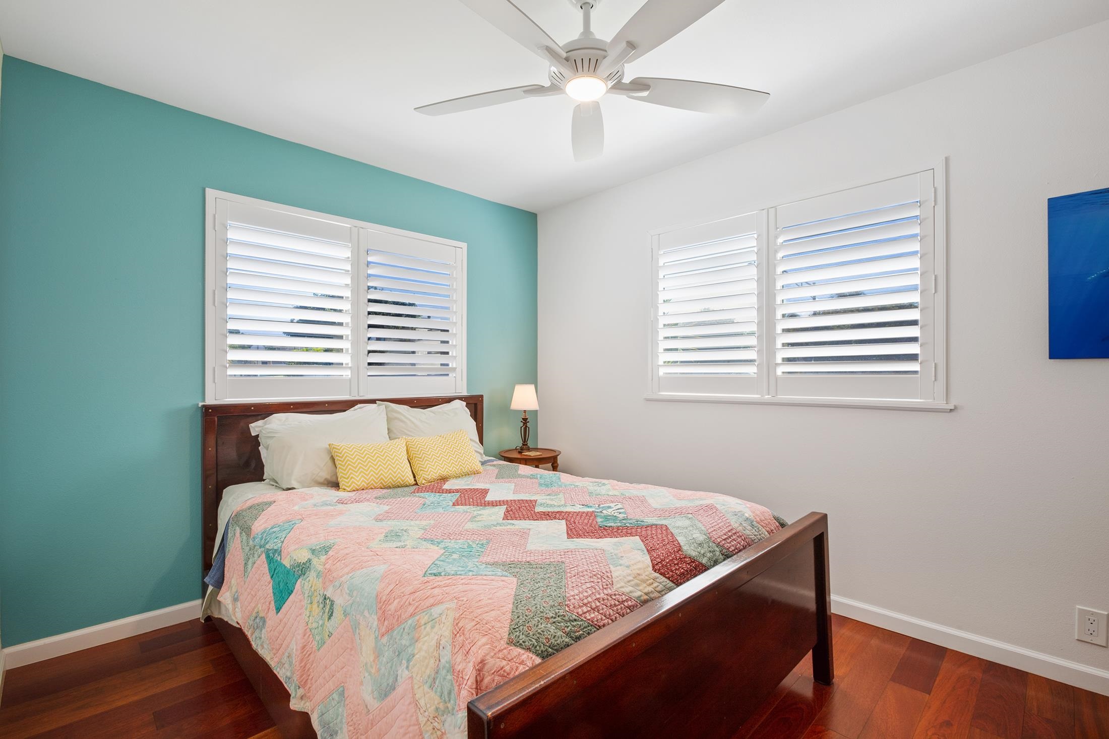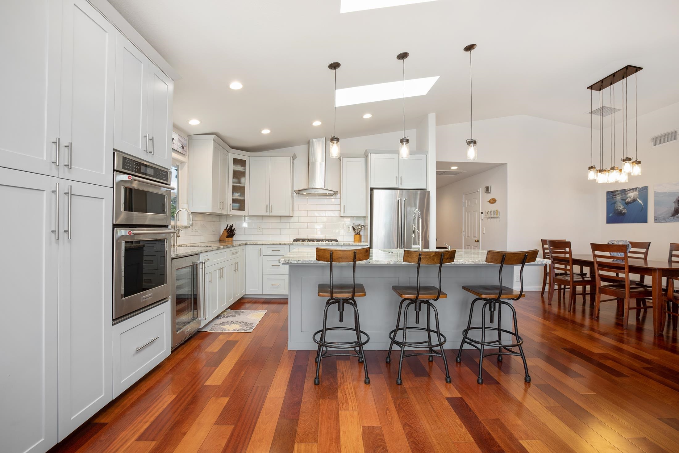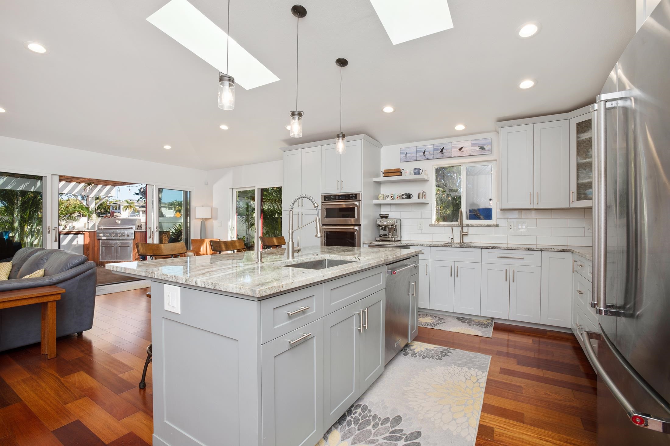 This is not your typical Pi'ilani Villages home. Brazilian Cherry wood flooring flows throughout the living spaces, and custom finishes greet you in every room. The kitchen is elegant and highly functional, with custom-built cabinetry and mahogany soft-close drawers, granite countertops, and a spacious island with an undermount sink and dishwasher. Premium KitchenAid appliances include a gas cooktop, convection oven, side-by-side refrigerator, dual-zone wine fridge, and a prep sink overlooking the gardens. Velux skylights fill the space with natural light, creating an inviting hub for everyday living and entertaining. The rear opens to a level 600-square-foot lanai through Pella sliding glass doors, and features an Ipe wood deck, redwood pergola, and a fully equipped outdoor kitchen with a 36” KitchenAid gas grill, granite counters, sink, and refrigerator, perfect for year-round enjoyment. An outdoor shower and irrigated gardens complete the private retreat. The primary suite has a spa-like bath with a custom stone and tile shower and rain shower head, while plantation shutters and modern ceiling fans enhance comfort throughout the home. Major upgrades include a Lennox three-zone air-conditioning system, whole-house water softener, reverse-osmosis kitchen system, tankless water heater, and upgraded 200-amp electrical service. Home features 26 owned photovoltaic panels and net metering, producing approximately 8.7 — 8.8 megawatts annually. The average net electric bill in 2025 was just $65 per month. Additional highlights include epoxy-coated garage floors, stacked Samsung washer/dryer, and recently replaced window screens. Your buyers will thank you for showing them this beautiful, well-priced luxury home.