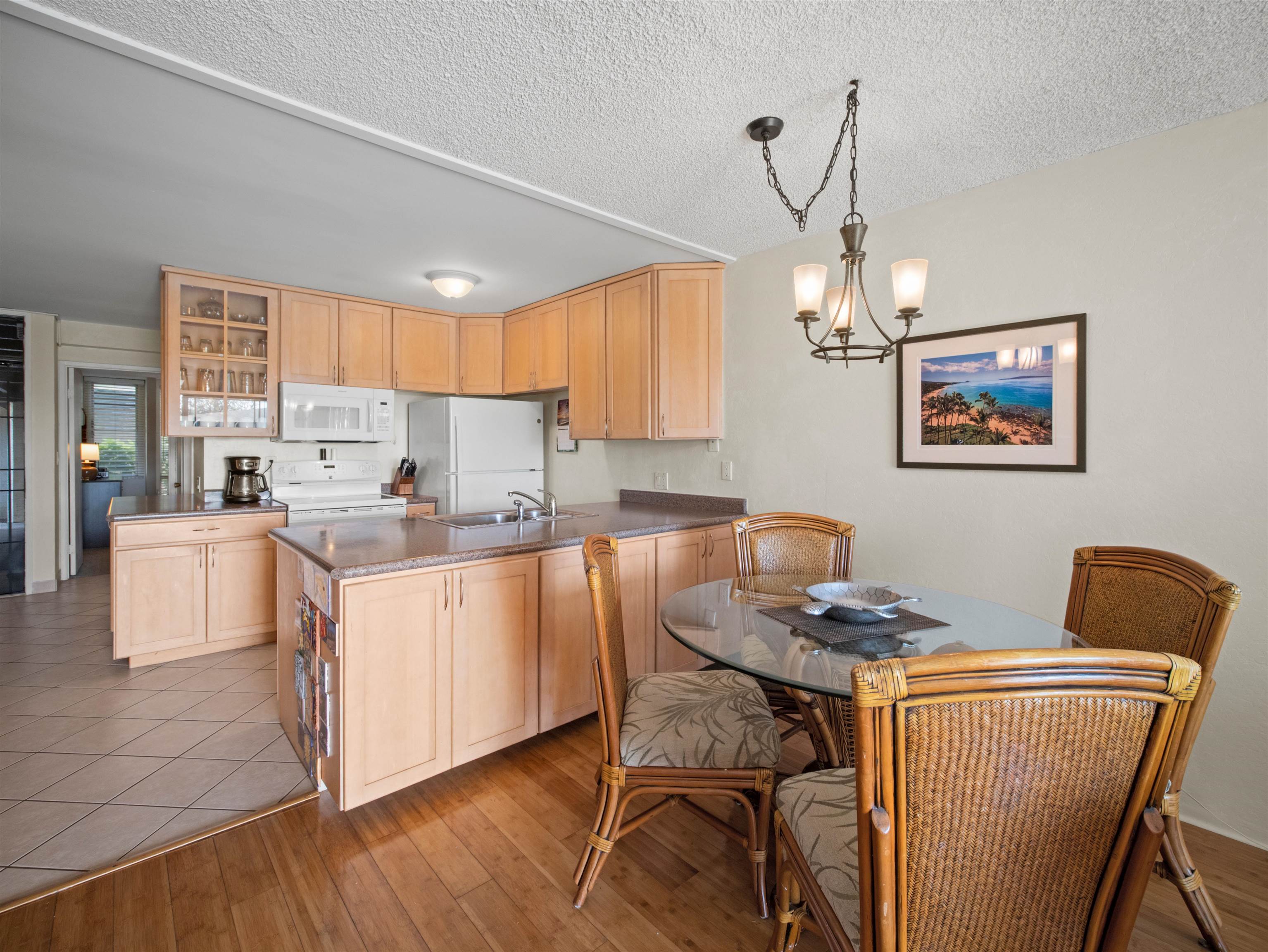 Discover refined coastal living from this elegantly appointed 1-bedroom, 1-bath condominium showcasing ocean and year-round sunset views as well as mountain views for Haleakala sunrises. The best of both worlds!! Perfectly positioned adjacent to the pristine white sands of Kamaole III Beach Park, this residence offers an effortless connection to one of South Maui’s most treasured shorelines. The low-rise enclave is celebrated for its tranquil ambiance, featuring two resort-style pools, tennis courts (which are lined for Pickle Ball courts) and impeccably maintained tropical landscaping. A popular vacation rental destination, this highly desired location provides exceptional potential for future rental opportunities (contact your agent for details regarding potential future vacation rentals). This is a rare chance to secure a luxury retreat in one of Kihei’s most desirable beachside settings.