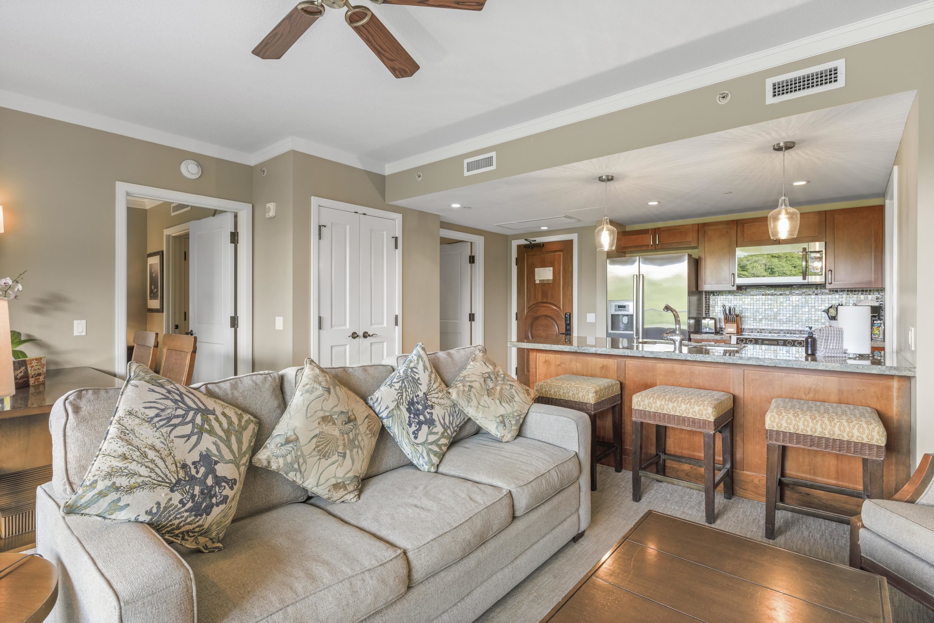 This full sized 690 sq ft one-bedroom is located on the northern side of the Konea tower. Its secluded position overlooks North Park. Offering a quiet getaway from the hustle bustle of the resort, K236 has easy access without needing to wait for elevators. It offers a cool northern exposure with no direct sunlight beating down on you as you enjoy your lanai experiences. Honua Kai amenities include 3 distinct swimming pools, 5 hot tubs, valet and underground parking, concierge service, HOA owned work out facility, Ho'ola Spa and of course, Dukes Beach House. Priced competitively, this is truly a “MUST CONSIDER” home if you're looking at real estate on Maui.