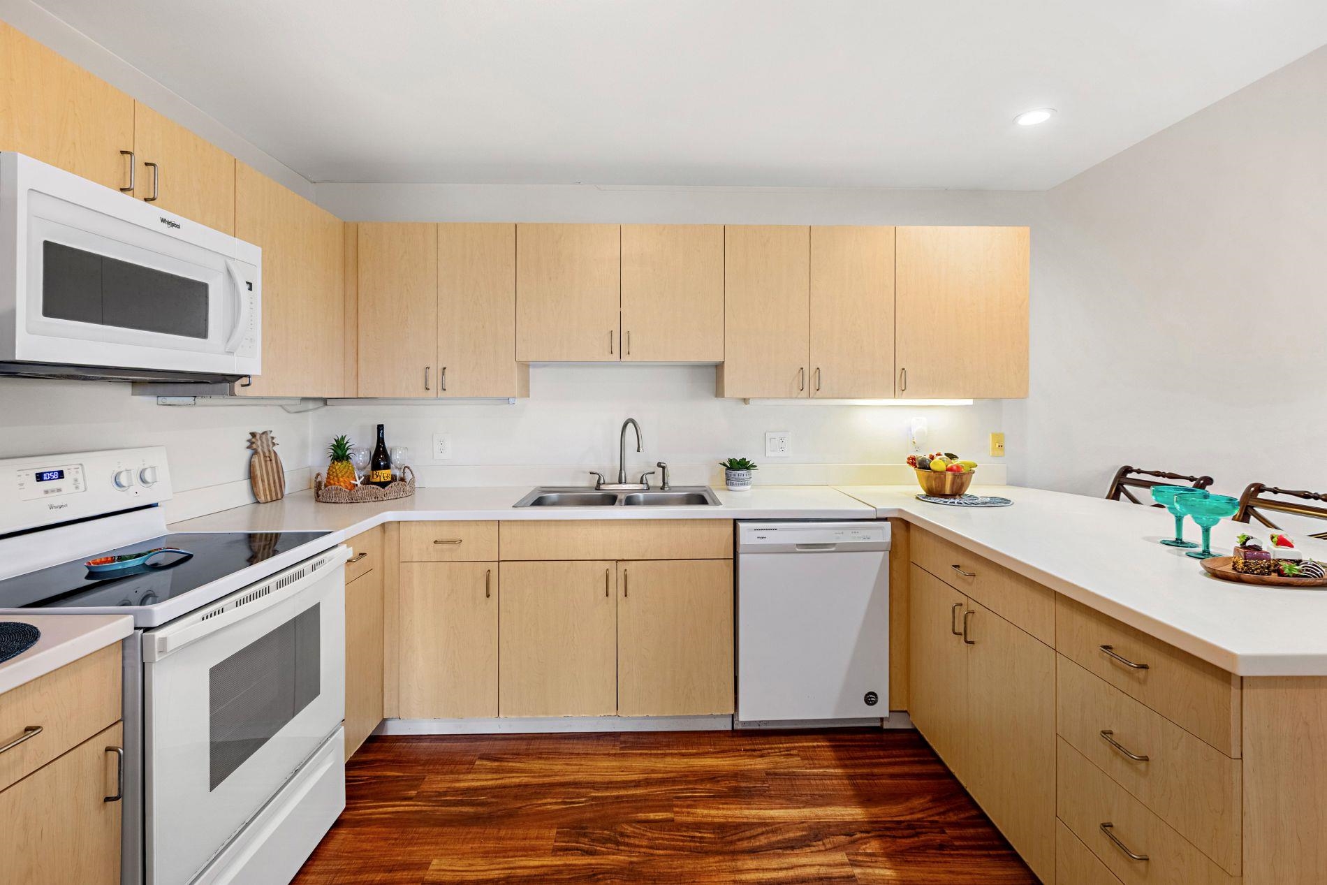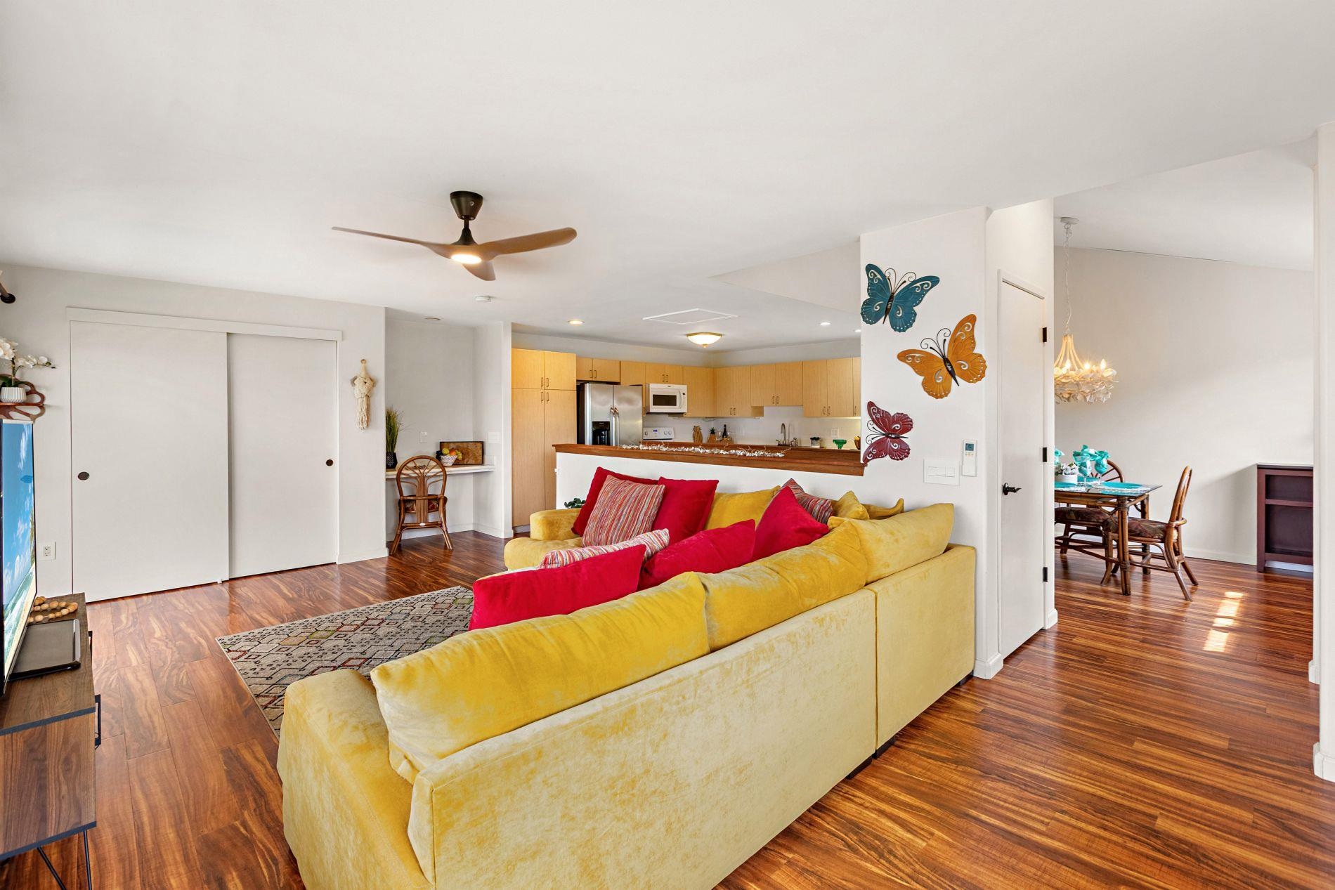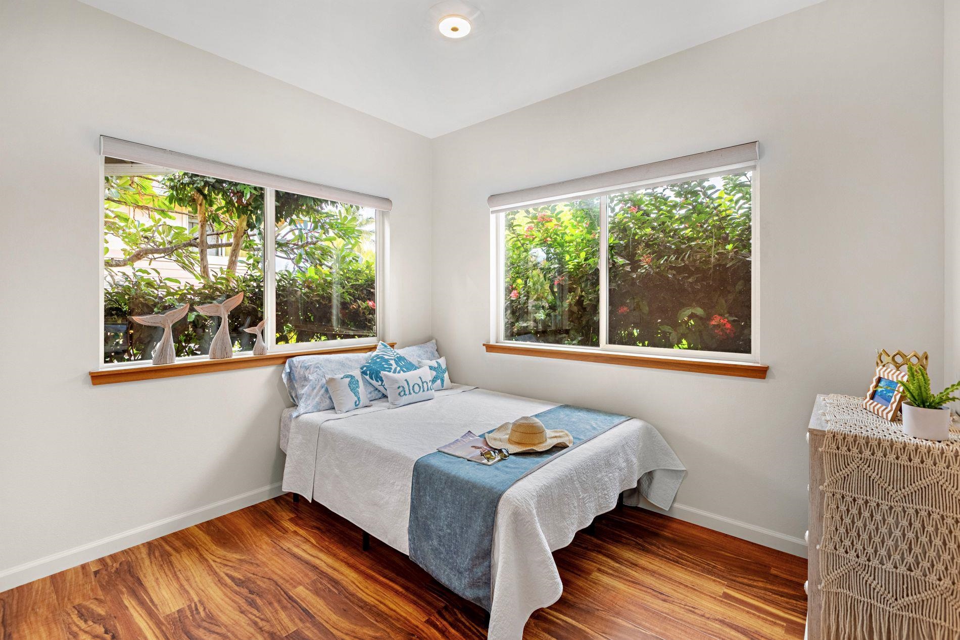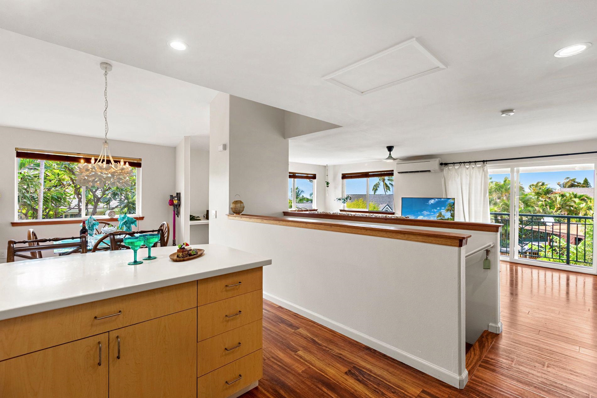 Largest floor plan in Napili Villas. This two-story unit offers the primary bedroom and two guest bedrooms on the ground floor, with the kitchen and living room upstairs featuring a partial ocean view. The layout provides good separation between living and sleeping areas. Renovations were completed in 2021 and include new flooring, fresh interior paint, split AC units, and updated bathrooms with new vanities, tile flooring, tiled showers with glass enclosures, and new fixtures. The unit includes two deeded parking stalls (85 and 86) with convenient visitor parking nearby. Located close to Napili Market for shopping and just minutes from Napili Bay for beach and ocean activities, this is a solid West Maui location