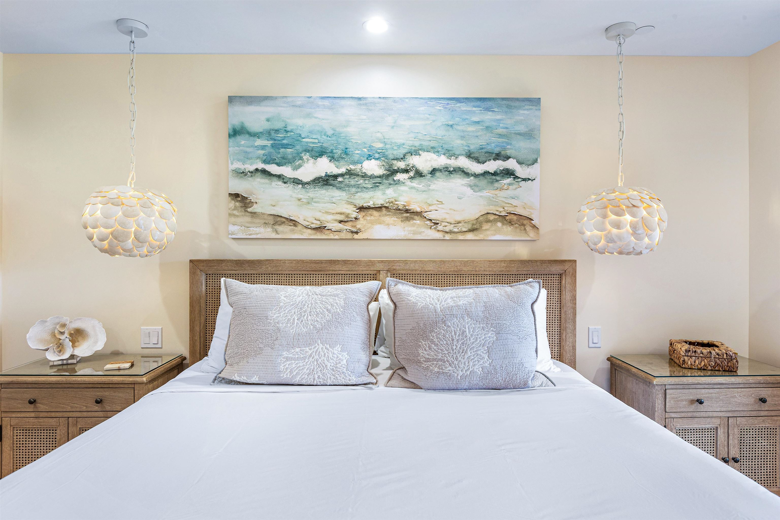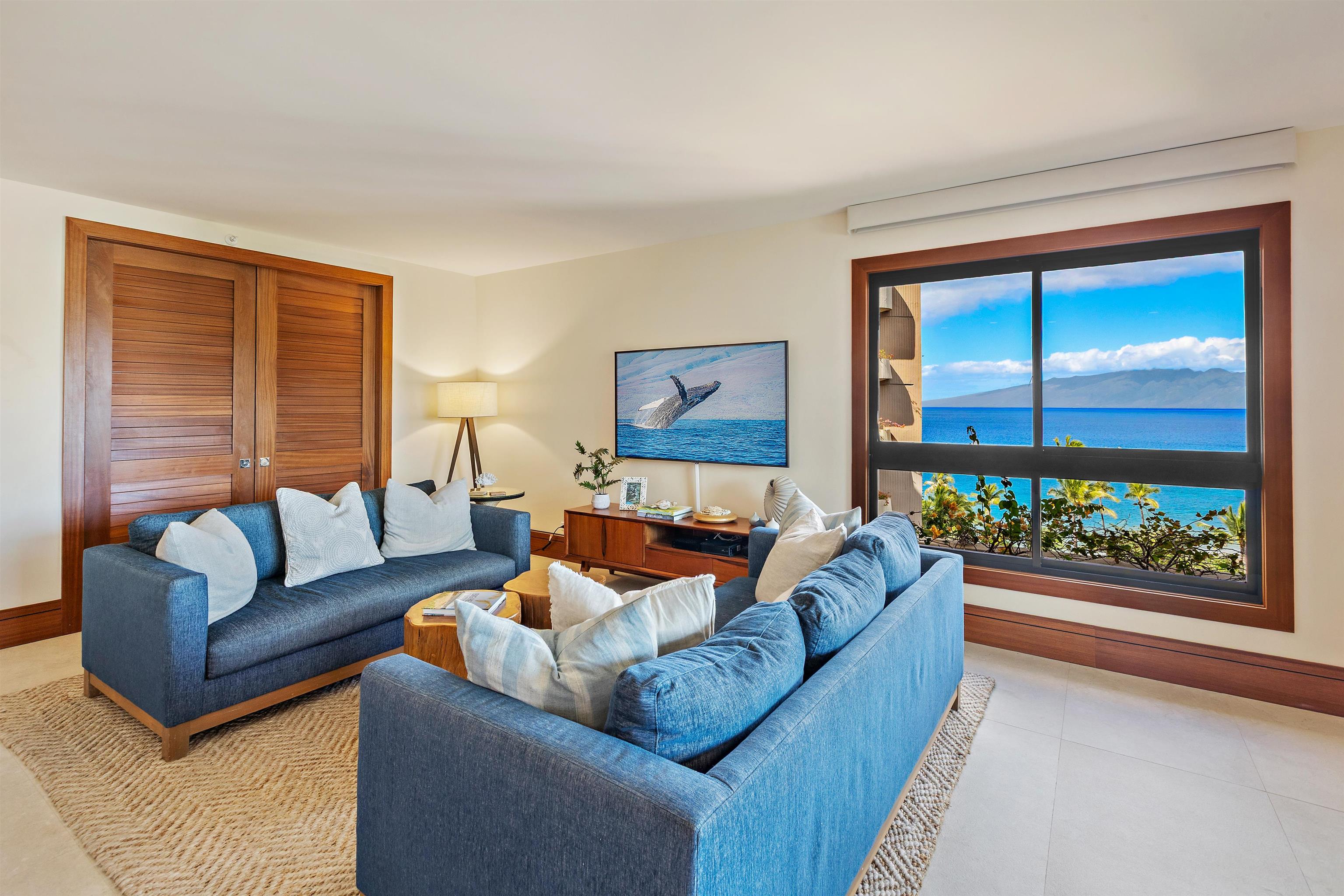 Welcome to Ka’anapali Ali’i, Unit 2-1002 where meticulous design meets natural beauty. Located on the 10th floor, this masterfully reimagined residence features a one-bedroom, two-bathroom retreat plus a versatile den. Following an extensive 2022 renovation, this home offers a visual trifecta of the Pacific Ocean, the lush fairways of the Royal Kaanapali Golf Course, and the majestic West Maui Mountains. Every inch of this interior has been curated to balance modern luxury with a relaxed "beach house" ambiance in an uncompromising commitment to quality. Oversized porcelain tile flooring flows seamlessly throughout, illuminated by the artistic highlights of a custom designed lighting package. Handcrafted Sapele wood cabinetry and millwork provide a warm, organic foundation, complemented by custom louvered doors and matching trim. As a stunning centerpiece, the kitchen incorporates Taj Mahal granite with a dramatic waterfall slab design. This premium stone extends into the bathrooms, where chiseled stone sinks accent gracefully elongated vanities. Offered fully furnished, this coastal chic residence enjoys a sophisticated blend of high-end pieces from Serena & Lily, Pottery Barn, and Arhaus, ensuring that the home is as comfortable as it is photogenic. Situated directly on the sands of world-famous Ka‘anapali Beach, the Ka‘anapali Ali‘i Resort continues to set the gold standard for luxury condominium living in West Maui.