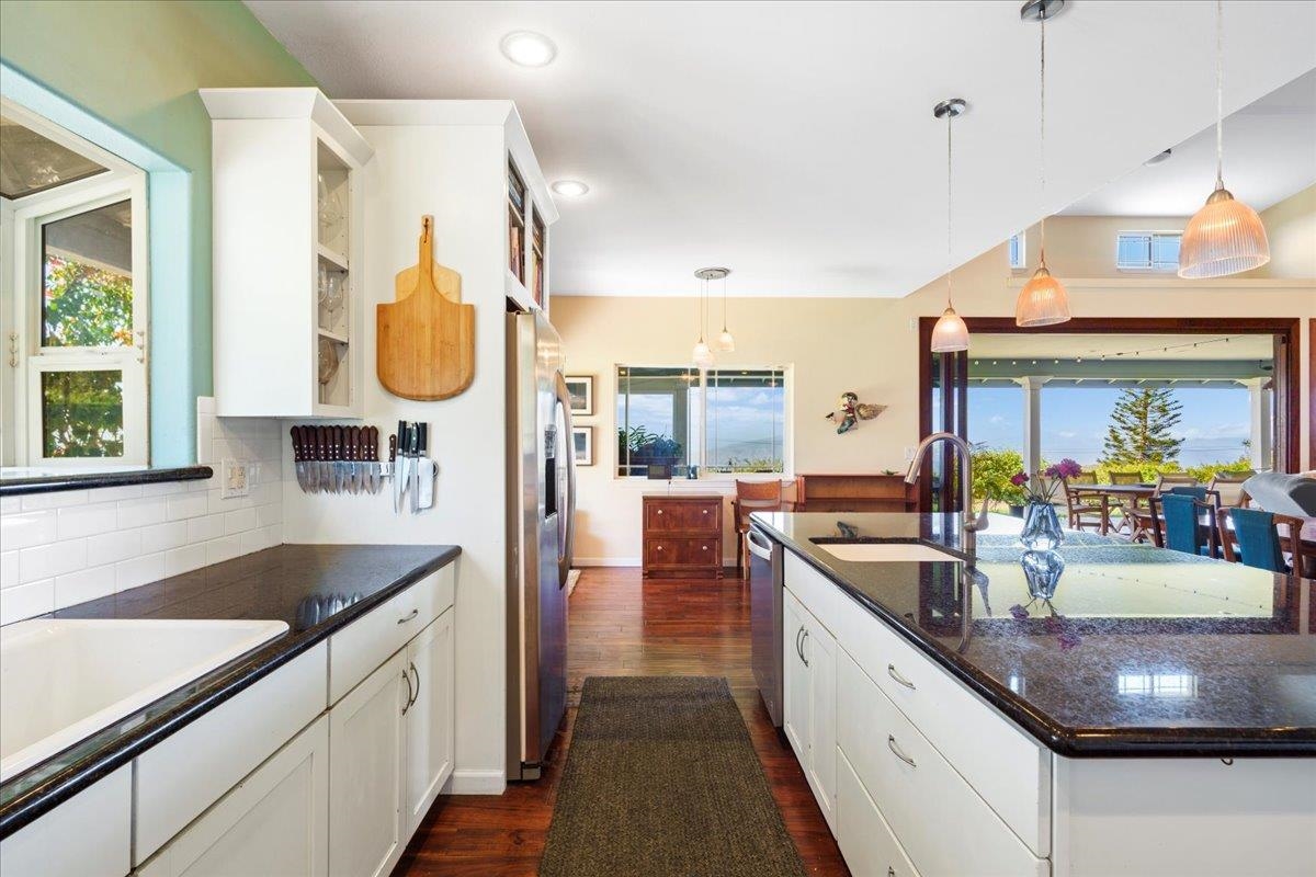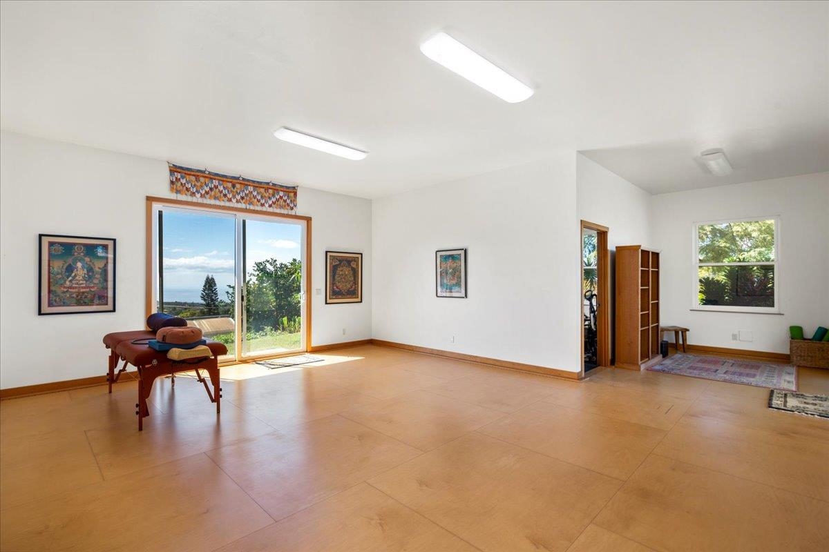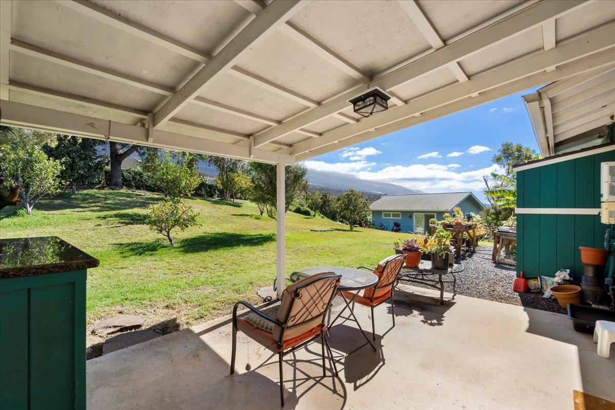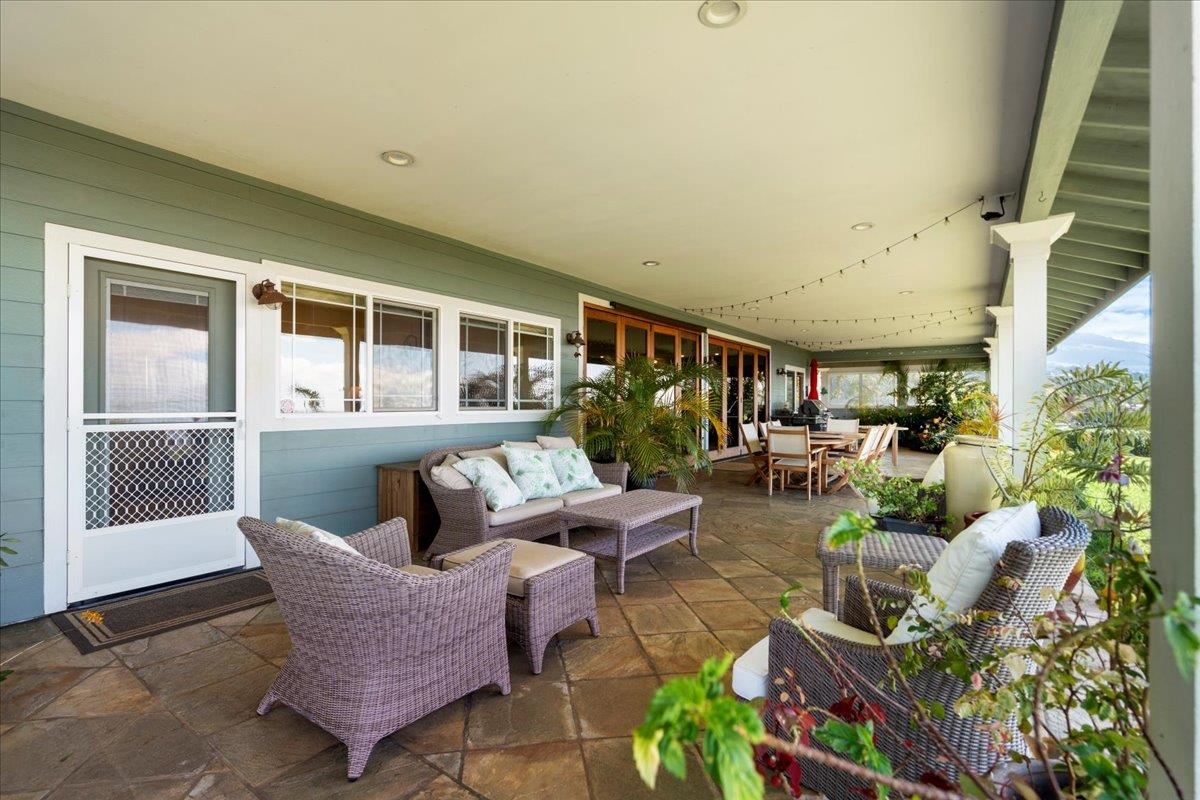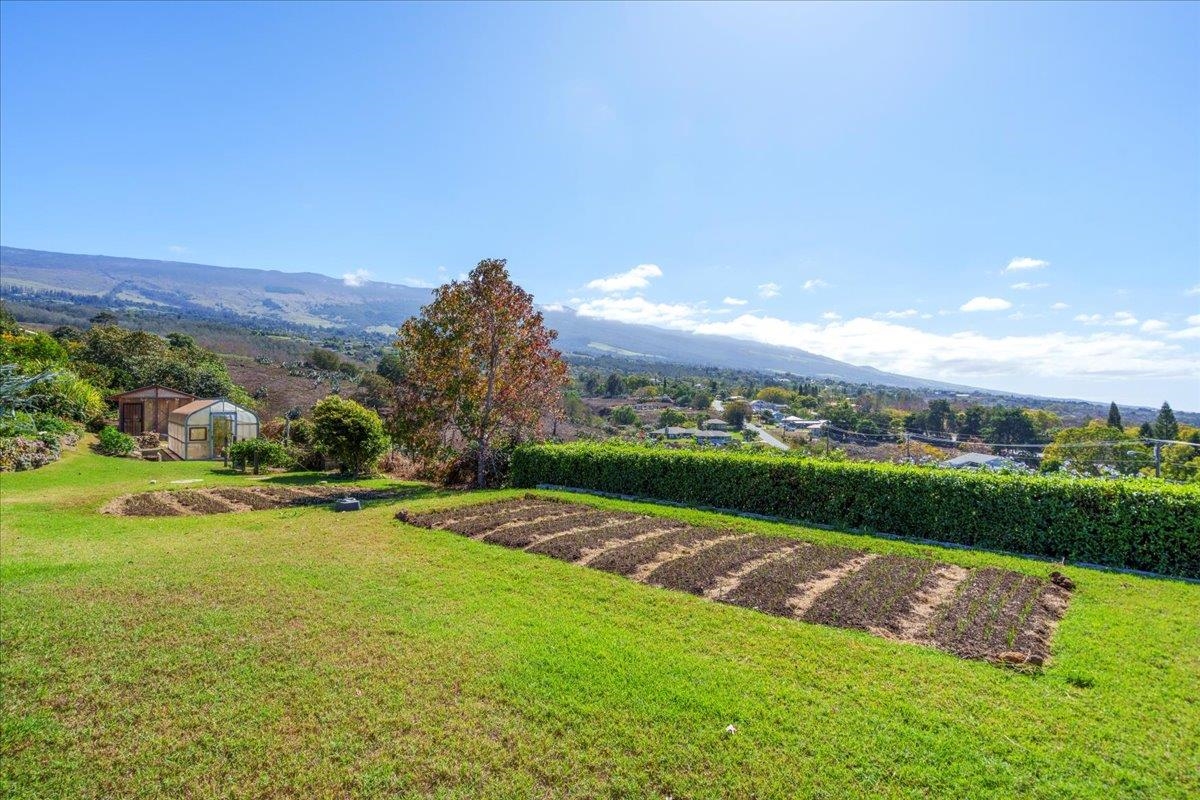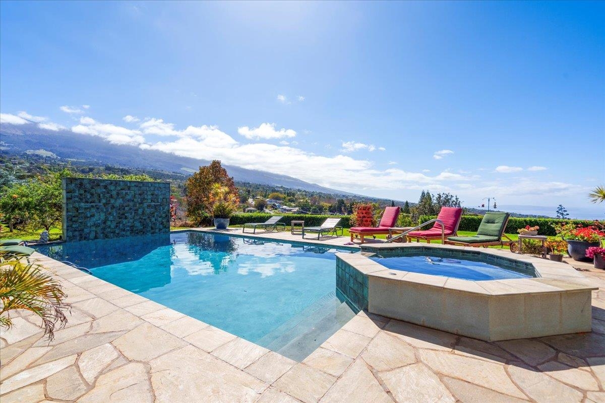 Set across two fully usable acres in one of Kula most desirable microclimates, this exceptional agricultural-zoned estate presents a rare fusion of refined luxury, privacy, and productive farm-to-table living–framed by commanding west-facing ocean and sunset views over the West Maui Mountains and the neighboring outer islands. The single-level main residence is thoughtfully designed with no interior steps, soaring vaulted ceilings, and expansive window walls that flood the home with natural light while capturing sweeping panoramic vistas. Contemporary farm-style finishes complement the home’s elevated setting, creating a sophisticated yet relaxed Upcountry living experience. A large oversized covered lanai extends the interior living space outdoors, ideal for entertaining, dining, and daily sunset enjoyment. A separate-entry mother-in-law’s quarters provides flexible accommodations for extended family, guests, or on-site support. The main home also features an attached two-car garage, offering convenience and secure storage. The outdoor amenities elevate the property to a true private retreat. A resort-style pool deck showcases a swimming pool, jacuzzi, and waterfall water feature, all overlooking rolling pasturelands and enjoying exceptional privacy due to the home’s commanding elevation above neighboring properties. Mature landscaping, expansive manicured lawns, and a wide variety of established fruit trees create a lush, estate-like environment. Adding significant versatility is a detached three-bedroom cottage with its own private driveway, a dedicated two-car garage, and additional carport parking equipped with electric vehicle charging–ideal for extended family living, guest accommodations, or potential rental use. The property also includes a detached yoga studio / agricultural outbuilding, along with two separate greenhouse structures, supporting both wellness-oriented uses and agricultural production. The home is equipped with solar and two Tesla batteries, providing energy efficiency and reliable backup power. Historically operated as a working farm with hosted tours and yoga experiences, the land continues to produce substantial fruit and agricultural yield, enabling a true farm-to-table lifestyle for daily living and entertaining. The entire estate has been upgraded and remodeled and is offered in move-in-ready condition, allowing immediate enjoyment without compromise. Centrally located within Kula, the property is just minutes from the area's most sought-after restaurants, shops, and Upcountry destinations, while maintaining a rare sense of elevation, openness, and tranquility. A distinctive opportunity to own a luxury contemporary farm estate in one of Maui’s most ideal climates–where sunset views, productive land, and elevated island living seamlessly converge.