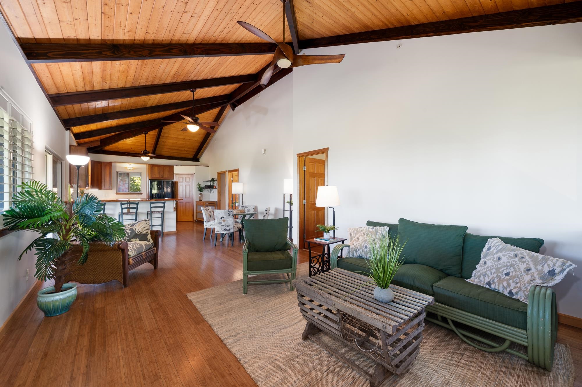 Welcome to your private, lush, ocean view sanctuary in the heart of Maui’s north shore. Enjoy a large main home with custom woodwork and finishes throughout this 2 BR/ 2 BA upstairs and a separate 1 BR/ 1 BA lock-off guest space downstairs. A massive wrap around lanai can be used as indoor/outdoor living with its thoughtful design to optimize the views and weather patterns. A spacious 2 car garage adds even more value to the main home. Located the perfect distance away from the main house sits a 2 BR/ 1 BA detached cottage in a private, beautifully landscaped setting and with a large covered carport and dedicated yard. A craftsman-built workshop is waiting for you to have as extra storage, to complete projects and the uses go on and on. All of this is on an incredible 1 acre of pristine usable land. It is rare to have a multi-dwelling estate that has not been CPR’d on the north shore. There are so many tropical flowers and fruit trees…avocados, citrus, coconuts, papayas and bananas abound. Close to hikes and waterfalls and yet boasts high speed internet and is only 11 minutes to Haiku town and approximately 30 minutes to the airport. This legacy paradise property has it all!