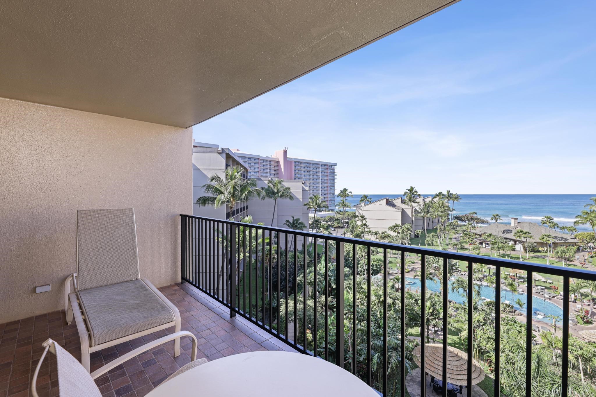 Kaanapali Shores #727 — Enjoy exceptional ocean views from this well-appointed 7th-floor, two-bedroom, two-bath residence at Kaanapali Shores, overlooking the beautifully landscaped courtyard and out toward the Pacific. The upgraded kitchen features granite countertops and custom cabinetry, perfect for everyday living or entertaining. The primary bedroom offers ocean views and an en-suite bath, while the spacious second bedroom includes ample closet space. Additional highlights include a personal owner’s closet and an in-unit washer and dryer. Kaanapali Shores is a premier beachfront property offering resort-style amenities including two swimming pools, on-site restaurant, fitness center, pickleball and tennis courts, covered parking, small grocery store, and a 24-hour front desk. Located in the hotel zone, this property allows for vacation rentals or full-time living. A fantastic opportunity in an unbeatable location–this is a must-see to truly appreciate.