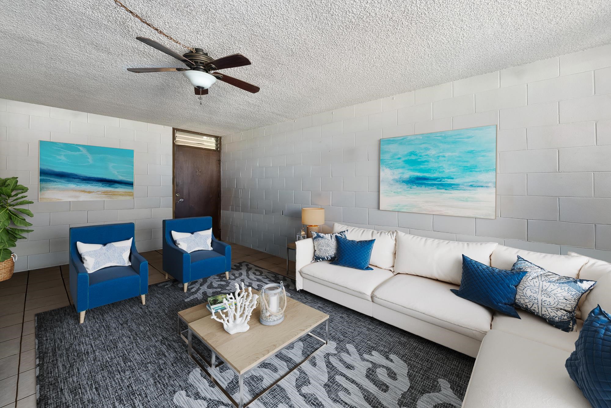 A rare opportunity at Kalama Terrace! This spacious 2 bedroom, 1 bath end-unit offers approx. 685 sq. ft. of comfortable living with extra windows that invite natural light and cooling tradewinds. Positioned on the 2nd floor directly across from the sparkling pool and BBQ area, you'll enjoy ocean views from your private lanai and the ease of corner-unit privacy. As one of only a handful of 2-bedroom residences in the complex, this condo stands out for both size and convenience. Kalama Terrace is a boutique 61-unit community in the heart of South Kihei–just a short stroll to Charley Young Beach, Kamaole I, and the Cove, where Maui locals and visitors alike swim, surf, and watch unforgettable sunsets. Shopping, dining, and grocery stores are also nearby, making everyday living effortless. The complex has recently been refreshed with exterior painting, new gutters, and an updated pool deck and BBQ area. On-site laundry and assigned parking add to the convenience, while the monthly maintenance fee includes electricity, water, sewer, trash, propane, and grounds upkeep–keeping ownership simple and stress-free. Whether you're seeking a primary home, vacation getaway, or investment property, this South Kihei gem combines location, lifestyle, and value. Rarely available, and ready for you–schedule your showing today. Photos have been virtually staged.