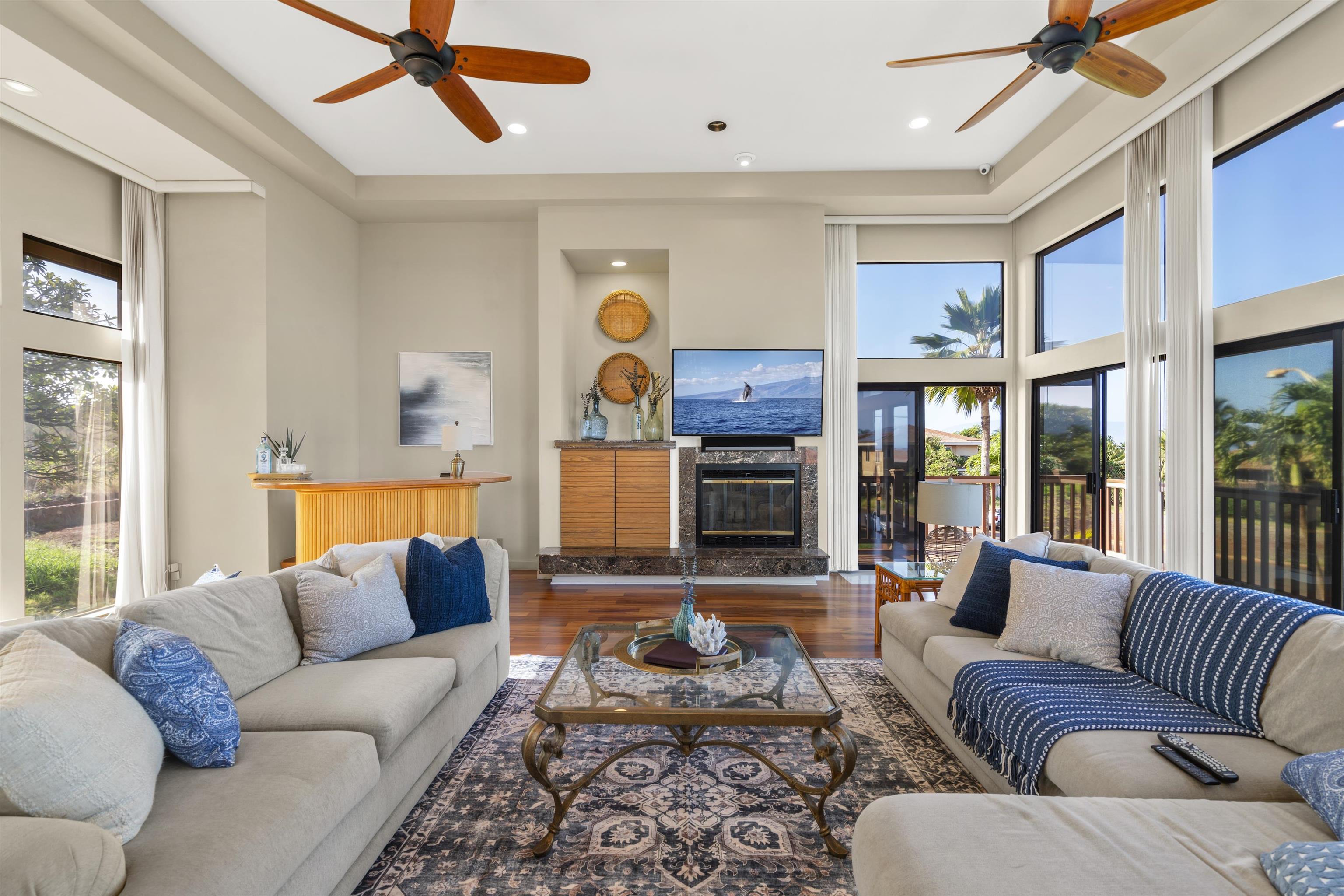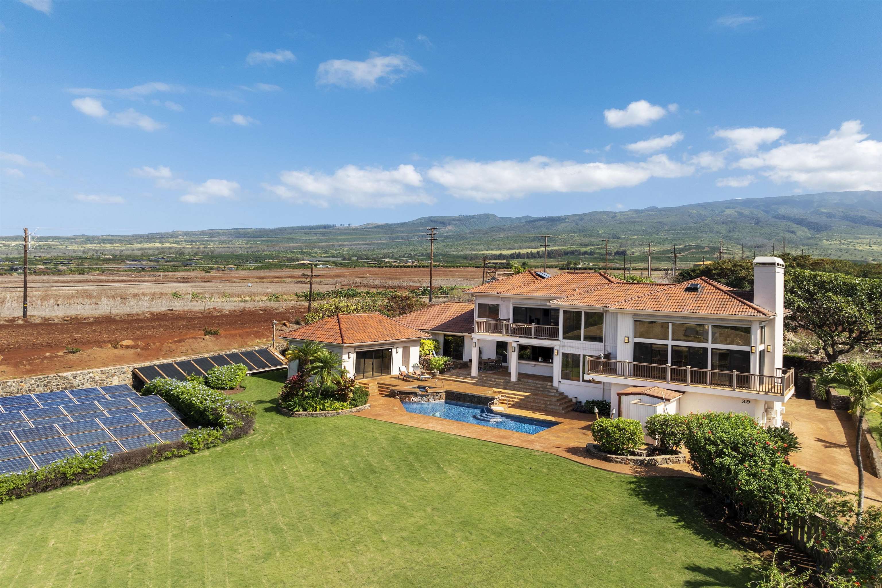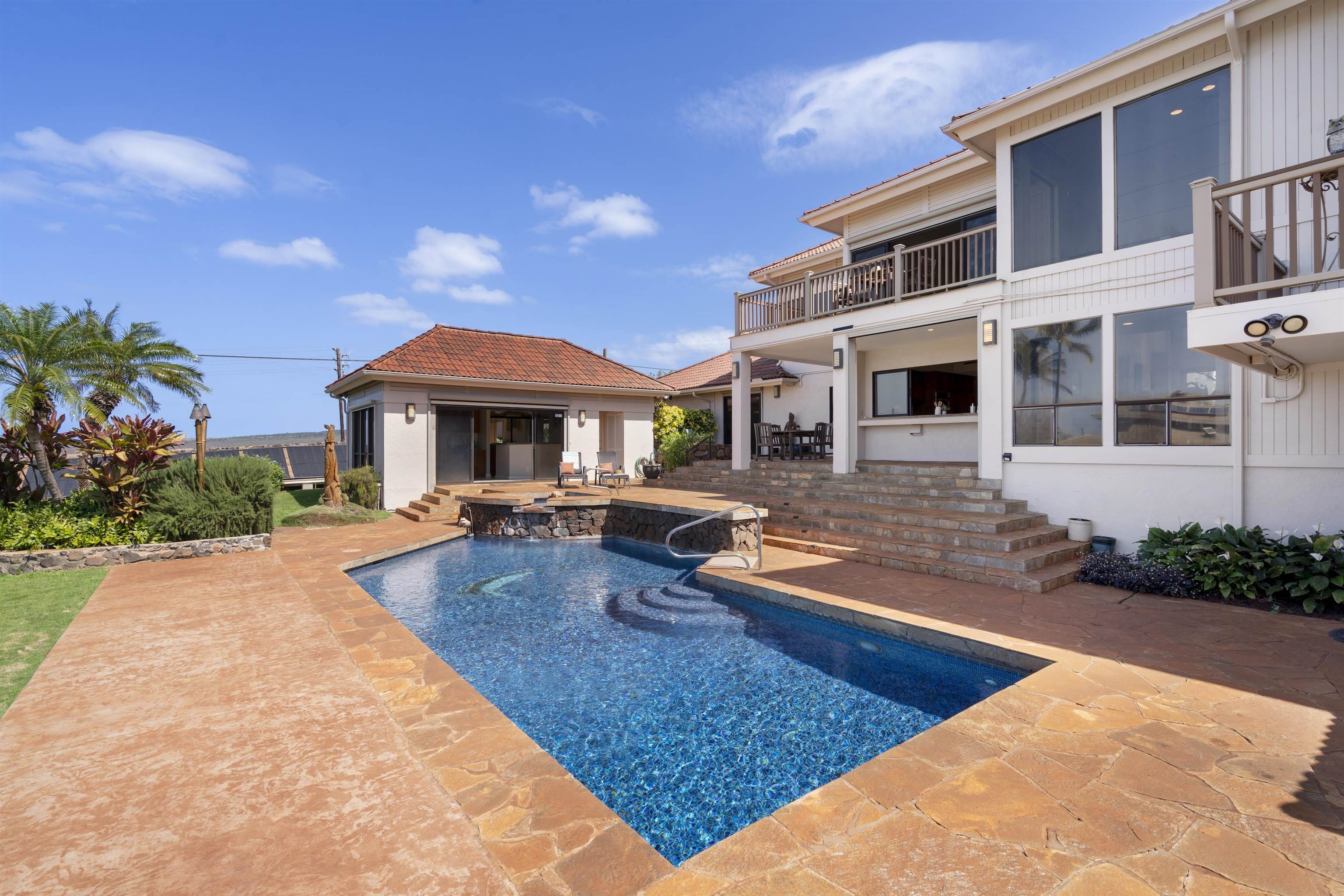 Poised at the top of a quiet cul-de-sac in the Kaanapali Hillside, 39 Hakui Loop presents a rare opportunity to own a private West Maui estate spanning two separate lots. Elevated on the premier row of the neighborhood, the property enjoys exceptional privacy, expansive ocean and outer-island views, and seasonal whale watching. The 3,785-square-foot split-level main residence is defined by dramatic 10- to 16-foot walls and thoughtfully scaled living spaces designed for both everyday comfort and refined entertaining. The home offers four bedrooms and three and one-half bathrooms, including two generously sized primary suites. The upper-level primary suite captures commanding views and features a spa-style bathroom with a steam room and a jetted soaking tub. Living areas include a formal dining room, an expansive living room, a dedicated office, and seamless indoor—outdoor kitchen and entertaining spaces. Hardwood, tile, and marble flooring are carried throughout. Complementing the main residence is a detached 432-square-foot ohana, currently configured as a pool house and entertainment room with a full bathroom and wet bar, offering flexible auxiliary space that enhances the home’s resort-style setting. Outdoor amenities are designed for relaxed island living, featuring a solar-heated swimming pool, hot tub, outdoor sauna, generous lawn, lush tropical landscaping, and multiple spaces for gathering and retreat with the added privacy of a six-foot stone privacy wall. Additional highlights include a two-car attached garage, ample storage, an owned 69-panel photovoltaic solar system, and a hard-wired propane generator for added reliability and convenience during power outages. Secluded, elevated, and elegantly composed, 39 Hakui Loop offers privacy, scale, and exceptional view exposure in one of West Maui’s most coveted residential enclaves.