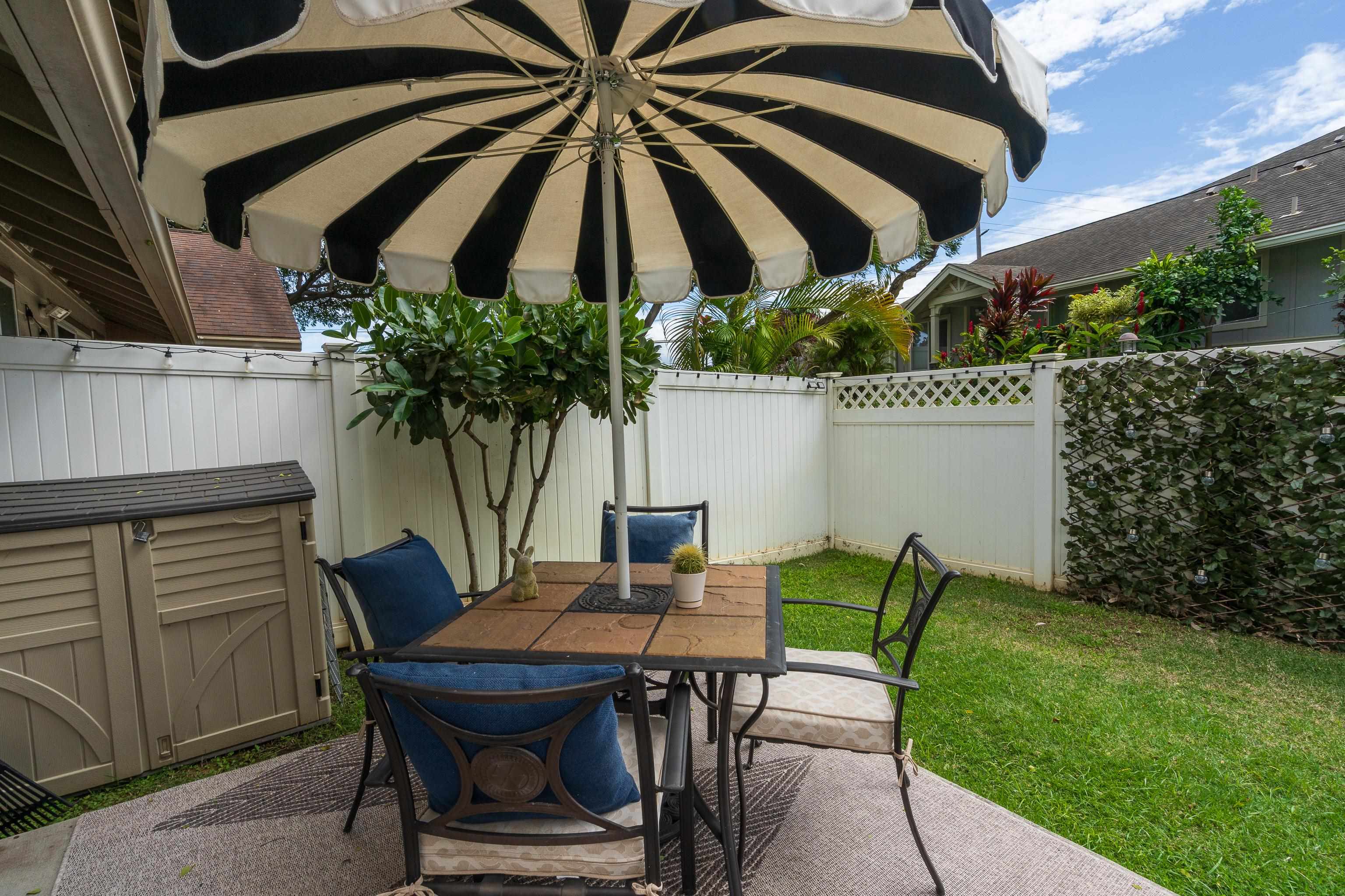 Modern Island Living at Kehalani Gardens! Unit 503 is a bright, airy sanctuary featuring modern light-colored plank flooring, and the rare comfort of Central AC. The open-concept main floor flows seamlessly from the living area to the dining space, bathed in natural light from large windows and sliding glass doors. Upstairs, you will find a thoughtful dual-primary layout where both bedrooms feature their own private ensuite bathrooms, offering maximum privacy for families or guests. Step outside to your private, irrigated backyard, complete with a stylish patio area perfect for morning coffee. This unit is designed for organized living, providing a storage shed in the yard, an additional storage closet at the entrance, along with two designated parking stalls. Located in the heart of Wailuku’s premier master-planned community, just minutes away from schools, grocery stores, parks, local dining, and shopping. This move-in-ready gem offers the effortless Maui lifestyle you’ve been searching for.