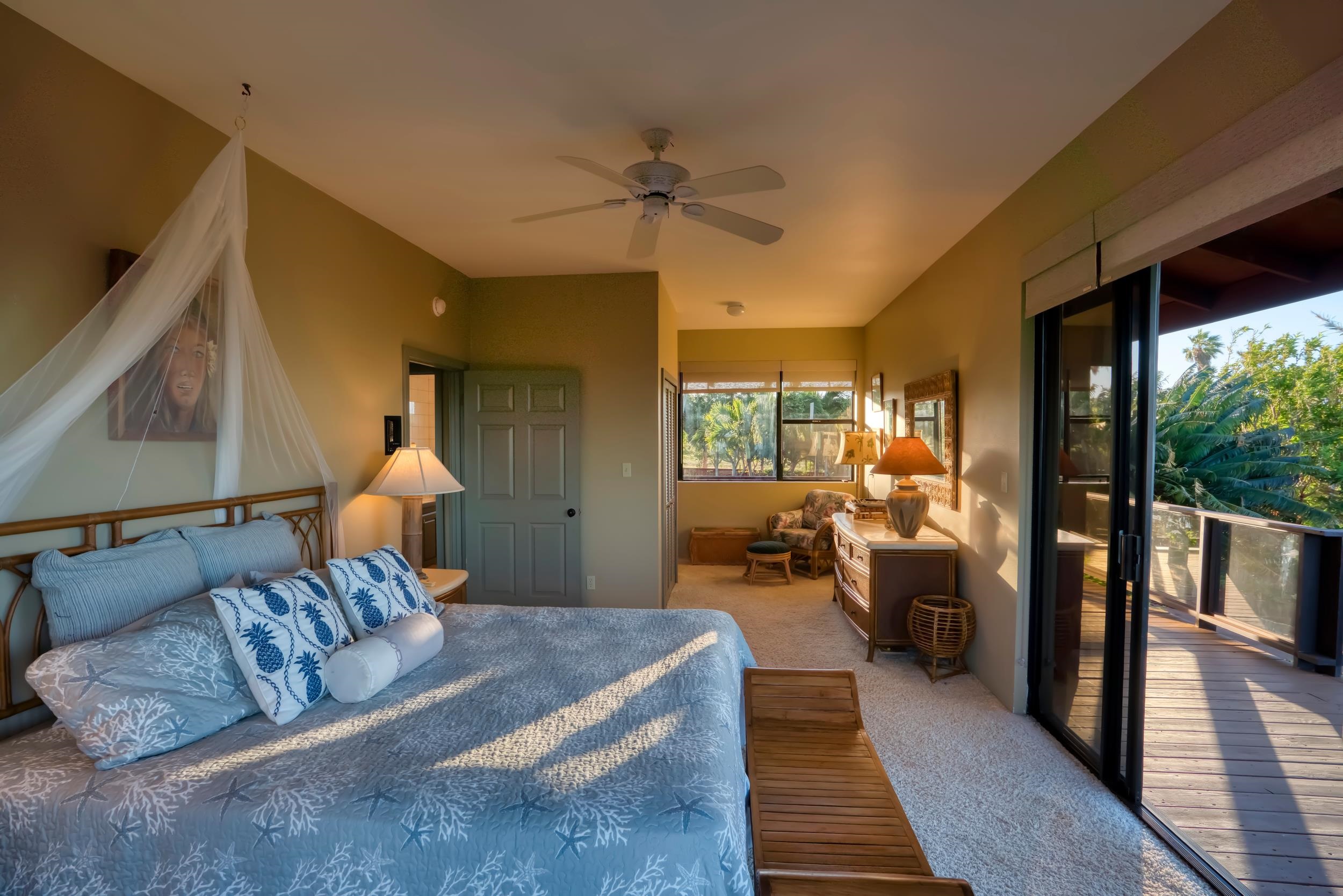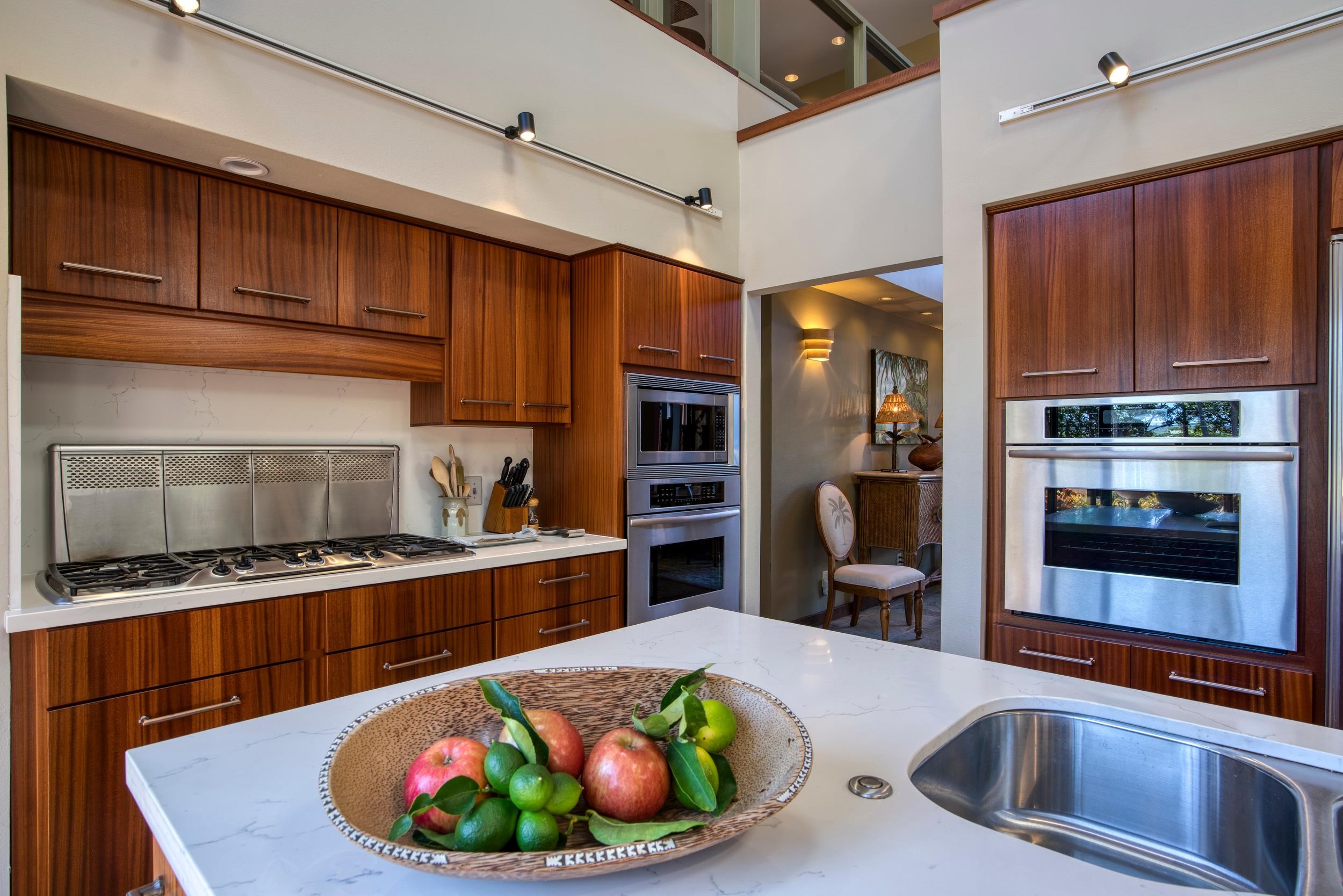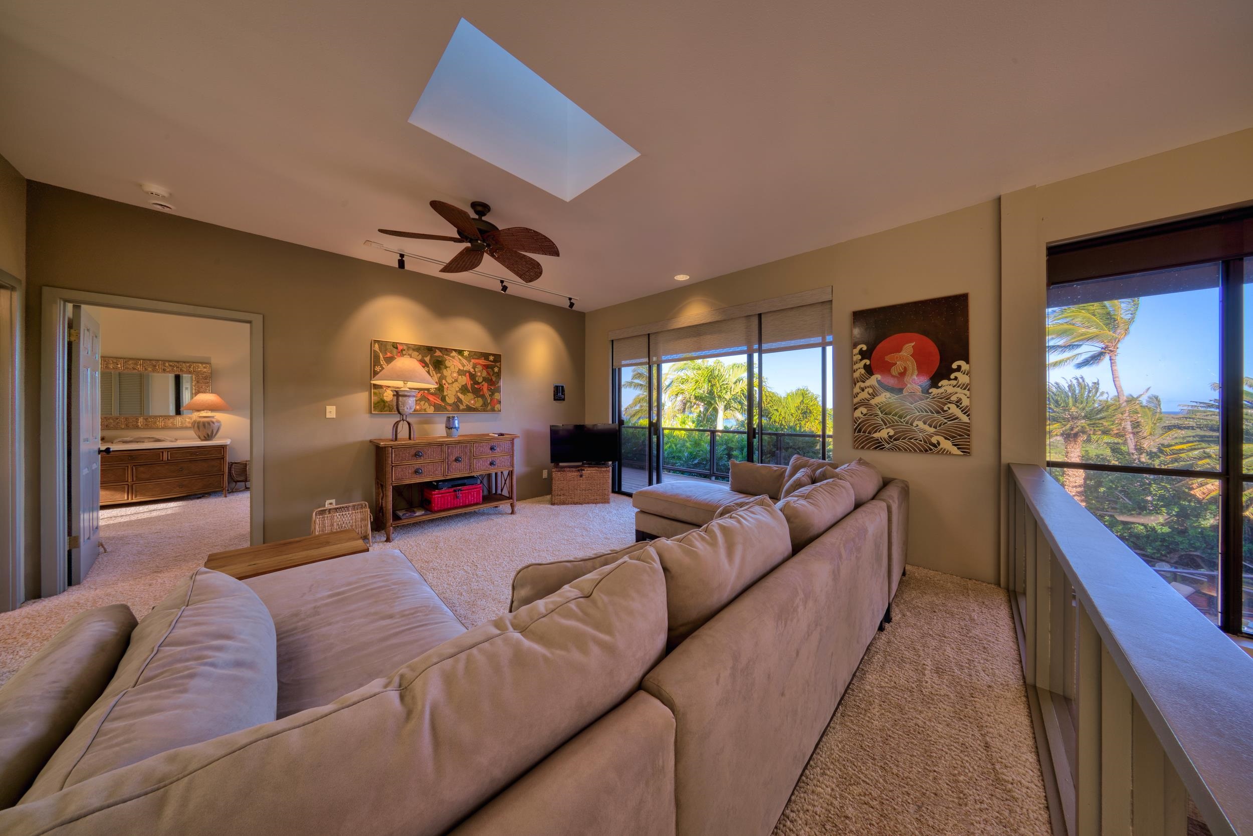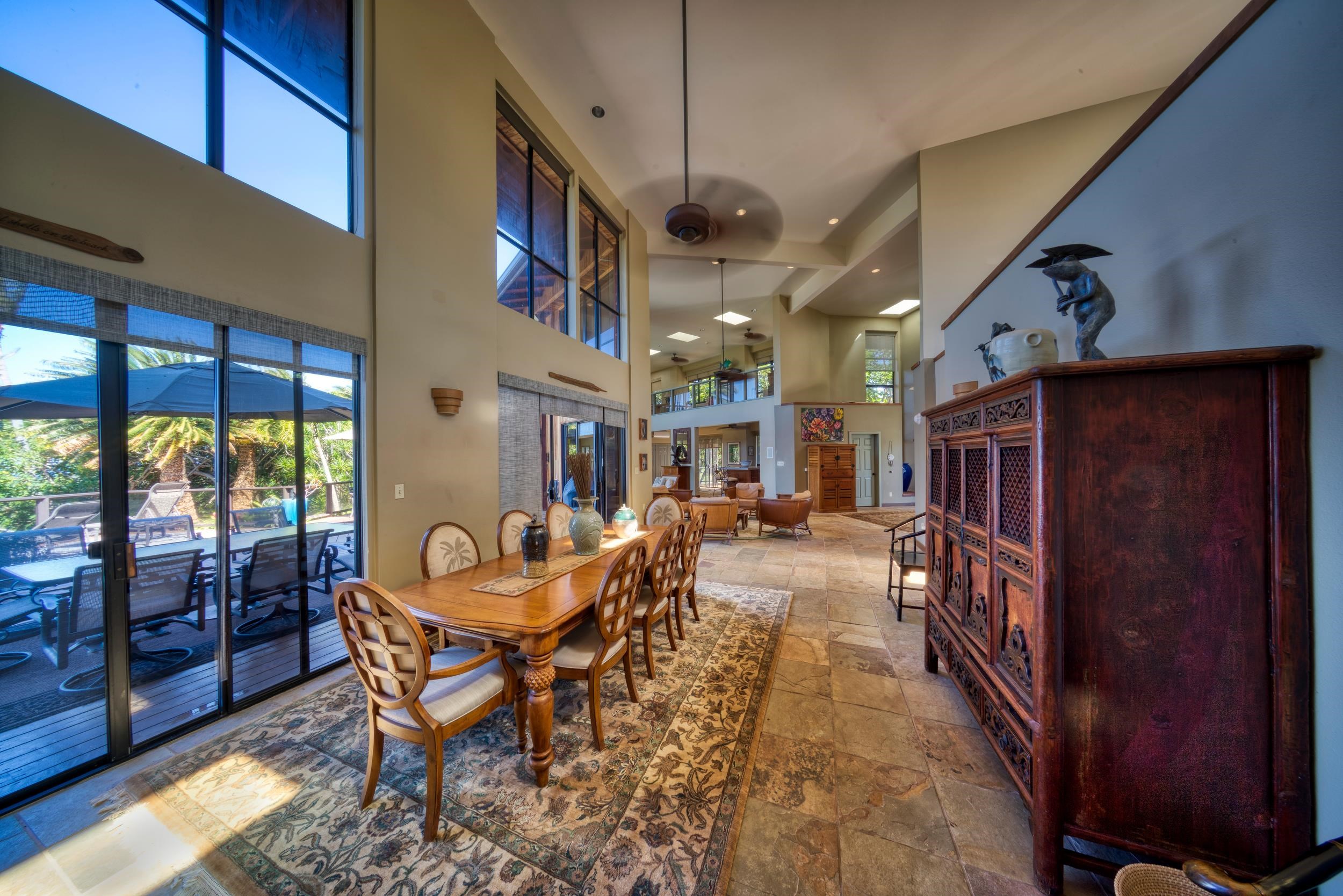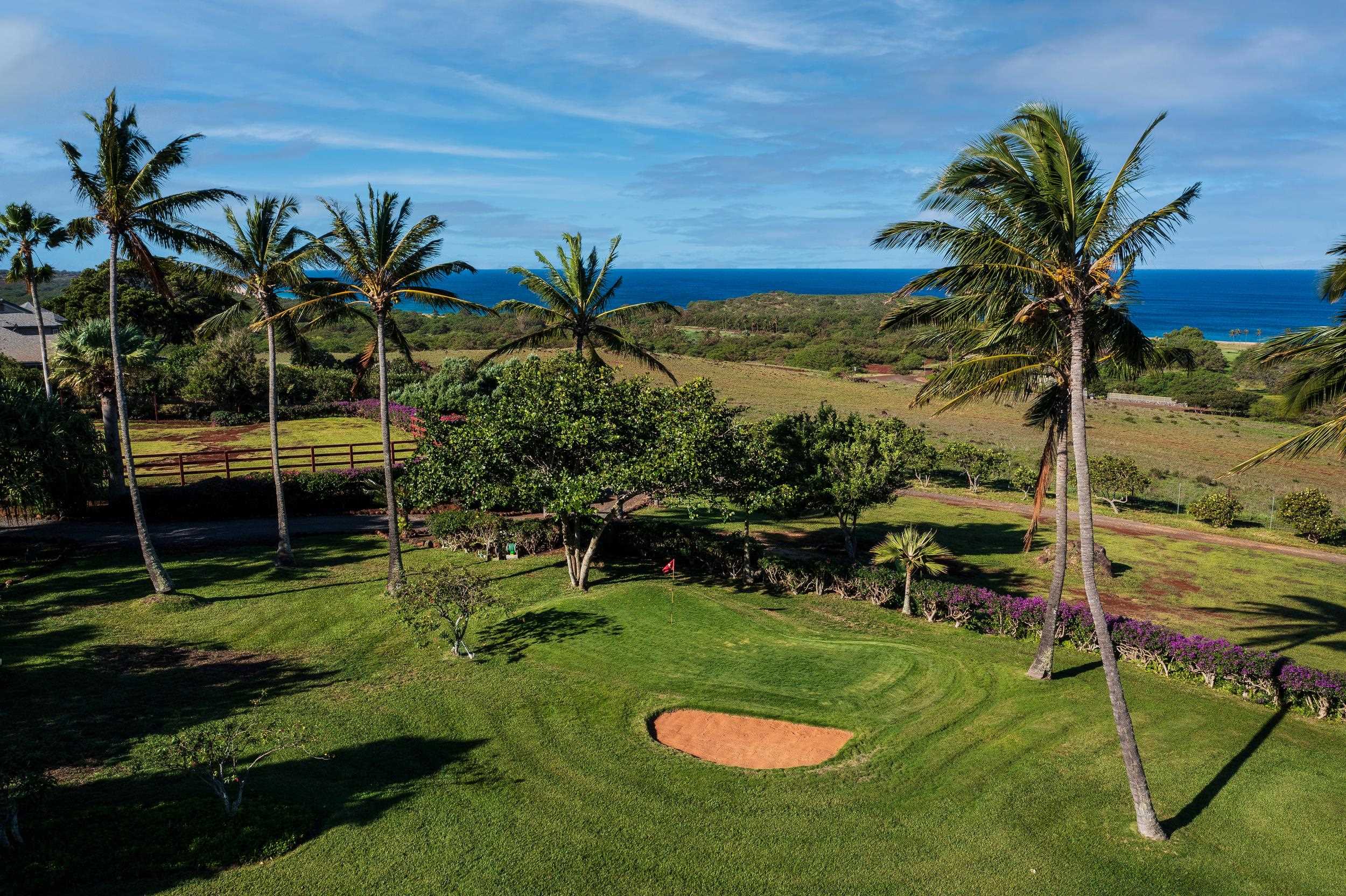 Stunning home for sale in the Papohaku Ranchlands Subdivision on Molokai's West End. This 5.73-acre fenced property features a main house, a two-car garage with a rec room, a 2-bedroom, 1-bath cottage with a private entry, an equipment shed, and a fenced riding arena. The luxurious, fully furnished main house spans 5,257 square feet and includes 4 bedrooms, 3.5 bathrooms, walk-in closets, a private office, a media room, a formal dining area, two fireplaces, a card room with an adjoining bar area, and a large laundry room. Additional decks offer panoramic ocean views, including the island of Oahu across the Kaiwi Channel. The home also boasts a pool, pool cabana/bar, jacuzzi, steam room with shower, fitness area, Koi pond with waterfall, owned PV solar panels, solar shades, electric skylights, and 5 split A/C units in the kitchen and other rooms. The kitchen has been recently remodeled with custom cabinets in the bar area and kitchen. There is also a large 2-car garage, a carport with a workshop area, and a rec room. The ohana unit is a 2-bedroom, 1-bath cottage with a laundry room and a private entry gate. The grounds include a fenced equestrian riding arena, a chipping green, 200 exotic palm trees, 20-foot Queen Sego palms in the pool area with other lush vegetation and flowers. Everything is move-in ready, just waiting for you to embrace the Hawaiian lifestyle
