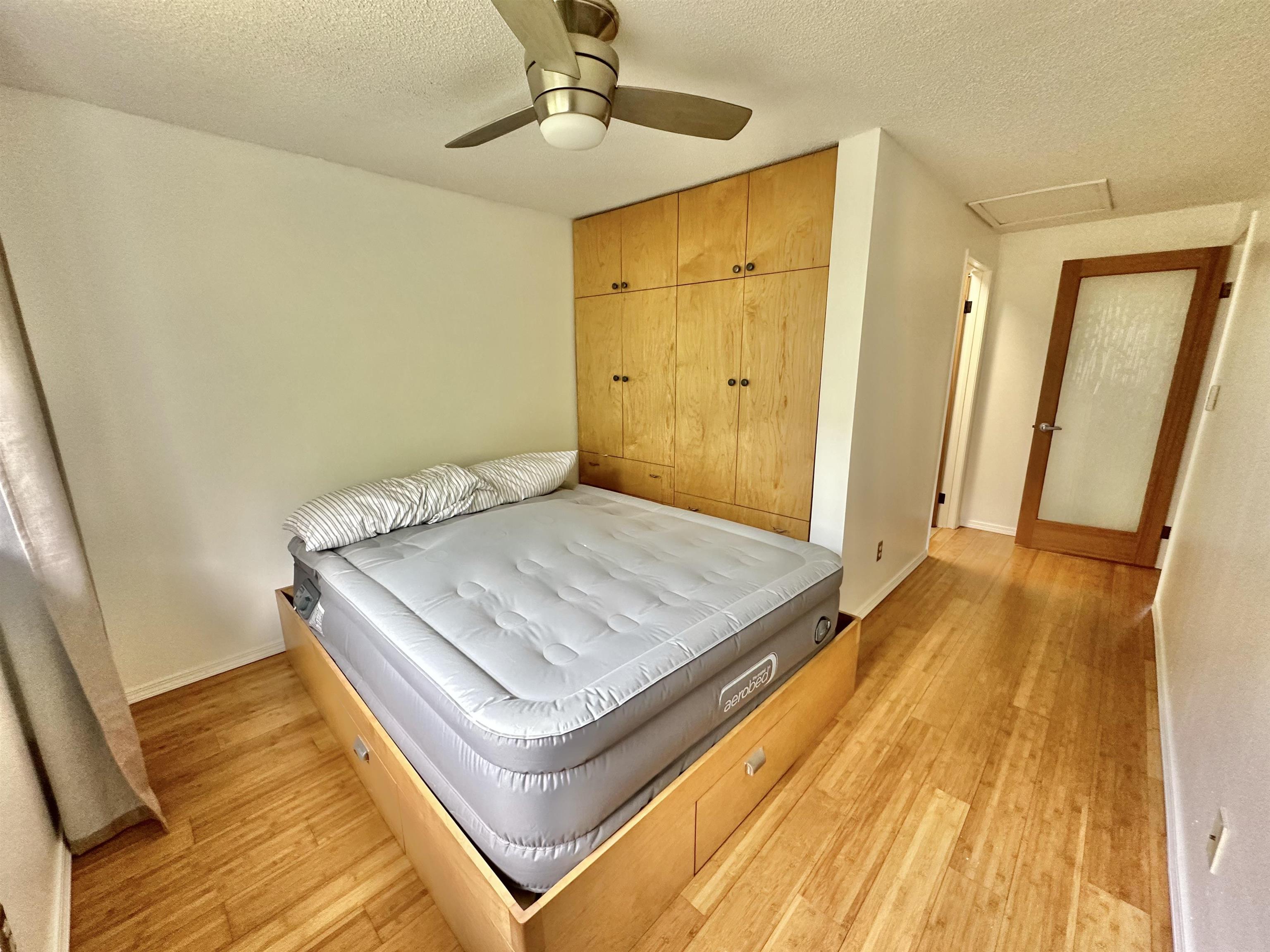 This 2-bedroom, 2-bathroom condominium at Kihei Shores is ideally situated within walking distance of Kamaole III Beach Park, offering both comfort and convenience in one of South Maui’s most desirable locations. The 719 sq. ft. interior features bamboo and tile flooring throughout, an updated kitchen with bamboo cabinetry and shelving, tile backsplash, and a skylight that enhances natural light. A small lanai provides a cozy outdoor seating area with partial ocean views. The unit includes one assigned parking stall and ample guest parking. Interior furnishings and features include a wall bed frame, extensive built-in storage in both bedrooms, additional living room storage, TV stand, second bed frame, mattress, and ironing board. Essential appliances include a refrigerator, dishwasher, microwave, range, washer, dryer, window A/C unit, and water heater. Residents enjoy access to community amenities such as a swimming pool, lounge pool, jacuzzi, secured mailboxes, and the convenience of an on-site management office. HOA fees cover water, sewer, trash, common area maintenance, landscaping, pest control, and pool service. This Kihei Shores residence presents an excellent opportunity to enjoy the Maui lifestyle with resort-style amenities in a prime beachside location.