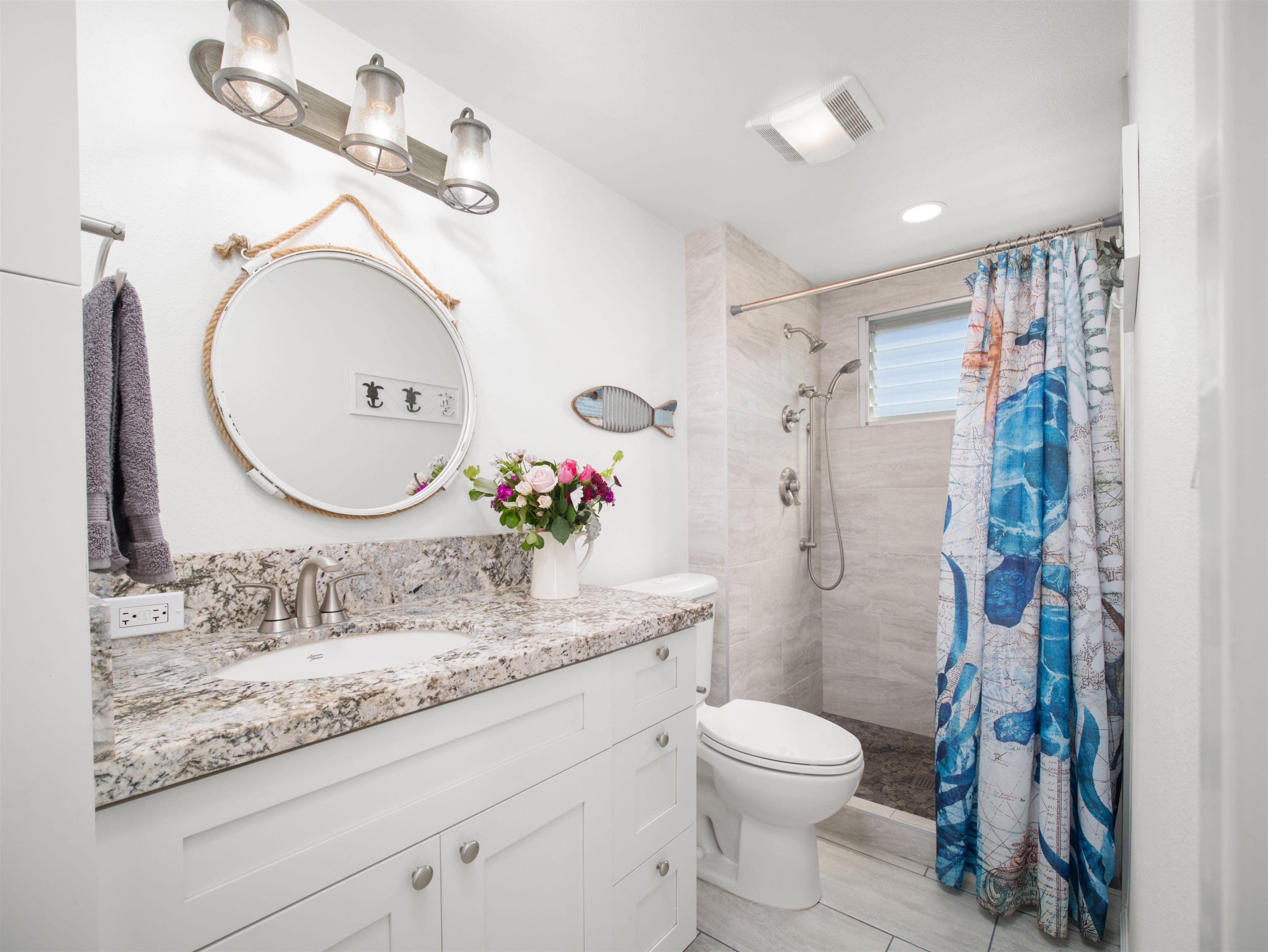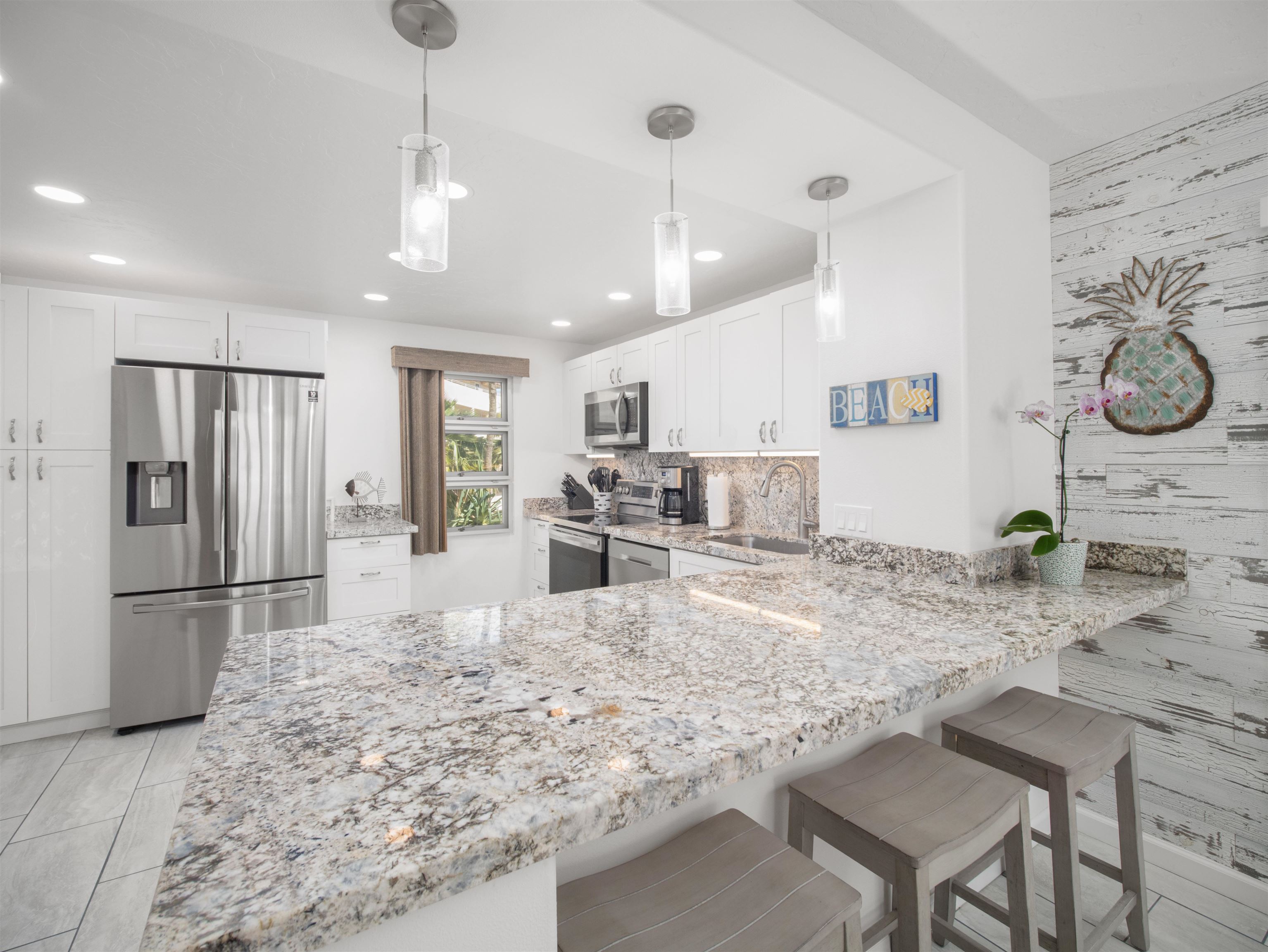 Beautiful and fully remodeled end unit that sits south of the building with the benefit of natural light flowing from custom windows in every room. This is the greater square footage floor plan of approximately 864 sq ft, only 12 units offer this spacious 2-bedroom layout. Immaculately maintained with split system A/C, granite counter tops, custom cabinets, tile flooring, custom window coverings, new appliances and a chic beach vibe with contemporary birch paneling and accent lighting. Royal Mauian is hotel zoned and regarded as the gem of Kihei, a south Maui landmark, a legacy visitor property. Located oceanside, sandwiched next to famed Kamaole Beach I and Kamaole Beach ll, it sits across the street from its waterfront position from shops, restaurants, health food store and coffee shops. The pool for Royal Mauian lies by the waterfront and the resort boasts a rooftop deck and BBQ area that offers 360 degree views for unmatched year round sunsets and Haleakala views. Don't let this gem slip you by, the unit is turnkey and being sold furnished.
