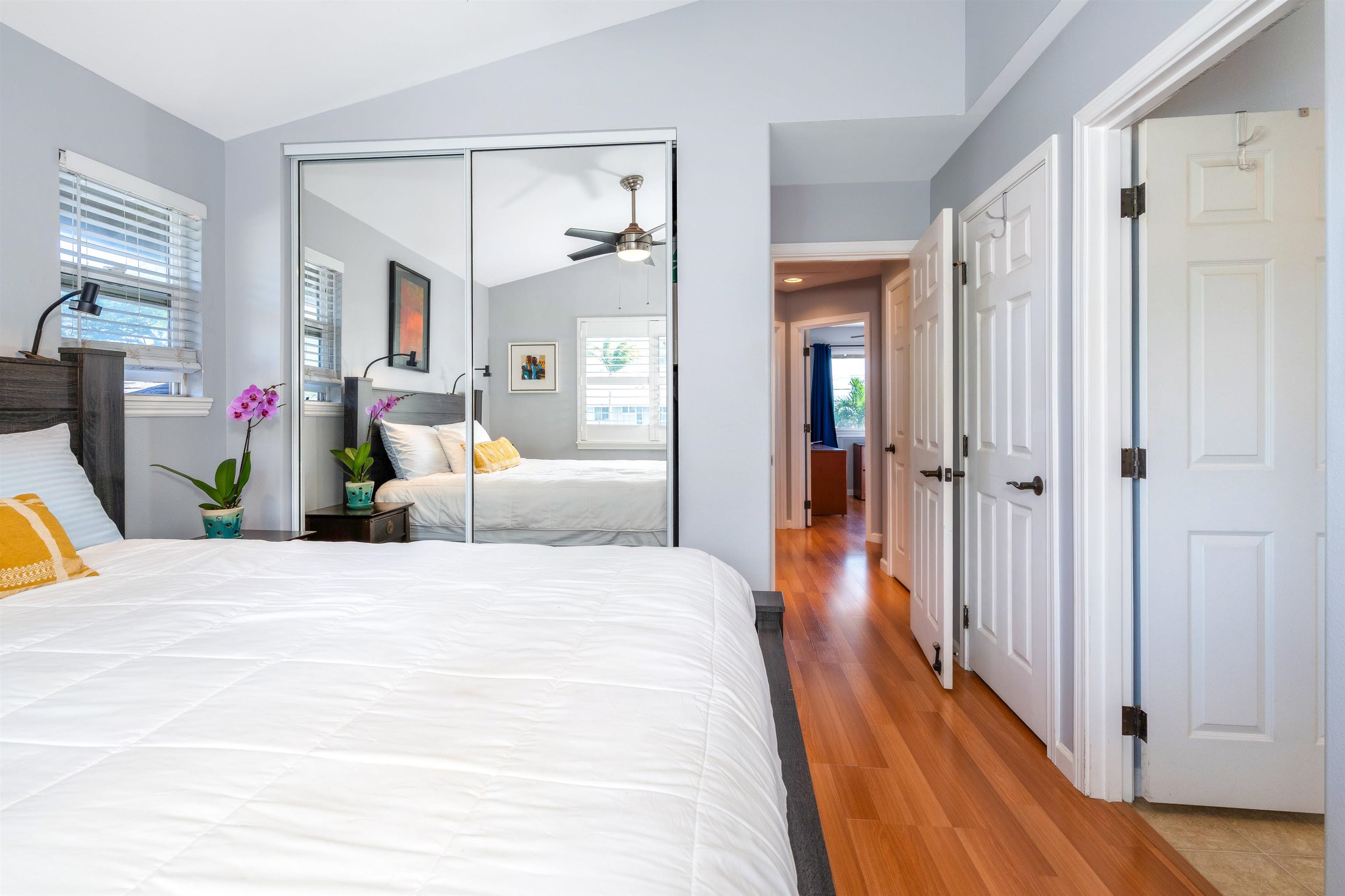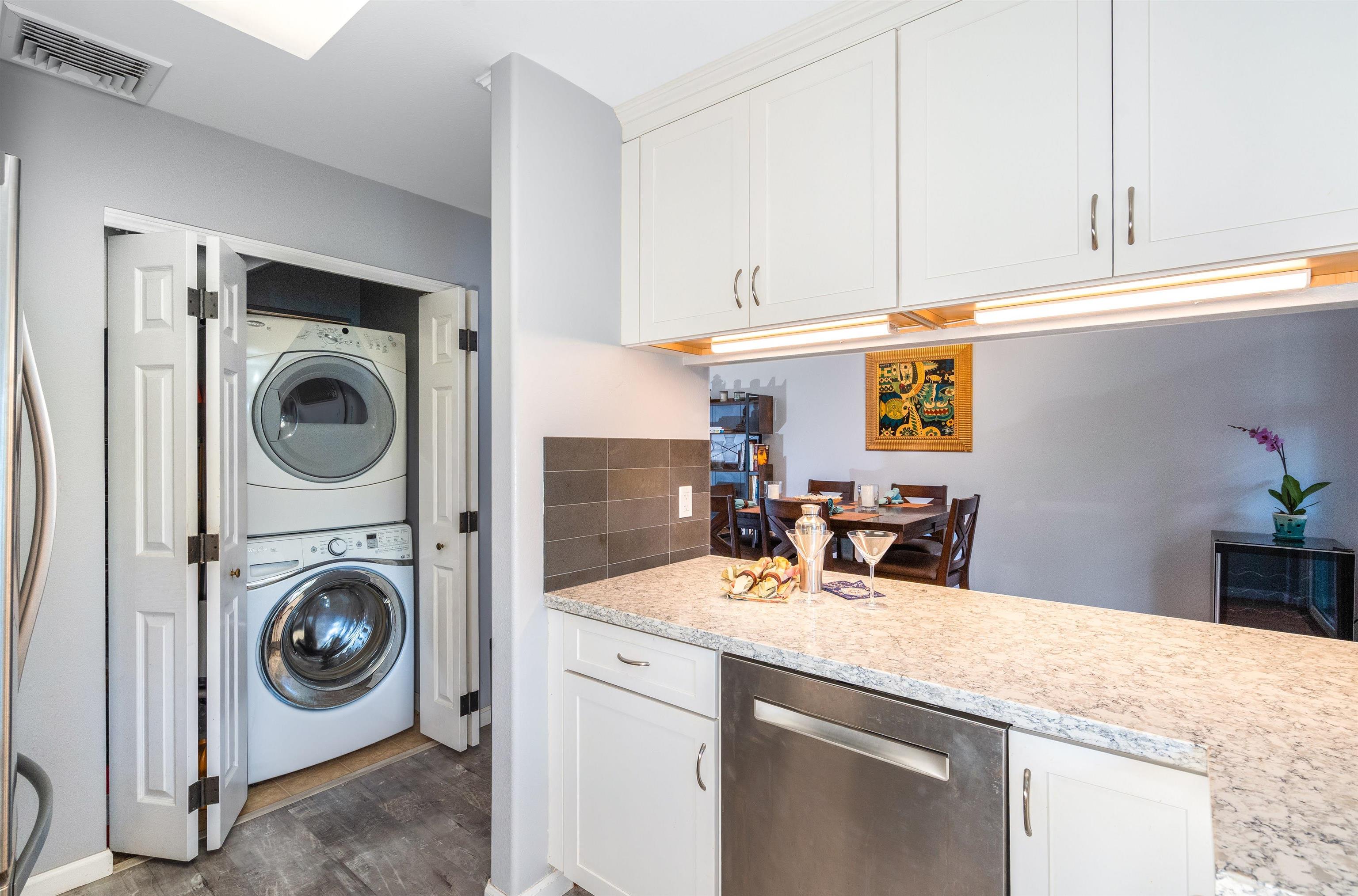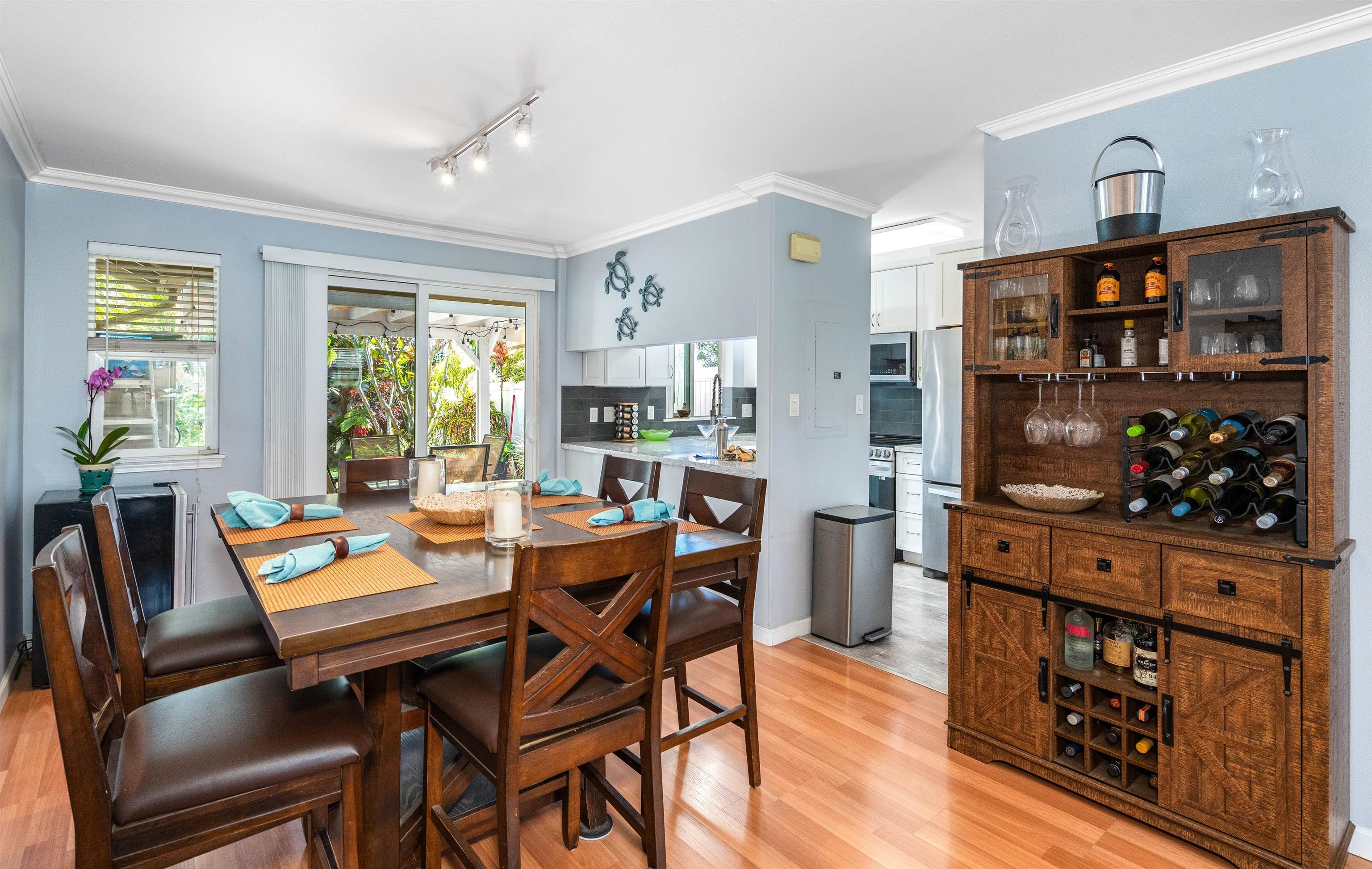 Welcome to your private island retreat in the heart of Wailuku, the historic county seat of Maui and home to our vibrant arts district. Restaurants, shopping, hiking, beach combing, easy access to everything Maui has to offer. This beautifully updated 3 bedroom, 2.5 bath townhome offers the perfect blend of indoor comfort and outdoor island style living. Interior spaces flow near seamlessly outdoors into a tropical garden retreat. Lush landscaping surrounds a stunning 20 x 20 natural slate tile hardscape and fully sheltered outdoor living and dining space. A 6 foot privacy fence surrounds this approximately 1,200 sqft fully irrigated sanctuary making this, arguably, the largest private yard in this complex. The unique additional 400 square feet of Pergola-covered living space invites you to host dinner parties, celebrate friends with a backyard BBQ, read books or play ball with a pet. This al fresco enclave has no comparison: Plumerias, bananas, ginger, crotons and mature royal palms envelope your Hawaiian style sanctuary. November 2022 professional kitchen renovation ($44,000) included a classic white farmhouse sink with apron-front design, stainless appliances, beautifully appointed chef’s kitchen showcasing white quartz countertops and fresh, modern cabinetry. Additional notable features include: sophisticated plantation shutters, custom crown molding, custom garden lighting transforming the outdoor space after dark, central air conditioning, exterior storage, covered parking, West Maui Mountain views and so much more. Two deeded parking stalls (108 and 105). Newer windows and doors (2016). Open layout. Abundant natural light. Fire up the grill and rest underneath the stars. Your Maui home is waiting.