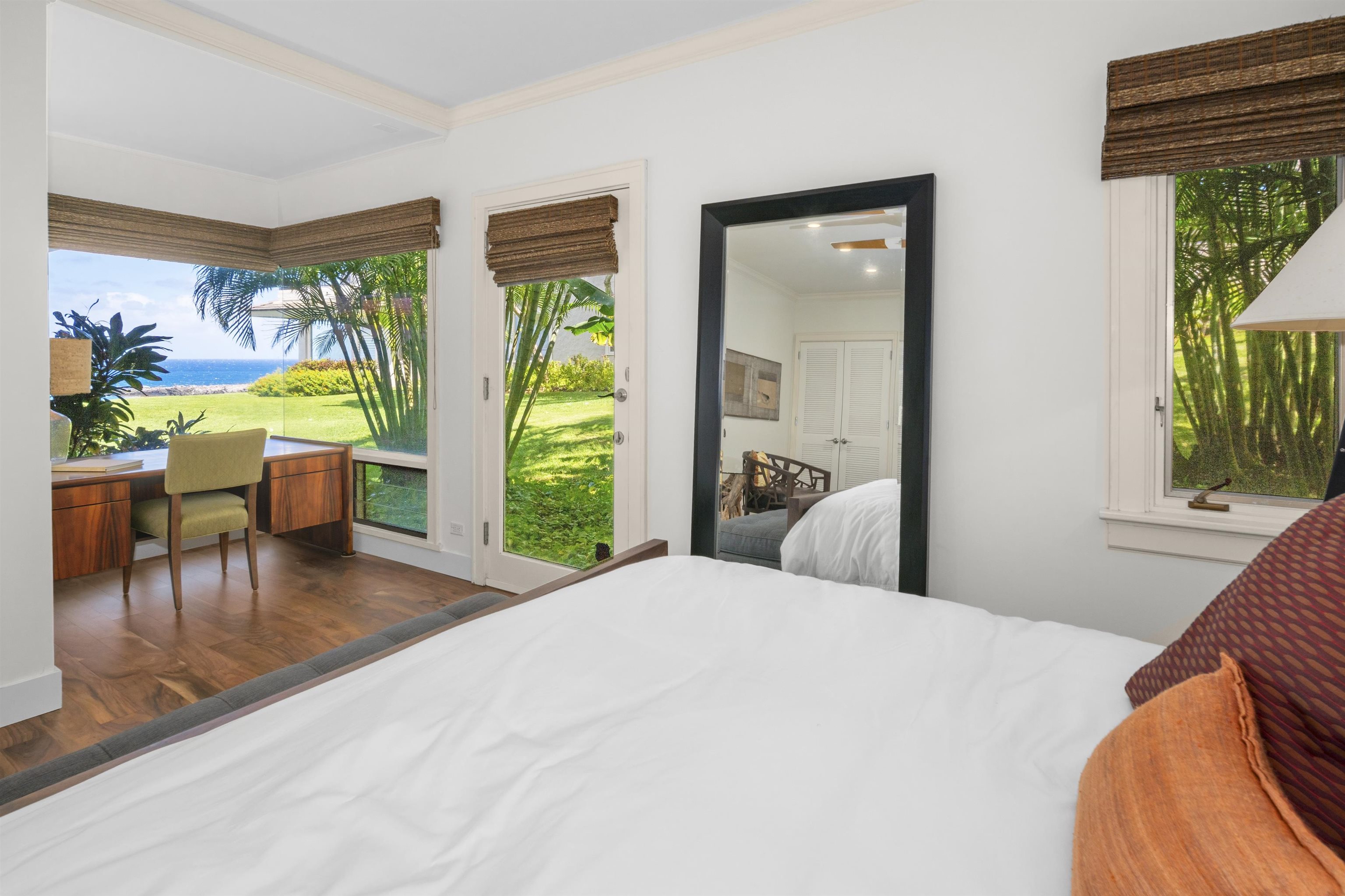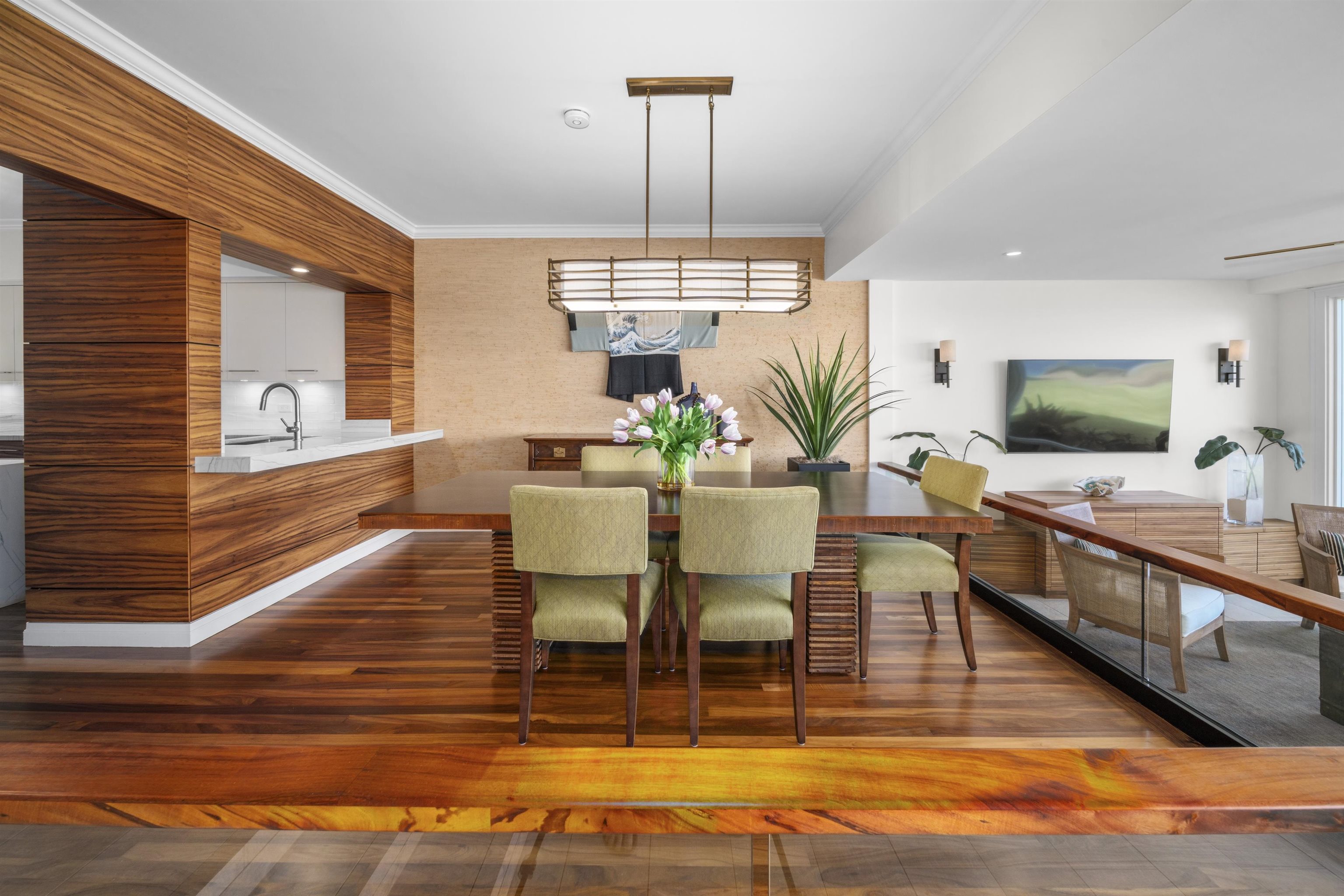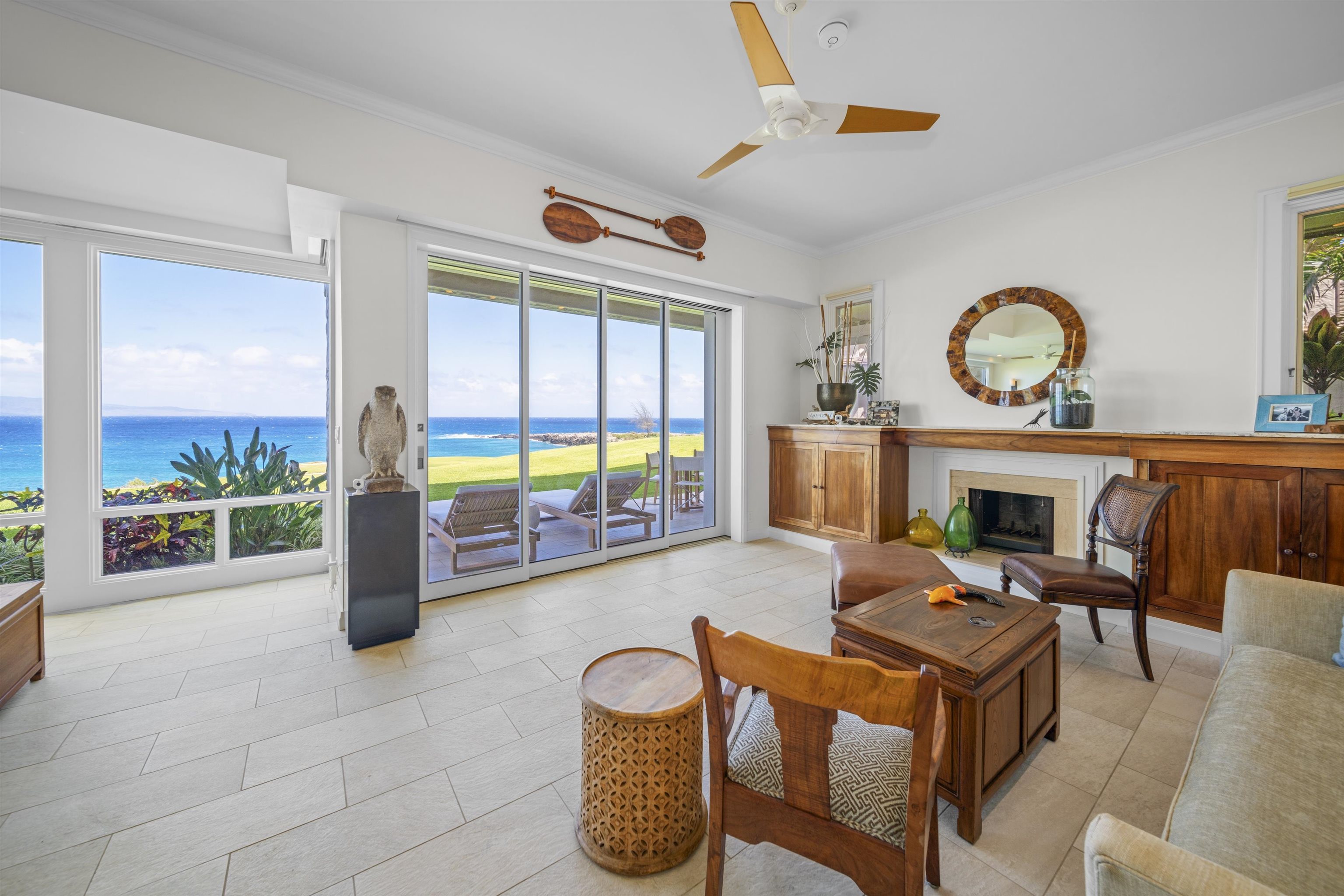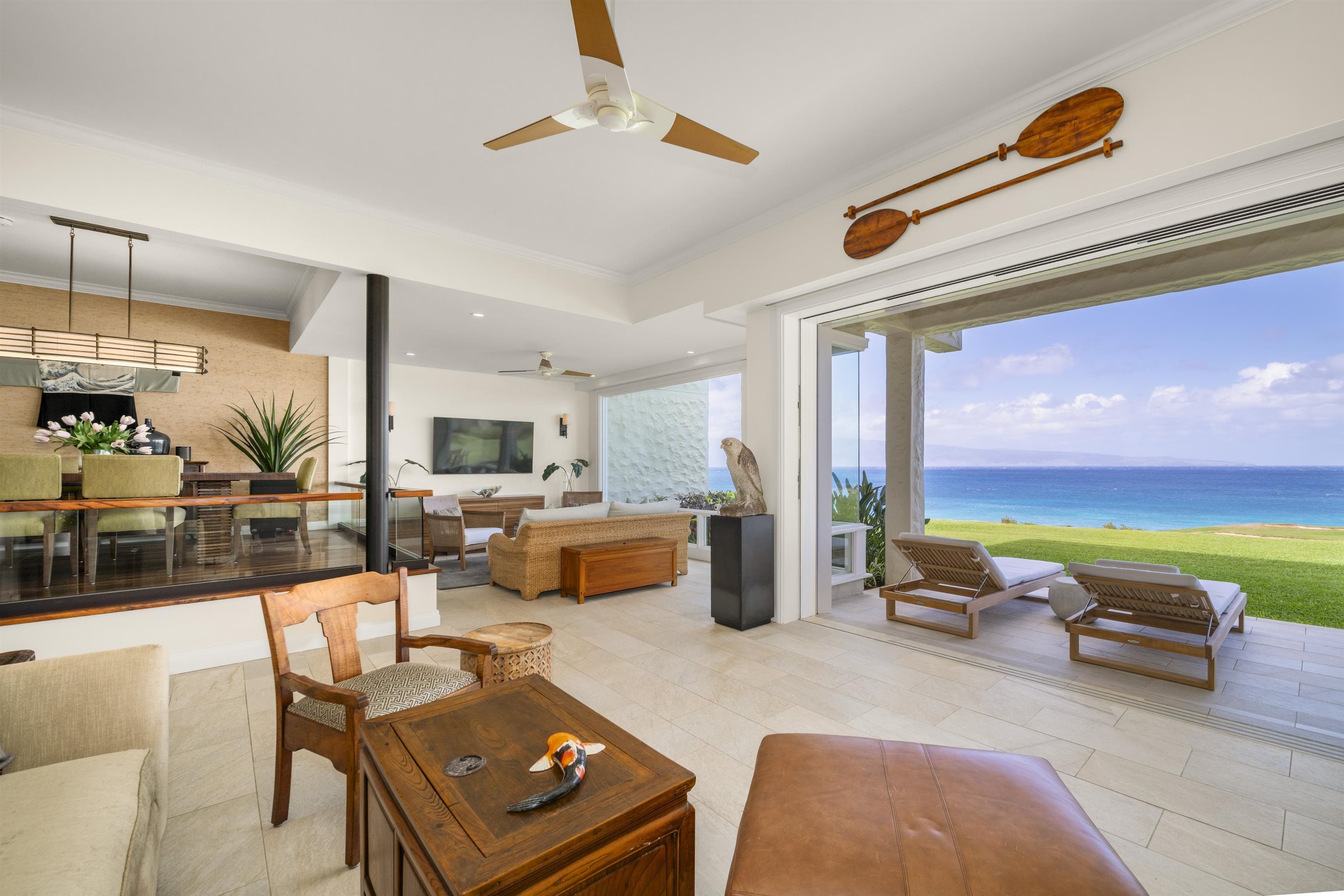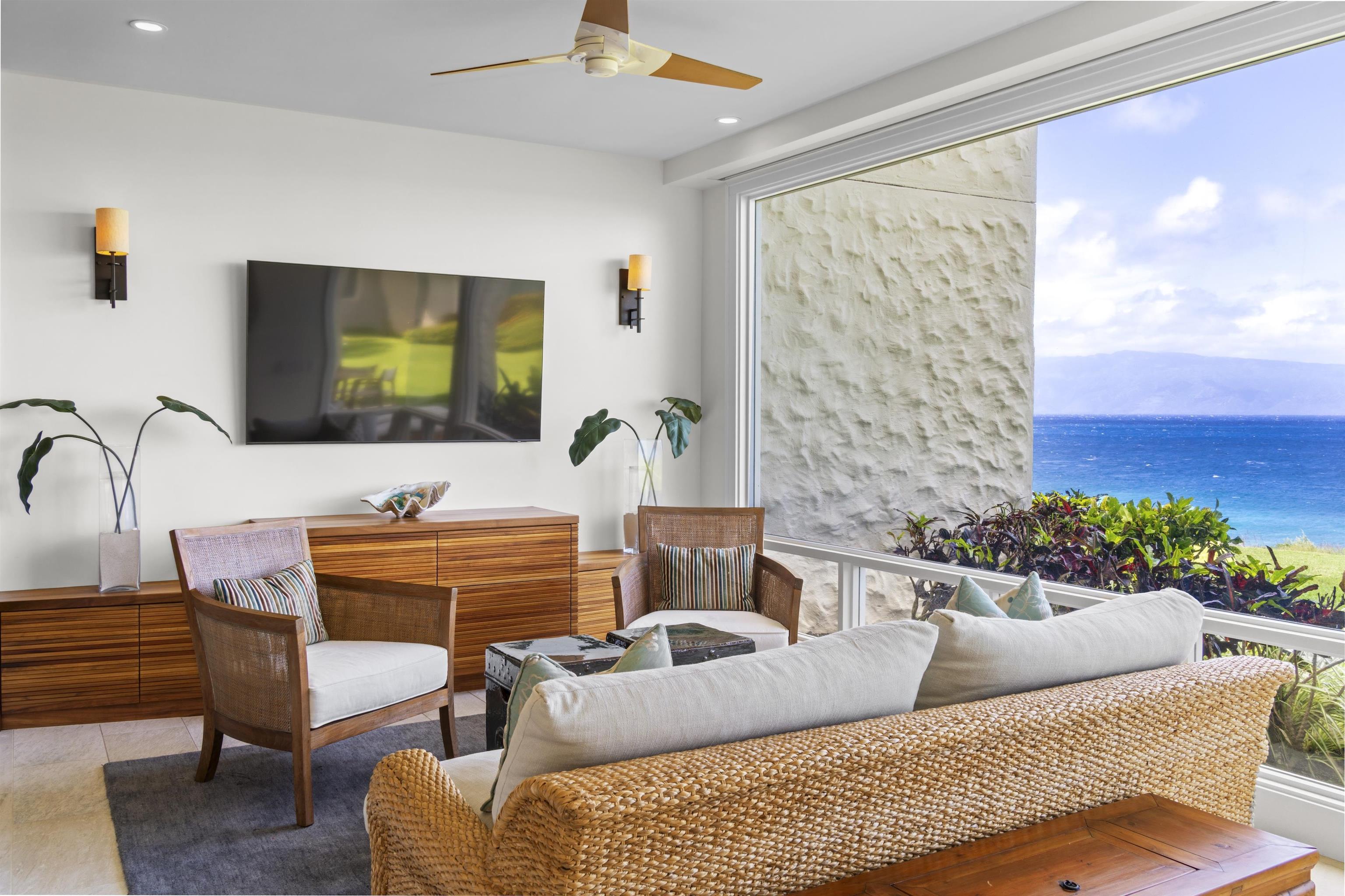 Welcome to the Ironwoods, an oceanfront enclave in the heart of the Kapalua Resort. This beautifully renovated 3-bedroom, 3-bath condominium is positioned directly on the bluff with commanding views of the Pacific and the Bay Course. This exceptional residence offers refined craftsmanship, modern systems, and the timeless warmth of koa throughout. From the moment you enter, the artistry of solid koa wood is unmistakable. The entry, kitchen, and dining flooring, custom built-in media cabinetry, and glass stair railing are crafted from solid koa. The result is a rich, cohesive design that honors Hawaii’s natural beauty while delivering elevated contemporary living. The custom chef’s kitchen is appointed with natural quartzite countertops, and premium finishes throughout. Pocketing Fleetwood glass sliding doors create seamless indoor-outdoor living, while a re-engineered picture window with a narrowed center mullion maximizes the panoramic ocean view. Comfort meets innovation with new dual-zone air conditioning, automated Leviton lighting controls, motorized shades, and thoughtful upgrades throughout. An additional dryer in the private garage adds convenience for extended stays. The Ironwoods is a gated community with resort-style amenities including a heated oceanfront pool, clubhouse with party room and an adjoining fitness room, as well as pickleball and tennis with ball machines. The Ironwoods is a peaceful and private escape, yet is close to the amenities of the Ritz-Carlton Kapalua and the Kapalua Resort.