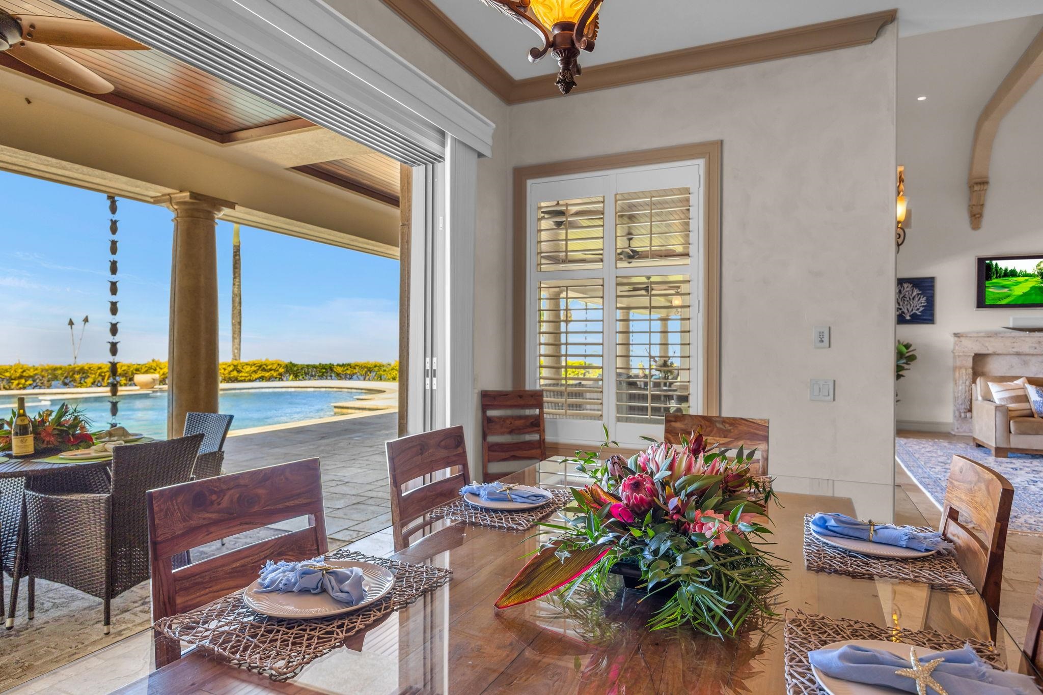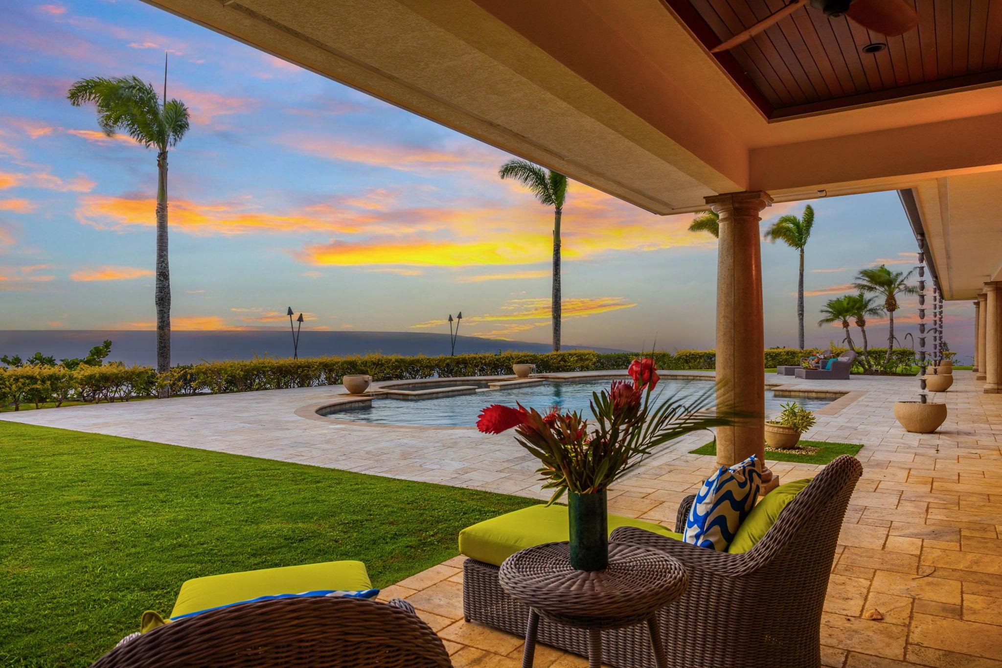 Perched high above the coastline within the private gated enclave of Honolua Ridge, this extraordinary single-level estate captures a vantage point so rare it feels as though the Pacific, Moloka‘i, and the Pailolo Channel were reserved exclusively for you. Set on more than six pristine acres in Kapalua Resort, the panoramic views are expansive, intimate, and ever-changing – a daily masterpiece of blue water, outer island silhouettes, and golden sunsets. This is one of those homes where you pause… and just take it all in. Designed and constructed as the personal residence of one of West Maui’s most respected builders, the home is a statement of intentional design and uncompromising craftsmanship. Every finish, every material, every line was curated with longevity, beauty, and a deep respect for the setting. The grand great room opens seamlessly to an expansive lanai where a resort-style pool and spa are framed by flickering tiki torches, creating an atmosphere that transitions effortlessly from sun-drenched afternoons to refined evenings under the stars. It’s easy to imagine quiet mornings with coffee overlooking Moloka‘i, or gathering with friends as the sky melts into color over the blue expanse. Throughout the residence, extraordinary details abound. Modern infrastructure matches the timeless aesthetic, including , dual laundry rooms, a double septic grid system, a dedicated media room with full surround sound, custom primary closet and a three-car garage with oversized bays. Eagle concrete roof tiles and genuine stucco construction further reflect the enduring quality of this estate. The lower portion of the acreage offers a prime homesite for a future ohana residence – ideal for extended family or guests seeking privacy within the estate’s expansive grounds. A rare spring-fed pond adds yet another layer of serenity to this already remarkable property. Opportunities like this are few and far between on Maui – especially in Kapalua’s most private ridge setting. This is more than a home. It’s a legacy estate where craftsmanship, space, and sweeping ocean views converge in unforgettable fashion.