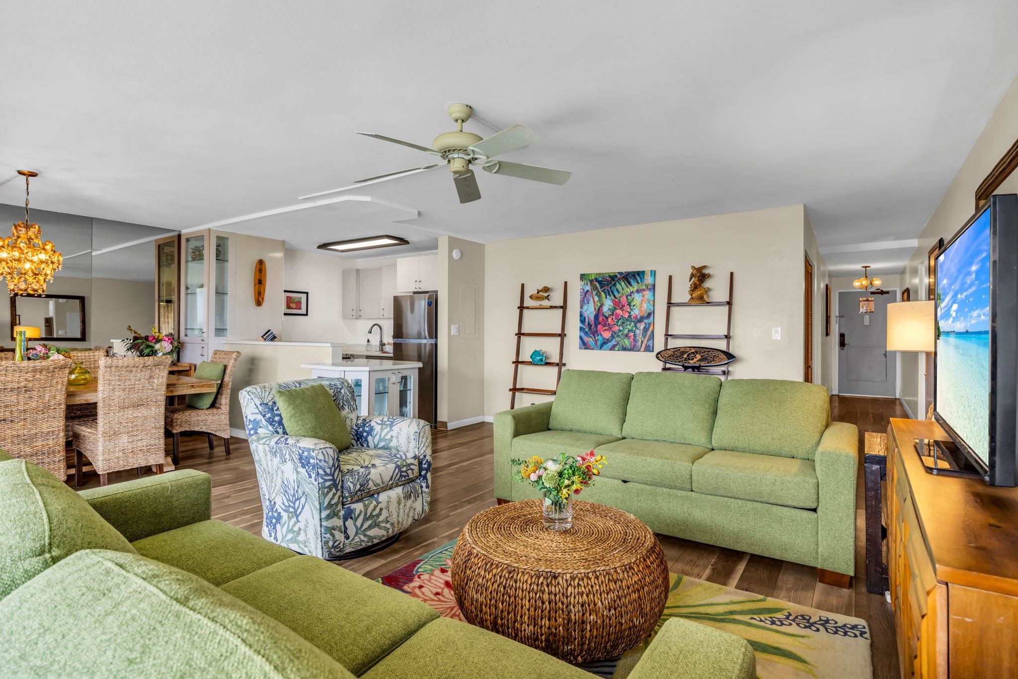 Maui Sunset B423 is a rare offering in one of South Maui’s favorite oceanfront communities. One of only 10 three bedroom floor plans in the complex, this spacious residence provides flexibility and comfort for vacation rental use, second home or everyday living perfect for hosting family and friends. The B Building’s ideal orientation keeps the expansive lanai nicely shaded, so you can fully enjoy the spectacular ocean views throughout the day. Inside, the beautiful, generously sized interior offers plenty of room to relax and gather, while the den adds valuable versatility for work or additional sleeping space. With its rare layout, large shaded lanai, and inviting interior, Maui Sunset B423 is a standout opportunity in South Maui. This one wont last!