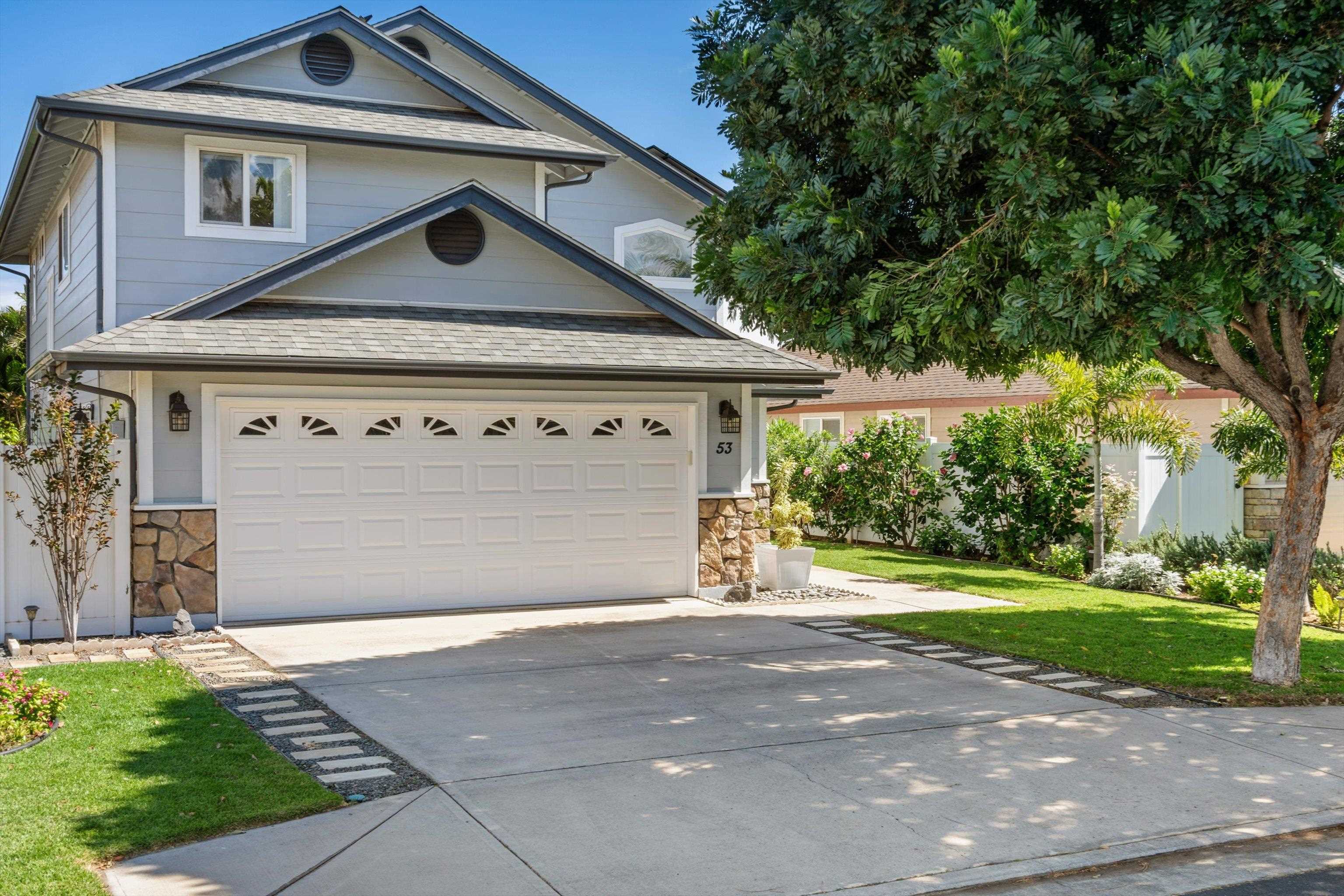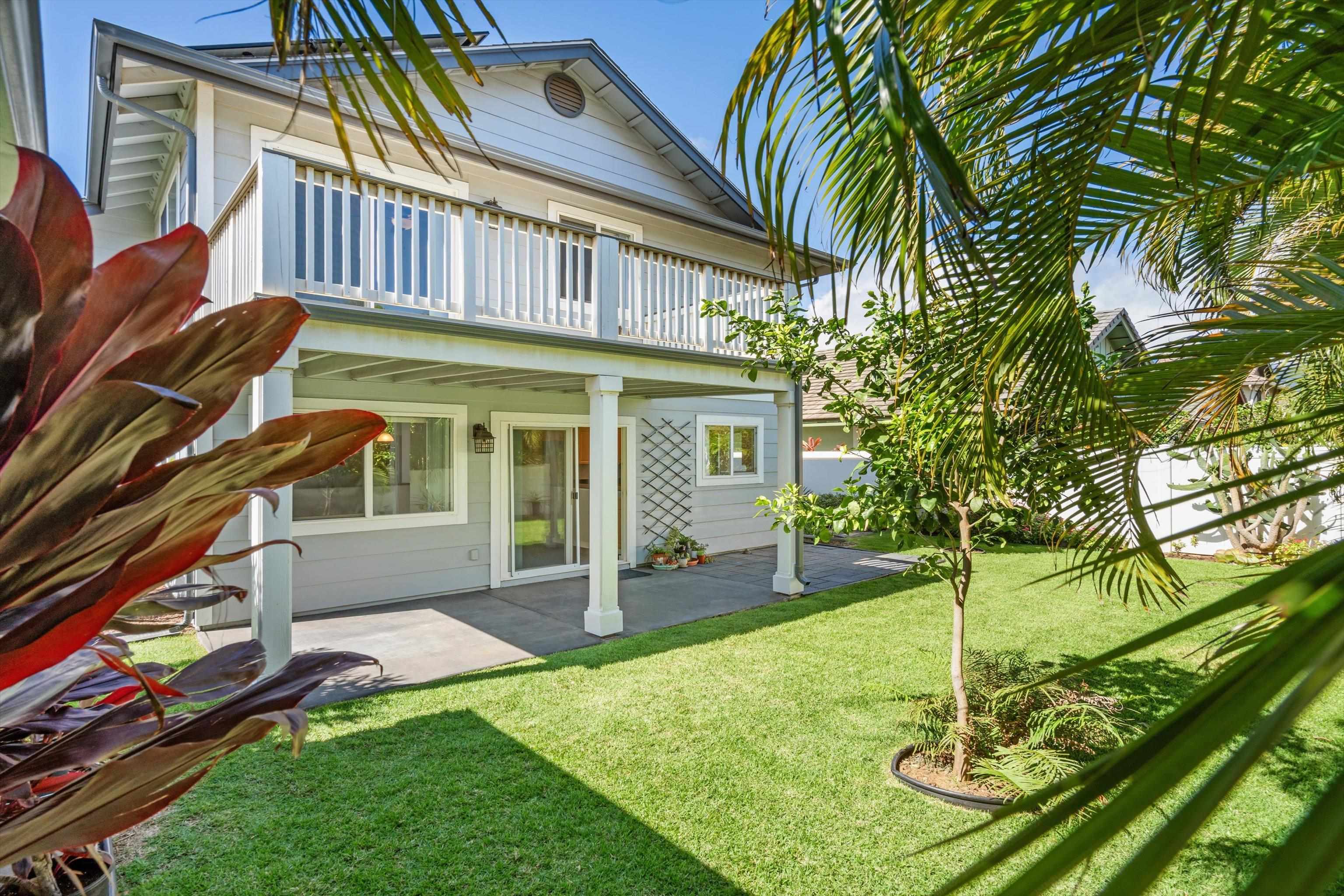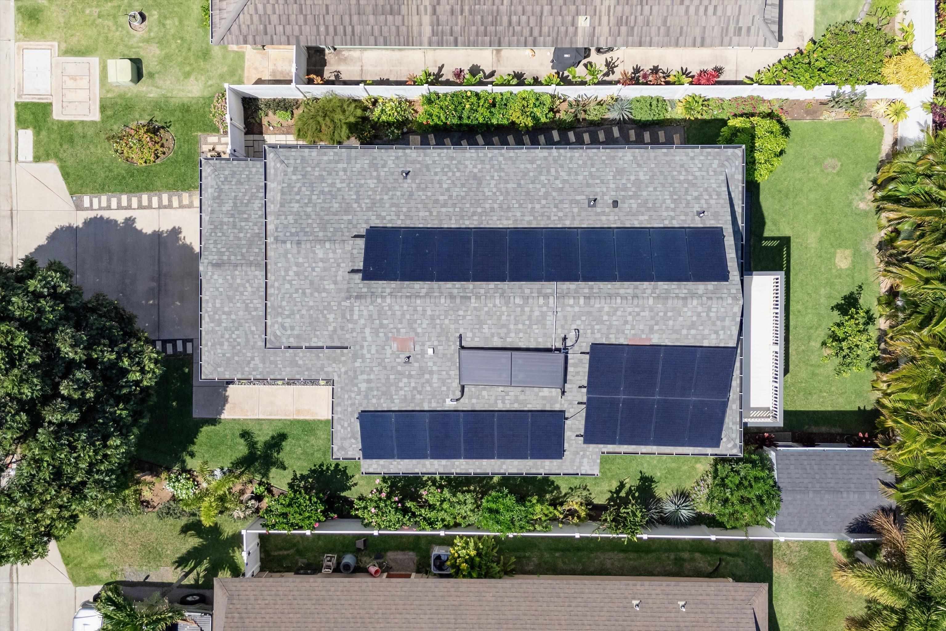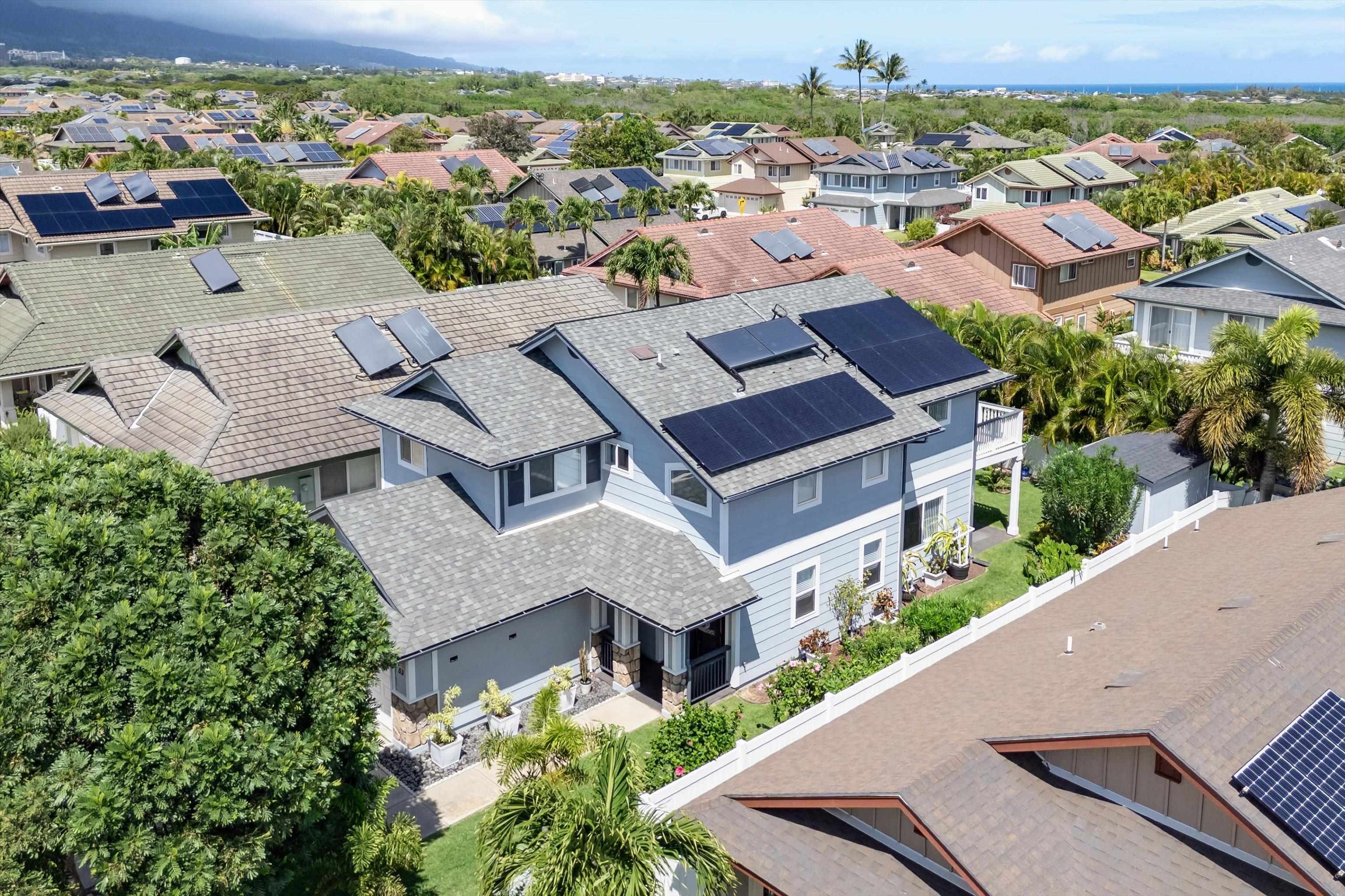 Discover comfort, efficiency, and convenience at 53 Molehulehu Loop in The Legends at Maui Lani. This thoughtfully designed 4-bedroom, 3-bath home welcomes you with vaulted ceilings and a bright, open living space that flows effortlessly into the dining area and kitchen–perfect for everyday living and entertaining. A bedroom and full bath on the main floor provide flexibility for guests, extended family, or a home office. Upstairs, the spacious primary suite offers a private retreat, complemented by two additional bedrooms and a full bath. Energy efficiency is a standout feature with 24 owned photovoltaic panels, two Tesla backup batteries, central AC, and a brand-new 80-gallon solar hot water system installed in 2024. Recently painted inside and out with all new window screens, this home is move-in ready. Enjoy a fenced yard (three sides enclosed), an 8' x 12' storage shed, and a two-car garage. Ideally situated near the Central Maui Regional Sports Complex, schools, Maui Memorial Medical Center, and Maui Lani Golf Course–this home combines comfort, sustainability, and an exceptional Central Maui location.