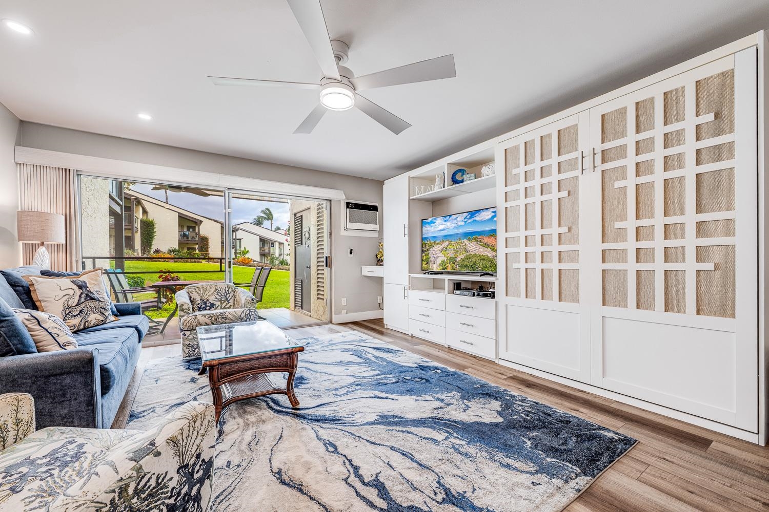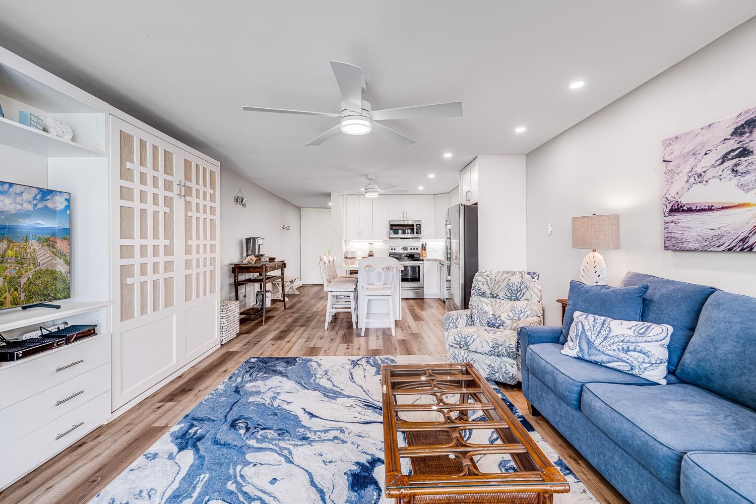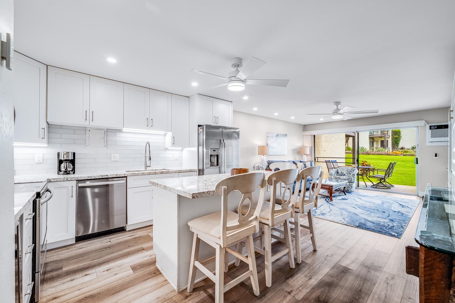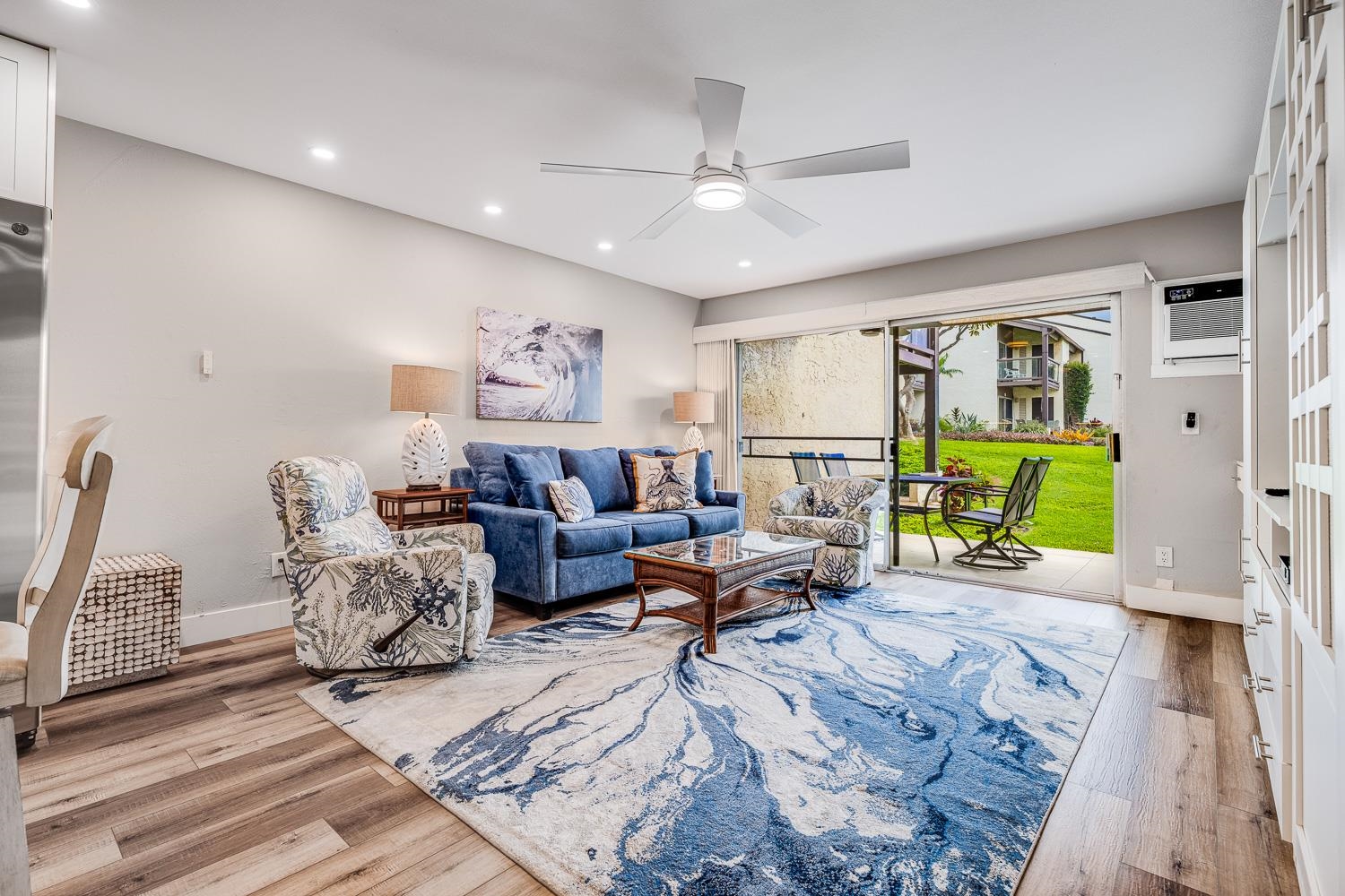 Hale Kamaole 142 is a beautifully remodeled ground floor 1-bedroom, 1-bath condo that delivers a fresh, modern beach vibe just steps from Kamaole Beach Park III and the upper pool. Come experience a true “WOW” with luxury furnishings, cool tile flooring, and a bright open-concept layout that feels larger than a typical one bedroom. The kitchen has been thoughtfully redesigned to create a more spacious dining and living area. Featuring newer appliances, cooking and entertaining at home is a breeze. The bathroom showcases an amazing walk-in tile shower and updated finishes that give the space a sleek, spa-like feel. In the bedroom, a comfortable king bed anchors a clean, contemporary space, complemented by additional sleeping on the queen sofa murphy bed in the living room so you can host family or guests with ease. Every detail of this remodel was done to elevate comfort and livability, from A/C and in-unit washer/dryer to the curated décor and plentiful storage, including an outdoor closet stocked for memorable beach days. Slide open the lanai door and enjoy a seamless indoor-outdoor flow to a broad lawn area just 50 feet from the pool and BBQs, giving this unit the feel of a private backyard retreat in one of South Kihei’s most desirable low-rise complexes. All of this is set in Hale Kamaole’s resort-style setting with two pools, tennis/pickleball, and meticulously maintained tropical grounds, directly across from one of Maui’s best swim and sunset beaches.