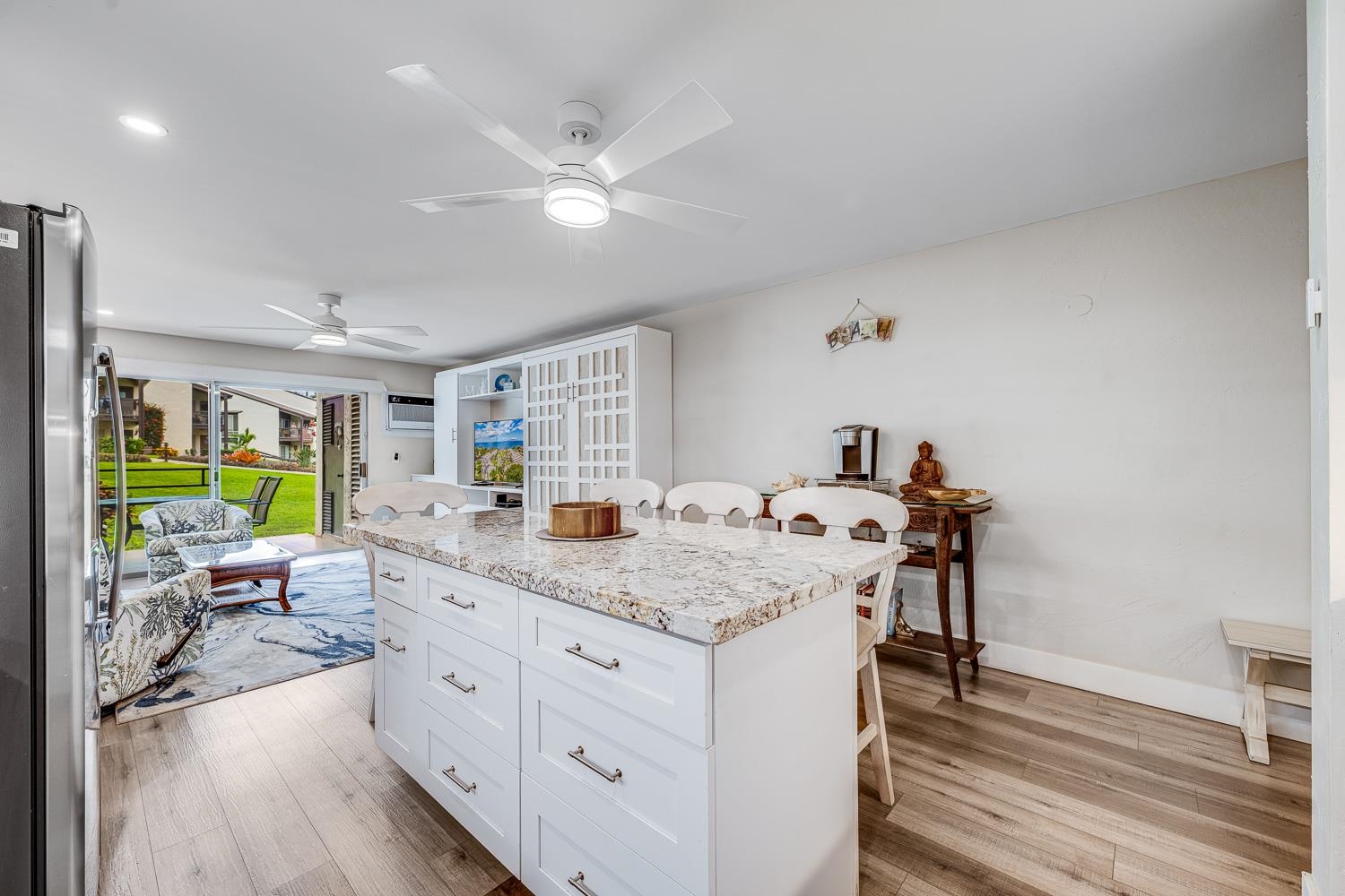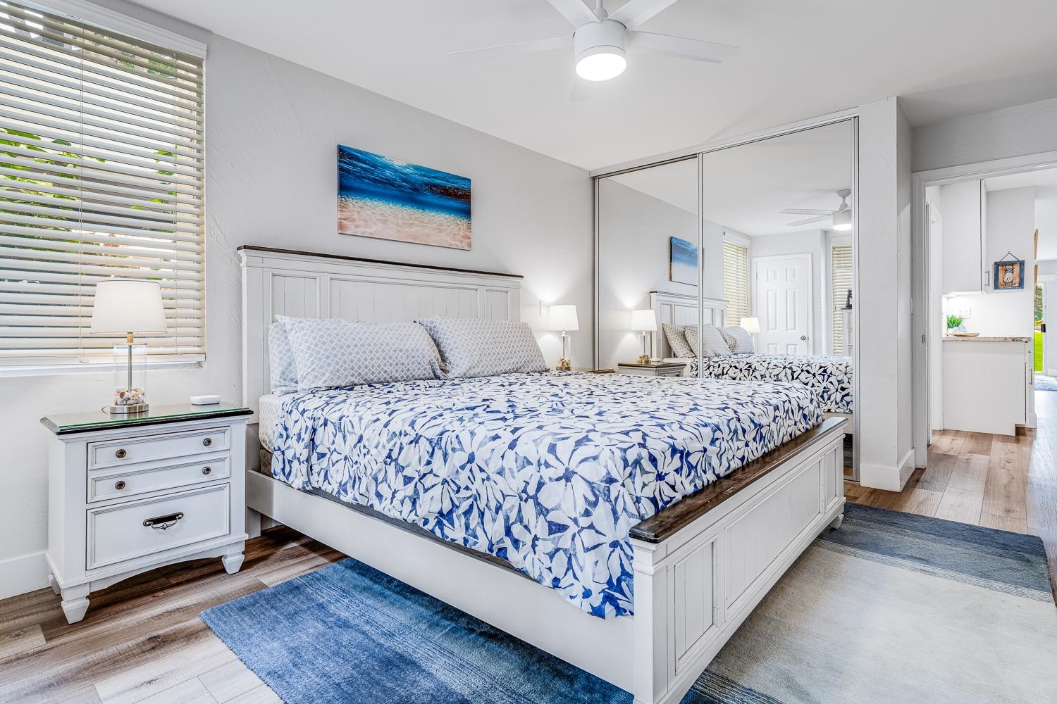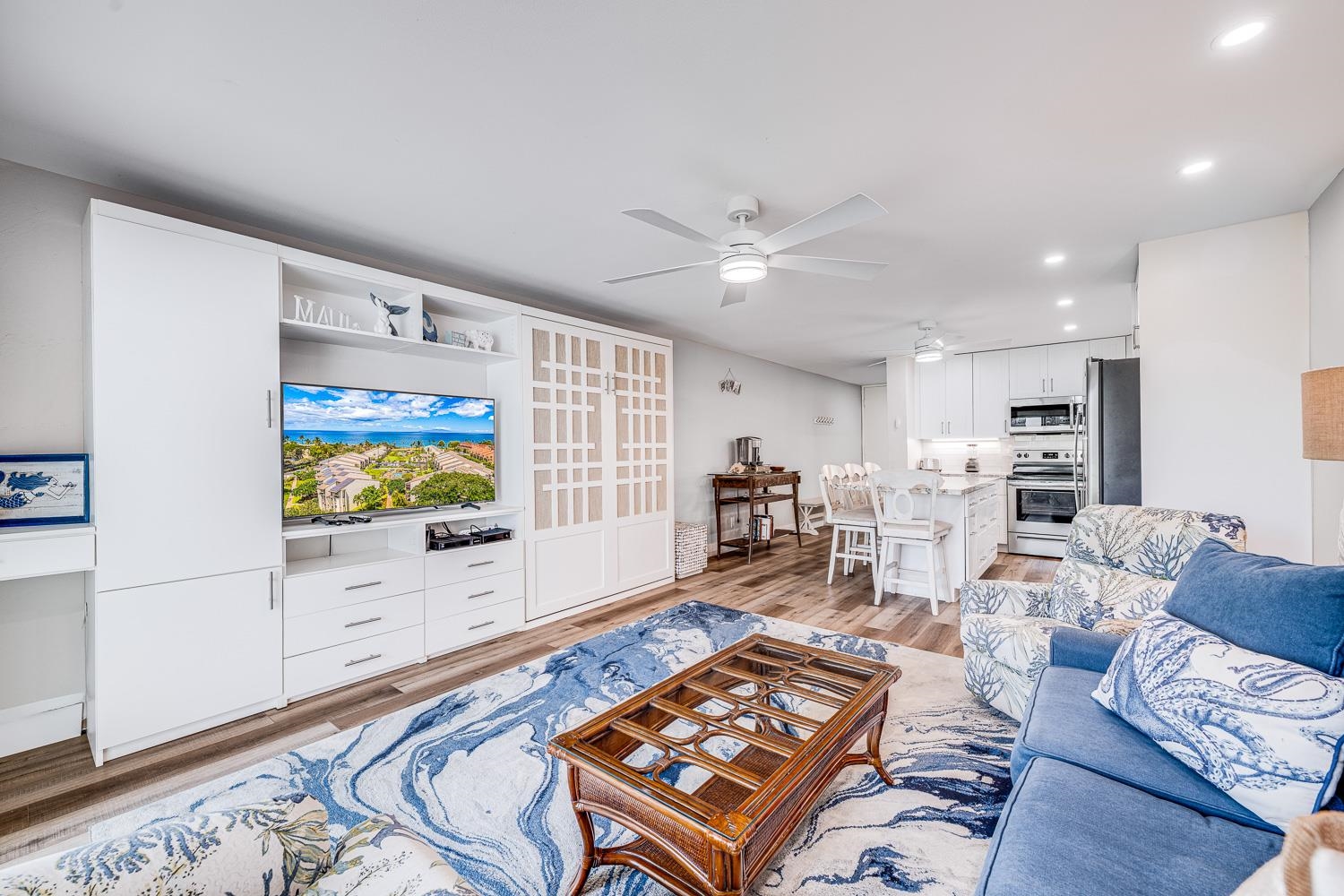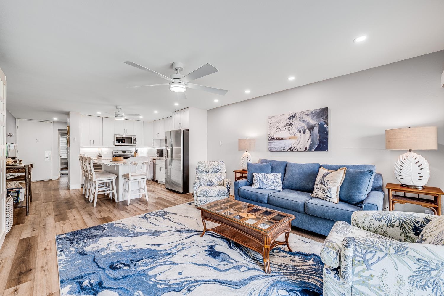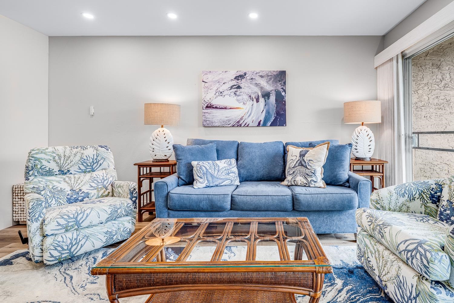 Hale Kamaole 142 is a beautifully remodeled ground floor 1-bedroom, 1-bath condo that delivers a fresh, modern beach vibe just steps from Kamaole Beach Park III and the upper pool. Come experience a true “WOW” with luxury furnishings, cool tile flooring, and a bright open-concept layout that feels larger than a typical one bedroom. The kitchen has been thoughtfully redesigned to create a more spacious dining and living area. Featuring newer appliances, cooking and entertaining at home is a breeze. The bathroom showcases an amazing walk-in tile shower and updated finishes that give the space a sleek, spa-like feel. In the bedroom, a comfortable king bed anchors a clean, contemporary space, complemented by additional sleeping on the queen sofa murphy bed in the living room so you can host family or guests with ease. Every detail of this remodel was done to elevate comfort and livability, from A/C and in-unit washer/dryer to the curated décor and plentiful storage, including an outdoor closet stocked for memorable beach days. Slide open the lanai door and enjoy a seamless indoor-outdoor flow to a broad lawn area just 50 feet from the pool and BBQs, giving this unit the feel of a private backyard retreat in one of South Kihei’s most desirable low-rise complexes. All of this is set in Hale Kamaole’s resort-style setting with two pools, tennis/pickleball, and meticulously maintained tropical grounds, directly across from one of Maui’s best swim and sunset beaches.