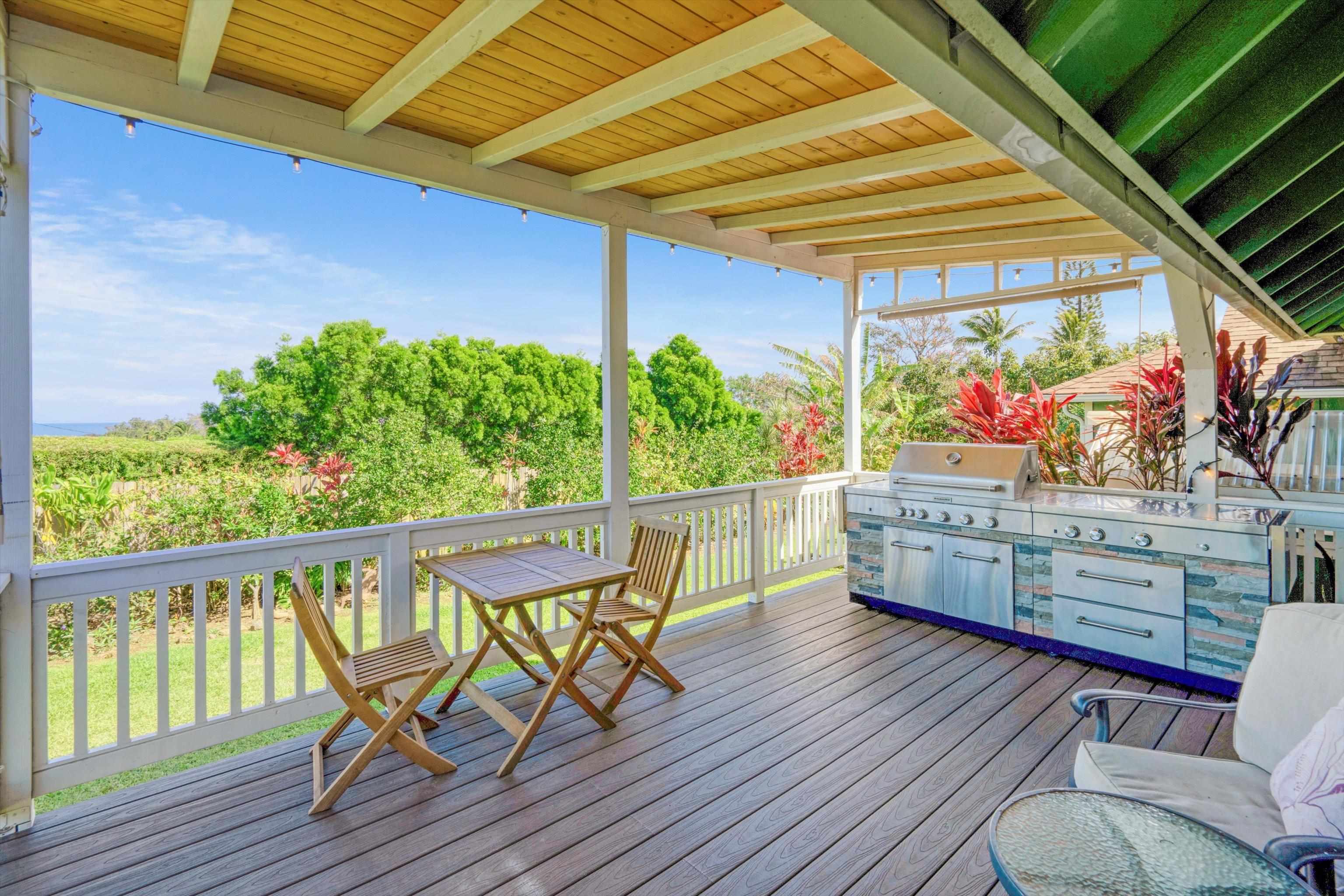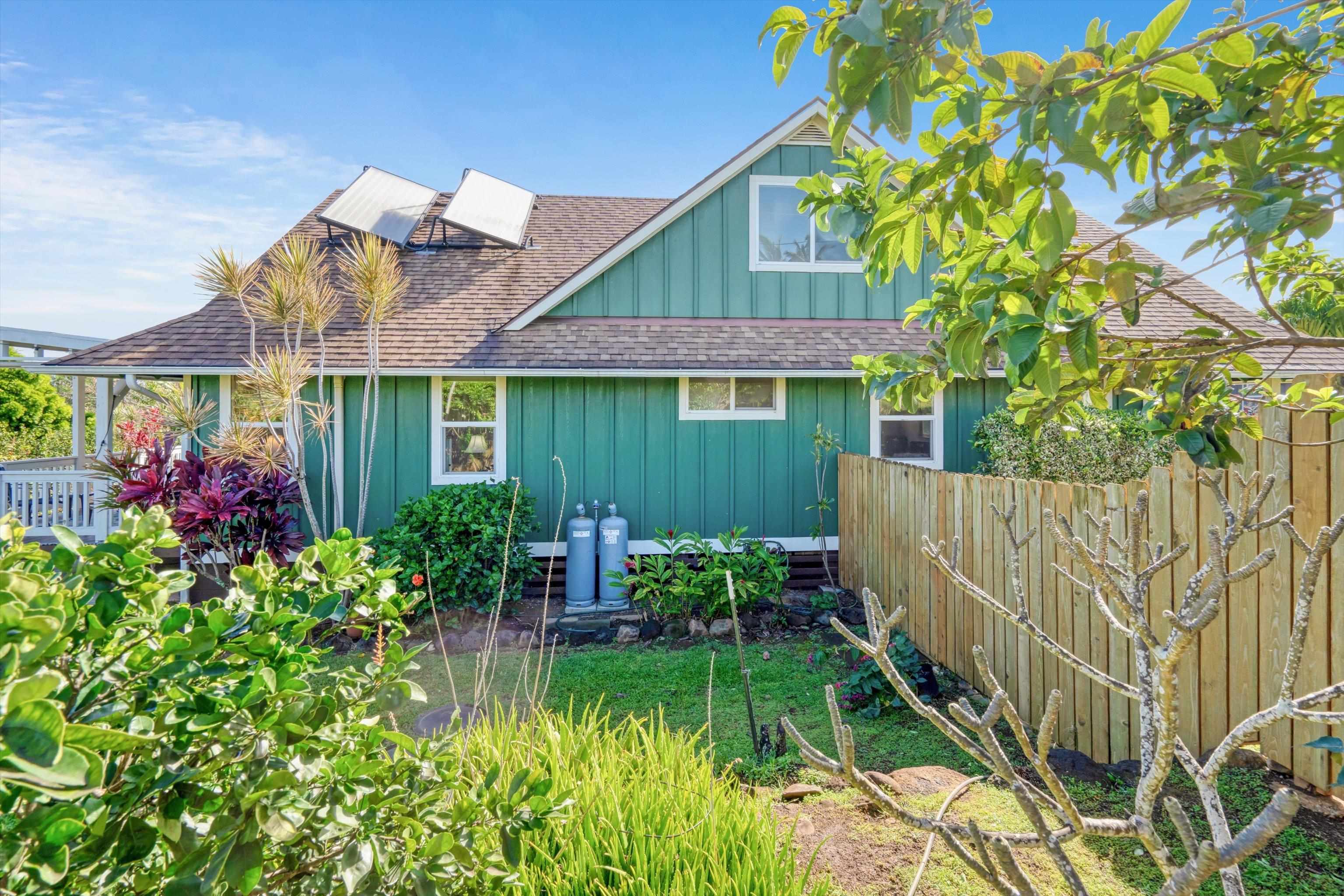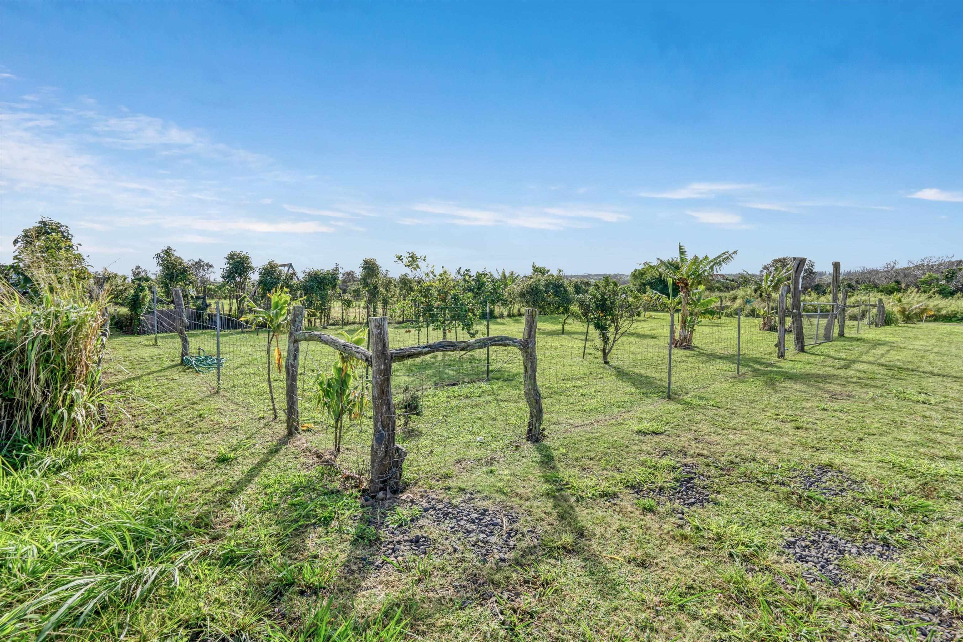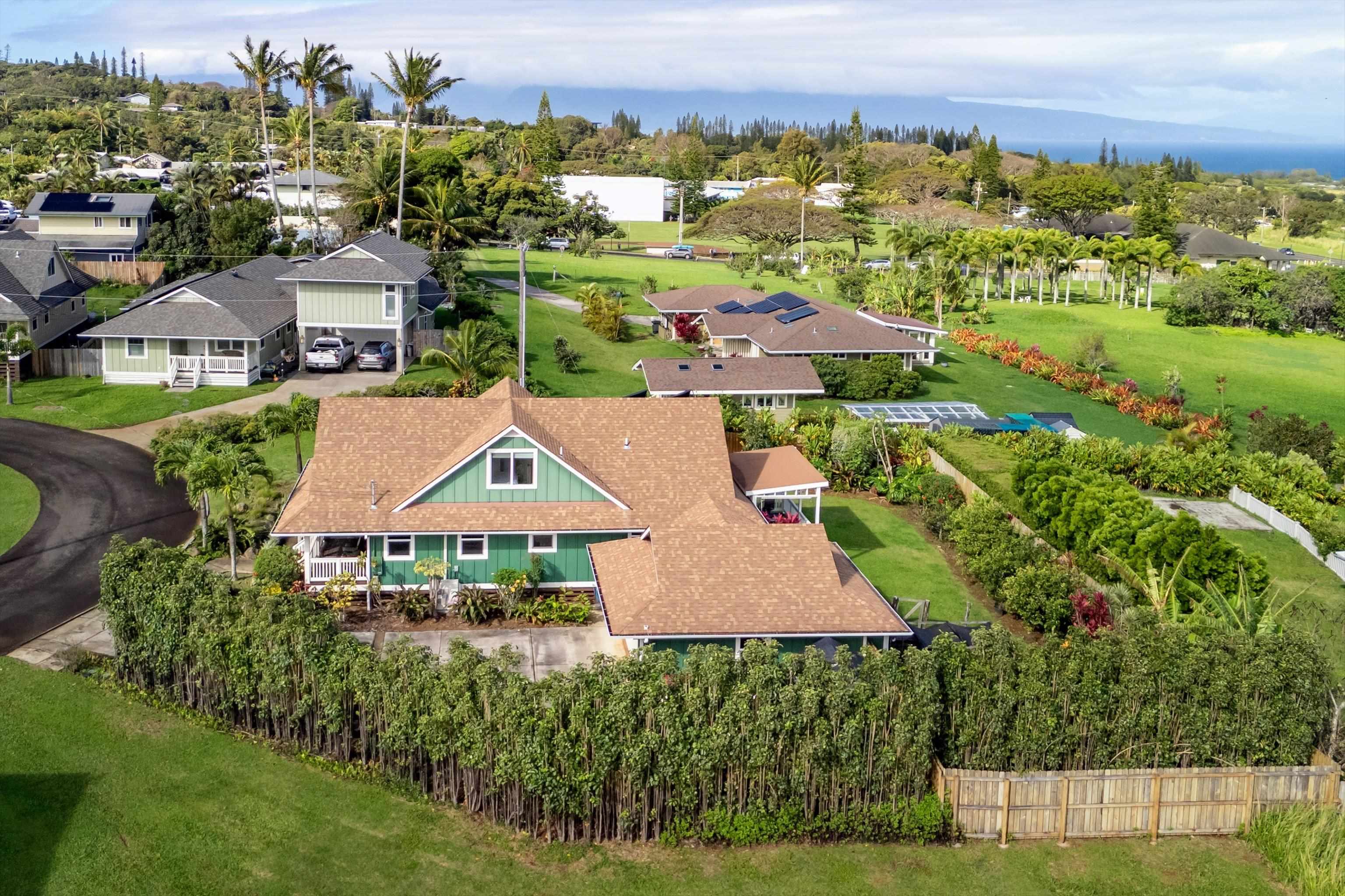 Experience the essence of North Shore living with this exceptional plantation-style residence in Haiku. Thoughtfully constructed in 2018 with high-quality materials–including durable cement board siding, asphalt shingle roofing, and dual-pane windows–this home blends timeless design with modern comfort. The home also features 5 split AC systems for all areas of the home. Nestled at the end of a tranquil lane within a gated, private enclave of just 33 homes, it embodies a sustainable urban farm lifestyle unique to the Pauwela Homes community. The front farmer’s porch welcomes the first light of east-facing sunrises, while the ocean-view back lanai invites relaxation beneath the glow of Maui’s breathtaking sunsets. From multiple rooms and vantage points, enjoy sweeping views of the Pacific Ocean and majestic Haleakala. The well-designed floor plan features a first-floor primary suite and three additional upstairs bedrooms, each enjoying elevated outlooks and gentle trade winds. A spacious chef’s kitchen anchors the home, showcasing stainless steel appliances and seamless access to the ocean-view lanai–perfect for entertaining or unwinding with family and friends. The beautifully landscaped backyard is a tropical sanctuary with over 15 varieties of fruit trees and a full irrigation system to support year-round abundance. Adding to its allure is a deeded 5,000-square-foot fenced farm plot boasting mature fruit trees–including avocado, citrus, mango, banana, and cherry varieties–ideal for those seeking a productive garden or hobby farm. Perfectly positioned adjacent to Haiku Elementary and the neighborhood park, this property is minutes from Kuiaha Bay and world-famous Pe'ahi (Jaws) surf break, and less than 20 minutes from town. Pride of ownership defines this exclusive community, where homes rarely become available for sale. This remarkable home invites you to step effortlessly into the Maui lifestyle–complete with exclusive use of your private yard and farm plot–and begin enjoying the best of North Shore living from day one. This is a residential CPR with 11,587 sq ft of land for the dwelling + 5,000 sq ft farm plot = 16,587 total land sq ft.