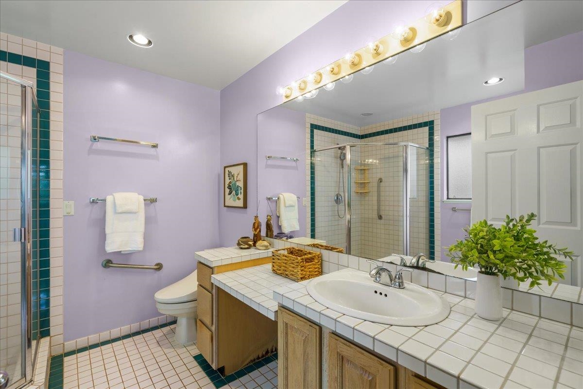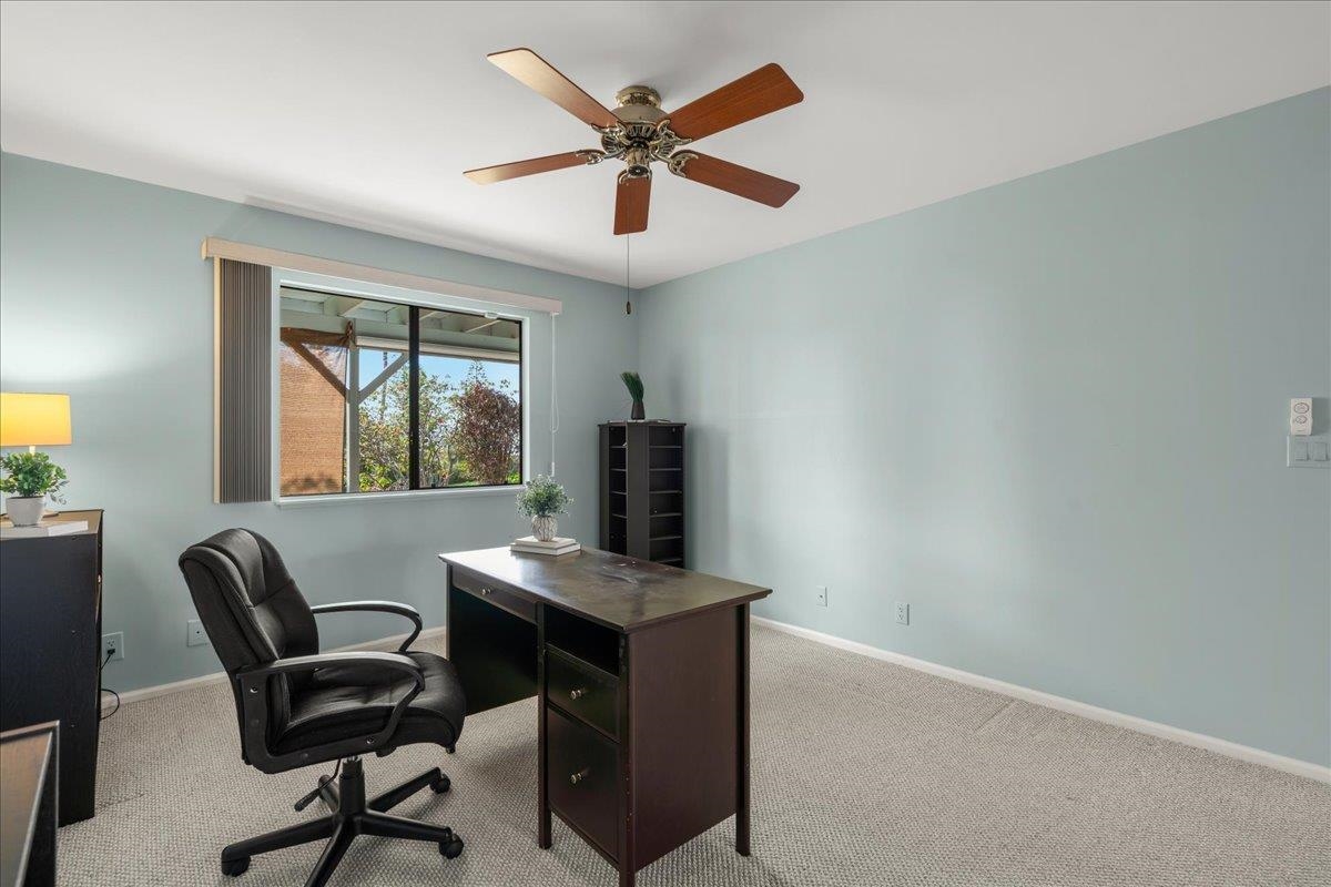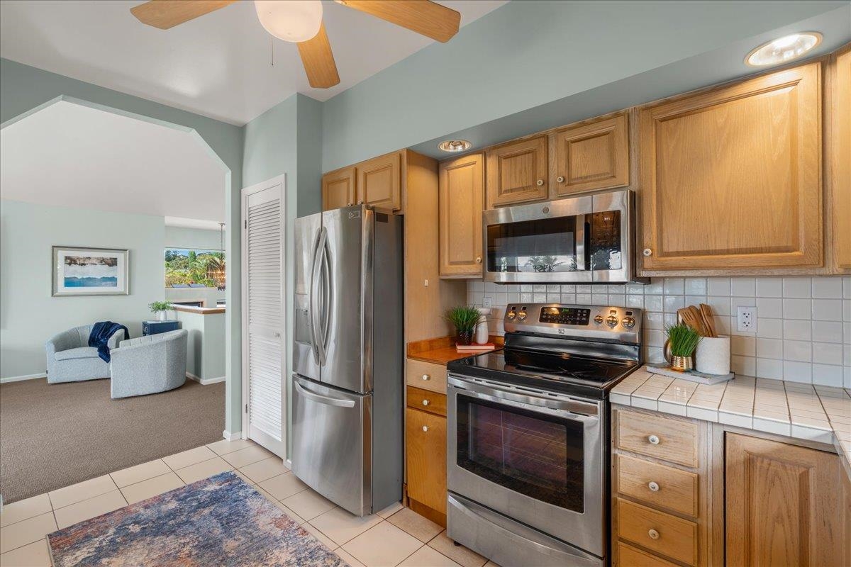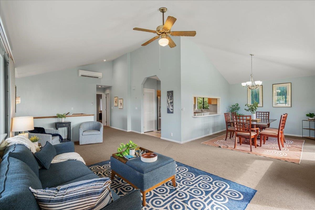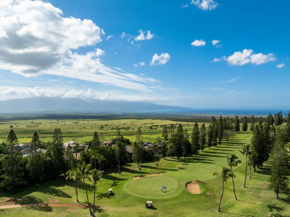 Tucked away on a flag lot, this sun-drenched 4-bedroom, 3-bath home delivers something genuinely uncommon on Maui – bi-coastal views and a long, sweeping look down the 15th fairway at Pukalani Golf Course, all from 520 square feet of newly rebuilt wraparound lanai. It's the kind of view you stop and take in every single time. The home has been thoughtfully updated where it counts: PV solar, newer split AC systems, and a newer roof give buyers the confidence of moving in without an immediate to-do list. Inside, soaring vaulted ceilings crown an open-concept living and dining space where picture windows frame the gardens and golf course beyond. The split-level layout places two bedrooms and two baths on the main level, with two additional bedrooms and a full bath below – well-suited for guests, a home office, or flex use. Remote-controlled electric blinds, both interior and exterior, allow easy management of light and privacy throughout the day. The professionally-landscaped yard unfolds across a lot measuring nearly 11,000 square feet, with an irrigation system and lush tropical plantings – bromeliads, crotons, and layered island foliage – softening every corner with color and texture. Three separate gates provide convenient access to the fully-fenced in back yard. A 240 sqft lower level lanai offers additional outdoor space to enjoy. The two-car garage includes the laundry area, considerable storage space, and its own separate side entrance – with a large concrete driveway pad that offers plenty of room for extra vehicles, equipment or room to play.