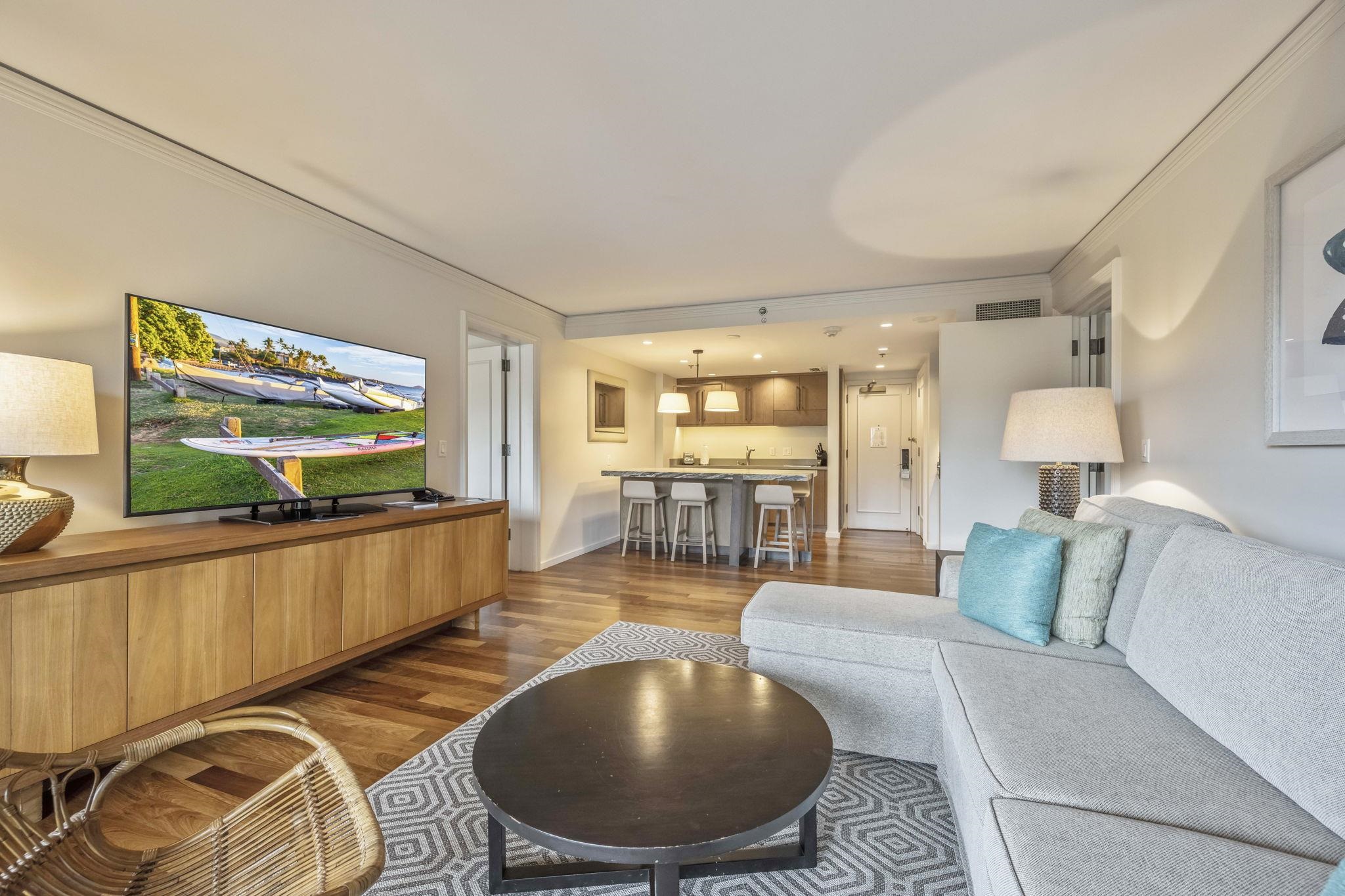 Experience luxury resort living at The Ritz-Carlton Maui, Kapalua. This two-bedroom residence (Units 1614/1616) offers a flexible two-bedroom lockoff configuration that can accommodate up to six guests and has partial Ocean views. The primary bedroom features a king bed and a spacious marble bathroom with dual vanities, an oversized soaking tub and a separate shower. The second bedroom includes two queen beds and a full bathroom with a separate tub and shower. The suite includes two full bathrooms, offering privacy and comfort for owners and guests. The living area features rich dark wood flooring, a sleeper sofa, and a dining area seating up to six. The partial kitchen is equipped with top of the line appliances, a full set of cookware, dishes, and glassware. Additional features include two private lanais with ocean views, 65" Smart TVs, full cable service, and high-speed wireless internet. Owners and guests enjoy access to the amenities of The Ritz-Carlton Maui, Kapalua including multiple pools, spa services, championship golf courses, award winning restaurants and lounge and access to several of Maui's finest beaches found on Kapalua Coastal Trail. Whether enjoyed as a personal island retreat or sought as a luxury vacation rental, this exceptional Hotel zoned residence offers a rare opportunity to experience the timeless elegance of Ritz-Carlton living in paradise.