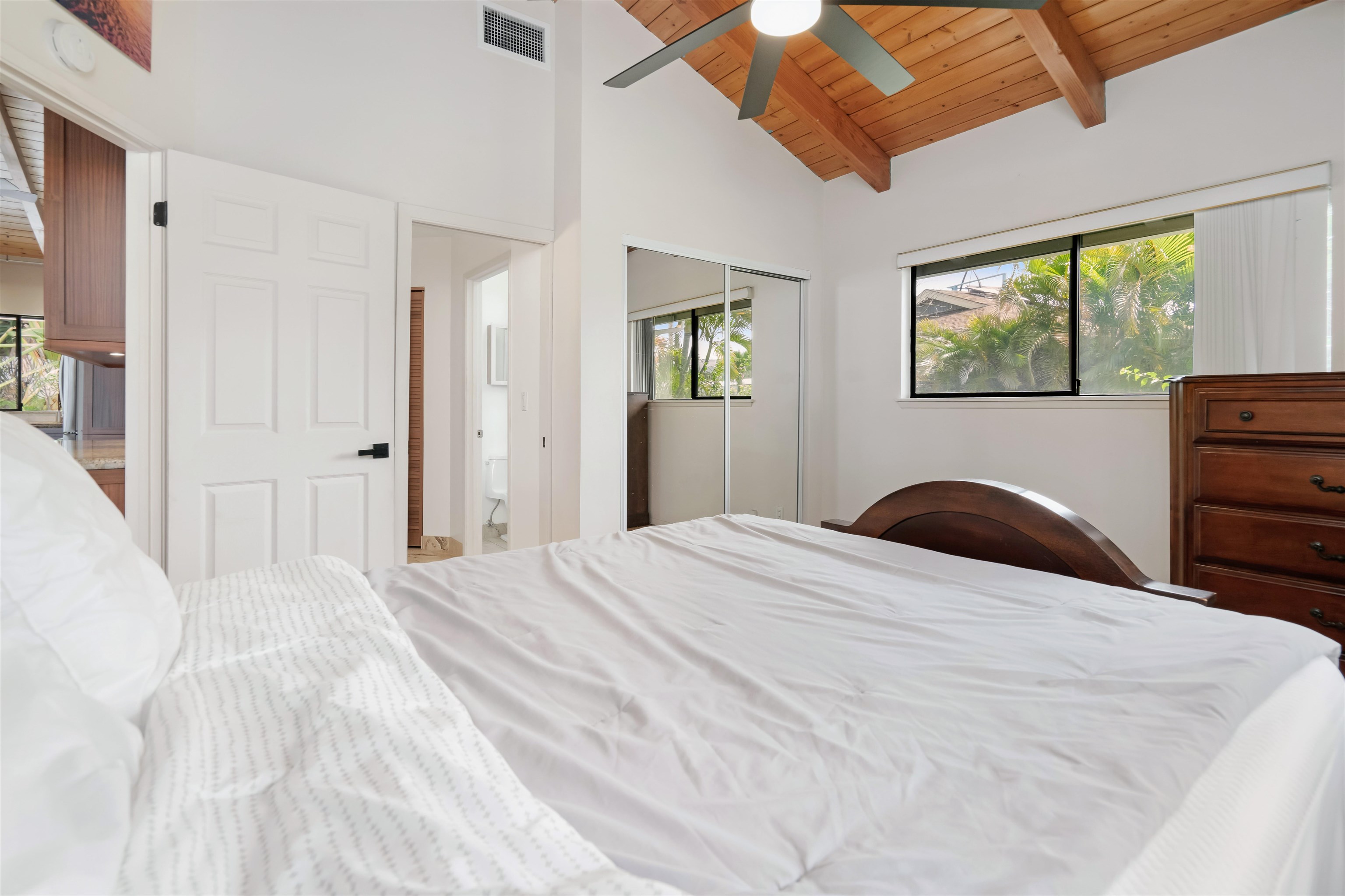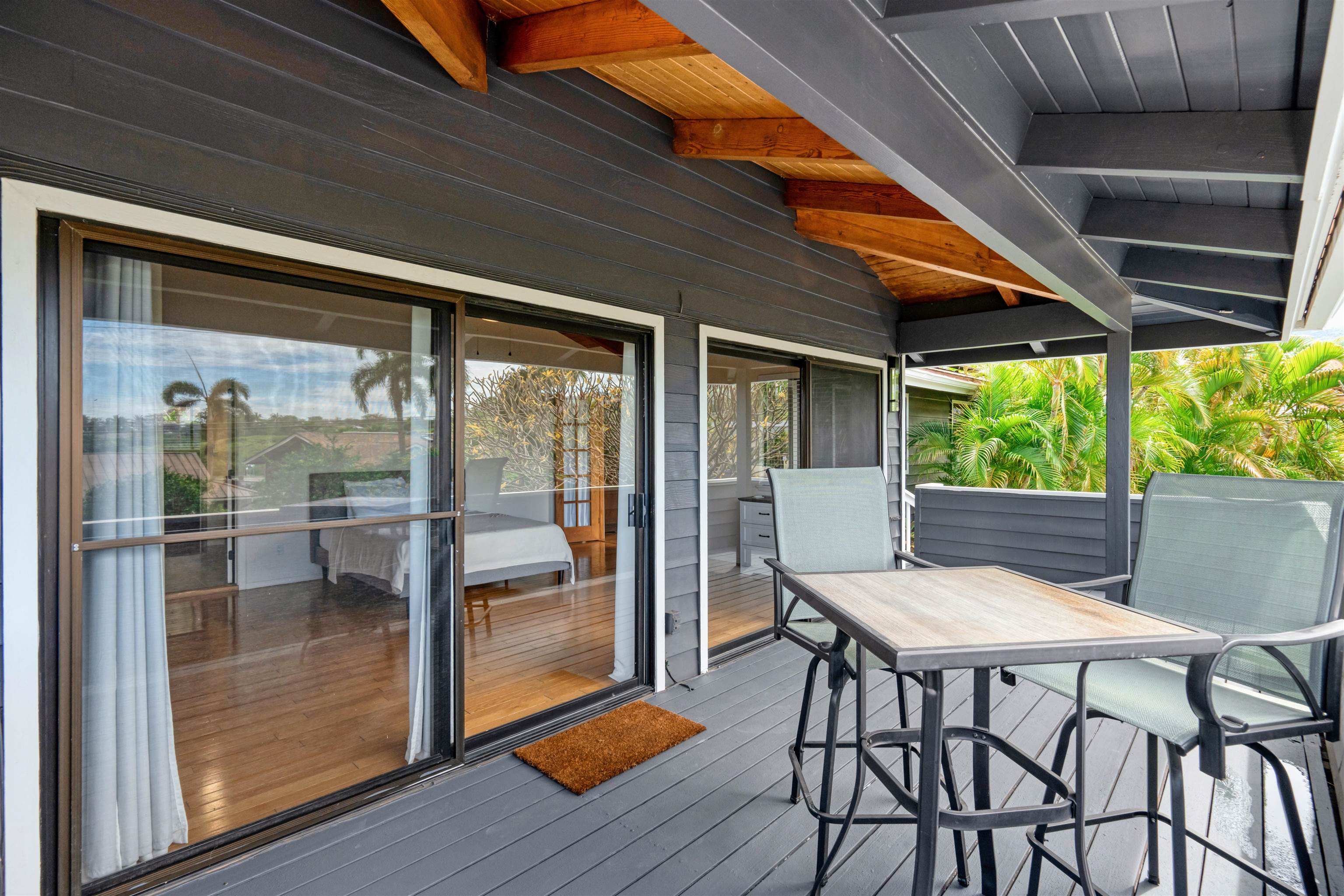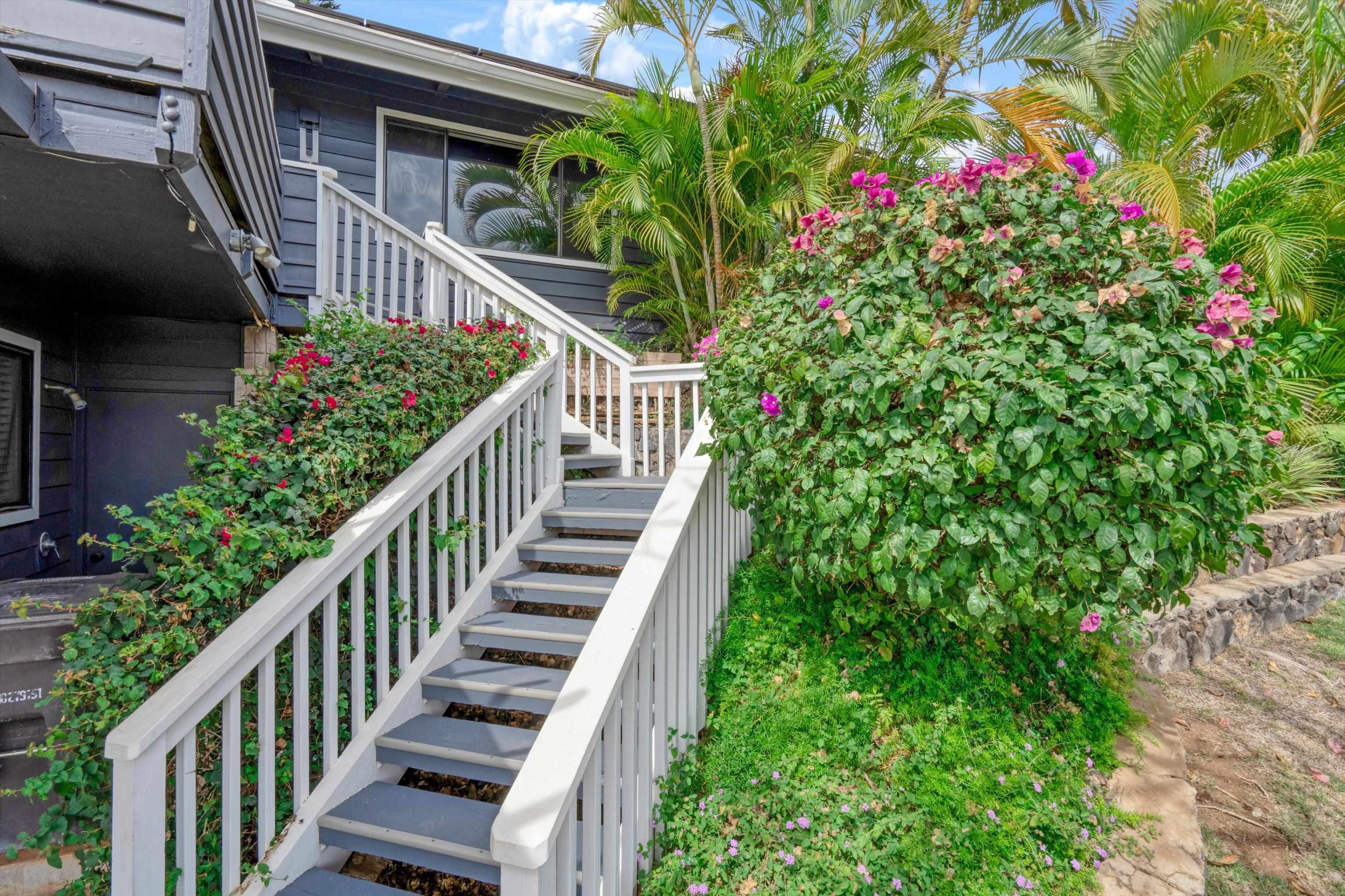 Gorgeous home with a legal attached ohana located on a quiet cul-de-sac just up the hill from Kamaole Beach Park III and Keawakapu Beach. This distinctive property, constructed with beautiful cedar siding on a solid slab foundation, features a 4-bedroom, 2-bath main home on the upper level with open beam vaulted ceilings, dual system air conditioning, and a fully remodeled kitchen. The home also includes an updated laundry room with a solar-powered 120-gallon water heater, a serene backyard patio with a hot tub, and a front-facing lanai with partial ocean and Molokini views. The lush backyard, framed by majestic fan palms and new landscaping, is enclosed by a 6-foot vinyl privacy fence with a remote-controlled gate for easy access. A spiral staircase leads to an impressive rooftop deck offering breathtaking 360-degree views. The street-level ohana is a 1-bedroom, 1-bath unit with its own private entrance, secluded landscaped patio, modern kitchen with dishwasher and full-sized refrigerator, ensuite washer/dryer, new ceramic tile flooring, and dual mini-split A/C system. The property offers a total of 5 bedrooms and 3 bathrooms. There are two separate owned photovoltaic systems. The main house has 24 PV panels and 10 PV panels for the attached ohana unit. The covered drive supports 6 parking spaces and equipped w/ a 220v EV outlet. This property combines comfort, efficiency, and island charm in one exceptional offering.