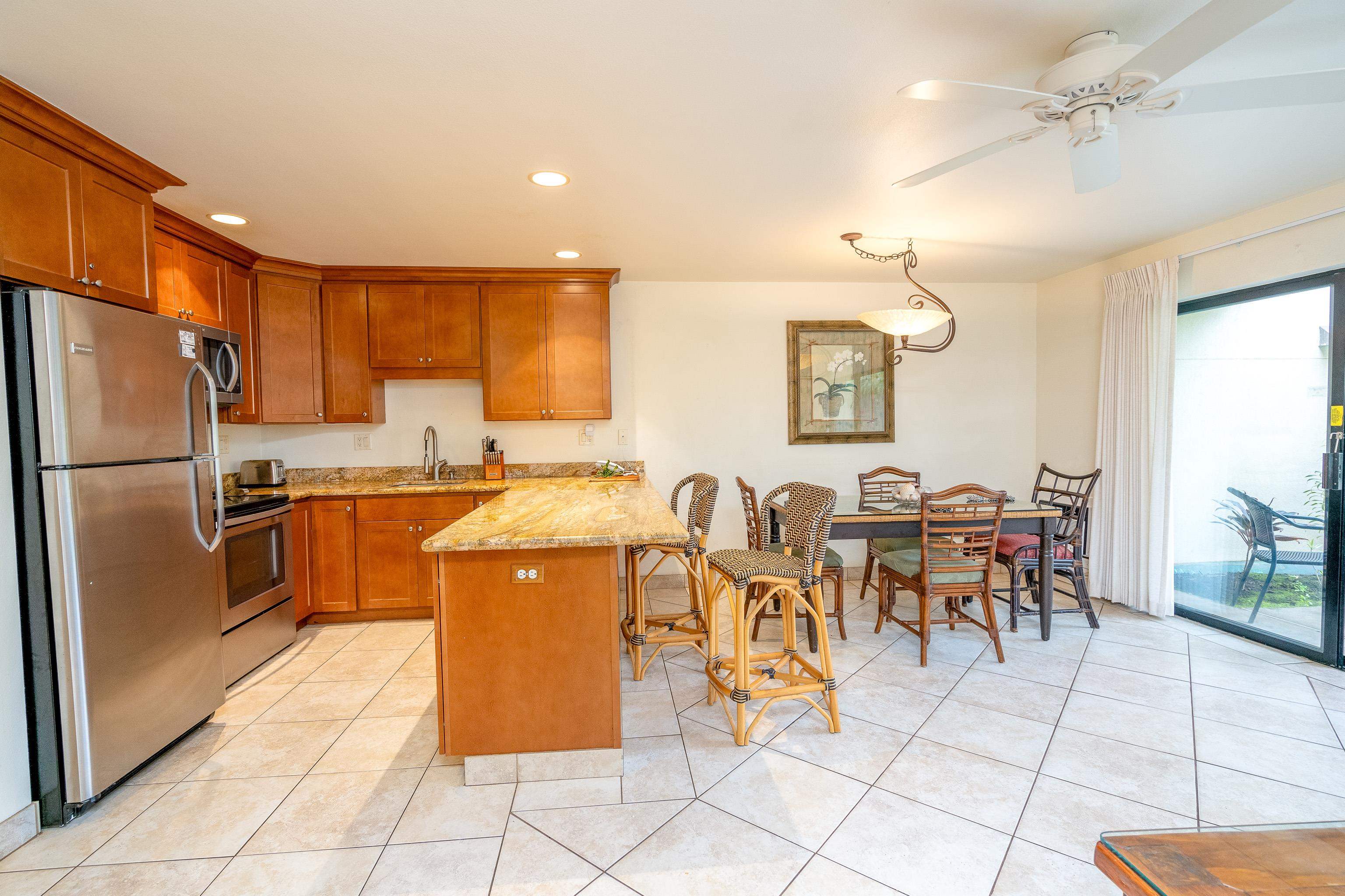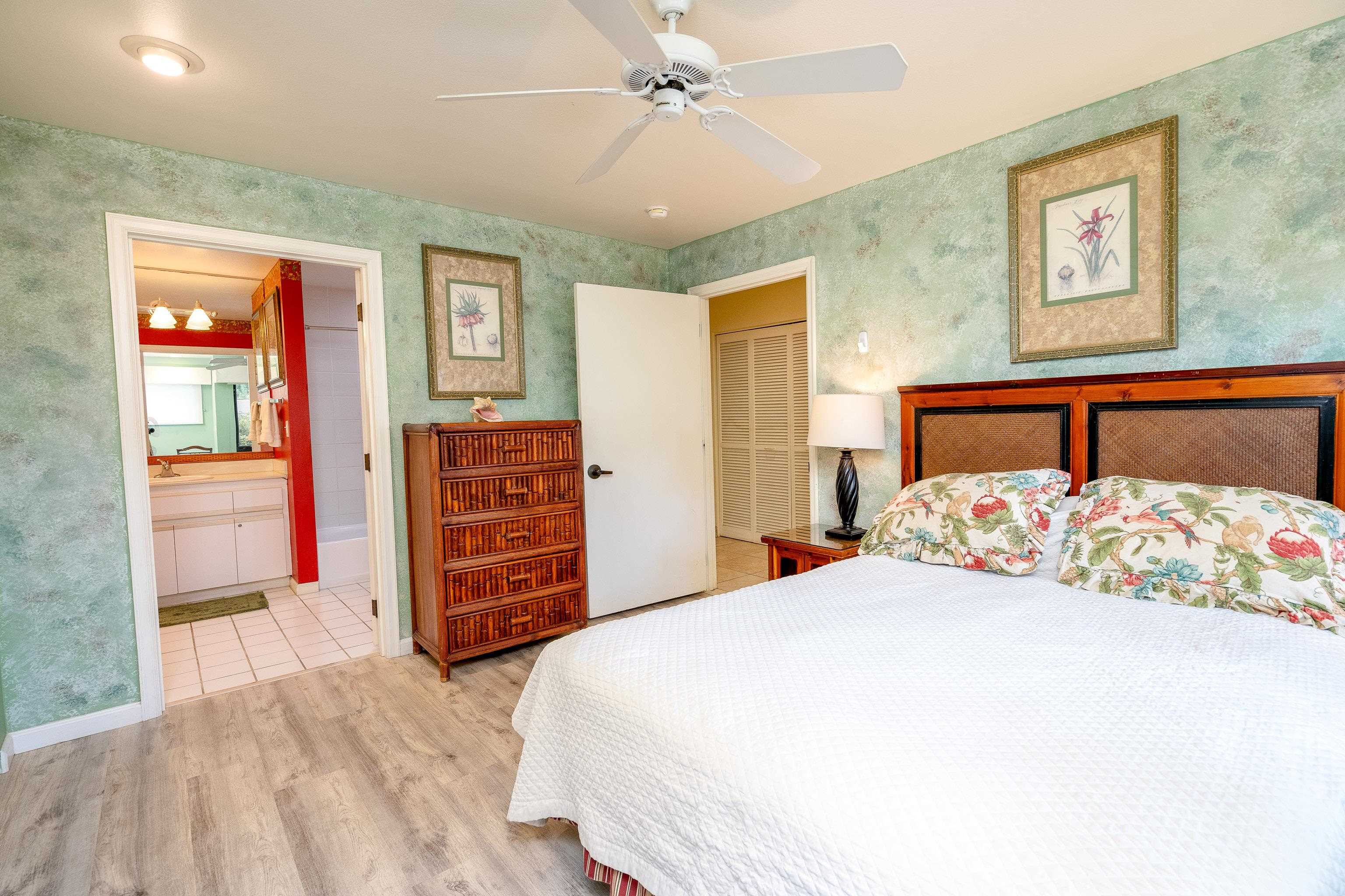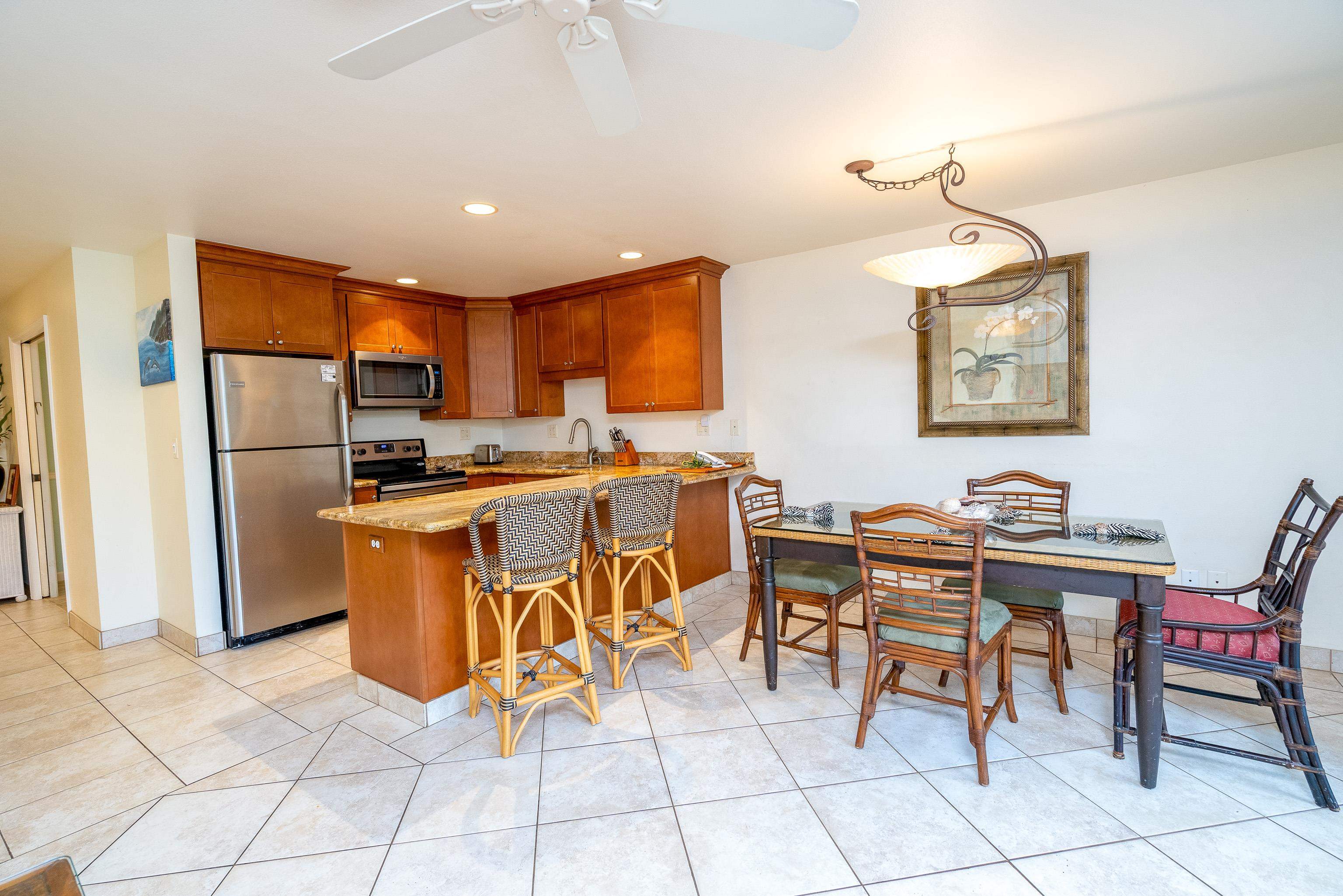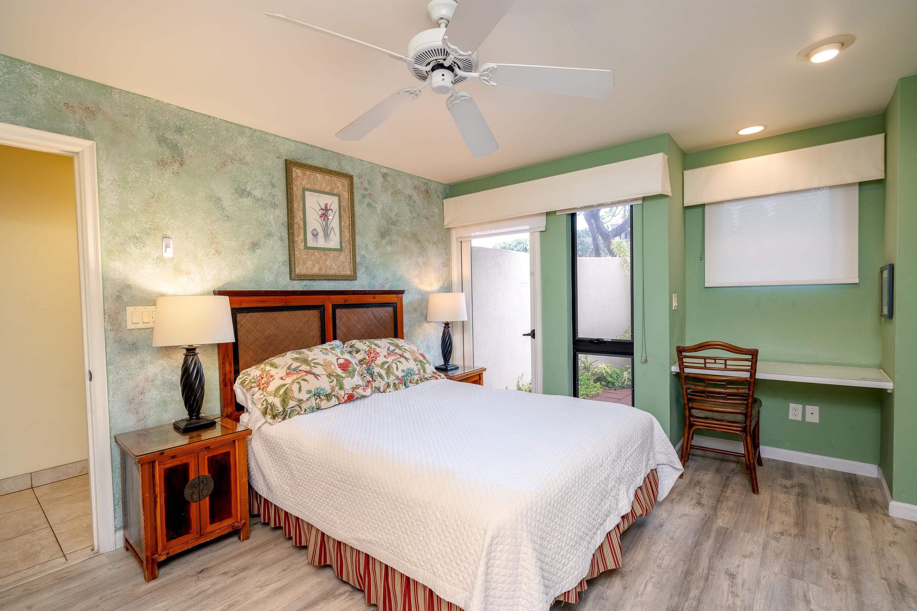 Large & Unique one bedroom plus a den. There are only 14 in the complex like this one. Nicely remodeled with new kitchen cabinets, granite kitchen counter tops, luxury vinyl floors in the bedroom and den and porcelain tile floors in the hallway, kitchen and dining room. Quiet location, but close proximity to the upper pool & tennis courts. Maui Kamaole offers 2 pools, 2 hot tubs, 2 tennis courts and owners storage for paddle boards and kayaks. The beaches just across the street are stellar white sand beaches and the complex is within 10 minutes of numerous resort golf courses. Do not miss this one, call your favorite REAL TOR to schedule a private showing today.