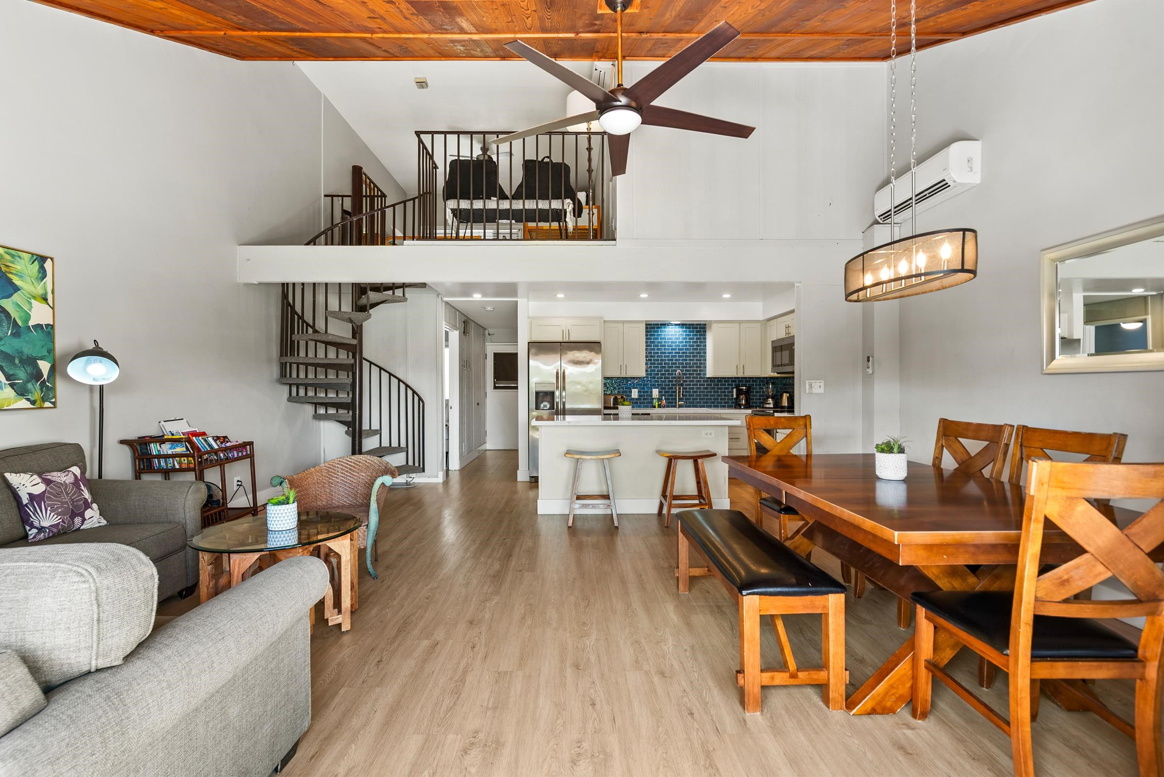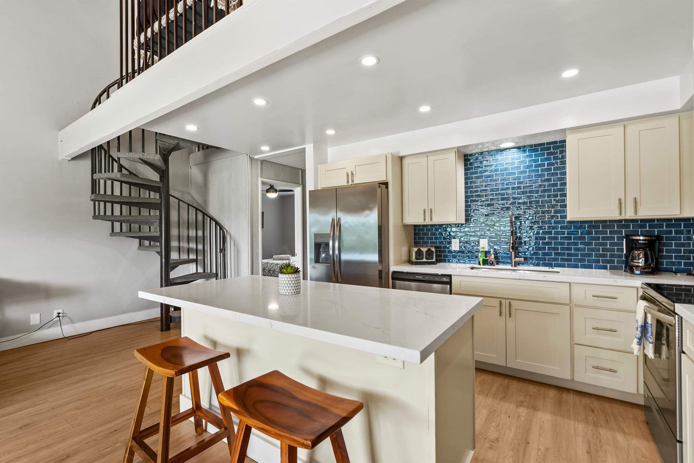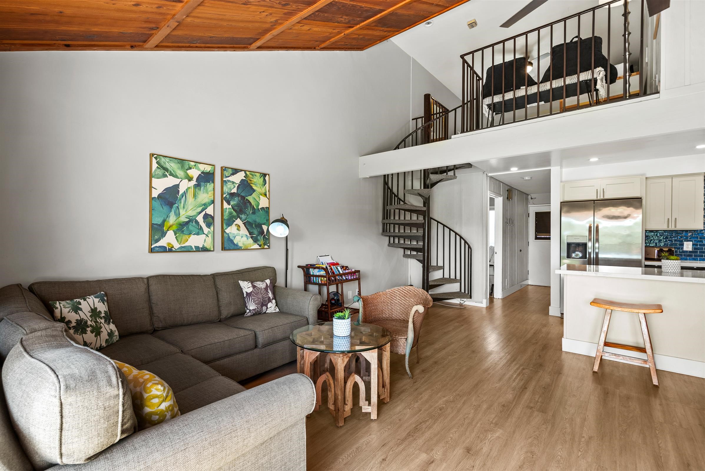 Welcome to Koa Resort 2H, a spacious 3 bedroom condo ideally located directly across from the calm shoreline of Kalepolepo Beach in North Kihei. This 1,179 square foot unit feels more like a private "home away from home" residence and is perfectly positioned on the second floor of Building 2, a highly prized location in the quiet North section of the community. The open-concept great room has high ceilings and seamlessly connects the lanai, kitchen, dining, and living room to create an inviting integrated space for everyday living and entertaining. The large, 20-foot wide lanai is the perfect spot for outdoor relaxation with views looking out to the lushly landscaped central courtyard. The upstairs loft, which is accessed by a spiral staircase in the living room, has a guest bedroom with en-suite bathroom, offering privacy and flexibility. The chef’s kitchen features quartz countertops and high energy-efficient appliances. Split-system Fujitsu air conditioners provide added comfort. Koa Resort is a low-density community with just 5 buildings across 5.63 acres of lush, mature landscaping, creating a peaceful, park-like setting. Amenities include a heated pool, hot tub, tennis courts, and BBQ area with daily maintained grills. Sugar Beach, with over 6 miles of shoreline, is just minutes away.