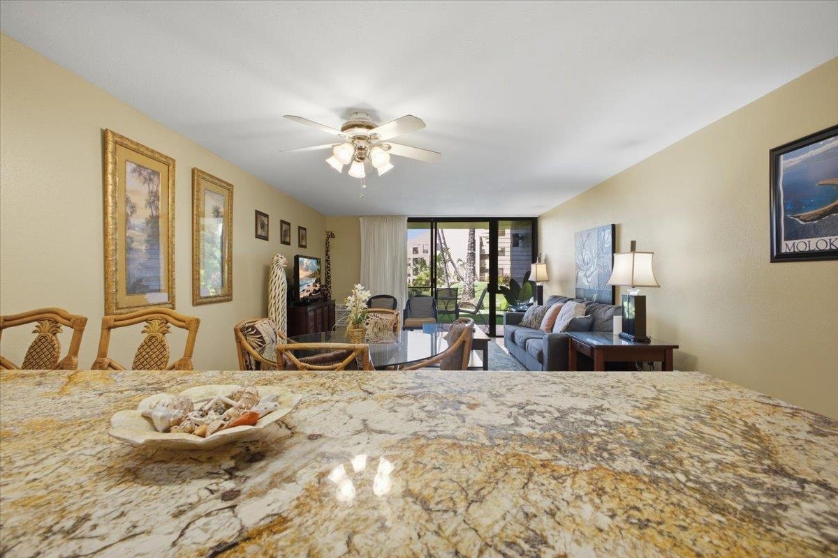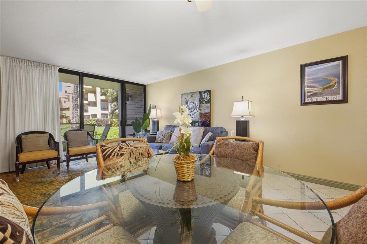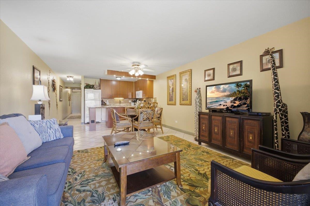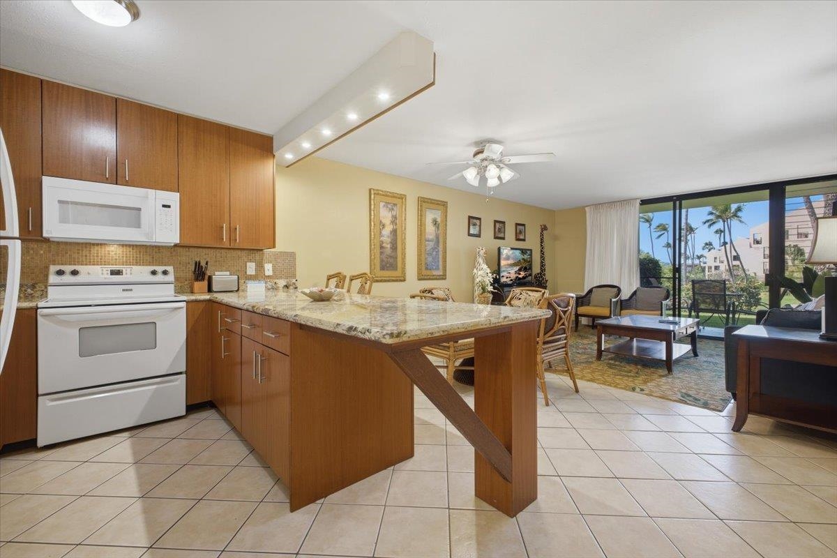 Exceptional Value Alert! Remodeled, nicely appointed, and very well kept first floor unit across the street from Kamaole Beach Park III at an amazing price! Step inside and enjoy the incredible privacy with cool tile floors stretching throughout the unit and lanai, plus vinyl plank hardwood floors in the bedroom. Perfect for you and your family - or rental guests when you are away. The tasteful updates include nice lighting fixtures throughout, granite countertops with mosaic tile backsplash in the kitchen with clean white appliances, set off by handsome dark wood cabinetry. You’ll notice the beautiful art decor throughout lending a true Hawaiiana feel. Moving into the living area you find a attractive dining setup, then the comfortable sleeper sofa and a large ornate area rug to set off the space. The lanai is peaceful and private with a garden view of the impeccably kept grounds of the community. The hall bath has been remodeled with the convenience of a stacked washer/dryer and it features an updated tile shower, recent vanity, and stylish barn door access. The bedroom has a king bed, decorative fan, and nice artistic touches with the beautiful wood vinyl flooring. The main bathroom has also been updated with a beautiful tile shower plus updated vanity and lighting. This location puts you in the best, most walkable part of South Kihei, close to one beautiful world class beach after another and convenient to all the shopping and restaurants and everything in South Maui and the Wailea Resort. Don’t miss this excellent opportunity!