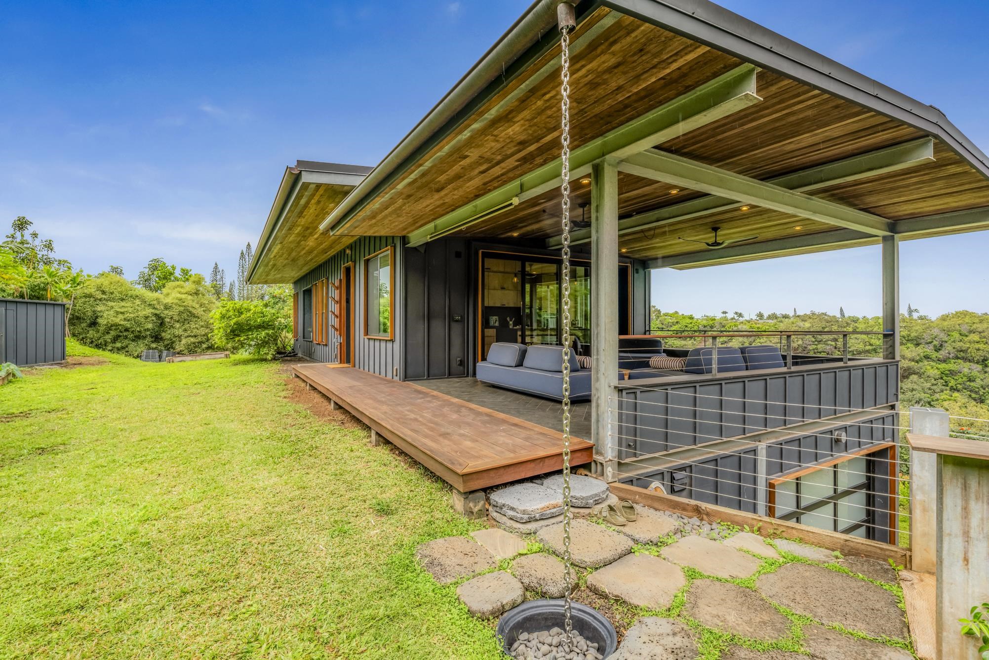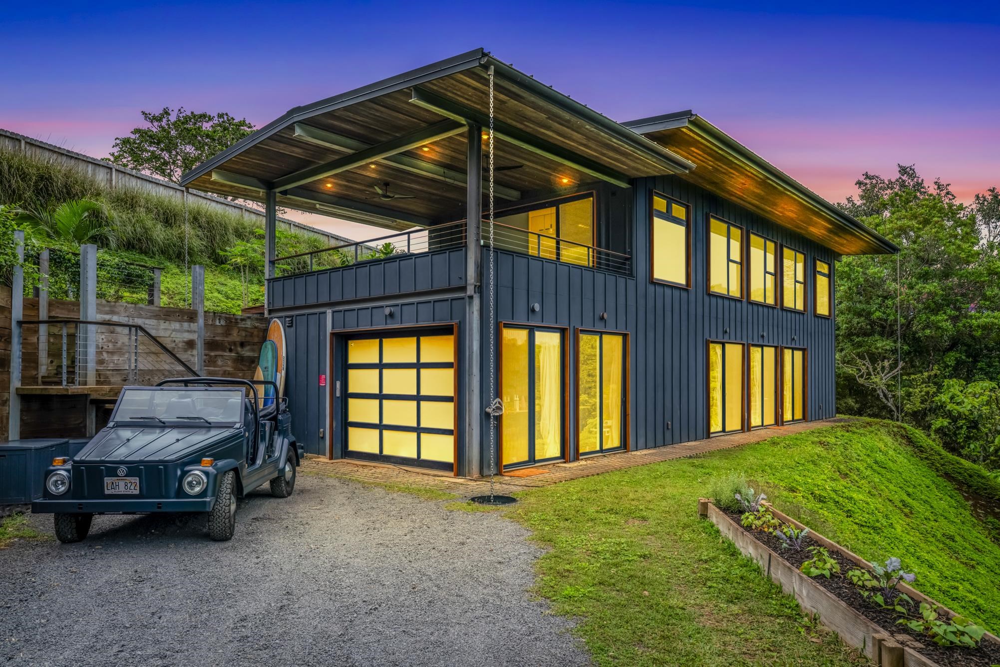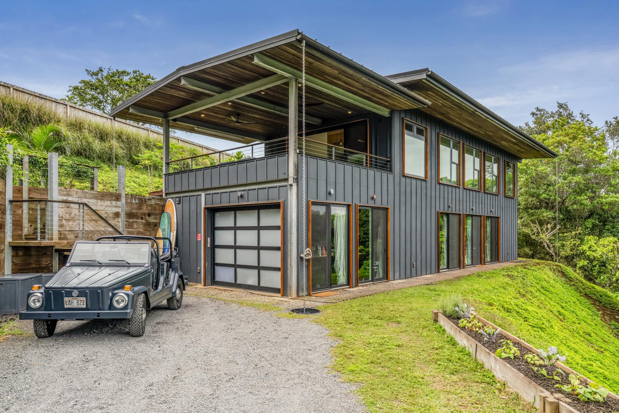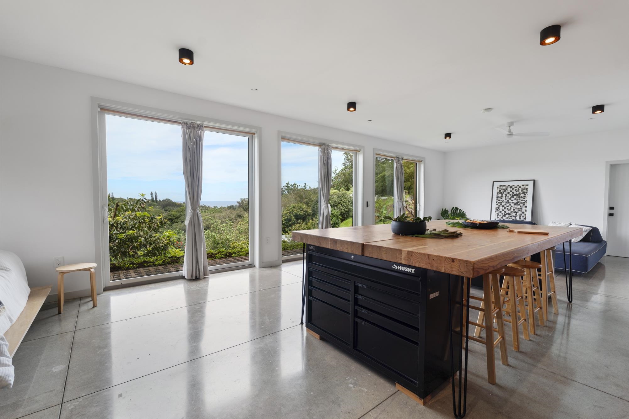 A private 2.2-acre compound in Haiku with expansive forested outlooks, ocean and mountain views. Accessed via a long driveway off a cul-de-sac and set behind an electric gate, the property offers a strong sense of arrival and privacy. The total covered space spans approximately 2,750 square feet. The main residence offers 1,008 square feet of living space with four bedrooms, three bathrooms, and open living areas. Three of the four bedrooms feature transforming furniture systems that convert seamlessly between sleeping, working, and living configurations. An approximately 400-square-foot covered lanai connects directly to the interior via a large-format sliding door system that fully opens the kitchen to the outdoor space, allowing the two areas to function as one. The additional 1,344-square-foot ground floor provides flexible garage/workshop/office, or studio space. Originally designed by Graham Hill (TreeHugger, LifeEdited), whose work on efficient living has been widely viewed through a TED Talk and featured in The New York Times, HGTV, and other media, the property was built as a high-functioning, real-world home combining modern design, flexible living, and independent infrastructure. The layout functions as a small compound, supporting privacy, guests, multi-generational living, and multiple home offices. Spaces are arranged from public to private, with sound-attenuating construction throughout, including double-layer drywall with acoustic damping compound and a suspended floating ceiling below the main living level, allowing areas to be fully closed off for privacy and quiet. Designed for airflow, durability, and comfort, with natural cross-ventilation and passive design, large six-foot overhangs for shade and weather protection, high ceilings, large picture windows, dual Kohler soaking tubs, and Ipe decking and railings. The home remains consistently dry and well-ventilated, aided by its siting, airflow, and rainscreen-style siding system with an air gap behind. The home operates on a high-capacity off-grid system designed for daily reliability and resilience: 14 kW solar array (36 panels), 48 kWh Blue Ion battery storage, Level 2 EV charger, and solar thermal hot water. Water is supplied by a 20,000-gallon catchment system with double-barrel filtration and UV treatment, plus a county water connection via shared meter. High-speed Starlink internet supports full-time remote work. The 2.2-acre parcel features strong sun exposure, consistent airflow, ample parking for 10+ vehicles, and approximately 40 fruit trees, many actively fruiting, including papaya, mango, avocado, banana, lychee, jackfruit, breadfruit, star fruit, longan, soursop, jaboticaba, and grumichama. Raised garden beds complement the orchard. Additional features include a lower terrace with campfire area, an outdoor shower with forest views, and infrastructure in place for a future approximately 200-square-foot agricultural office or accessory building, including foundation, I-beam, and footing - architectural plans included. A tiny house is currently parked on site and offered separately. Despite its private, tucked-away setting - with expansive greenery, ocean and mountain views, and a strong sense of being removed from it all - the property remains highly accessible: just 2 minutes to Baked on Maui café, bakery, small grocery, and hardware store; 6 minutes to Haiku Marketplace with grocery, gym, restaurants, and shops; 9 minutes to Ho'okipa Beach, known for world-class surf and sea turtles; 12 minutes to a network of North Shore waterfalls; and approximately 23 minutes to Kahului Airport and town amenities. The property is part of a two-unit CPR on agricultural land.
