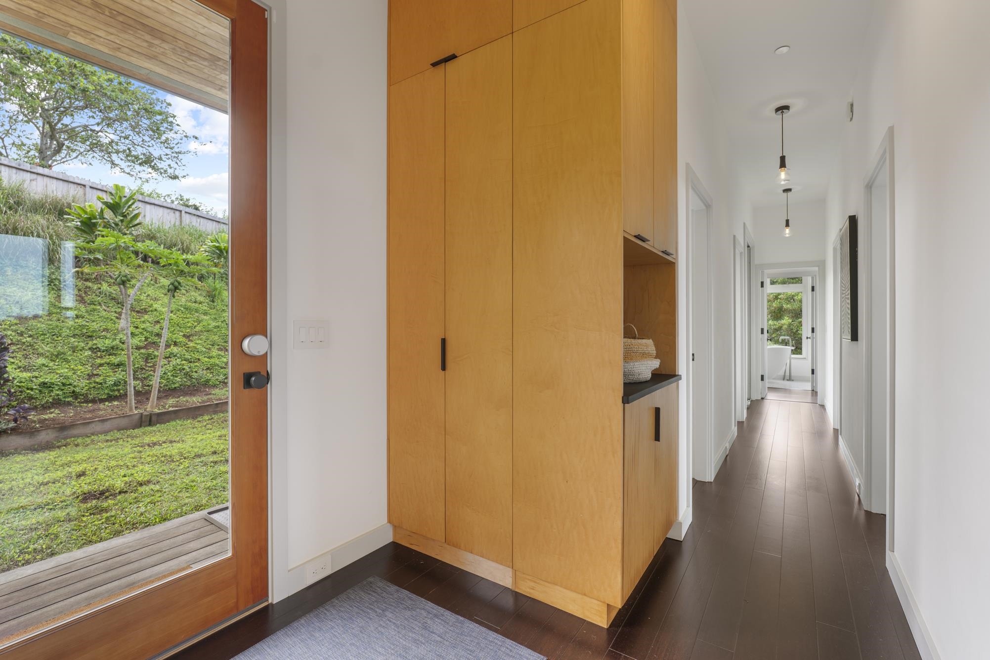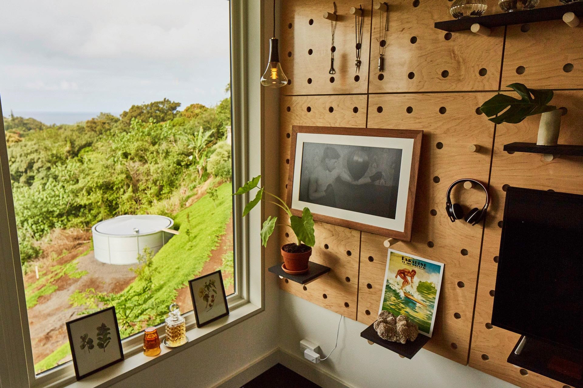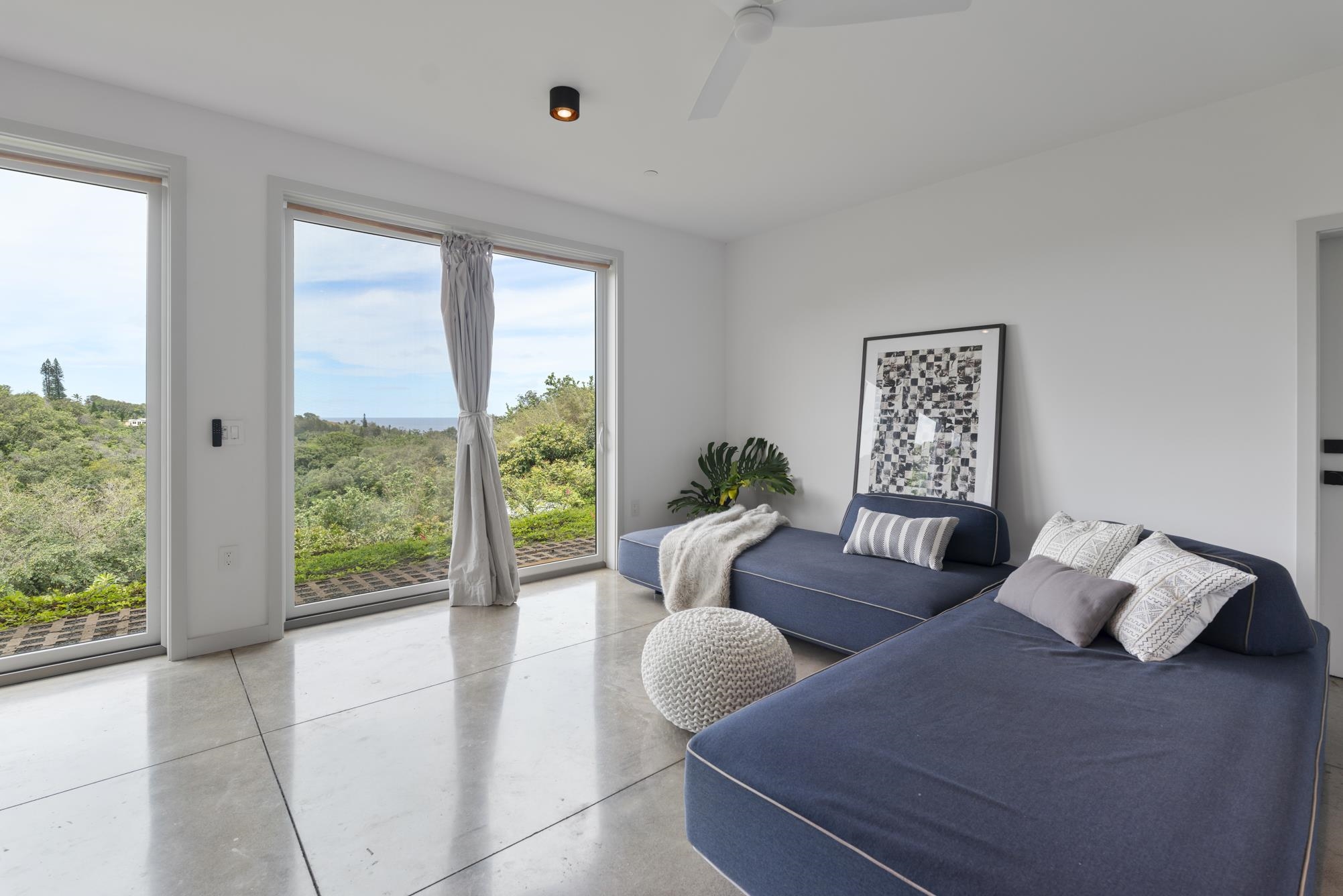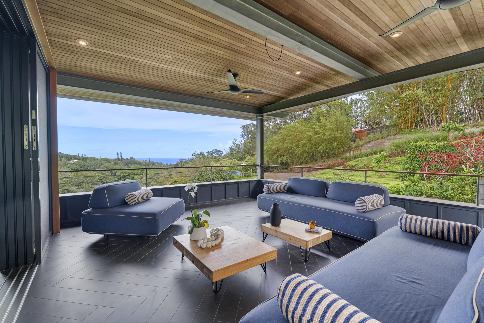 A private 2.2-acre compound in Haiku with expansive forested outlooks, ocean and mountain views. Accessed via a long driveway off a cul-de-sac and set behind an electric gate, the property offers a strong sense of arrival and privacy. The total covered space spans approximately 2,750 square feet. The main residence offers 1,008 square feet of living space with four bedrooms, three bathrooms, and open living areas. Three of the four bedrooms feature transforming furniture systems that convert seamlessly between sleeping, working, and living configurations. An approximately 400-square-foot covered lanai connects directly to the interior via a large-format sliding door system that fully opens the kitchen to the outdoor space, allowing the two areas to function as one. The additional 1,344-square-foot ground floor provides flexible garage/workshop/office, or studio space. Originally designed by Graham Hill (TreeHugger, LifeEdited), whose work on efficient living has been widely viewed through a TED Talk and featured in The New York Times, HGTV, and other media, the property was built as a high-functioning, real-world home combining modern design, flexible living, and independent infrastructure. The layout functions as a small compound, supporting privacy, guests, multi-generational living, and multiple home offices. Spaces are arranged from public to private, with sound-attenuating construction throughout, including double-layer drywall with acoustic damping compound and a suspended floating ceiling below the main living level, allowing areas to be fully closed off for privacy and quiet. Designed for airflow, durability, and comfort, with natural cross-ventilation and passive design, large six-foot overhangs for shade and weather protection, high ceilings, large picture windows, dual Kohler soaking tubs, and Ipe decking and railings. The home remains consistently dry and well-ventilated, aided by its siting, airflow, and rainscreen-style siding system with an air gap behind. The home operates on a high-capacity off-grid system designed for daily reliability and resilience: 14 kW solar array (36 panels), 48 kWh Blue Ion battery storage, Level 2 EV charger, and solar thermal hot water. Water is supplied by a 20,000-gallon catchment system with double-barrel filtration and UV treatment, plus a county water connection via shared meter. High-speed Starlink internet supports full-time remote work. The 2.2-acre parcel features strong sun exposure, consistent airflow, ample parking for 10+ vehicles, and approximately 40 fruit trees, many actively fruiting, including papaya, mango, avocado, banana, lychee, jackfruit, breadfruit, star fruit, longan, soursop, jaboticaba, and grumichama. Raised garden beds complement the orchard. Additional features include a lower terrace with campfire area, an outdoor shower with forest views, and infrastructure in place for a future approximately 200-square-foot agricultural office or accessory building, including foundation, I-beam, and footing - architectural plans included. A tiny house is currently parked on site and offered separately. Despite its private, tucked-away setting - with expansive greenery, ocean and mountain views, and a strong sense of being removed from it all - the property remains highly accessible: just 2 minutes to Baked on Maui café, bakery, small grocery, and hardware store; 6 minutes to Haiku Marketplace with grocery, gym, restaurants, and shops; 9 minutes to Ho'okipa Beach, known for world-class surf and sea turtles; 12 minutes to a network of North Shore waterfalls; and approximately 23 minutes to Kahului Airport and town amenities. The property is part of a two-unit CPR on agricultural land.