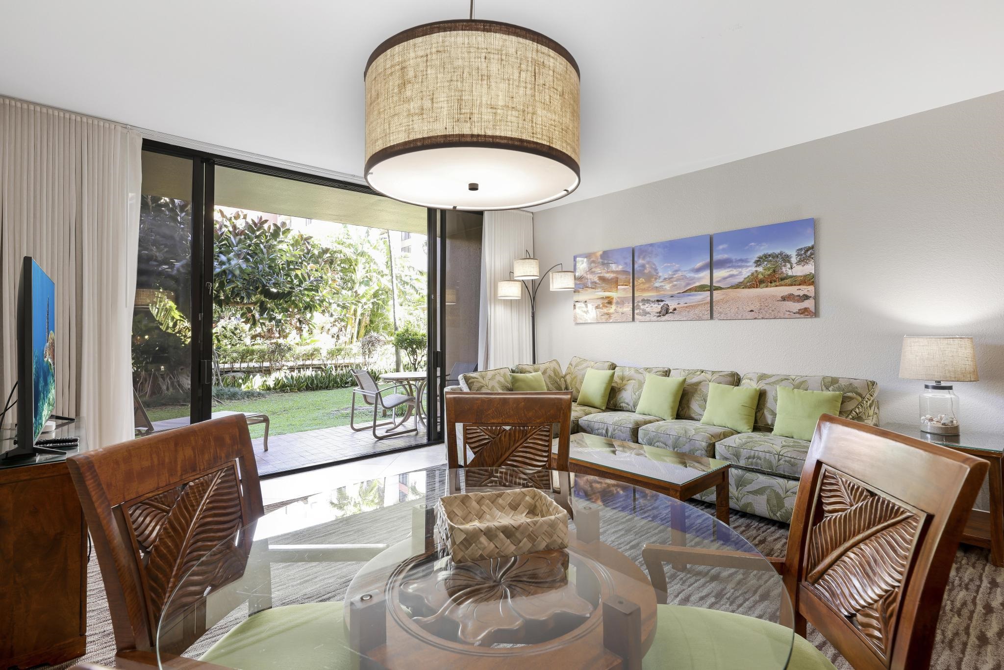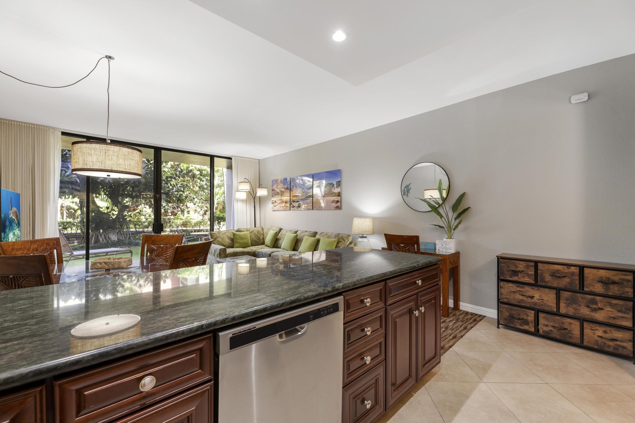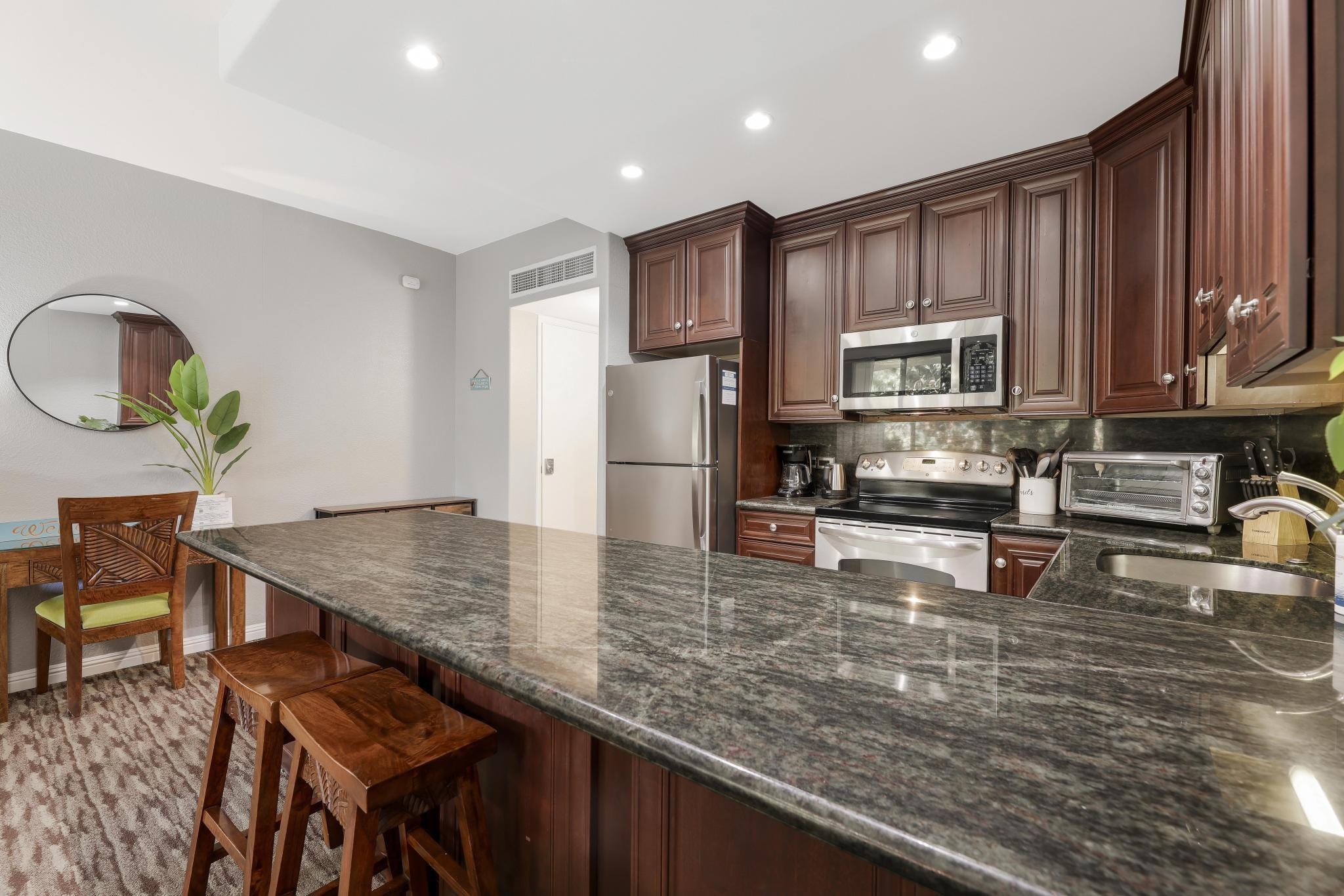 Kaanapali Shores 144 — Hotel Zone Property. Highly desirable ground-floor unit just steps to the pool and ocean–an ideal feature for guests seeking easy access with no elevators or stairs. This prime location enhances rental appeal, offering the convenience and indoor-outdoor flow that vacationers love. Surrounded by lush tropical landscaping, a tranquil stream, and koi ponds, the setting creates an inviting resort experience right outside your lanai. Inside, the unit features 9-foot ceilings and a spacious open layout, along with a well-appointed kitchen with granite countertops, dark wood cabinetry, and stainless-steel appliances. Central air conditioning, in-unit washer and dryer, and turnkey tropical furnishings make it ready for immediate rental or personal use. Kaanapali Shores is a beachfront resort offering strong guest demand, with amenities including a restaurant, fitness center, pools, sundry store, and gift shops. Owners may participate in a short-term rental program, providing excellent income potential and flexibility. Convenient ground-level access from parking and a location close to beaches, shopping, dining, and nightlife further enhance its desirability for visitors. This is a leasehold unit.”