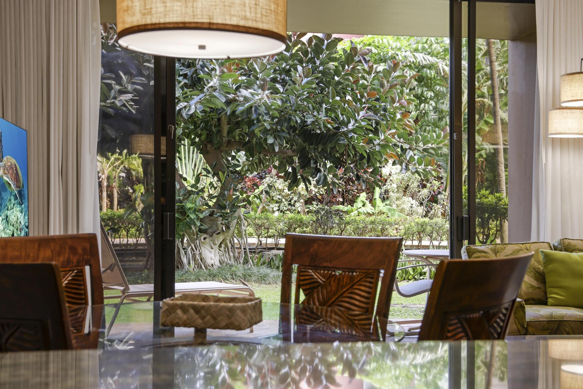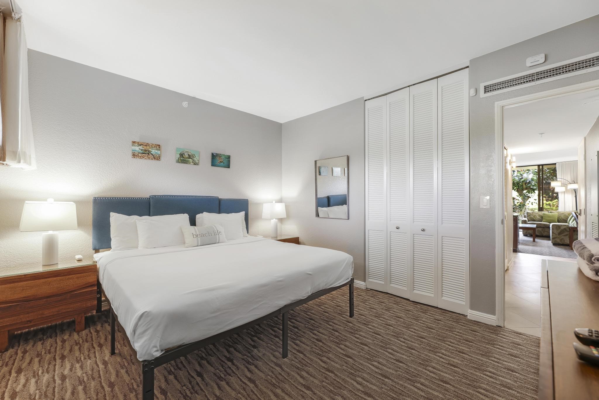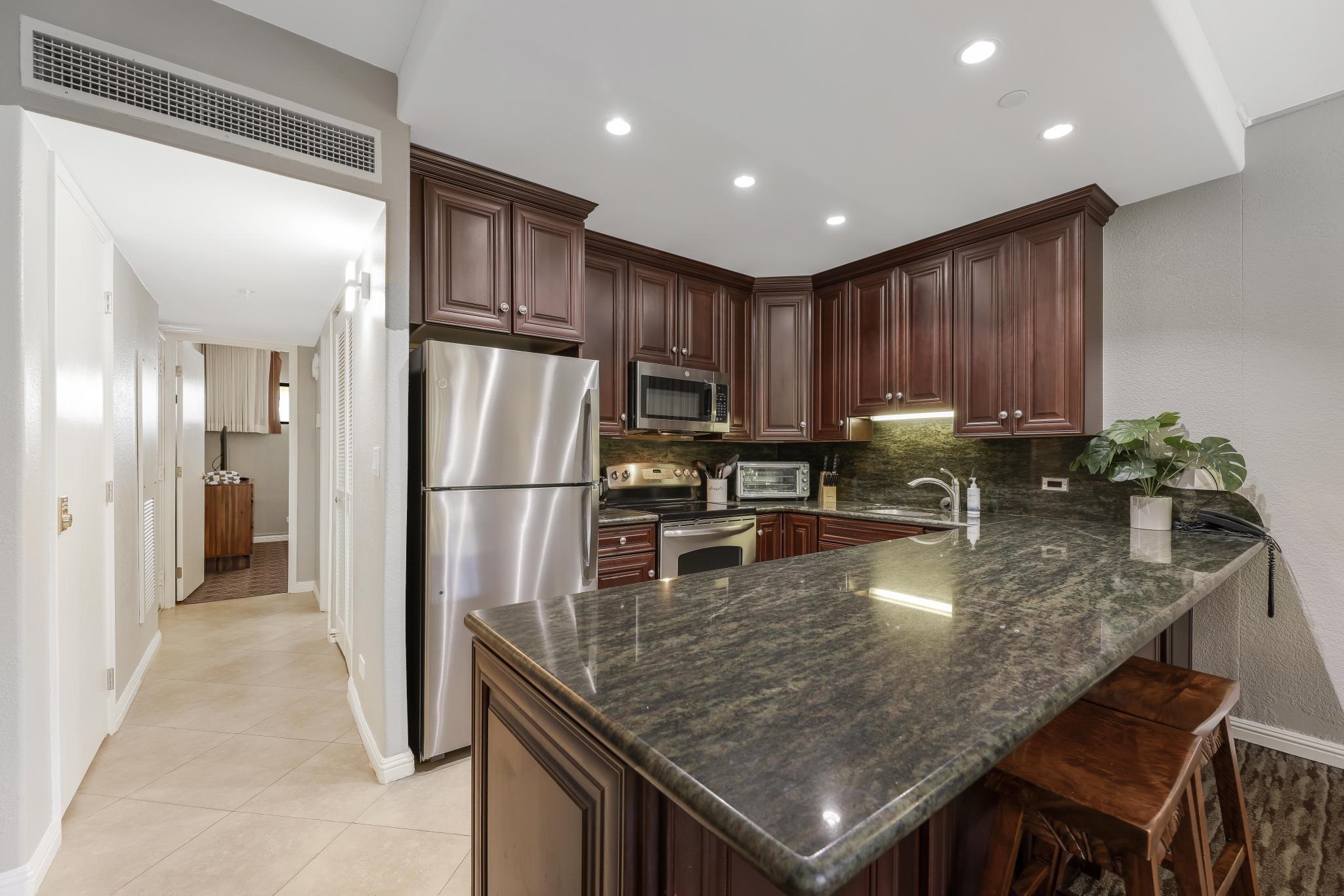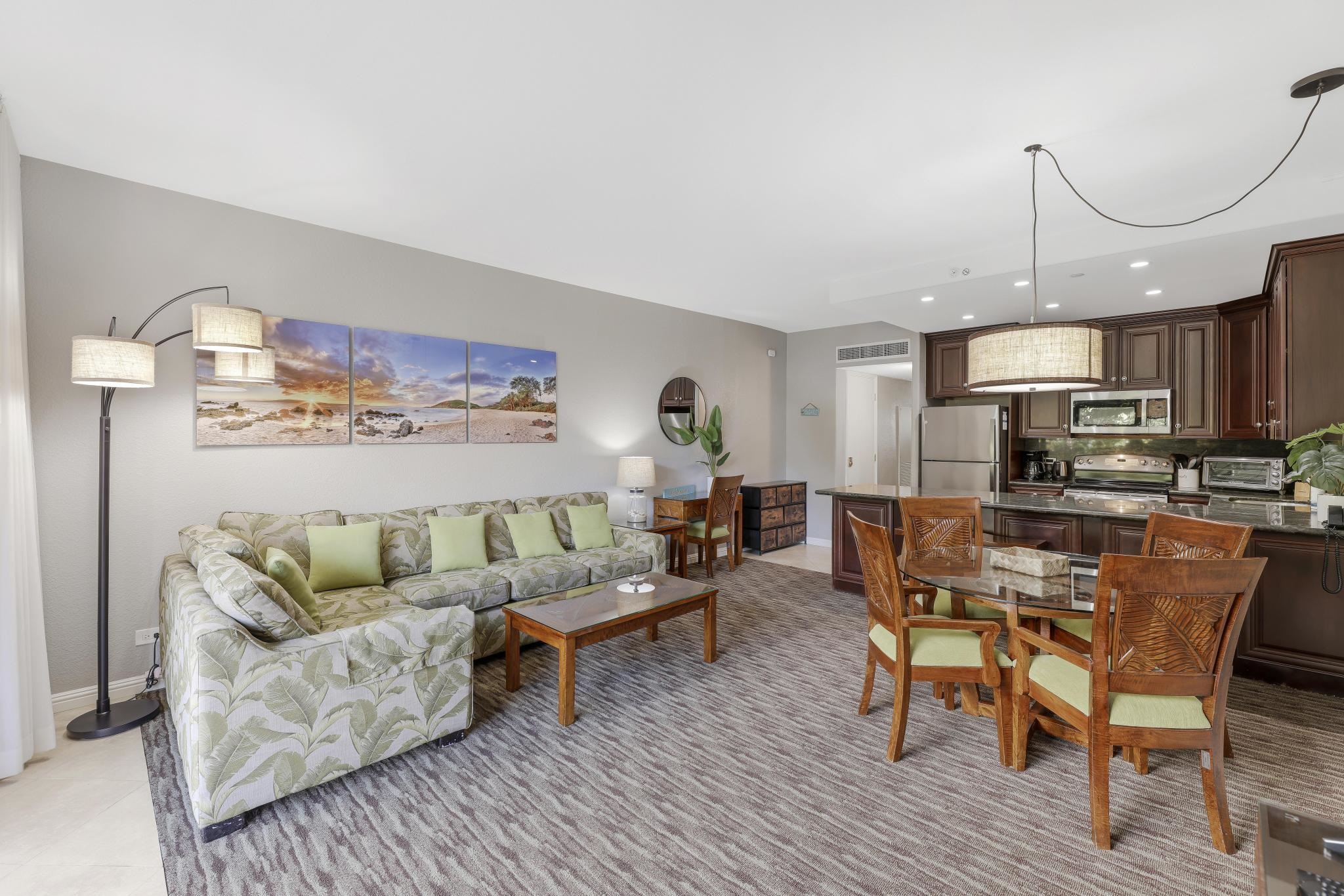 Kaanapali Shores 144 — Hotel Zone Property. Highly desirable ground-floor unit just steps to the pool and ocean–an ideal feature for guests seeking easy access with no elevators or stairs. This prime location enhances rental appeal, offering the convenience and indoor-outdoor flow that vacationers love. Surrounded by lush tropical landscaping, a tranquil stream, and koi ponds, the setting creates an inviting resort experience right outside your lanai. Inside, the unit features 9-foot ceilings and a spacious open layout, along with a well-appointed kitchen with granite countertops, dark wood cabinetry, and stainless-steel appliances. Central air conditioning, in-unit washer and dryer, and turnkey tropical furnishings make it ready for immediate rental or personal use. Kaanapali Shores is a beachfront resort offering strong guest demand, with amenities including a restaurant, fitness center, pools, sundry store, and gift shops. Owners may participate in a short-term rental program, providing excellent income potential and flexibility. Convenient ground-level access from parking and a location close to beaches, shopping, dining, and nightlife further enhance its desirability for visitors. This is a leasehold unit.”