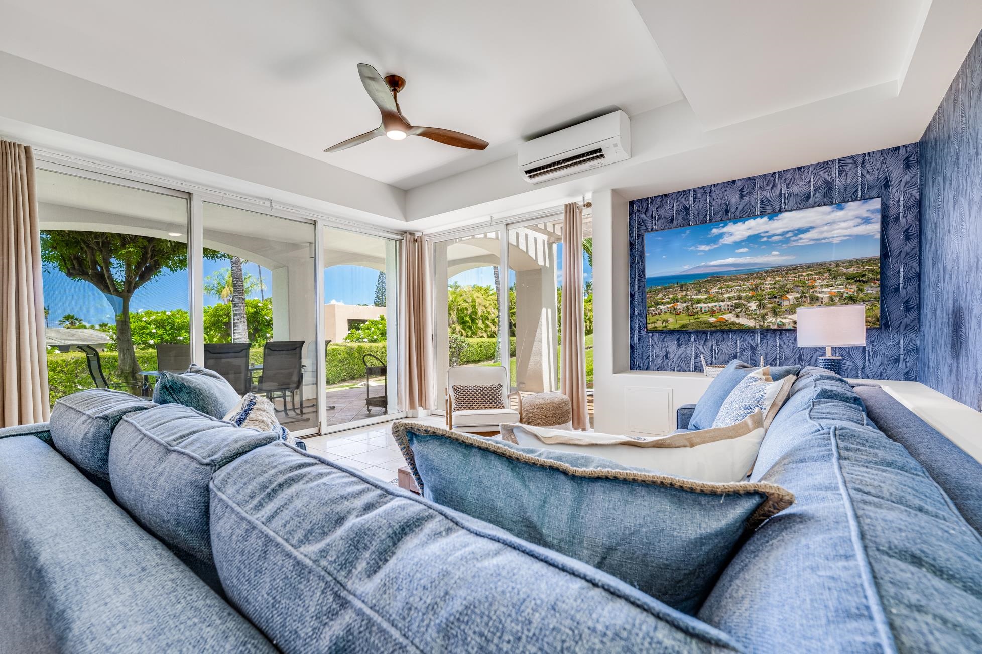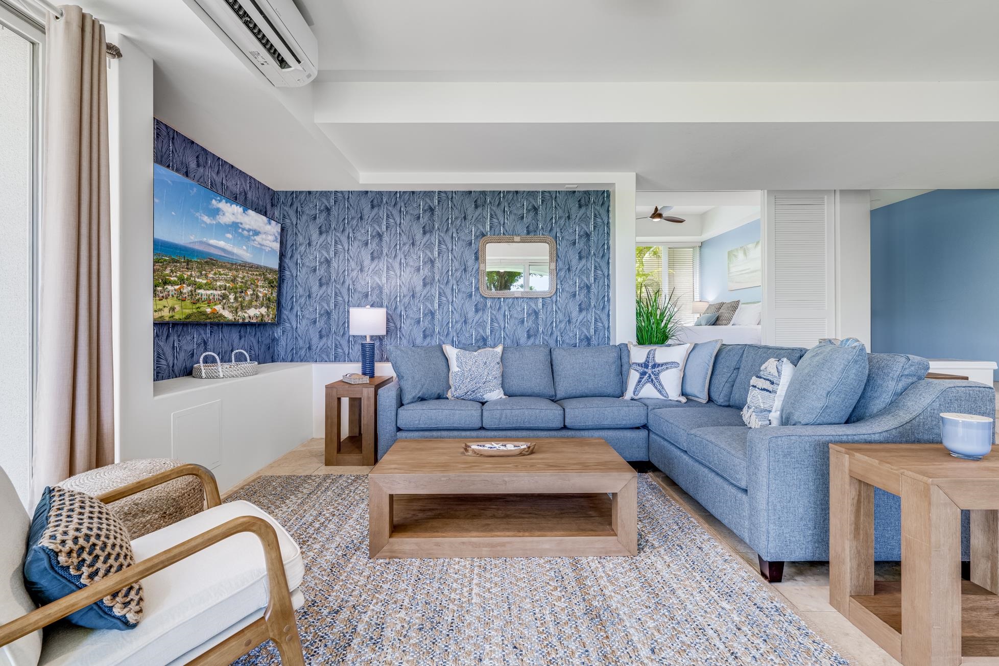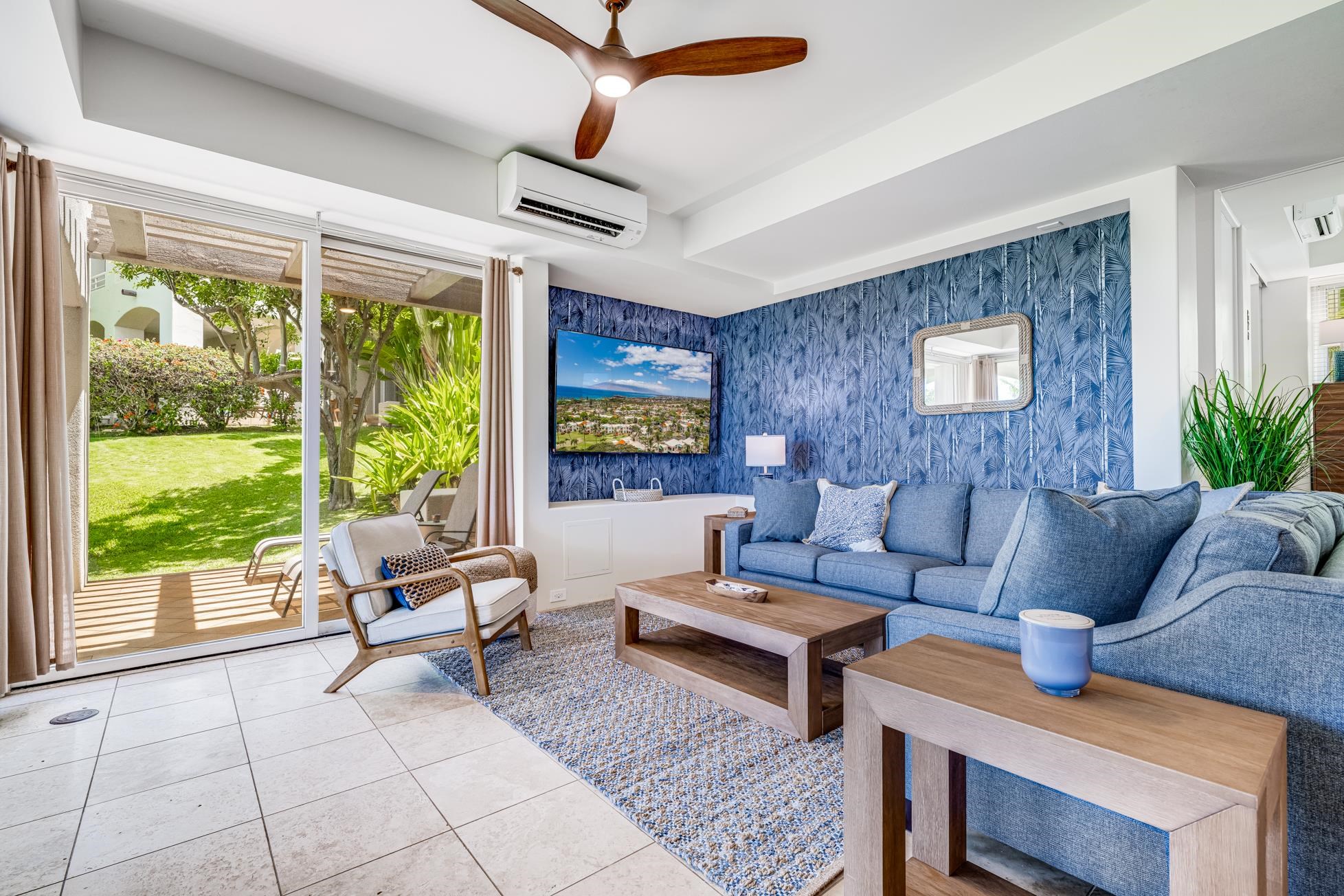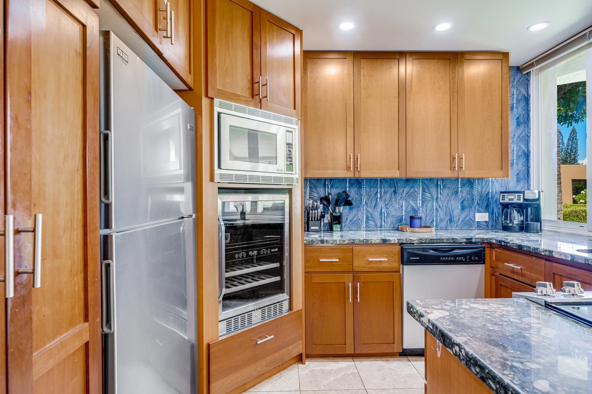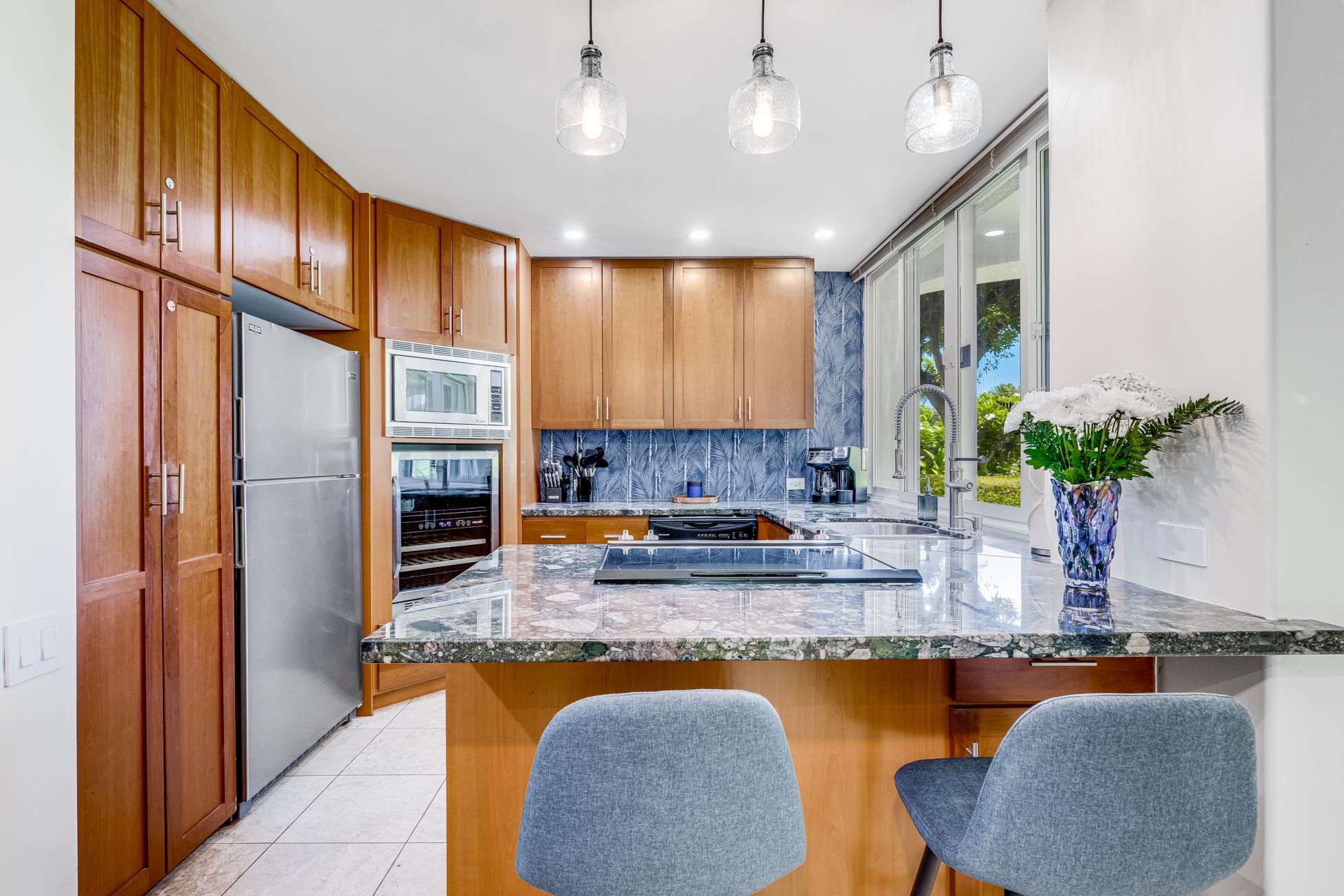 Welcome to Palms at Wailea 2105, a freshly re-imagined 2024 renovation that offers a modern, fully furnished 2-bedroom, 2-bath retreat in one of South Maui's most sought-after communities. This turn-key condo captures the essence of island living while delivering the proven performance of a top-producing vacation rental, making it an ideal choice for investors or owners ready to enjoy the island lifestyle from day one. The interior shines with crisp, fresh paint and designer wallpapers that set an elegant, relaxed tone throughout the open-plan living area. Spa-inspired bathrooms feature sleek tile work, quartz accents and luxury-grade fixtures, while the upgraded kitchen boasts contemporary hardware, polished countertops and newer appliances; a convenient pass-through window allows seamless service to the expansive covered lanai. Tile flooring flows from the living room to the dining space, and a three-zone split-system air-conditioning system provides year-round comfort in every room. A wall-of-glass sliding door opens to a generous lanai framed by a manicured lawn, creating an indoor-outdoor flow that is perfect for sunrise coffee, alfresco dining or evening cocktails under the stars. Brand-new, beach-inspired furniture and a complete inventory mean the home is ready for immediate relaxation or rental. Residents enjoy resort-style amenities including a Mediterranean-styled pool with ocean views, a spa, BBQ area and lush tropical landscaping, all set on a quiet dead-end cul-de-sac. The location offers easy access to Wailea's world-class beaches, championship golf courses, upscale shopping, fine dining and the vibrant South Maui lifestyle. This rare blend of modern luxury, effortless indoor-outdoor living and high rental demand makes 2105 a standout opportunity in Wailea's vibrant vacation-rental market. Schedule your private showing today and experience why this slice of paradise is the perfect combination of style, comfort and investment potential.