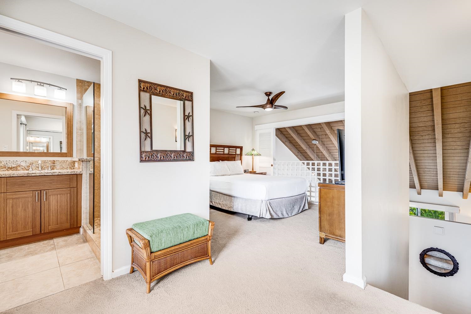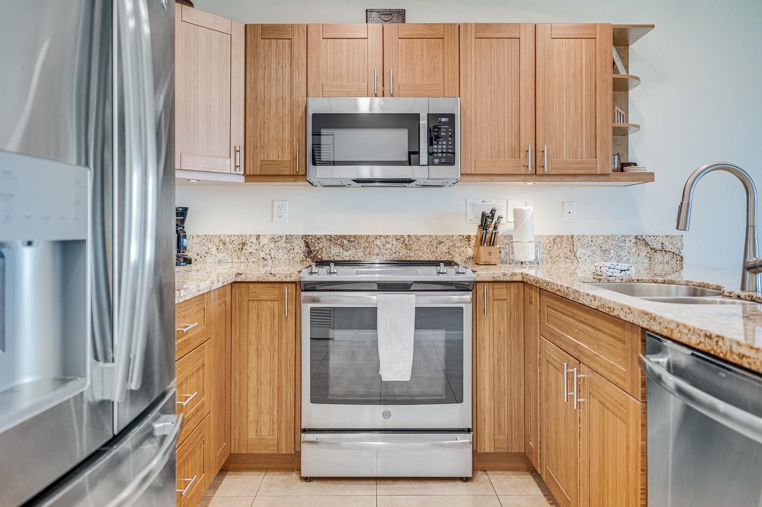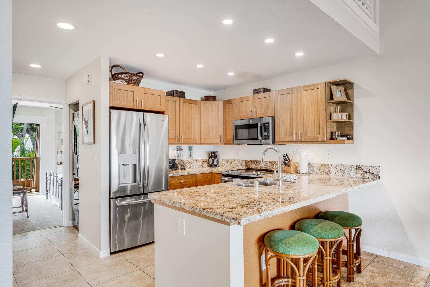Unit J214 at Maui Kamaole is a two-bedroom, two-bath ocean-view condo that received a tasteful remodel in late 2018, with standout upgrades in the kitchen and both bathrooms featuring granite countertops, bamboo cabinetry, stainless appliances, and a beautifully tiled rain shower with a glass partition. The tropical-meets-modern furnishings create a warm, residential feel that makes it easy to arrive and immediately feel at home, whether you are here for a few weeks or a few months. The open main-floor living area flows out to a lanai with sweeping views of the Pacific and the West Maui Mountains, perfect for morning coffee or watching the evening sky change colors over the water. Air conditioning keeps things comfortable year-round, and the upstairs loft bedroom offers a private retreat with sliding doors and its own en-suite bath, while the second bedroom on the main level is ideal for family or friends making the trip out to visit. Maui Kamaole is one of Kihei's most desirable low-rise complexes, set on a hillside directly across from Kamaole Beach Park III, with two pools (one sand-bottom), two spas, gas grills, tennis courts, and lush tropical landscaping across more than 23 acres. With world-class beaches steps away, great dining nearby, and the relaxed rhythm of South Maui as your backdrop, this is island living at its most accessible.