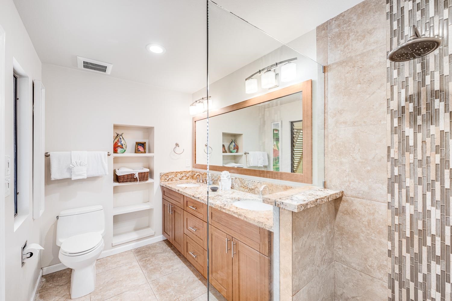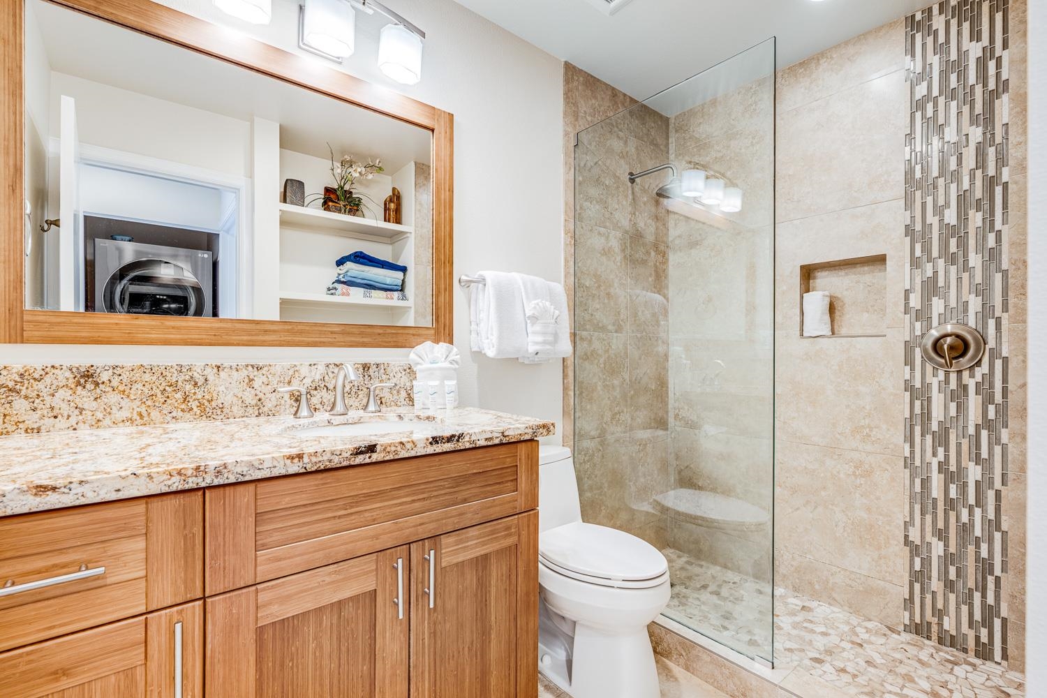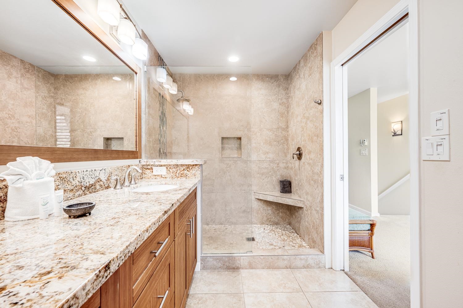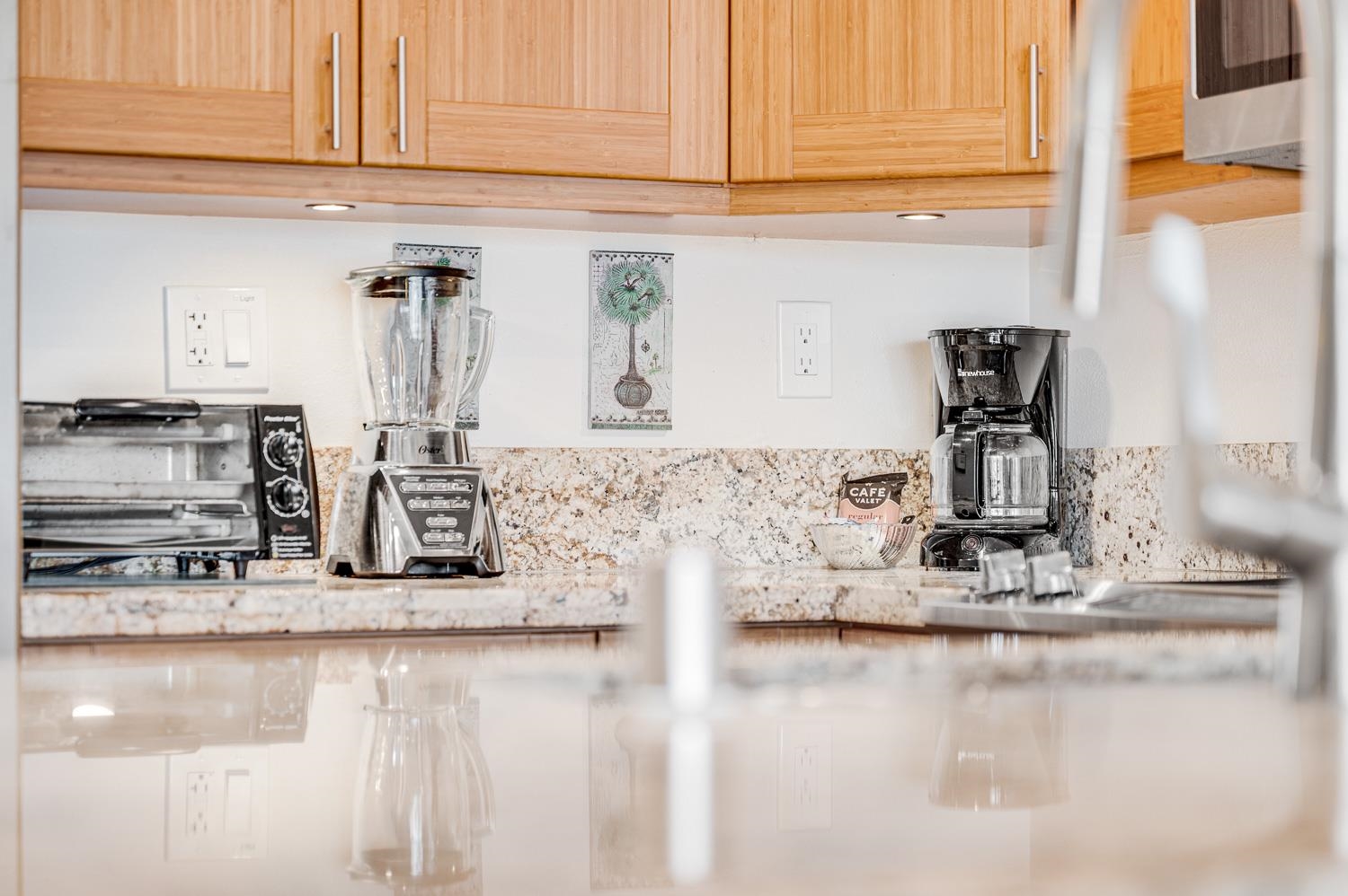 Unit J214 at Maui Kamaole is a two-bedroom, two-bath ocean-view condo that received a tasteful remodel in late 2018, with standout upgrades in the kitchen and both bathrooms featuring granite countertops, bamboo cabinetry, stainless appliances, and a beautifully tiled rain shower with a glass partition. The tropical-meets-modern furnishings create a warm, residential feel that makes it easy to arrive and immediately feel at home, whether you are here for a few weeks or a few months. The open main-floor living area flows out to a lanai with sweeping views of the Pacific and the West Maui Mountains, perfect for morning coffee or watching the evening sky change colors over the water. Air conditioning keeps things comfortable year-round, and the upstairs loft bedroom offers a private retreat with sliding doors and its own en-suite bath, while the second bedroom on the main level is ideal for family or friends making the trip out to visit. Maui Kamaole is one of Kihei's most desirable low-rise complexes, set on a hillside directly across from Kamaole Beach Park III, with two pools (one sand-bottom), two spas, gas grills, tennis courts, and lush tropical landscaping across more than 23 acres. With world-class beaches steps away, great dining nearby, and the relaxed rhythm of South Maui as your backdrop, this is island living at its most accessible.