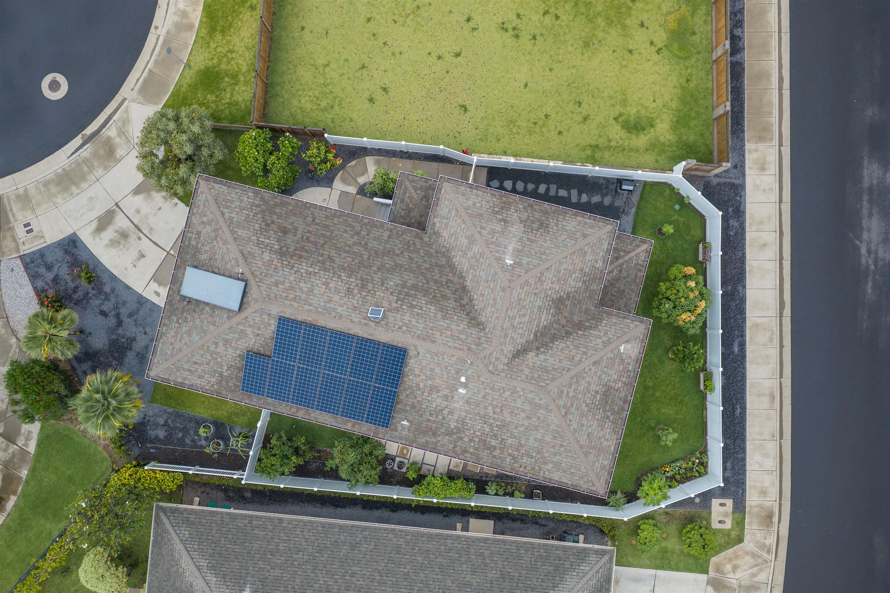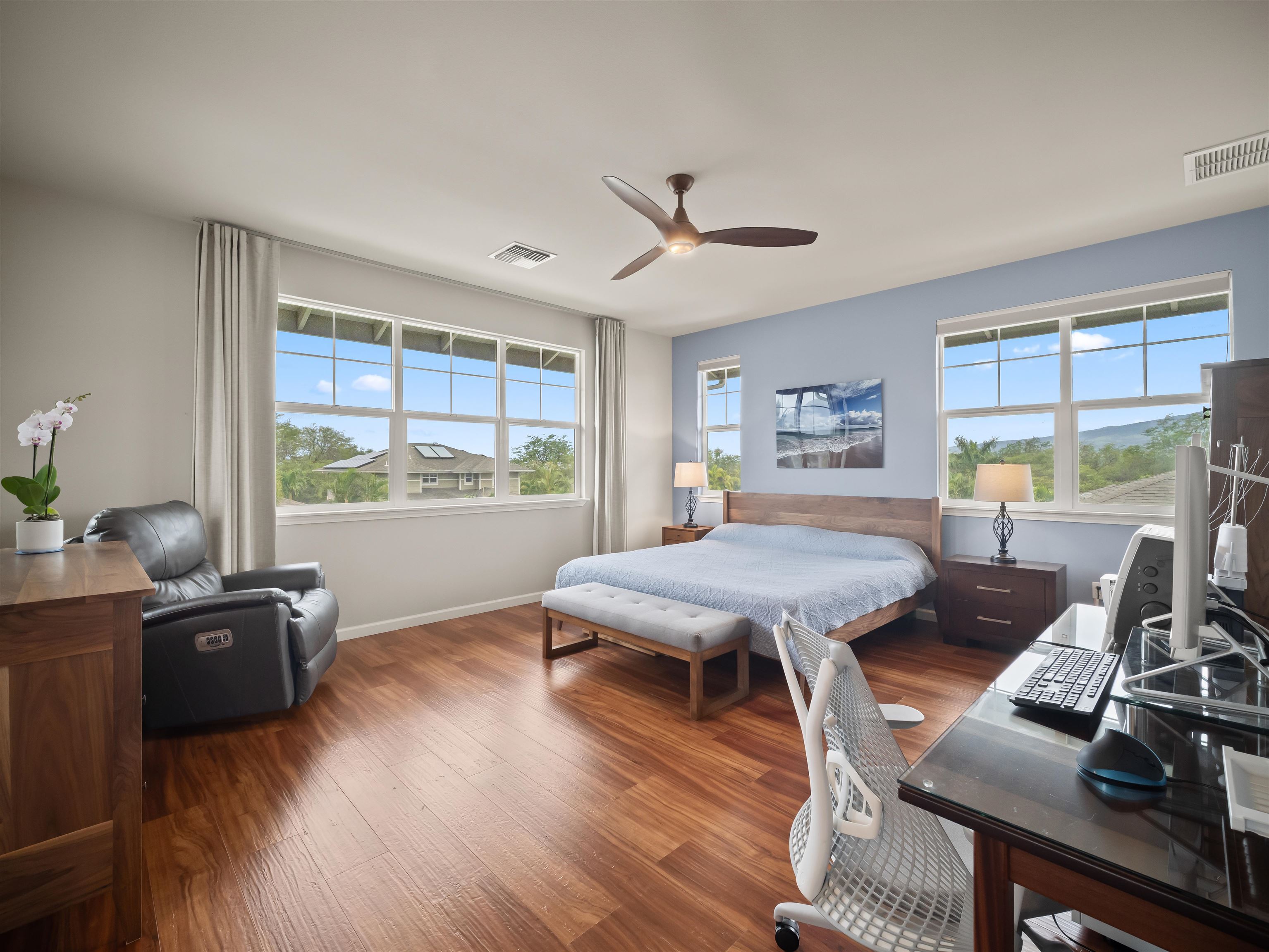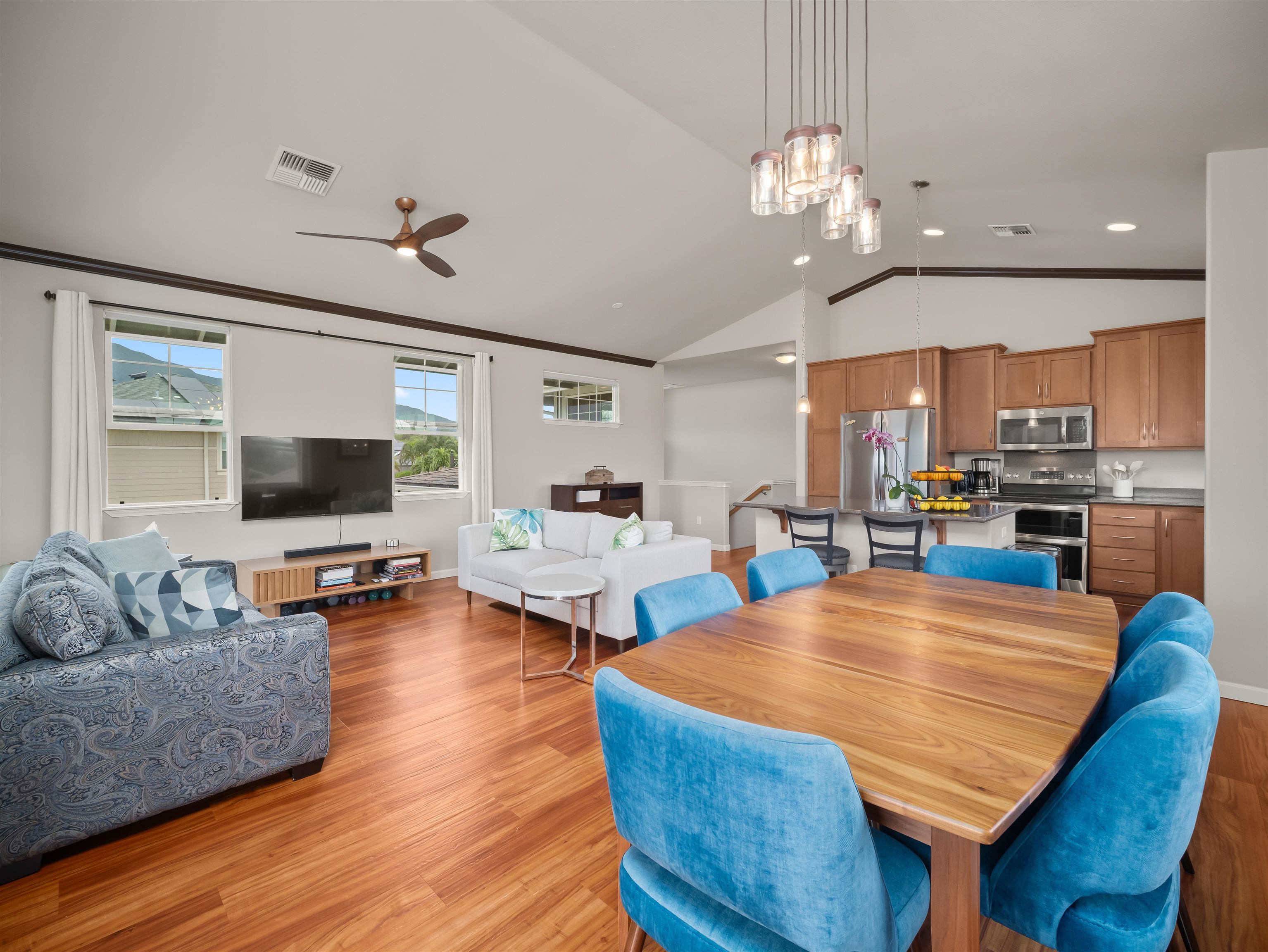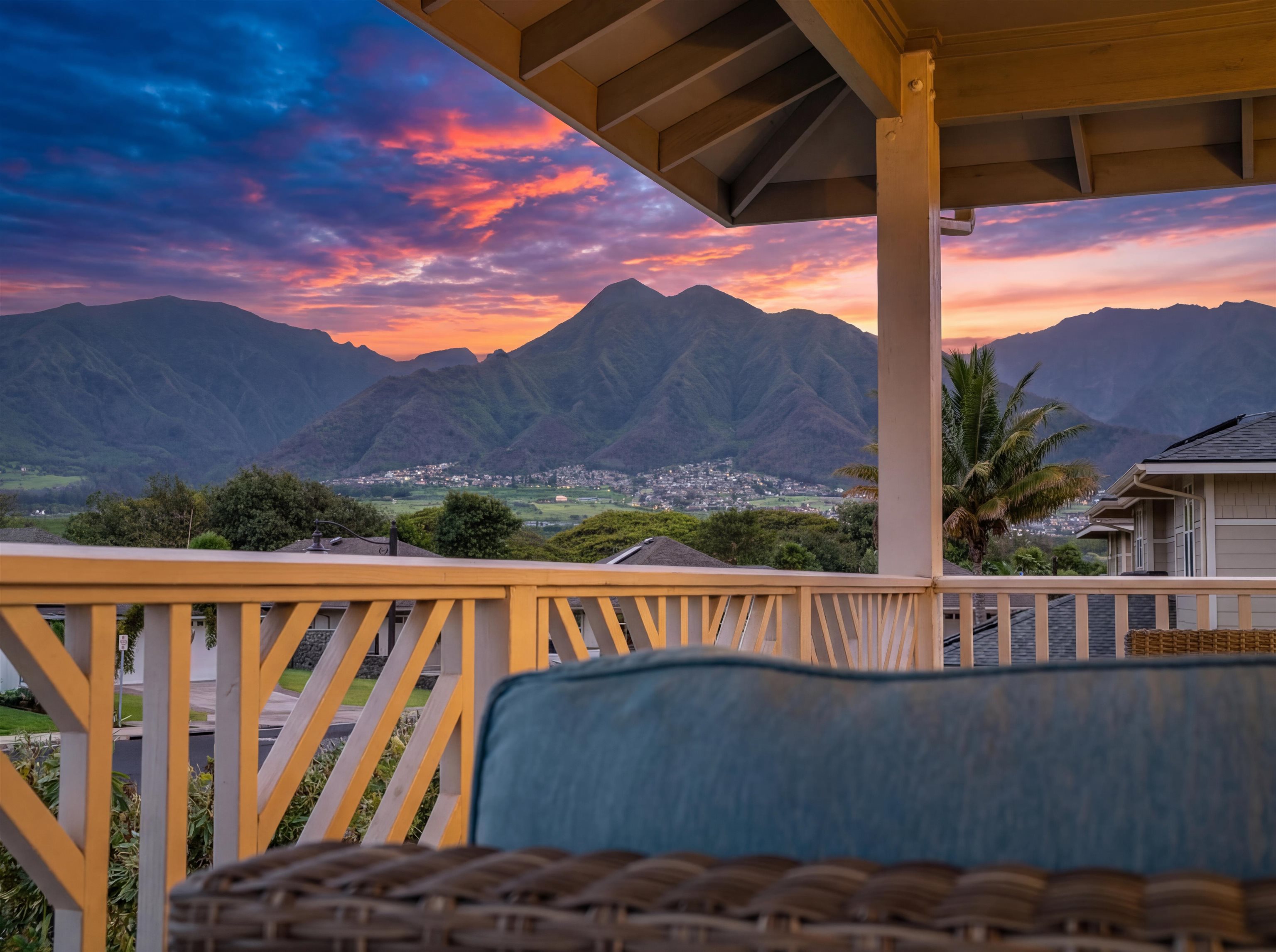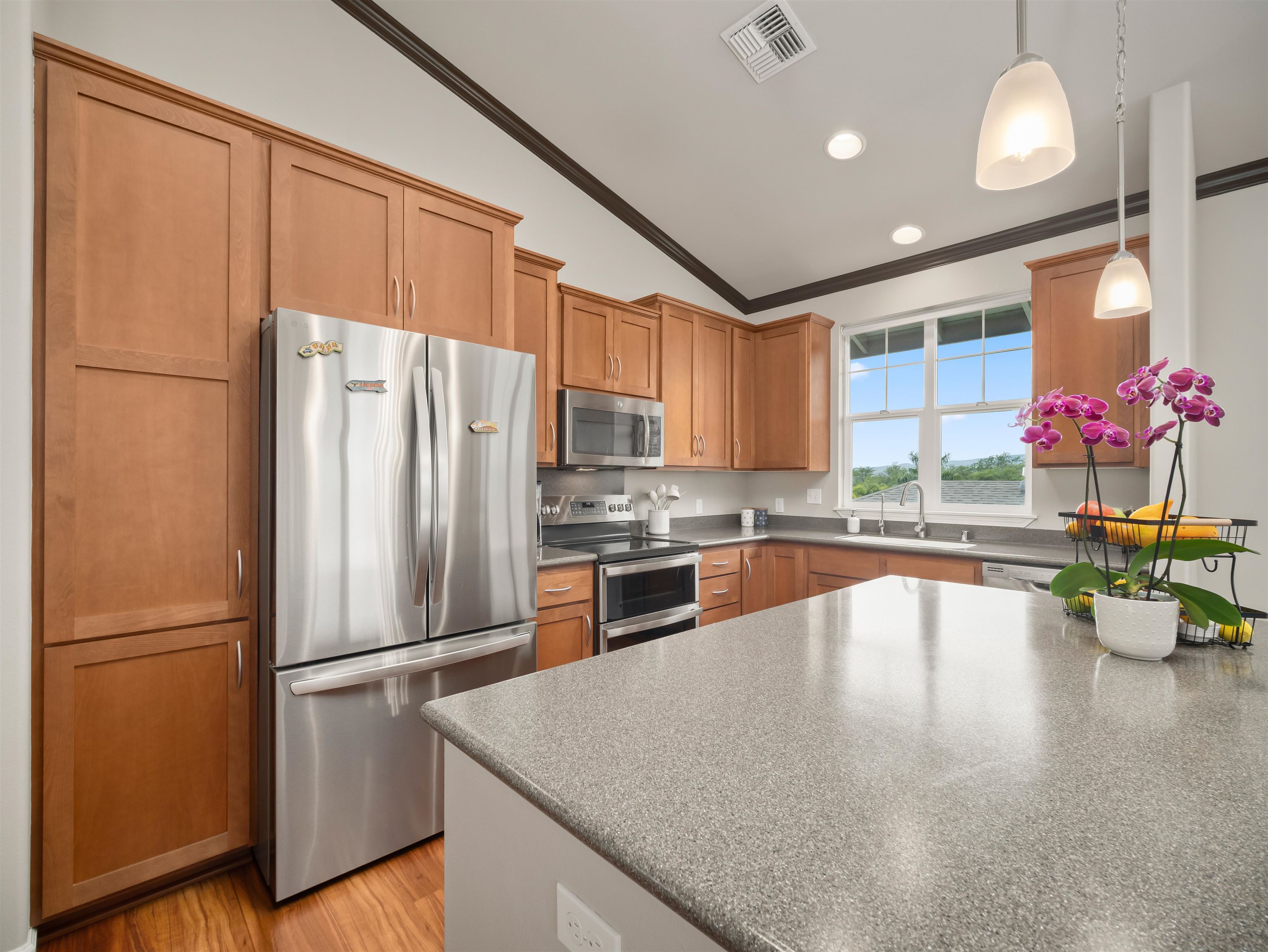 WELCOME HOME to one of the finest offerings in The Parkways at Maui Lani–this former model home has been extensively upgraded, meticulously maintained, and is truly move-in ready. Ideally situated along the lush Dunes at Maui Lani Golf Course, this highly desirable Manele Plan 6 offers a spacious and versatile layout designed for both comfortable living and effortless entertaining. With over-height ceilings, 8-foot custom doors, and vaulted ceilings in the great room and kitchen, the home feels bright, open, and inviting. A large covered lanai seamlessly extends your living space outdoors–perfect for enjoying Maui’s year-round climate. This thoughtfully designed home features multiple living areas, including a separate family room, providing flexibility for extended family, guests, or work-from-home needs. Since its time as the developer’s model home, the property has been significantly enhanced with high-quality upgrades and improvements, including: - Owned photovoltaic system (11 panels) with Tesla battery — dramatically reducing electric costs - Daikin 2-zone central AC + additional split systems for efficient, customized cooling - Hybrid heat pump water heater (energy efficient and helps cool the garage) - New luxury vinyl plank flooring throughout lower level - Extensive interior repainting and updated lighting, fixtures, and smart switches - Upgraded appliances, including new refrigerator, stove (2025), washer/dryer (2022), double oven (2025) and reverse osmosis water filtration system - New windows (2024) replaced under warranty for improved clarity and efficiency The exterior and grounds have been equally improved, creating a private, low-maintenance oasis: - Vinyl fencing, retaining walls, and fully upgraded drainage system - Lush yet water-conscious landscaping with mature fruit trees (avocado, mango, citrus, papaya, lilikoi) and organic garden beds - Automated irrigation and French drains - New gutters, front steps, and outdoor shade system for added comfort and functionality This beautiful cul-de-sac home with amazing Haleakala and West Maui mountain views in the heart of the Maui Lani Master Planned Community, you are just minutes from schools, shopping, dining, medical facilities, and more. This is a rare opportunity to own a highly upgraded, energy-efficient, and beautifully maintained home in one of Central Maui’s most sought-after communities–perfect for owner-occupants, second-home buyers, or anyone seeking quality, convenience, and value. Quick closing possible–this home is truly ready to enjoy from day one.