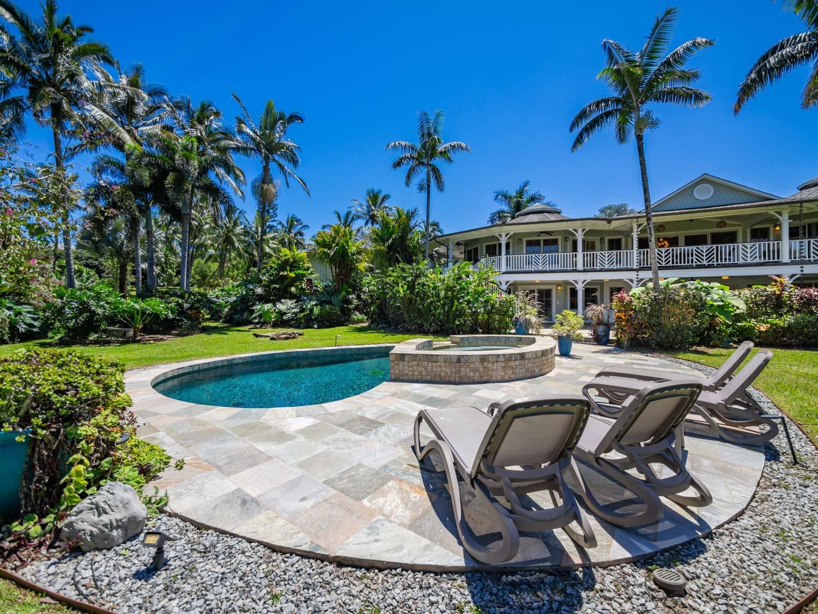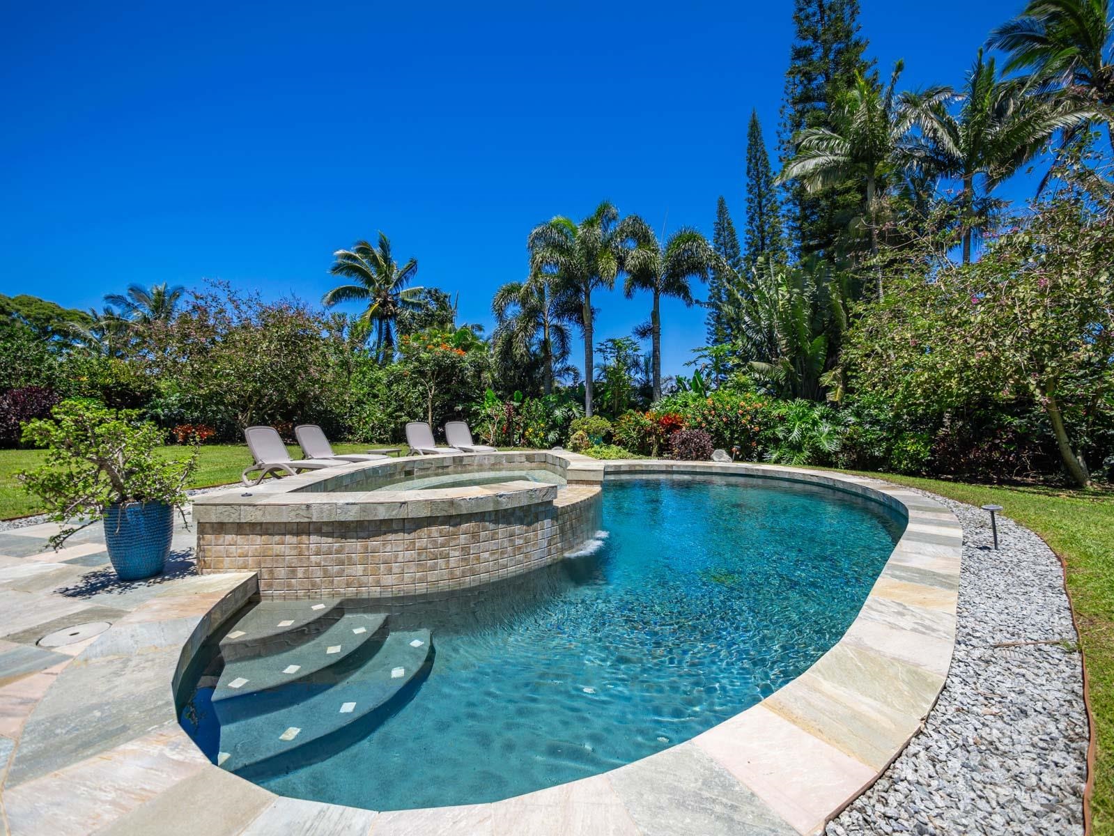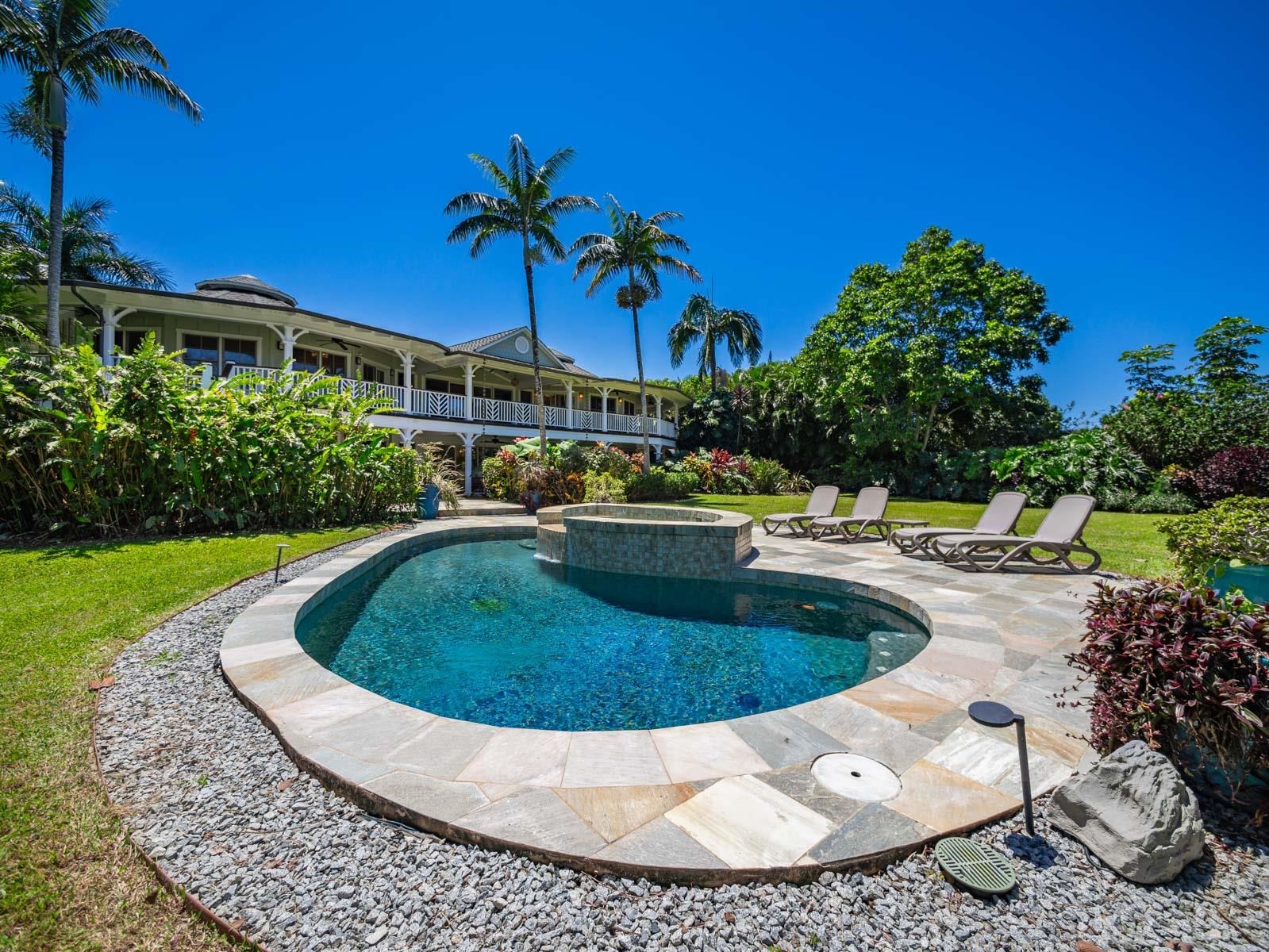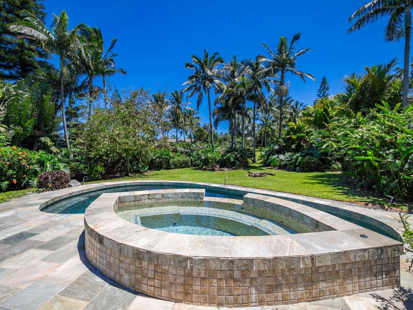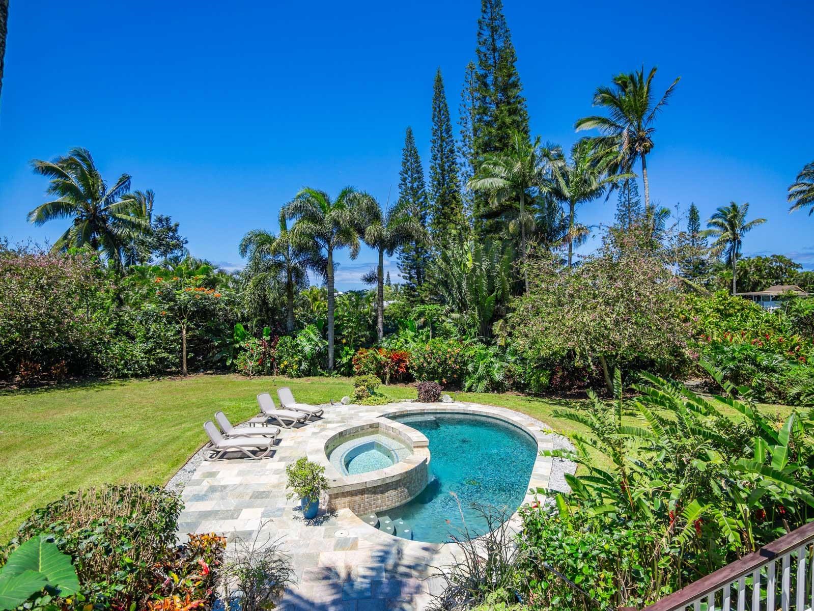 Situated on two privately fenced and gated acres in Haiku, Holokai Hale is a North Shore estate designed for indoor-outdoor living. More than 1,600 square feet of covered space includes lanais, walkways, and multiple areas to relax. Plumeria and puakenikeni line the grounds, with partial ocean views through the canopy. The home offers five bedrooms, six bathrooms, and over 5,000 square feet. The main residence centers on a chef’s kitchen with a large island, butler’s pantry, and direct access to covered lanais for dining and entertaining. Interior and exterior spaces connect seamlessly. The grounds include a saline pool and spa, sauna, cold plunge, and established landscaping with raised garden beds, papaya trees, banana and ginger groves, citrus, lei flowers, and a mature soursop tree. You will find vaulted ceilings and Brazilian Tiger wood floors and each bedroom includes an en-suite bathroom with the primary bedrooms Italian White Carrara Marble bathroom and extra large dressing suite. A separate guest suite provides privacy for extended stays. Additional structures include a detached workshop, an air-conditioned studio with its own sink, and a bonus room above the garage which also has a dumbwaiter. The property is supported by a 52-panel photovoltaic system, solar hot water, split air conditioning, and a whole-home backup generator. Holokai Hale is a flexible property suited for a primary residence, extended family living, or a private retreat.