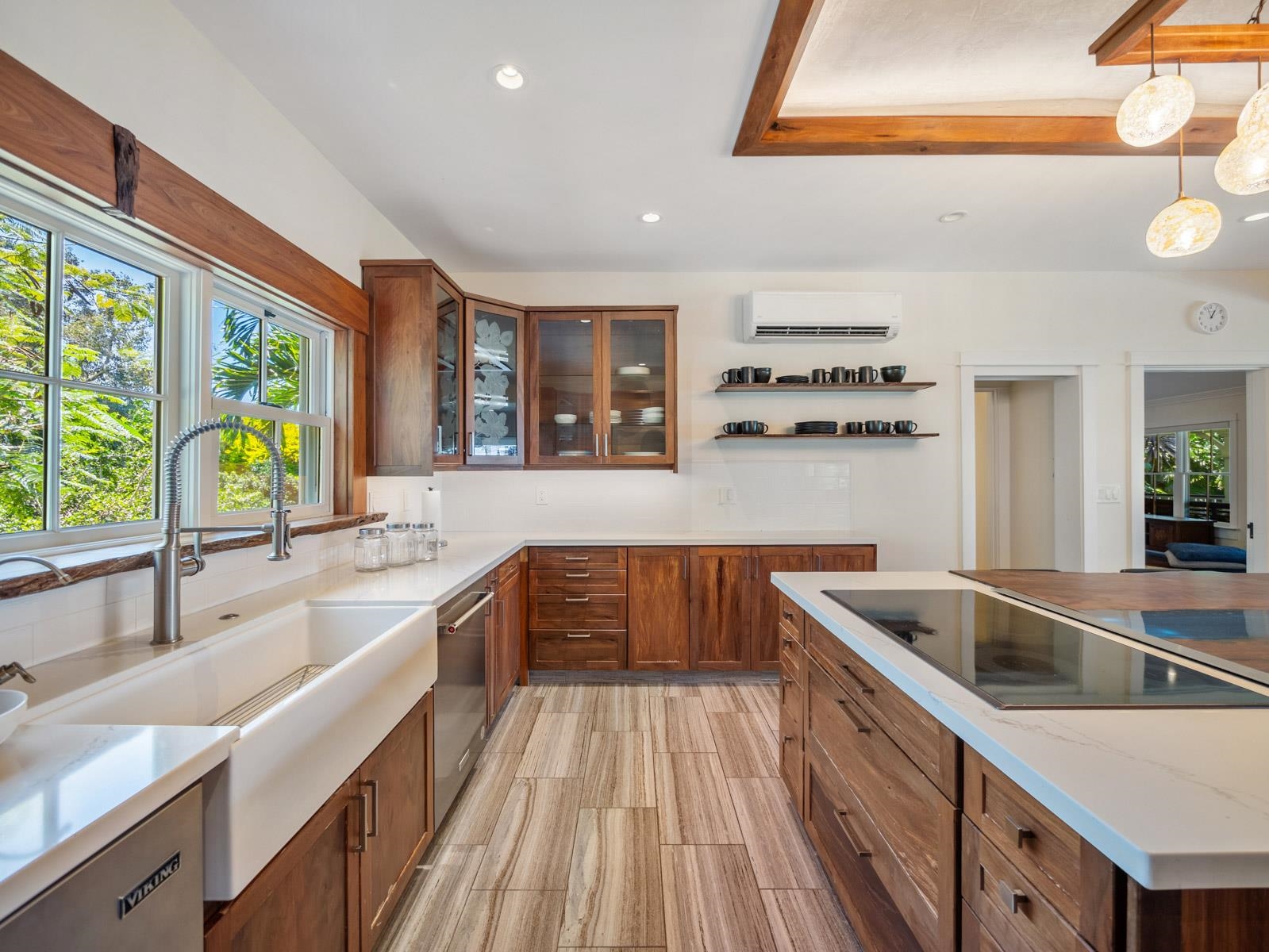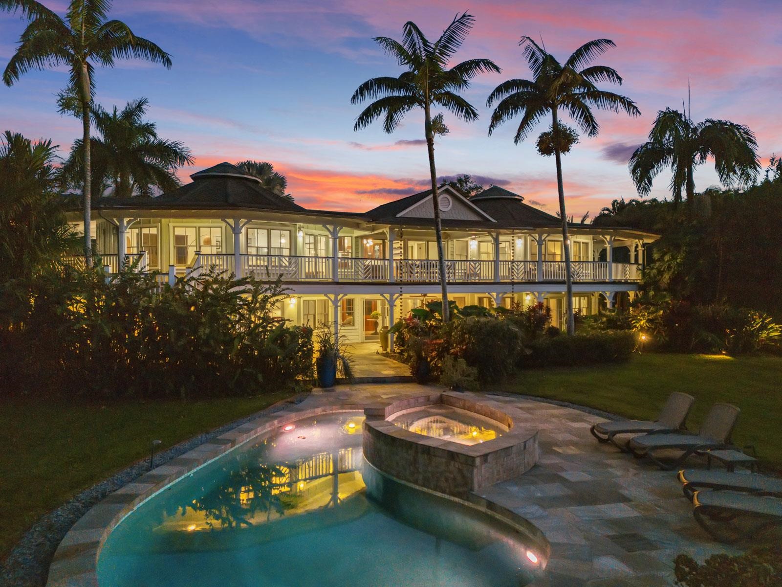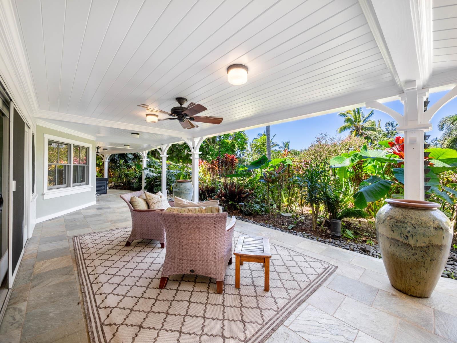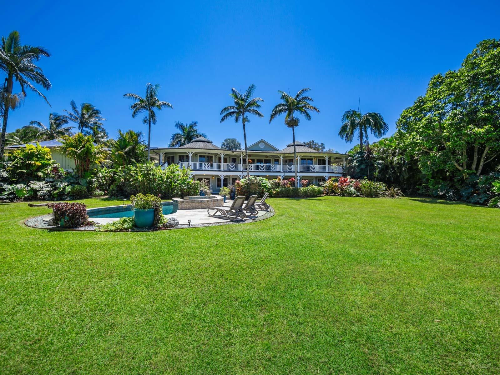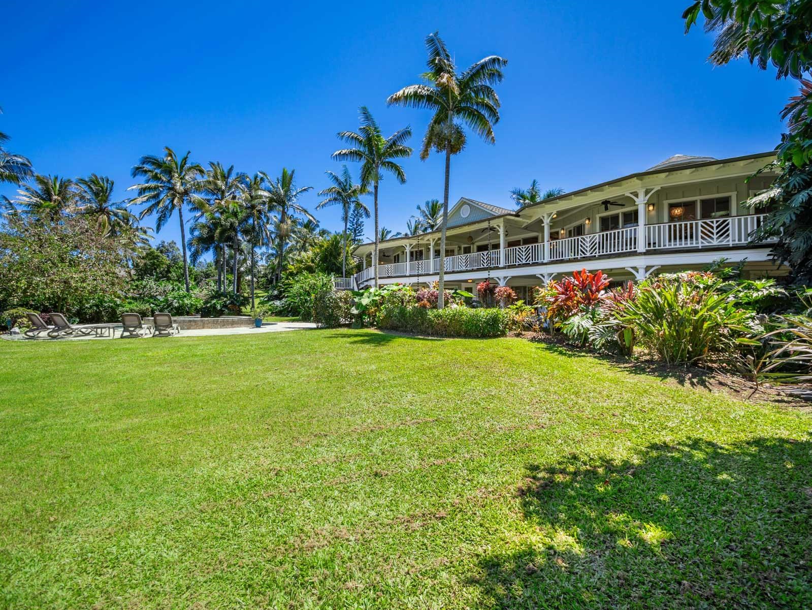 Situated on two privately fenced and gated acres in Haiku, Holokai Hale is a North Shore estate designed for indoor-outdoor living. More than 1,600 square feet of covered space includes lanais, walkways, and multiple areas to relax. Plumeria and puakenikeni line the grounds, with partial ocean views through the canopy. The home offers five bedrooms, six bathrooms, and over 5,000 square feet. The main residence centers on a chef’s kitchen with a large island, butler’s pantry, and direct access to covered lanais for dining and entertaining. Interior and exterior spaces connect seamlessly. The grounds include a saline pool and spa, sauna, cold plunge, and established landscaping with raised garden beds, papaya trees, banana and ginger groves, citrus, lei flowers, and a mature soursop tree. You will find vaulted ceilings and Brazilian Tiger wood floors and each bedroom includes an en-suite bathroom with the primary bedrooms Italian White Carrara Marble bathroom and extra large dressing suite. A separate guest suite provides privacy for extended stays. Additional structures include a detached workshop, an air-conditioned studio with its own sink, and a bonus room above the garage which also has a dumbwaiter. The property is supported by a 52-panel photovoltaic system, solar hot water, split air conditioning, and a whole-home backup generator. Holokai Hale is a flexible property suited for a primary residence, extended family living, or a private retreat.