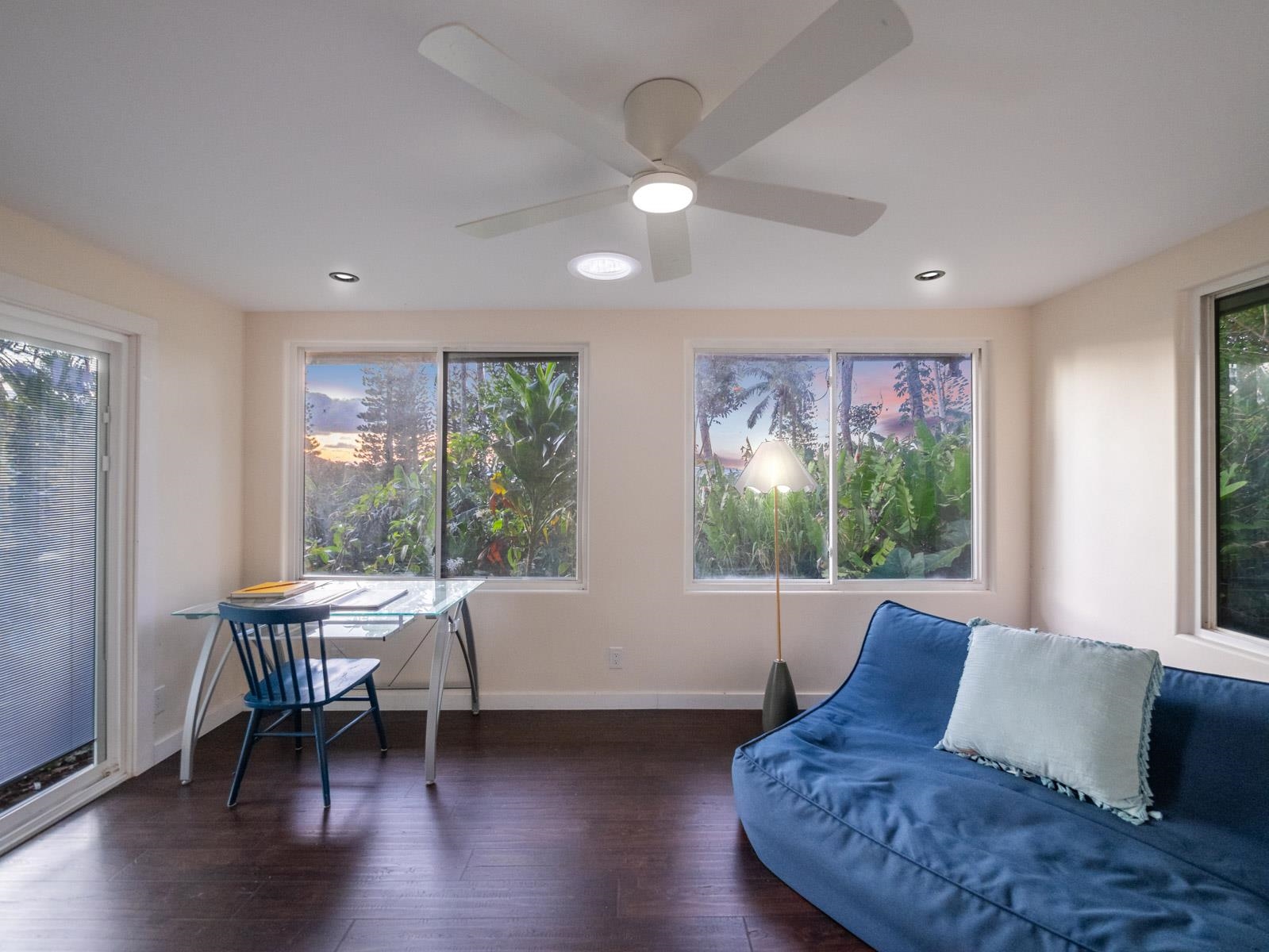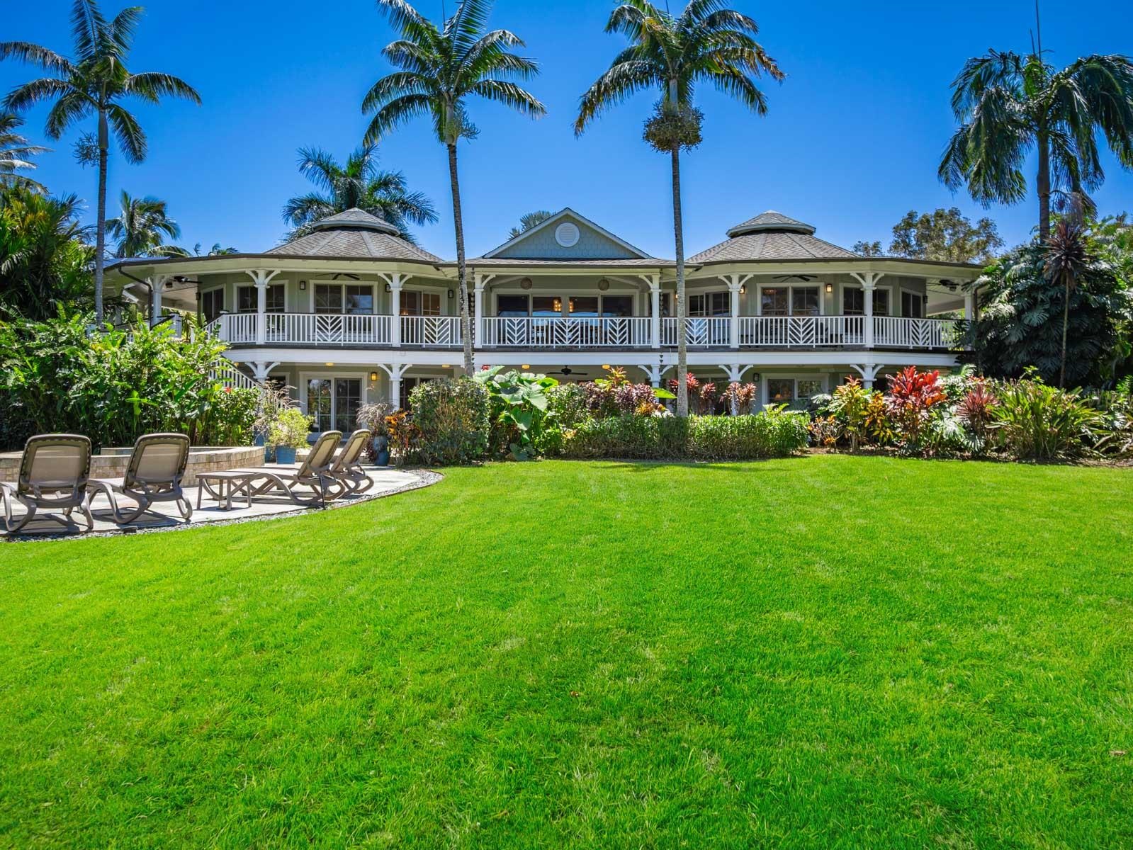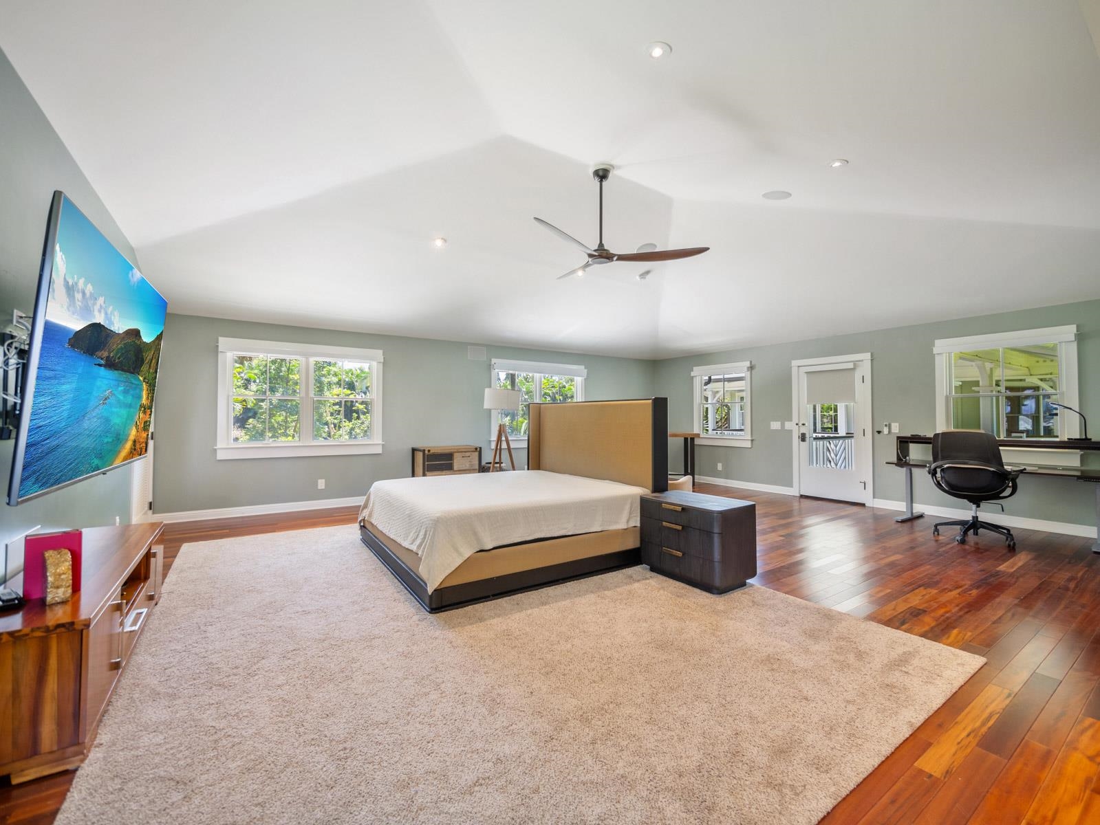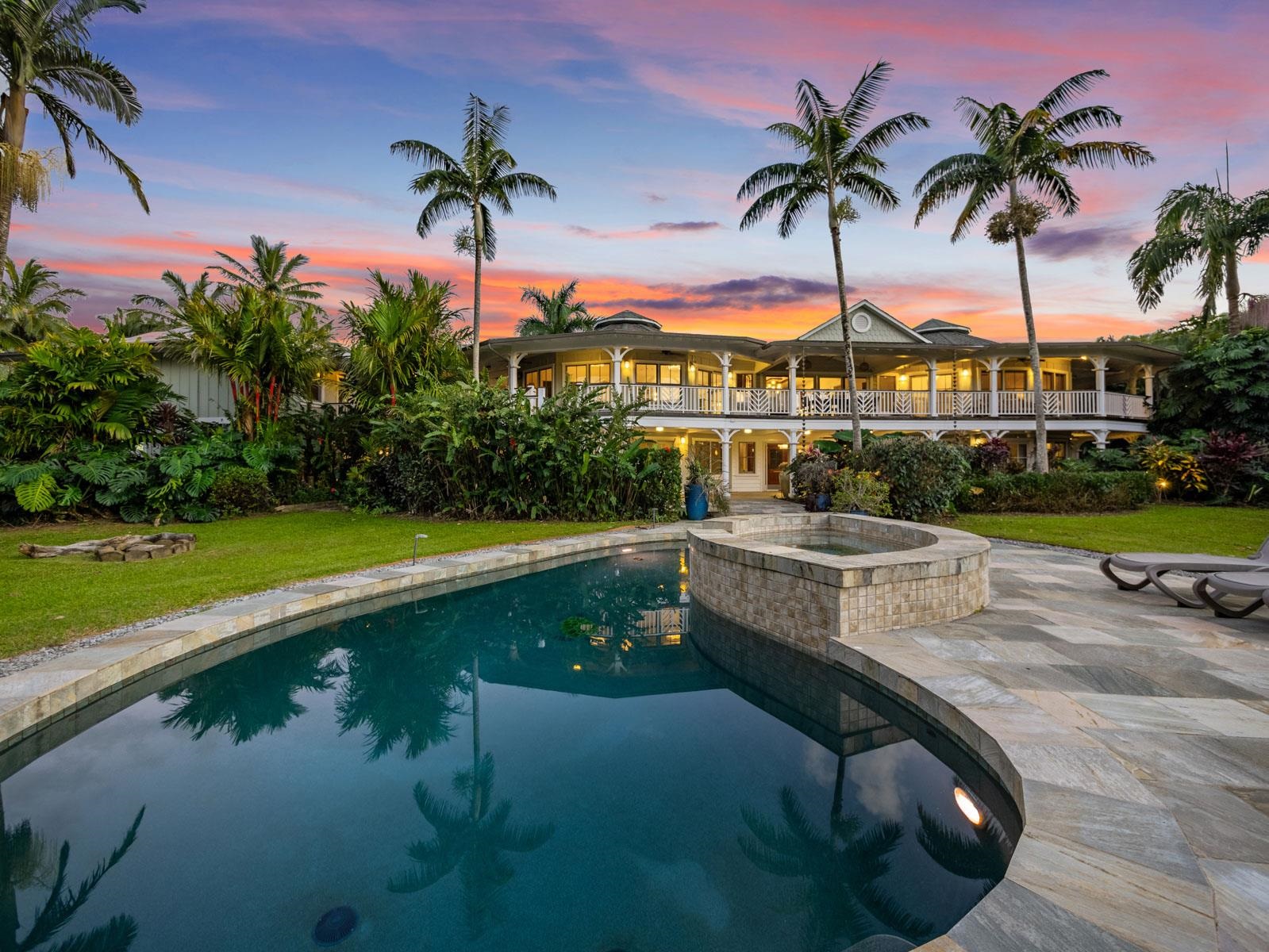 Situated on two privately fenced and gated acres in Haiku, Holokai Hale is a North Shore estate designed for indoor-outdoor living. More than 1,600 square feet of covered space includes lanais, walkways, and multiple areas to relax. Plumeria and puakenikeni line the grounds, with partial ocean views through the canopy. The home offers five bedrooms, six bathrooms, and over 5,000 square feet. The main residence centers on a chef’s kitchen with a large island, butler’s pantry, and direct access to covered lanais for dining and entertaining. Interior and exterior spaces connect seamlessly. The grounds include a saline pool and spa, sauna, cold plunge, and established landscaping with raised garden beds, papaya trees, banana and ginger groves, citrus, lei flowers, and a mature soursop tree. You will find vaulted ceilings and Brazilian Tiger wood floors and each bedroom includes an en-suite bathroom with the primary bedrooms Italian White Carrara Marble bathroom and extra large dressing suite. A separate guest suite provides privacy for extended stays. Additional structures include a detached workshop, an air-conditioned studio with its own sink, and a bonus room above the garage which also has a dumbwaiter. The property is supported by a 52-panel photovoltaic system, solar hot water, split air conditioning, and a whole-home backup generator. Holokai Hale is a flexible property suited for a primary residence, extended family living, or a private retreat.