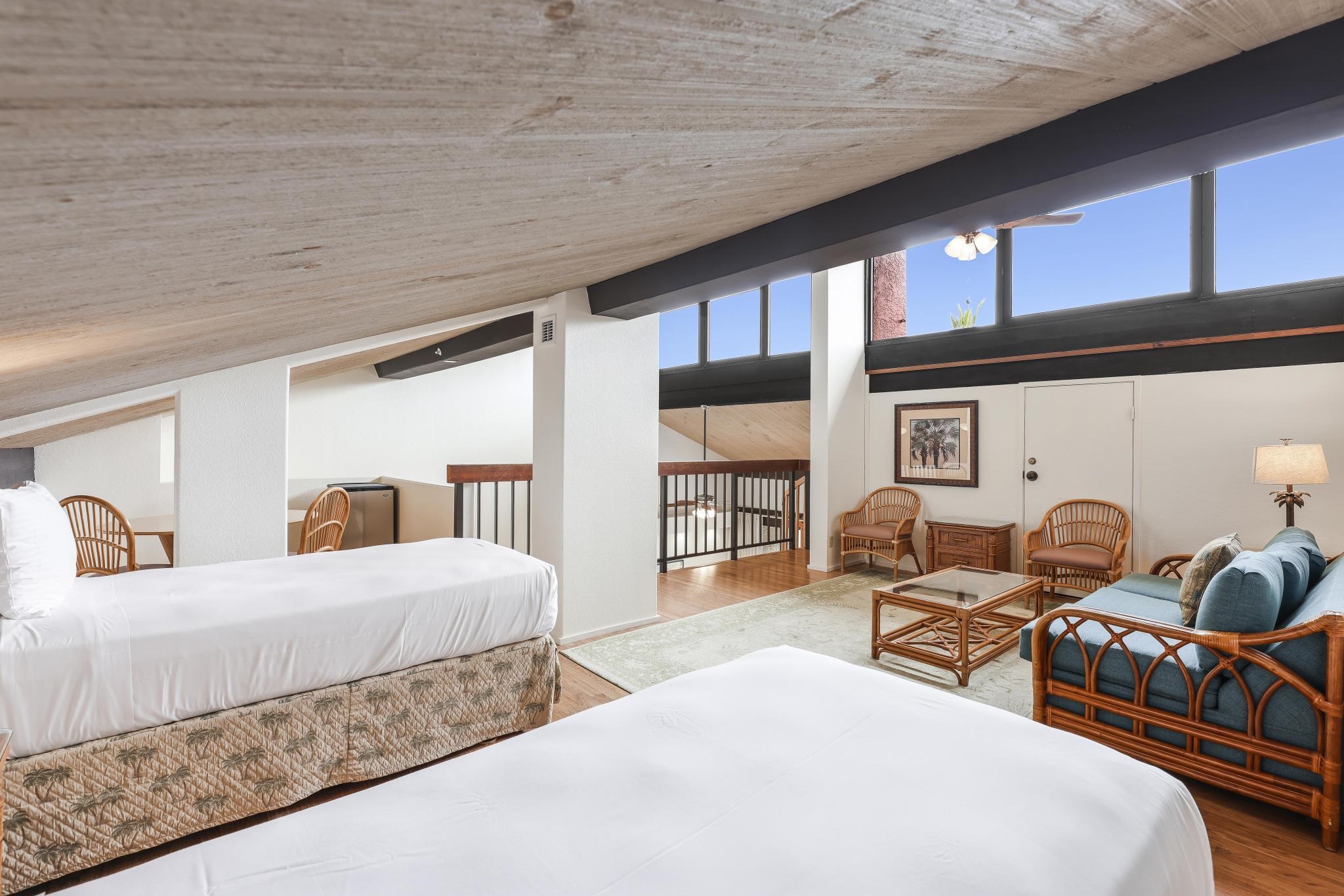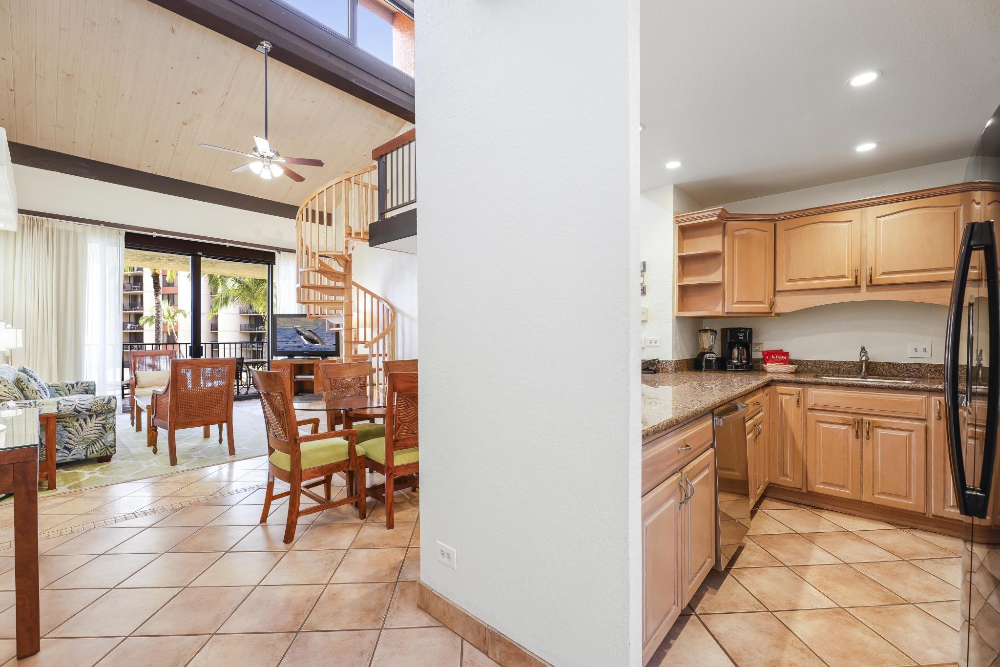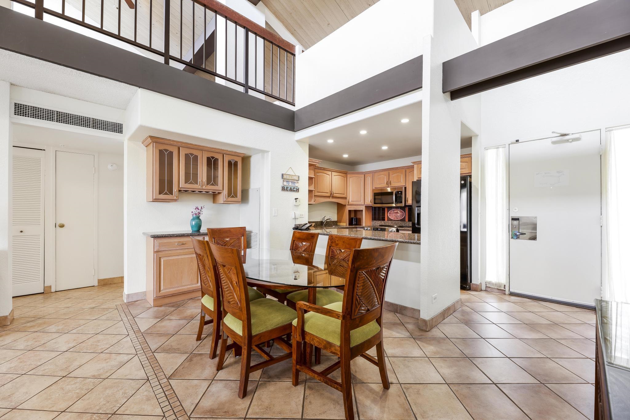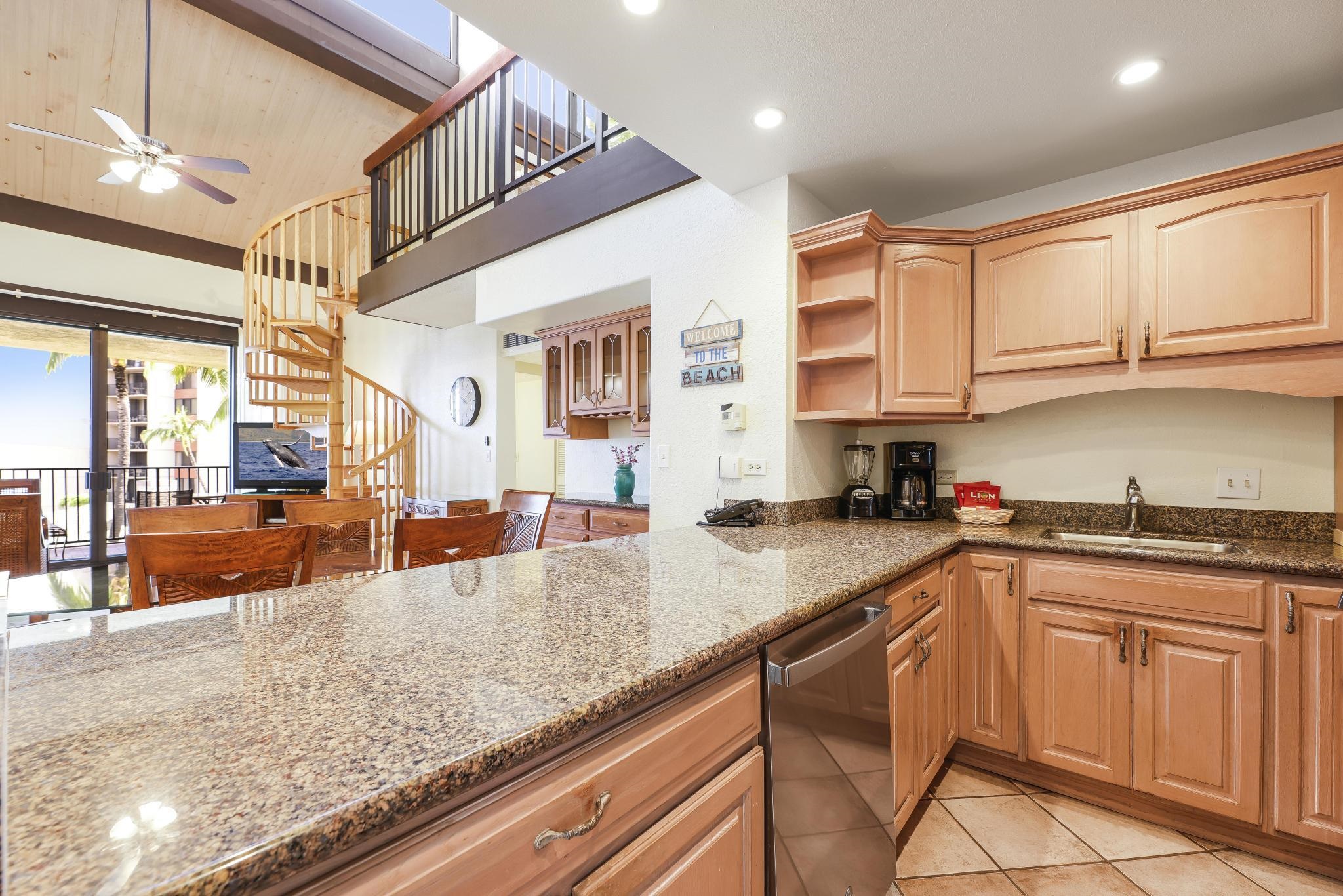 Kaanapali Shores 455- Hotel Zone Property. Experience breathtaking ocean views from this top-floor, fourth-level unit in the desirable low-rise building at Kaanapali Shores. This spacious residence features a versatile “three-bedroom style” floor plan, ideal for accommodating larger groups or extended family stays. The main level offers two well-appointed bedrooms, including a primary suite with floor-to-ceiling windows showcasing stunning views of Molokai and the Pacific Ocean, along with a private en suite bathroom. The second bedroom is thoughtfully designed with ample closet space and comfortable sleeping arrangements. A second bathroom on the main floor. Your spiral staircase leads to the expansive loft, complete with high ceilings, abundant natural light from upper windows, and additional sleeping and lounge space–perfect for entertaining or unwinding. The loft also includes extra storage with a lock-off area for personal belongings and room for a game table or additional seating. The kitchen is beautifully upgraded with custom wood cabinetry, granite countertops, and flows seamlessly into the tiled living and dining areas, creating a welcoming and functional space. Kaanapali Shores offers exceptional amenities, including two swimming pools, an on-site restaurant, fitness center, front desk services, and sundry and gift shops. This makes it an outstanding opportunity for vacation rental income or personal use. Perfect for singles or family gatherings or group vacations, this property embodies the best of Maui living. Discover why Kaanapali Shores remains one of West Maui’s most sought-after resort communities. This is a Leasehold unit.