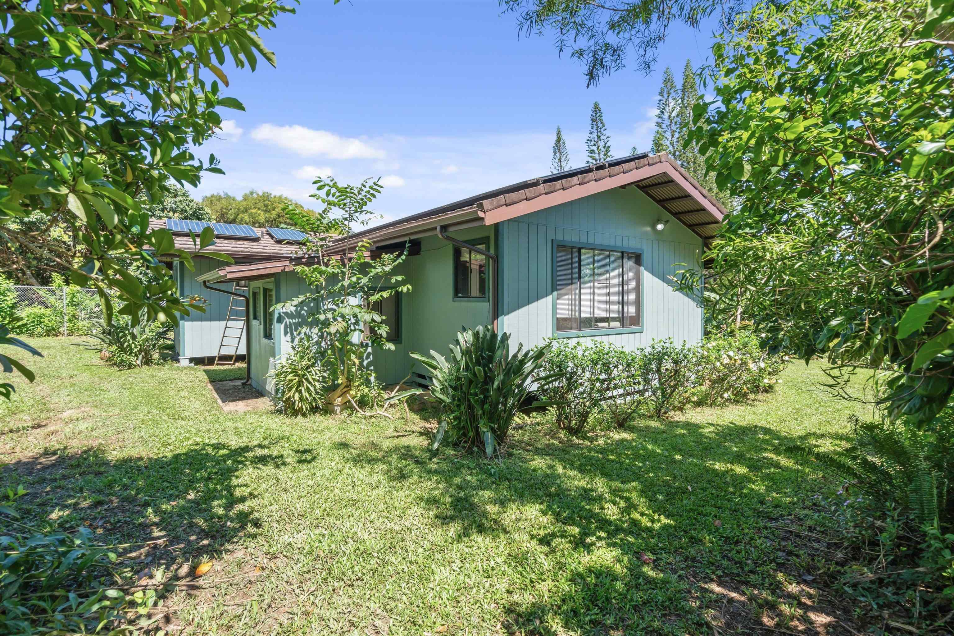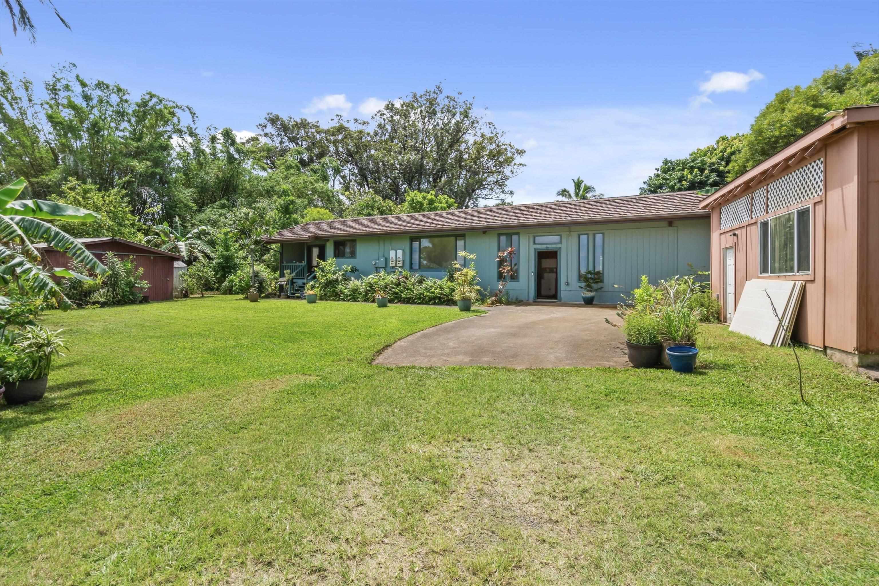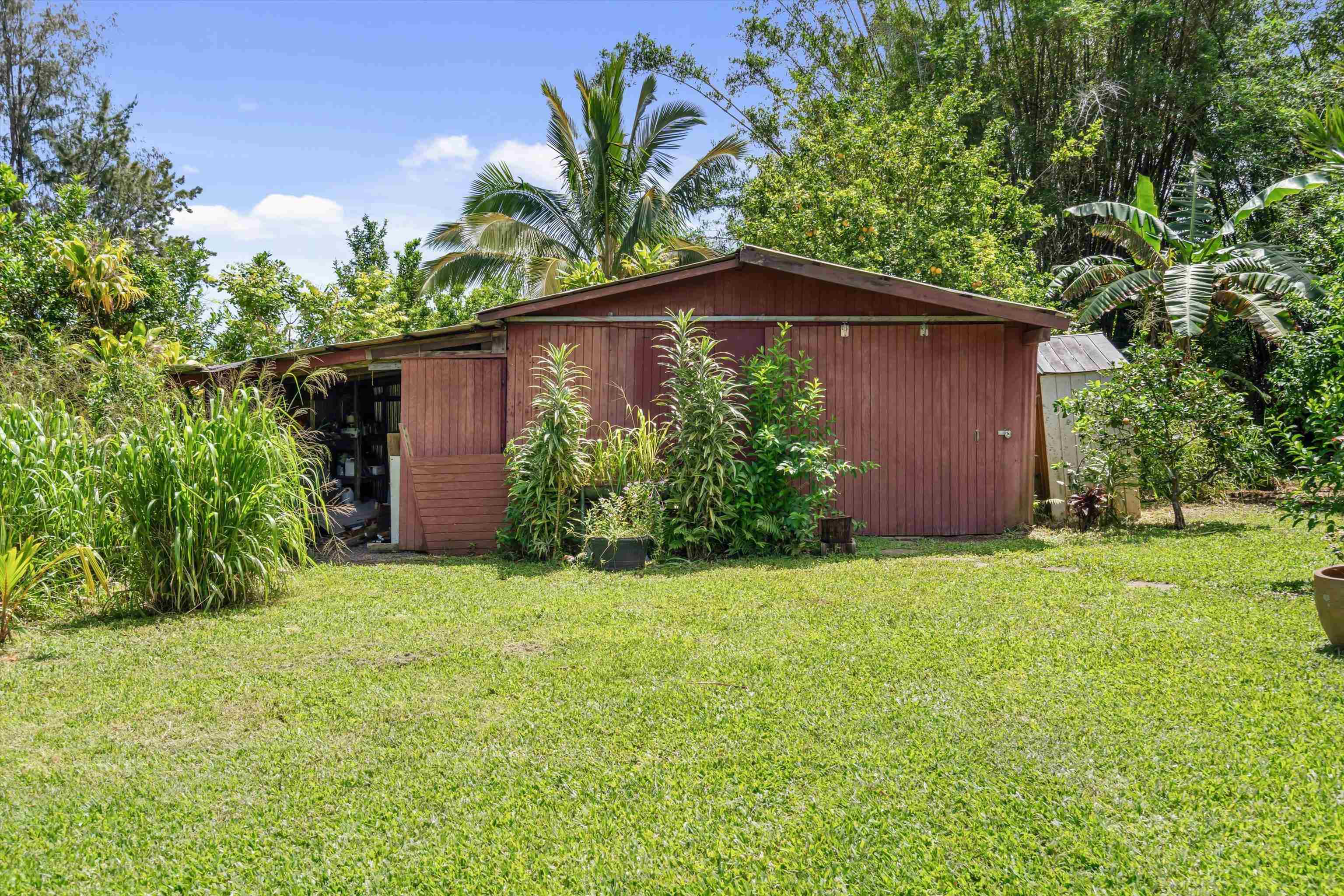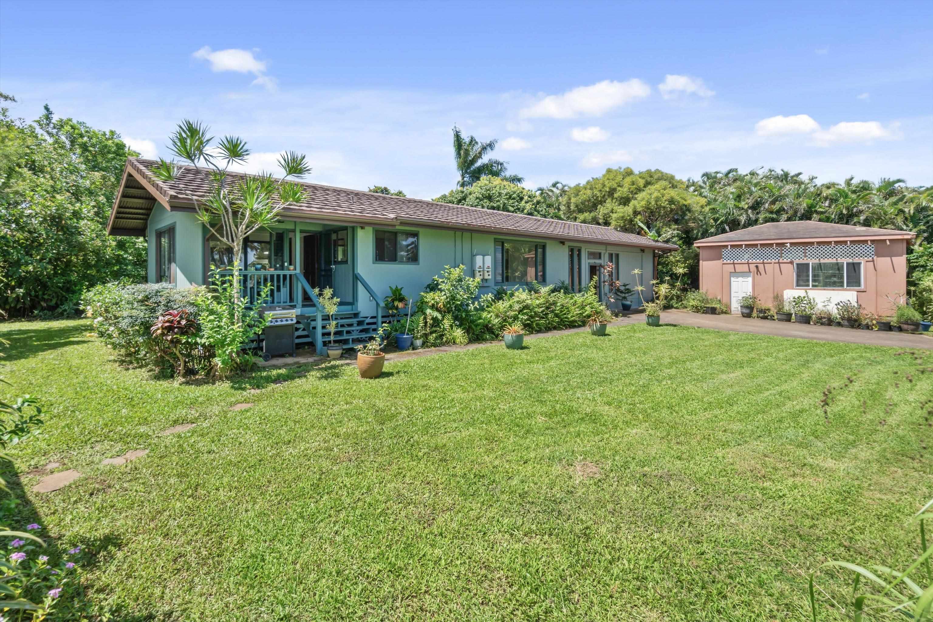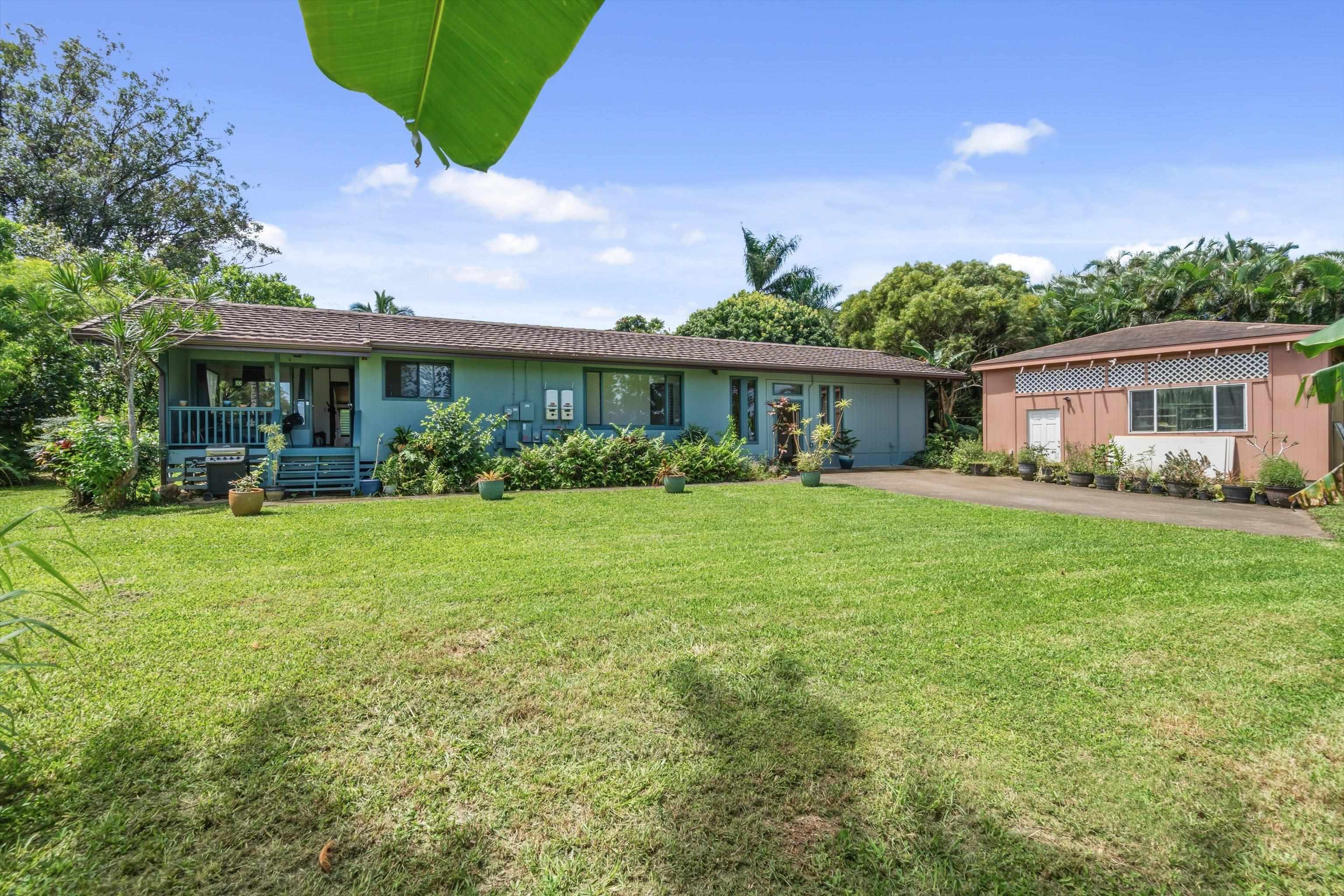 Tucked away on 1.47 lush agricultural acres in Haiku, this private property offers a rare blend of flexibility, privacy, and island charm. Public records reflect a 2-bedroom, 2-bath home, while the adaptable layout allows for multiple living options, including a potential attached studio or separate-entry unit–ideal for extended family, guests, or rental income. The home features a spacious, open feel with seamless indoor-outdoor living. Mature landscaping includes a variety of fruit trees–lime, Hawaiian lemon, coconut, banana, and sugar cane–along with puakenikeni, heliconia, and gardenia and other tropical flowers. A peaceful bamboo grove adds to the sense of serenity, tucked within the uncultivated portion of the acreage. Additional highlights include a detached structure with an Endless Pool spa and storage, extra outbuildings, and two fenced areas suited for gardening, pets, or agriculture. Set back from Holokai Road behind a gated entry, the property offers exceptional privacy in a peaceful Haiku setting. Within a 15 minute drive, are stores, schools, post office and beaches. Some images include virtual staging.