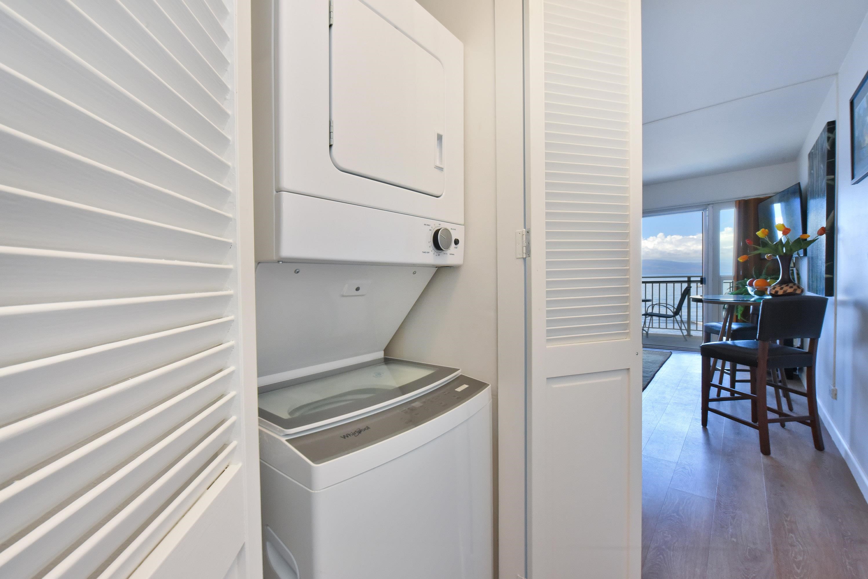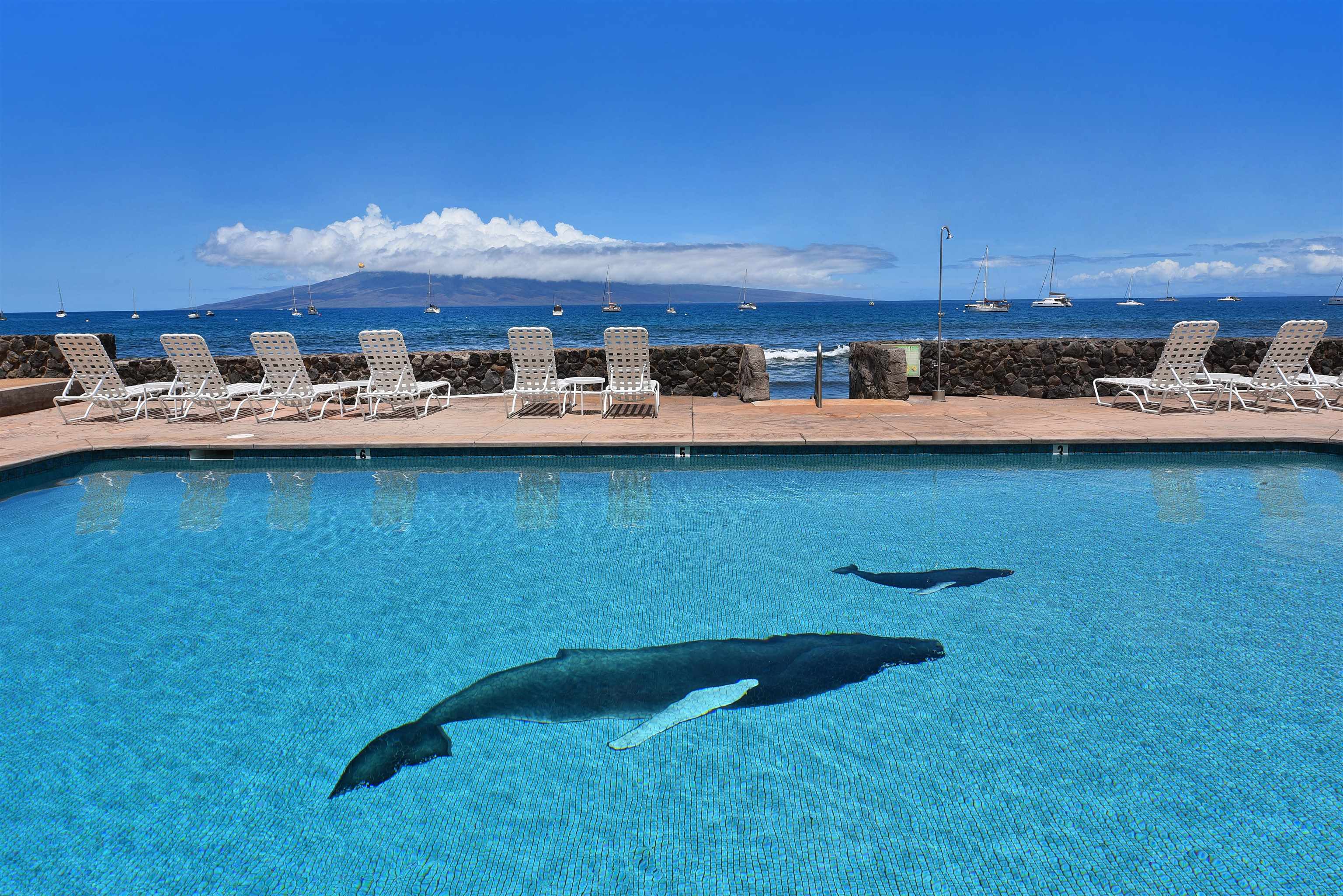 Rare and beautiful. This one bedroom condo is a direct oceanfront unit located at Lahaina Roads, which has been recently renovated after being spared by the Lahaina fire. Enjoy watching sailboats go by, whales breaching and breathtaking sunsets from the living area and covered lanai. Only 42 units at this property which includes a swimming pool, bbq areas and covered parking. Tile flooring, ceiling fans, and a well appointed kitchen for enjoying life in Lahaina. Luxurious remodeled bathroom with tiled shower, and new cabinets, spacious bedroom, and in-unit stack washer and dryer. Covered lanai has automated sun shade. Easy walk to enjoy shopping, dining and Front Street flavor. Repeat visitors each year who enjoy this special property. Exterior painting recently completed along with other updates.